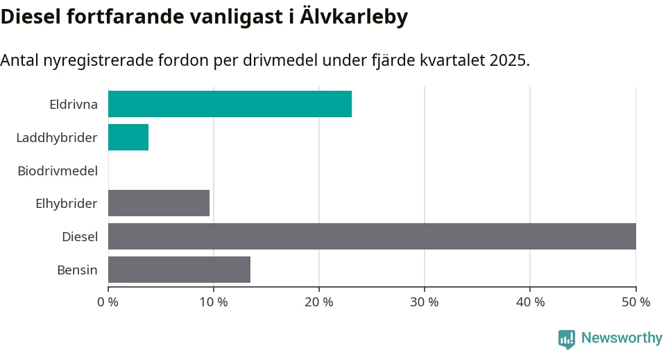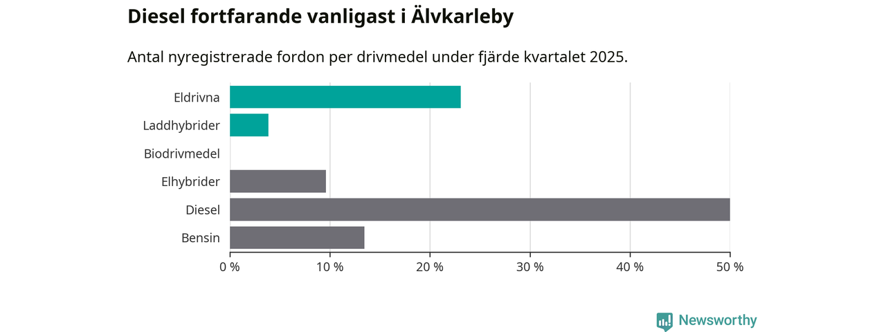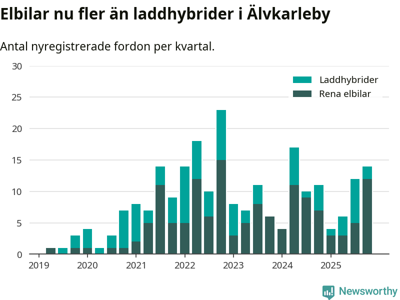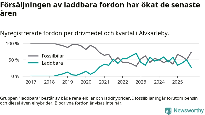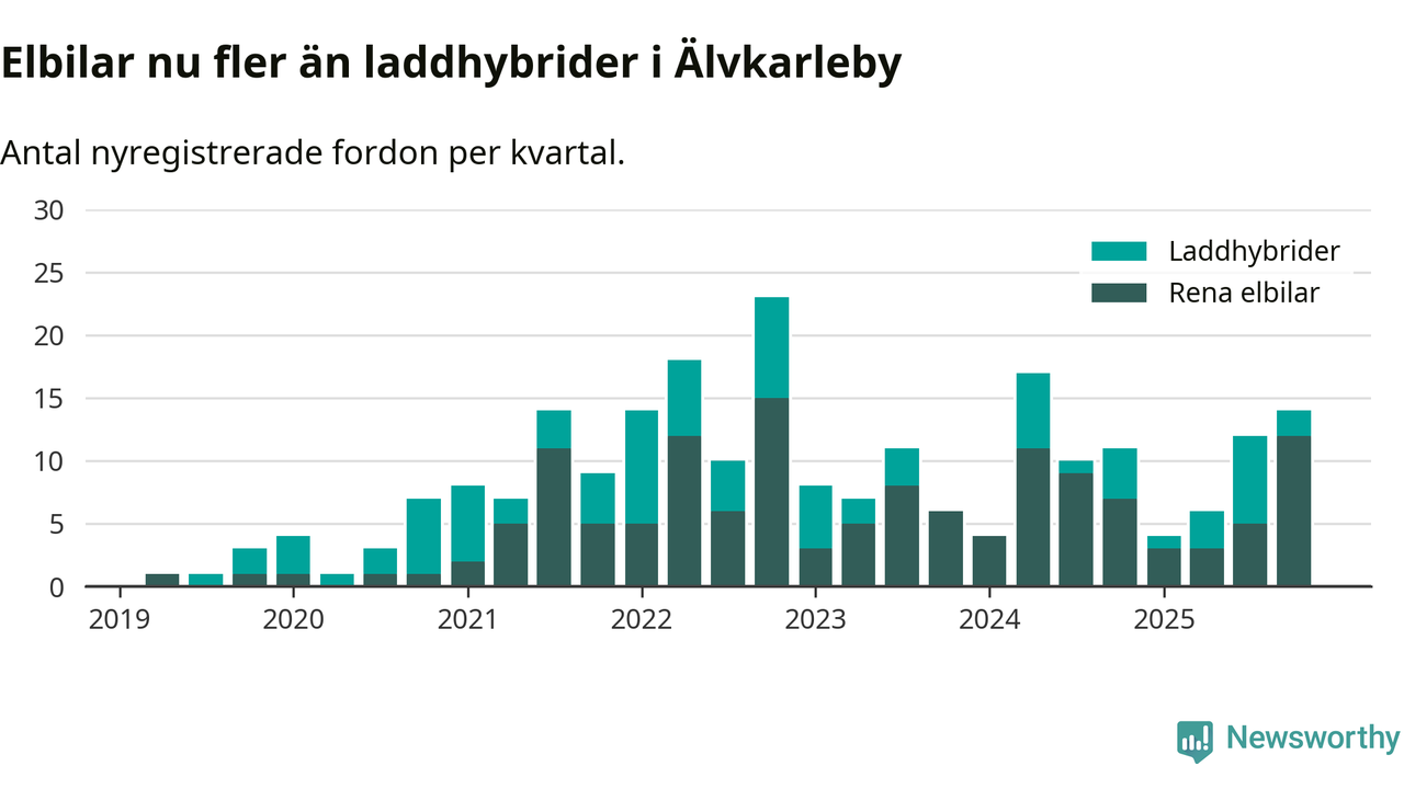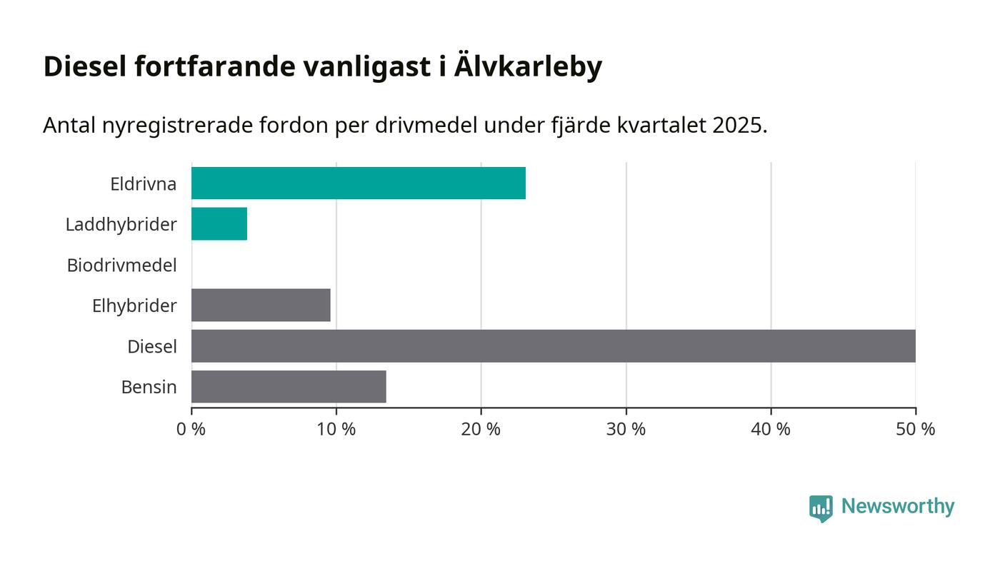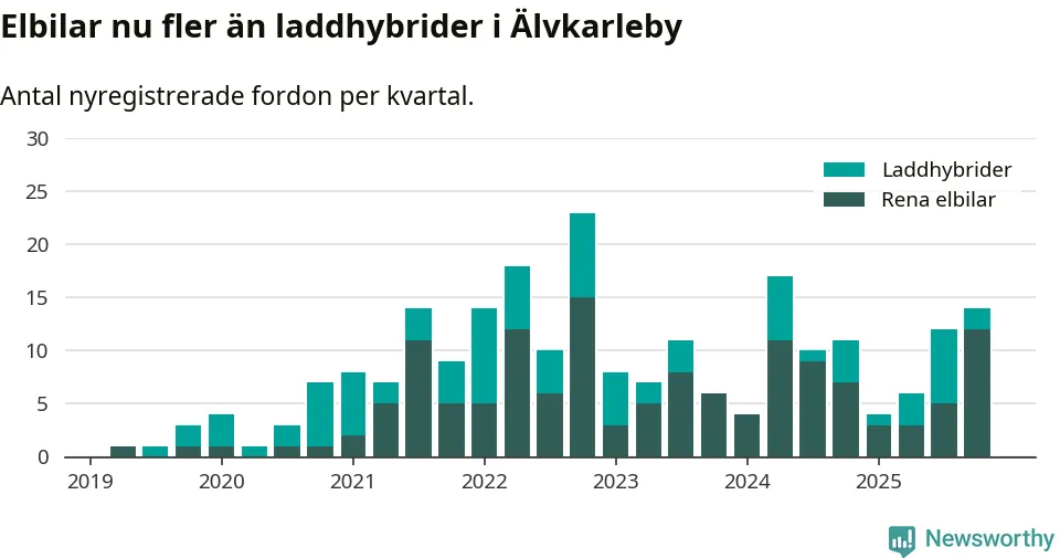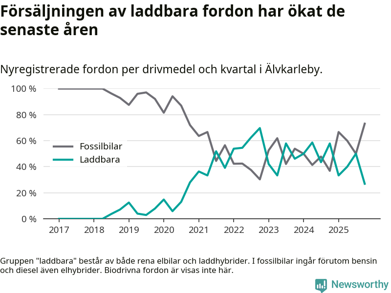 Under fjärde kvartalet 2025 var 27 procent av alla nyregistrerade personbilar i Älvkarleby laddbara (sammanlagt registrerades 52 nya bilar). Merparten av de laddbara bilarna var rena elbilar (23 procent av alla).