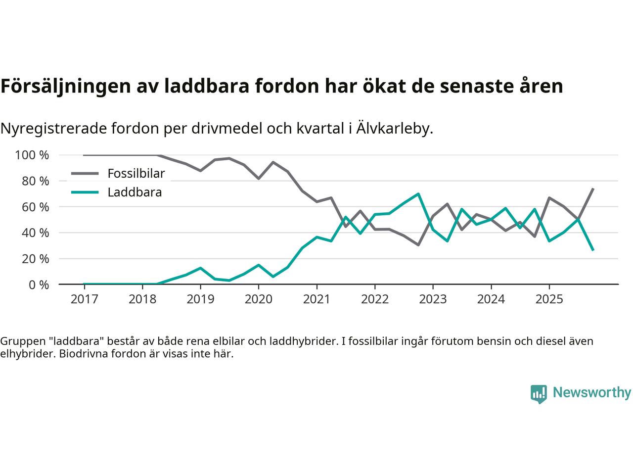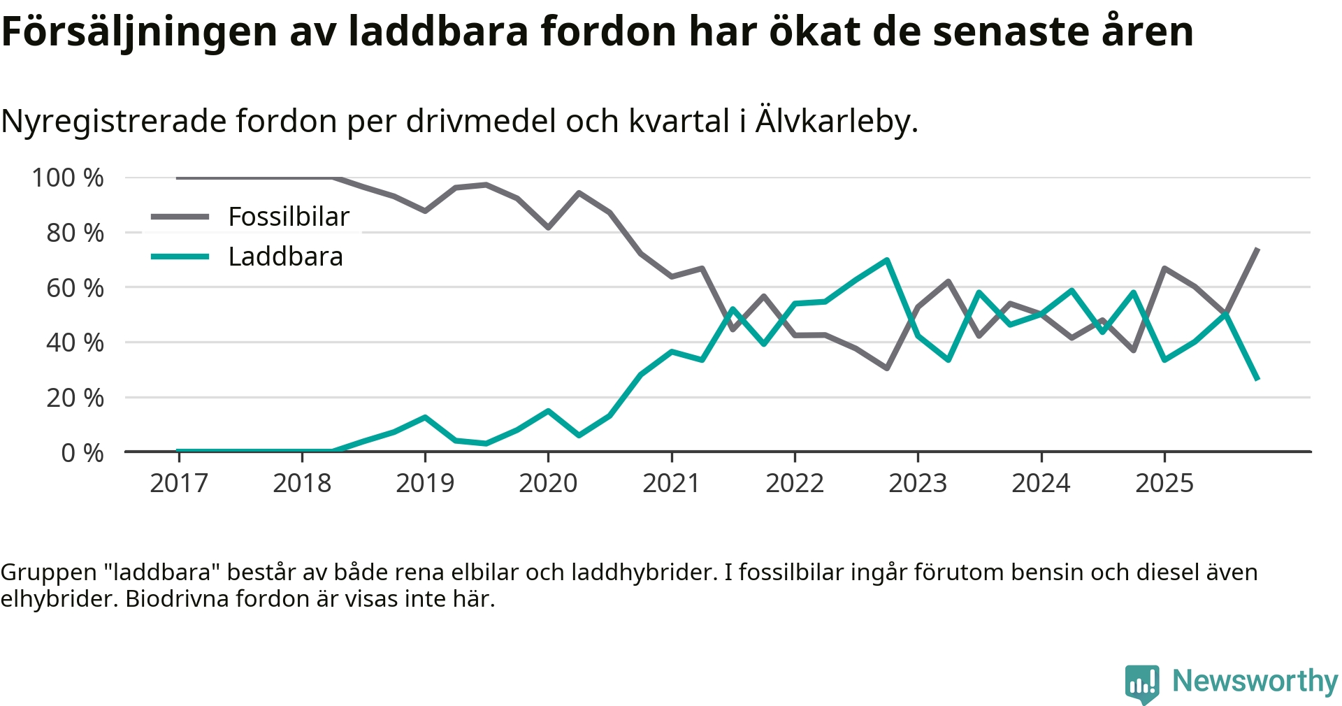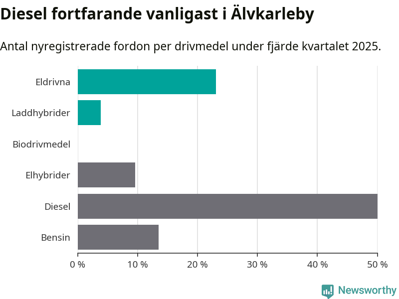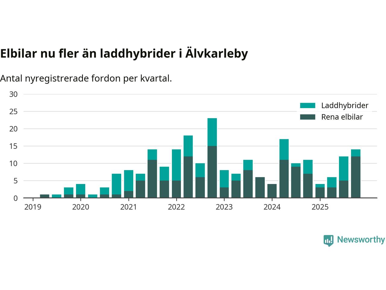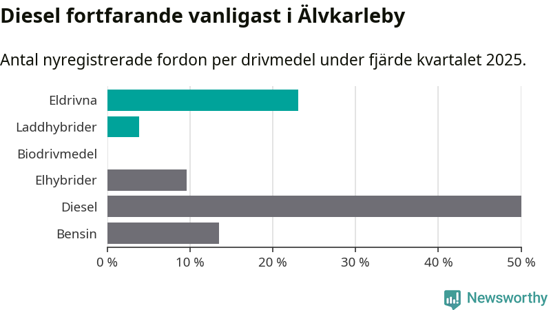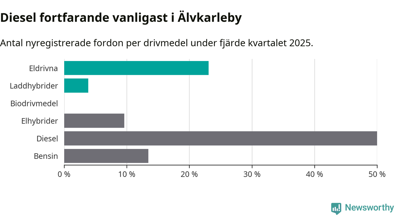 Under fjärde kvartalet 2025 var 27 procent av alla nyregistrerade personbilar i Älvkarleby laddbara (sammanlagt registrerades 52 nya bilar). Merparten av de laddbara bilarna var rena elbilar (23 procent av alla).