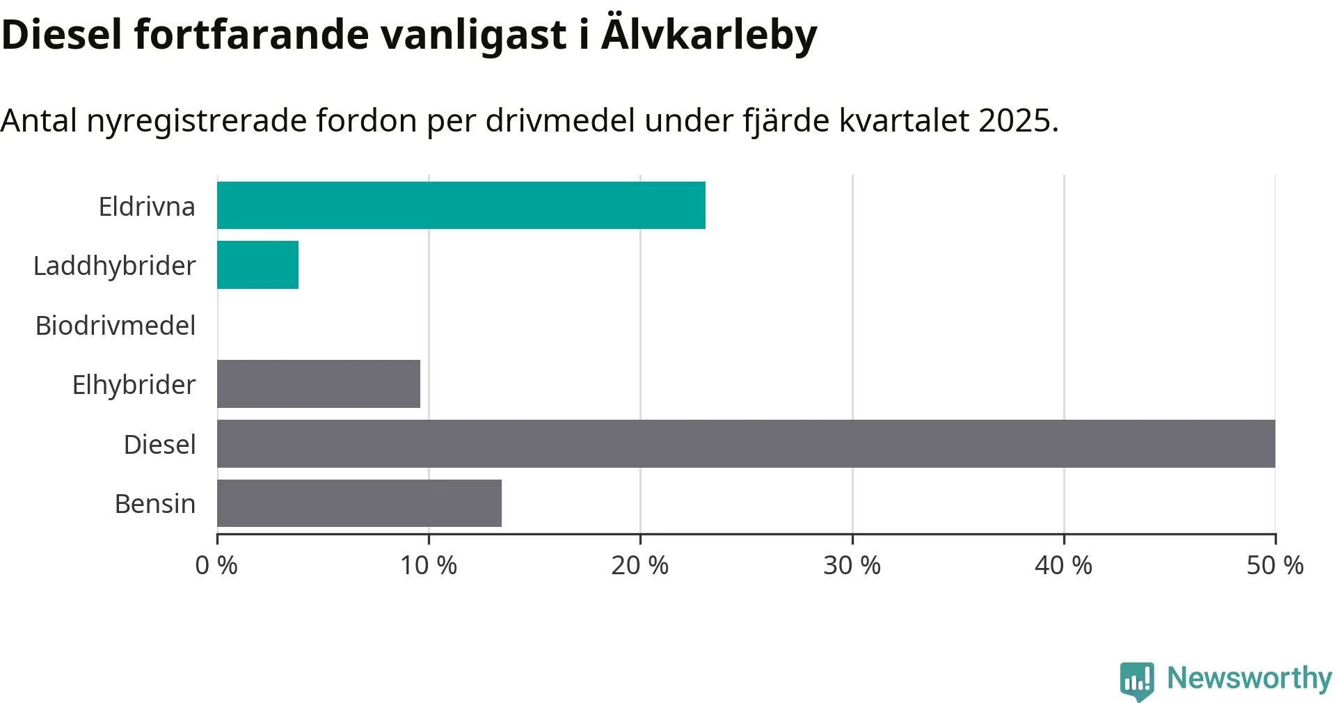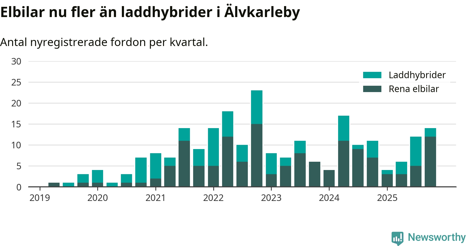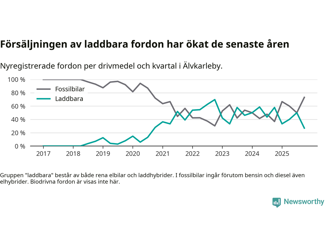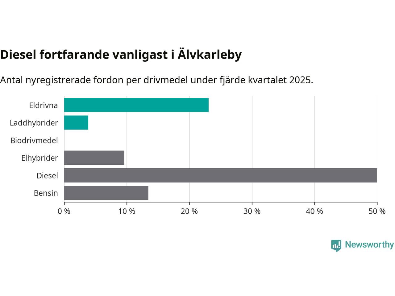 Under fjärde kvartalet 2025 var 27 procent av alla nyregistrerade personbilar i Älvkarleby laddbara (sammanlagt registrerades 52 nya bilar). Merparten av de laddbara bilarna var rena elbilar (23 procent av alla).
