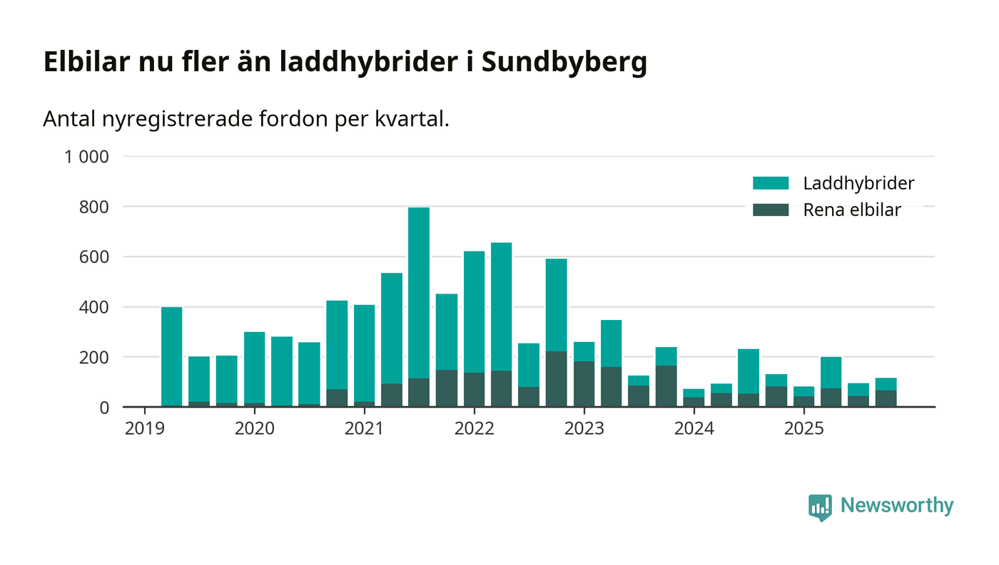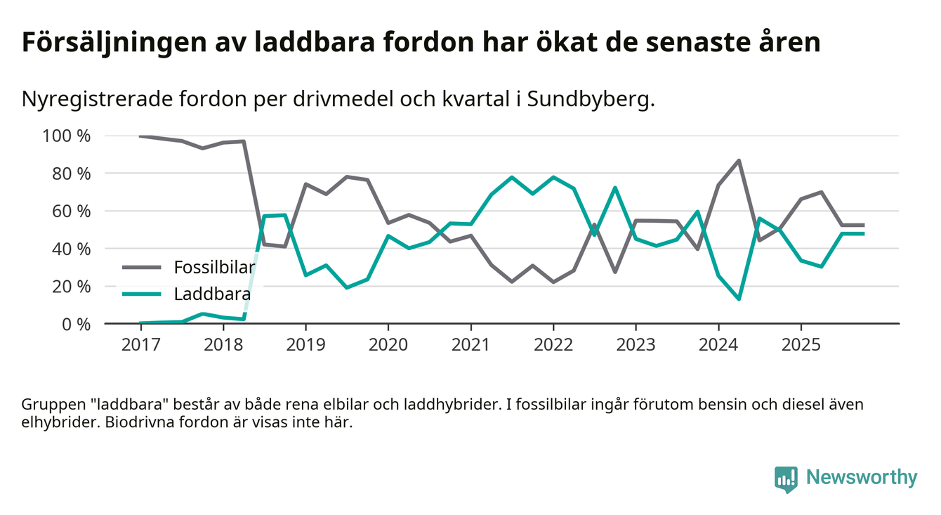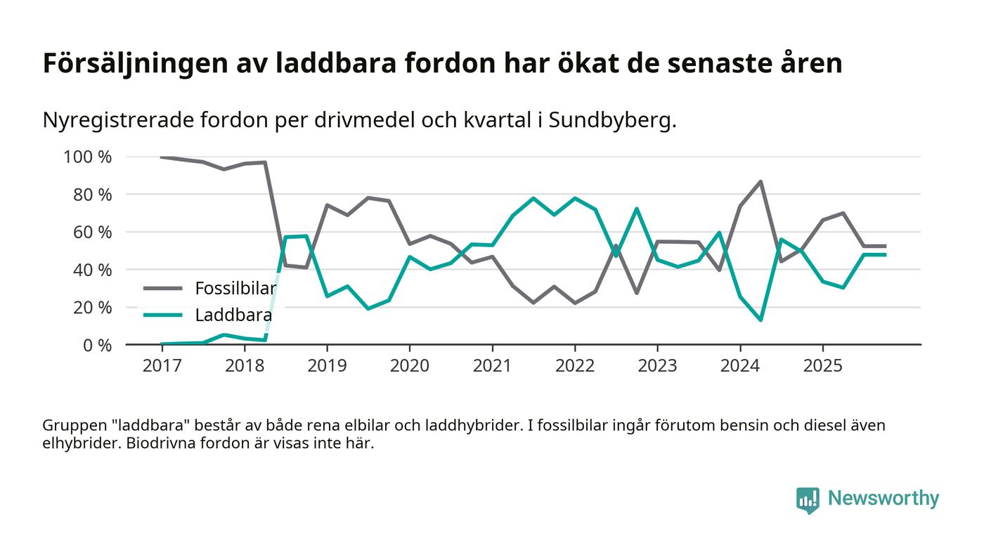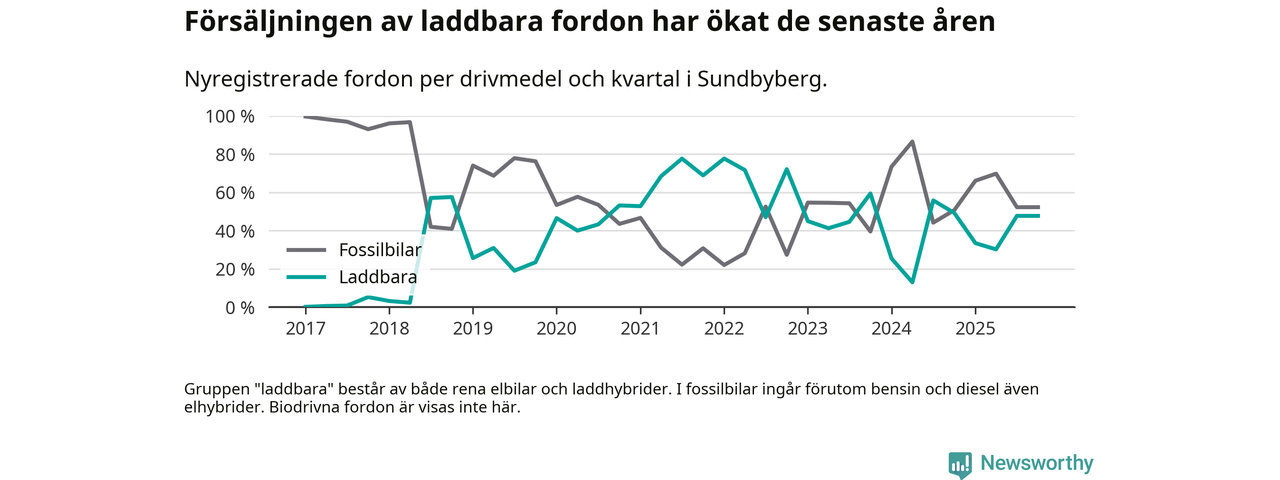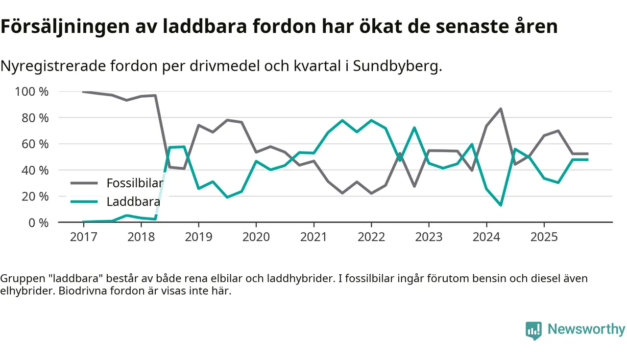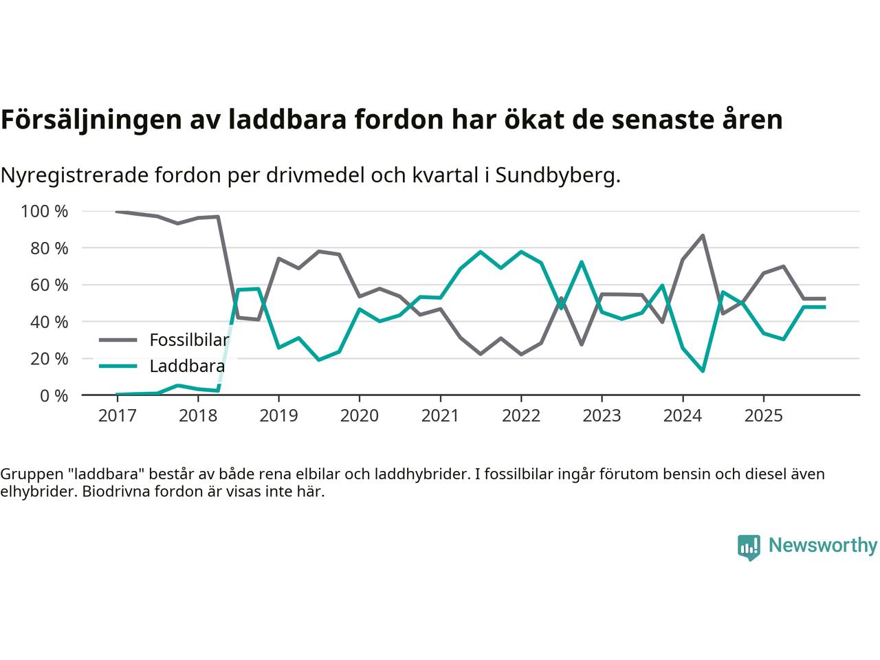 Under fjärde kvartalet 2025 var 48 procent av alla nyregistrerade personbilar i Sundbyberg laddbara (sammanlagt registrerades 241 nya bilar). Merparten av de laddbara bilarna var rena elbilar (27 procent av alla).