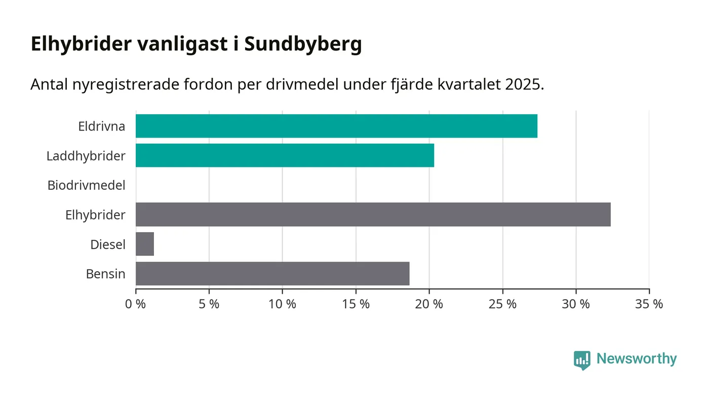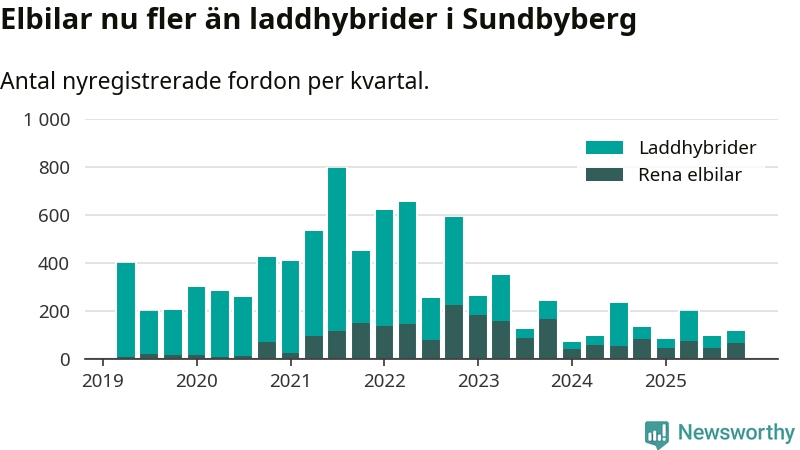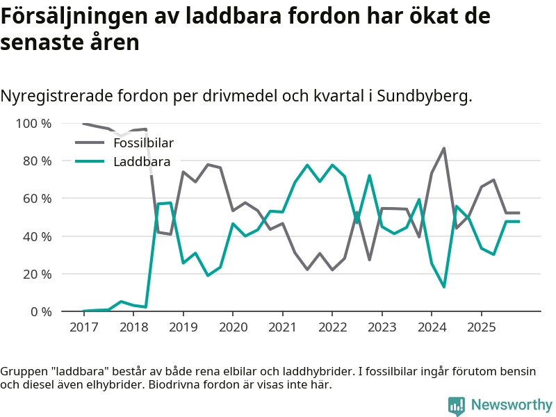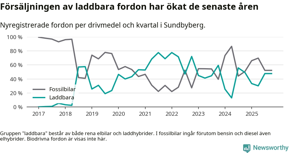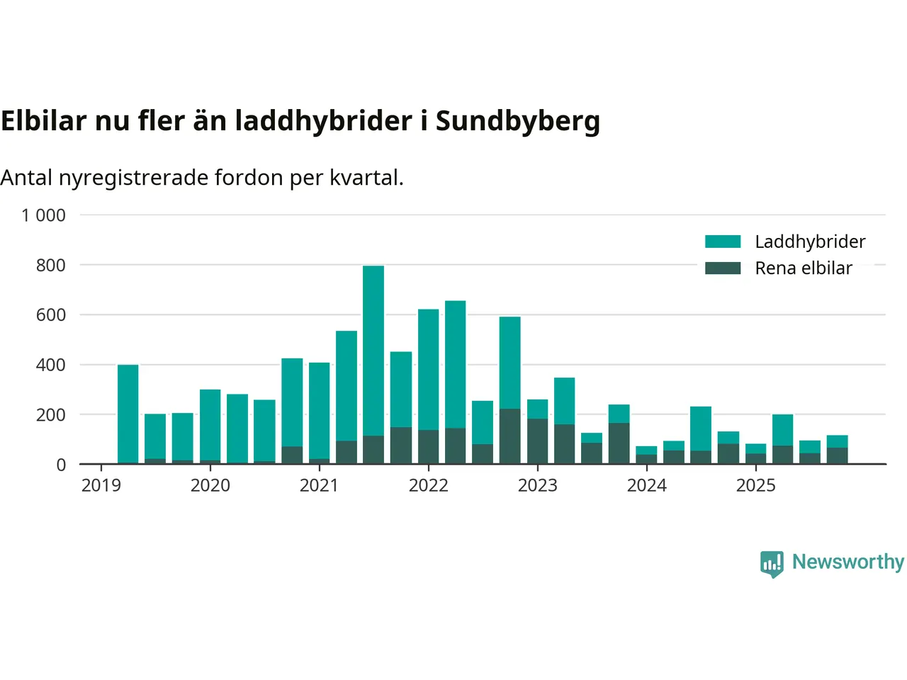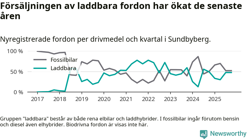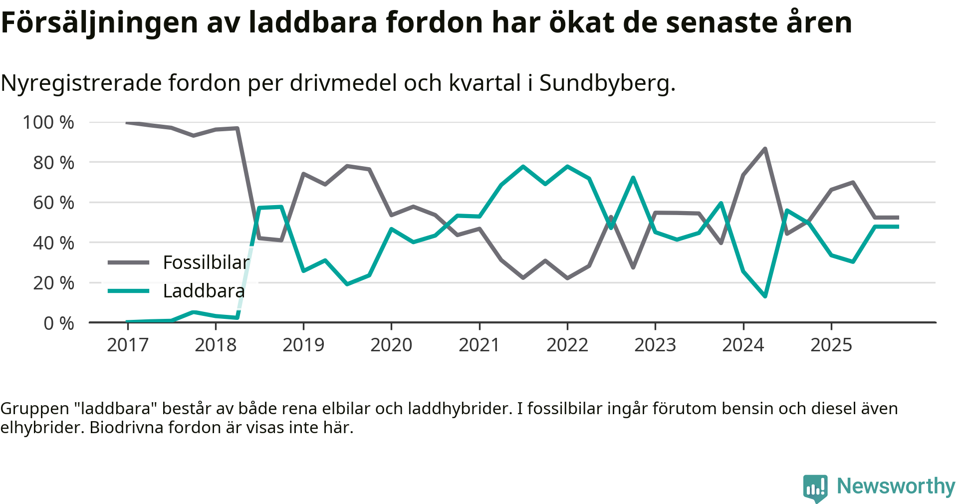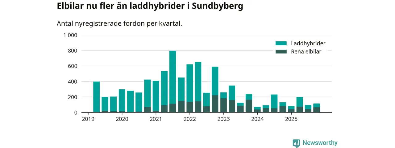 Under fjärde kvartalet 2025 var 48 procent av alla nyregistrerade personbilar i Sundbyberg laddbara (sammanlagt registrerades 241 nya bilar). Merparten av de laddbara bilarna var rena elbilar (27 procent av alla).
