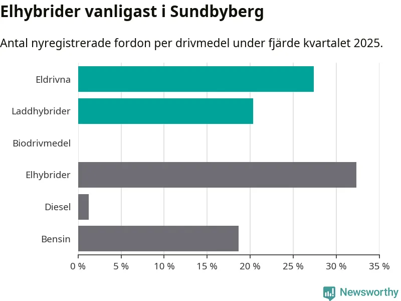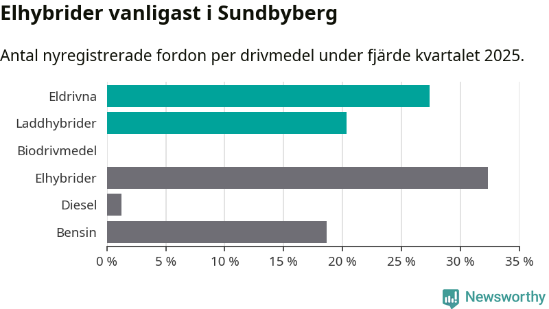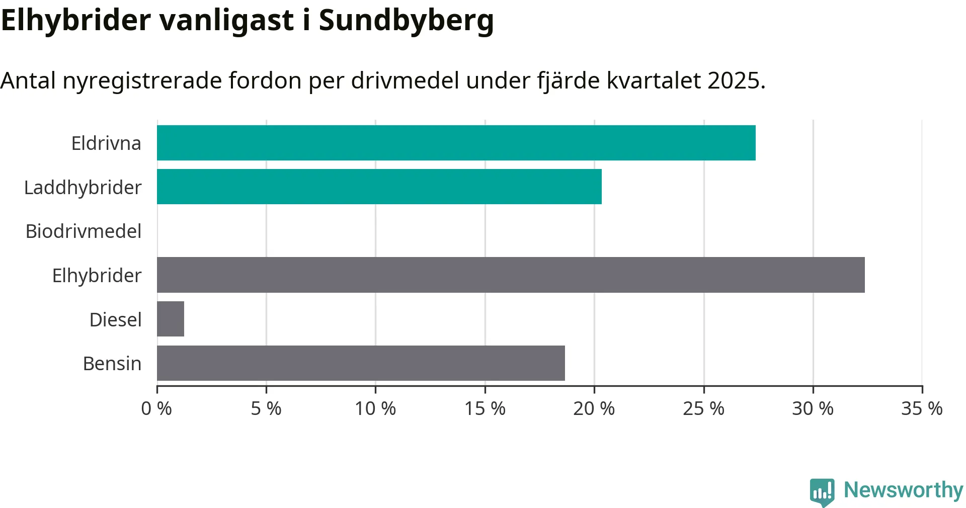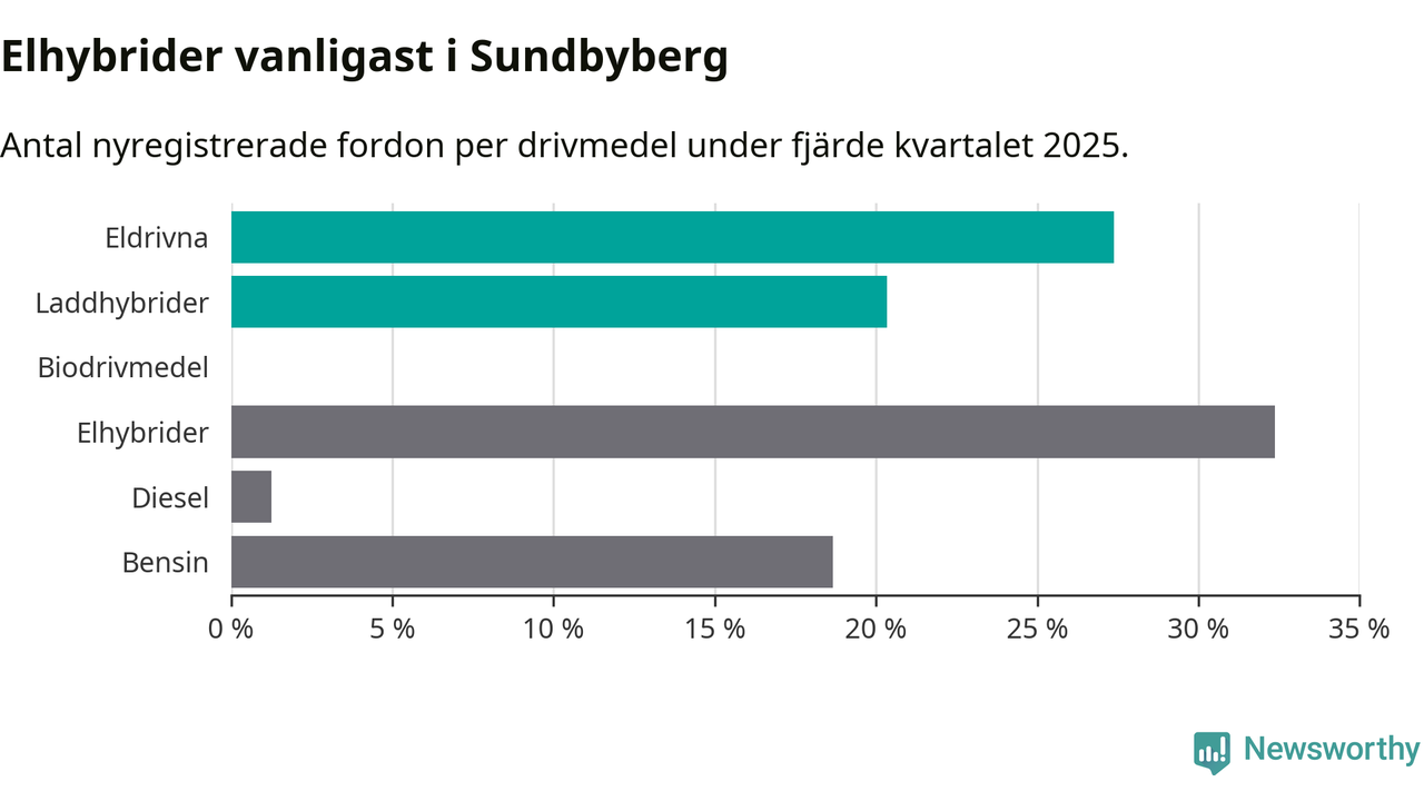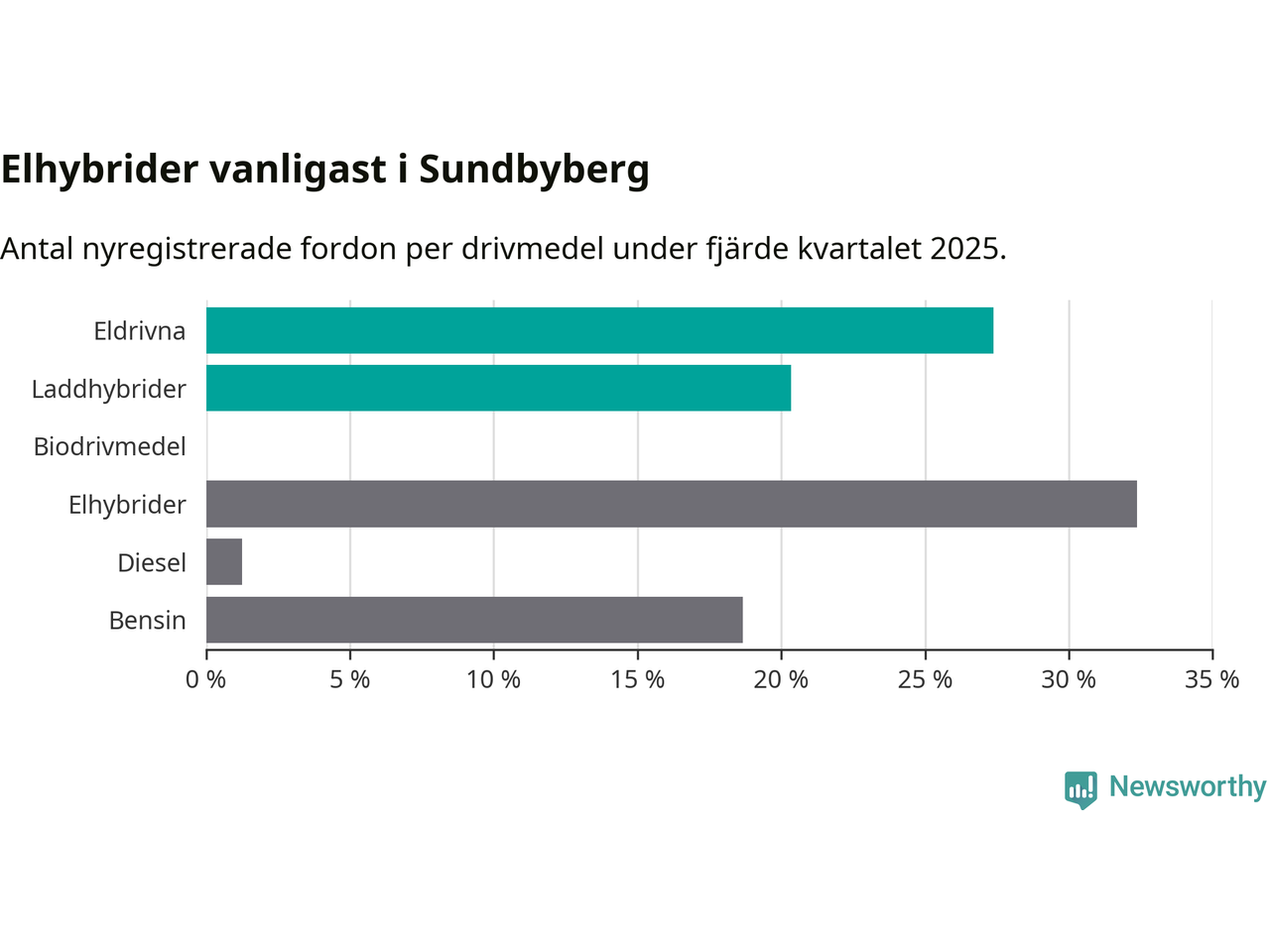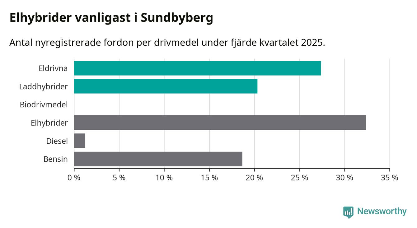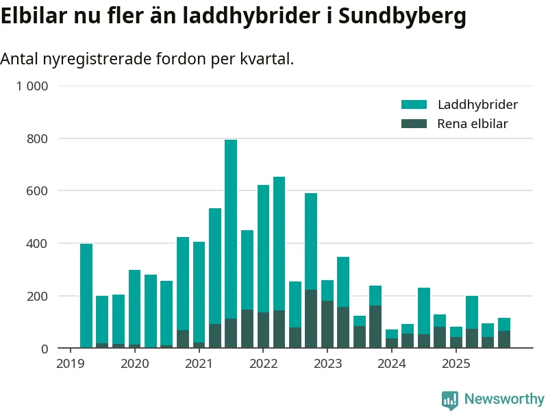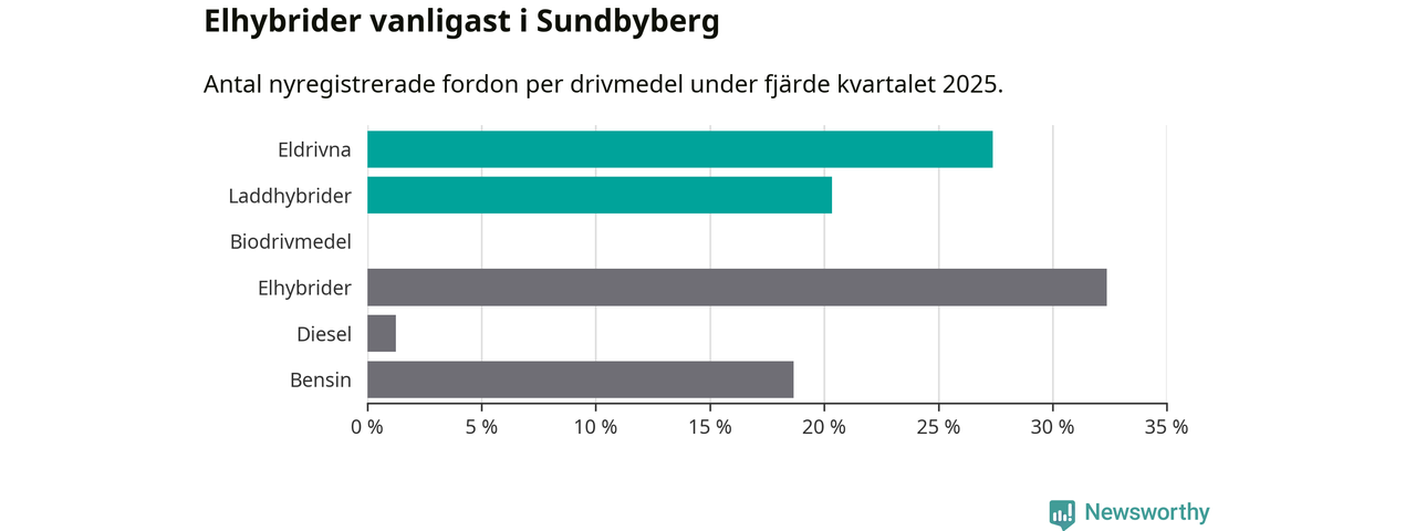 Under fjärde kvartalet 2025 var 48 procent av alla nyregistrerade personbilar i Sundbyberg laddbara (sammanlagt registrerades 241 nya bilar). Merparten av de laddbara bilarna var rena elbilar (27 procent av alla).