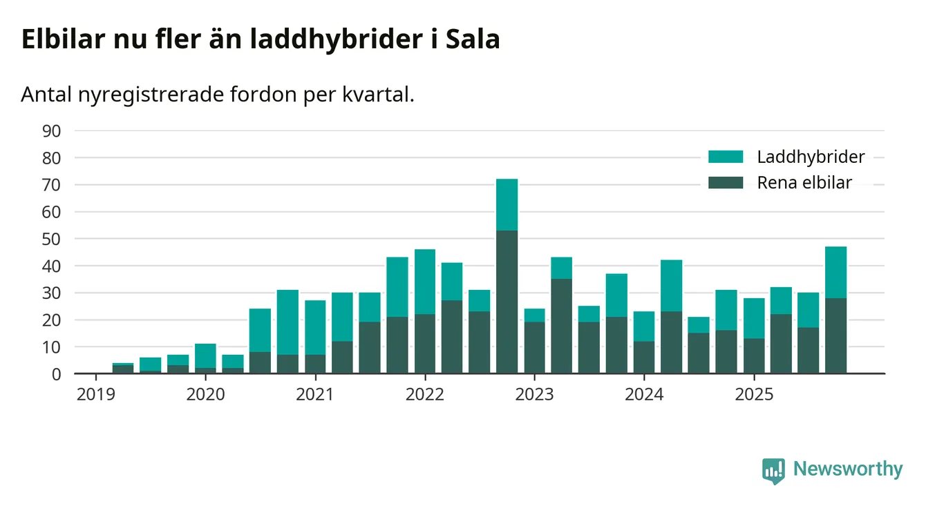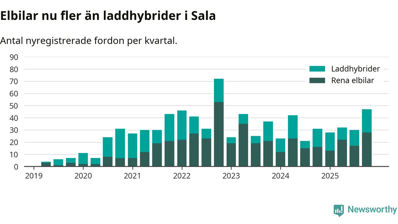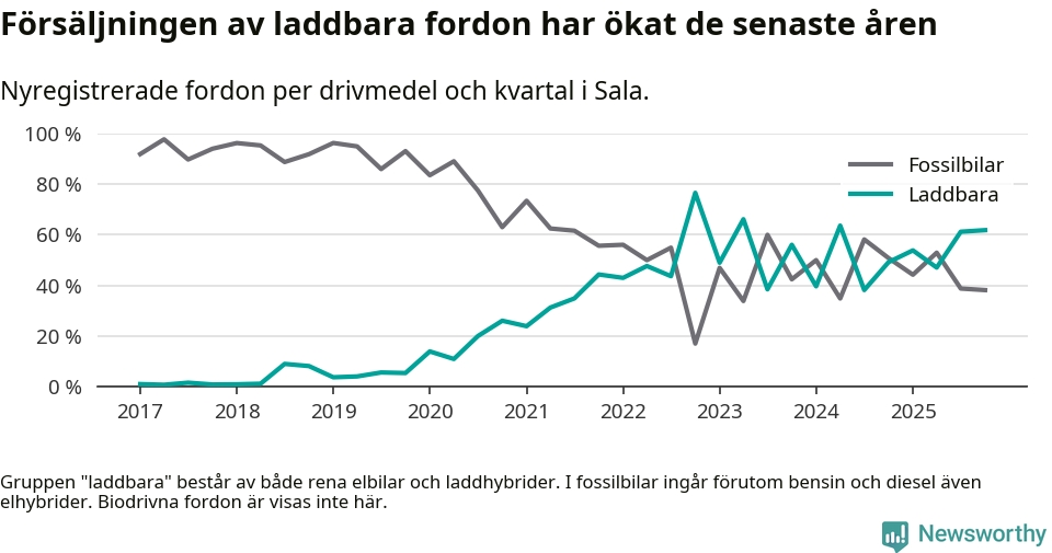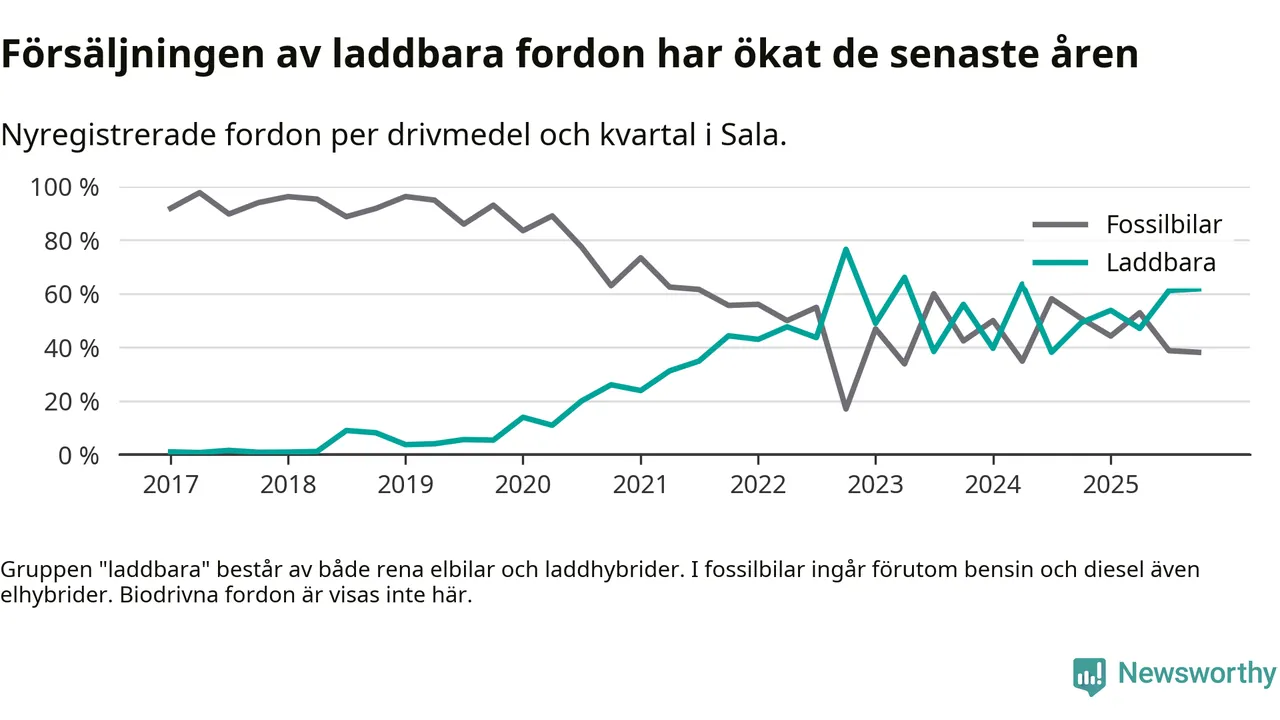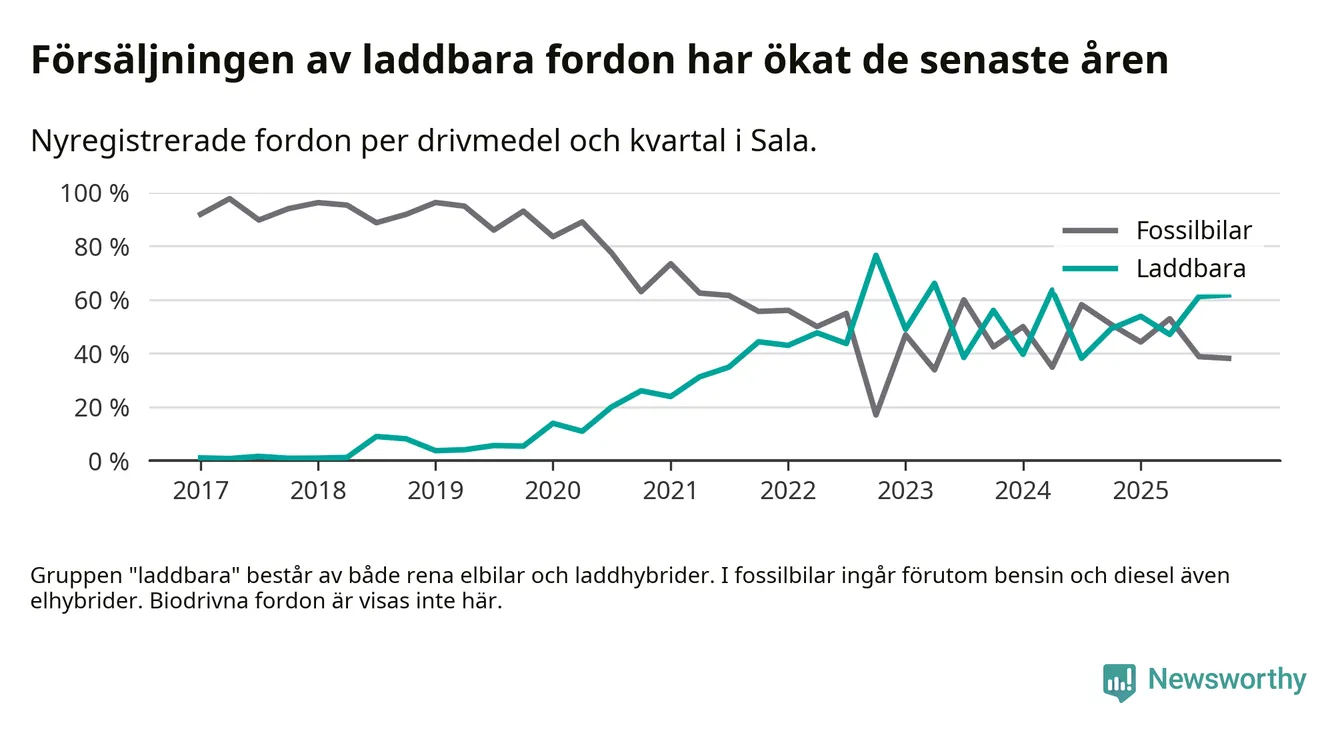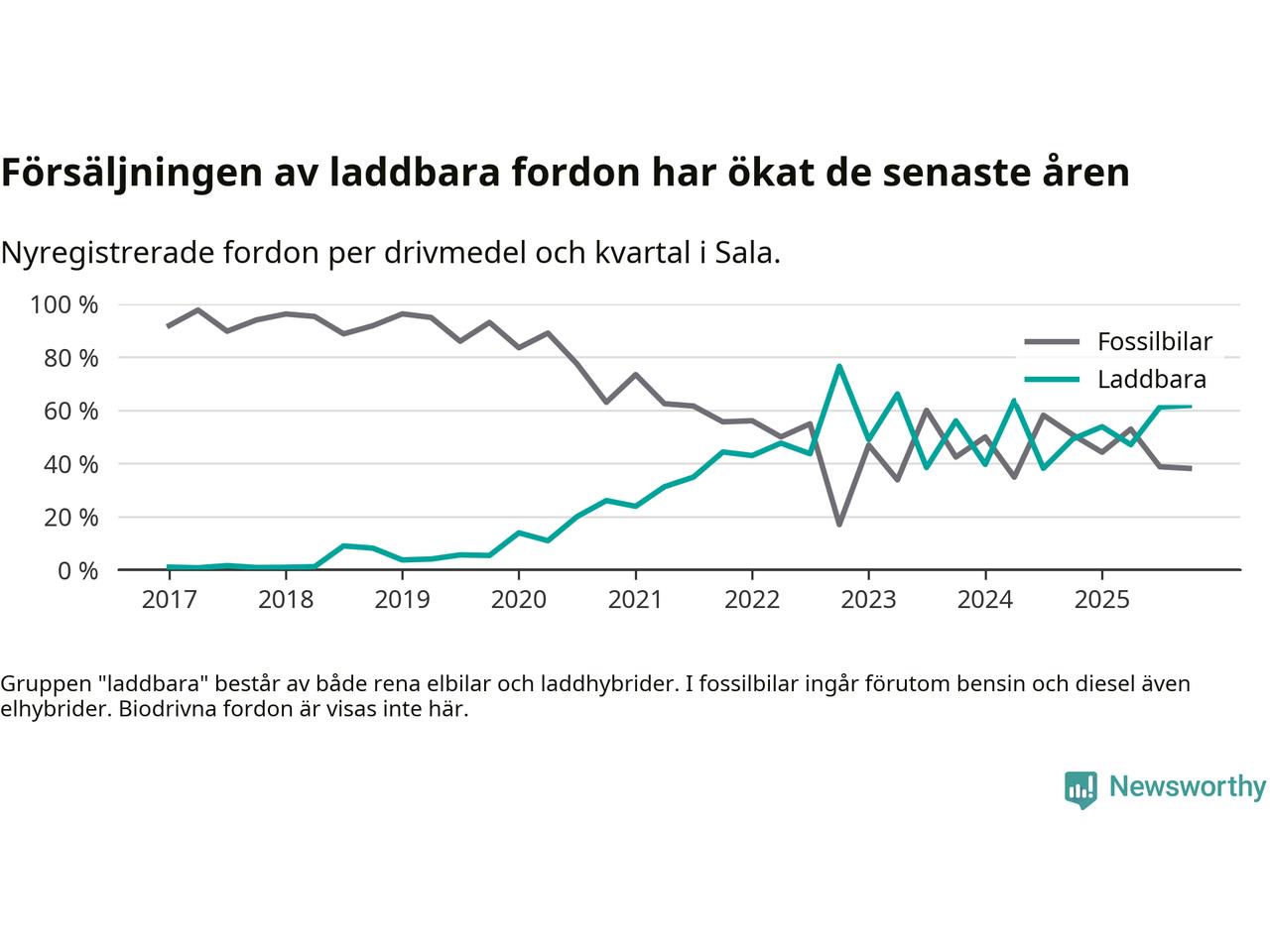Under fjärde kvartalet 2025 var 62 procent av alla nyregistrerade personbilar i Sala laddbara (sammanlagt registrerades 76 nya bilar). Merparten av de laddbara bilarna var rena elbilar (37 procent av alla).