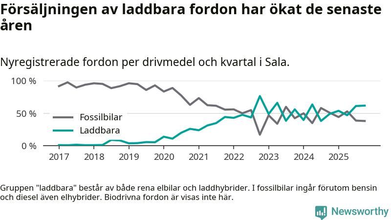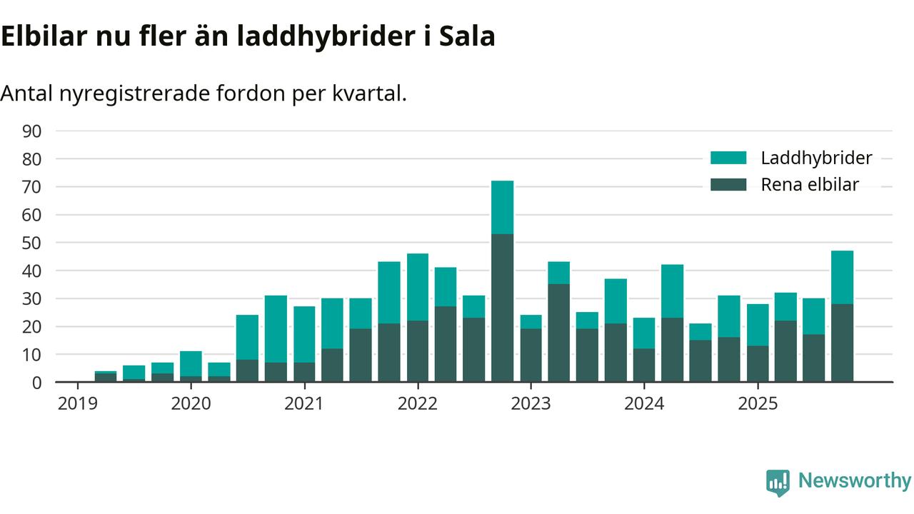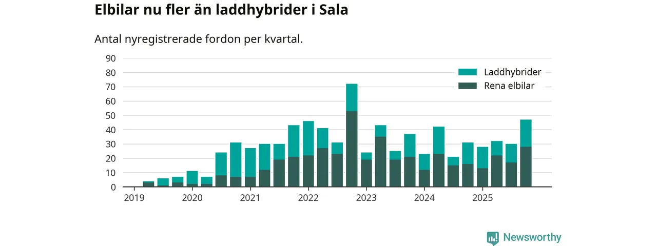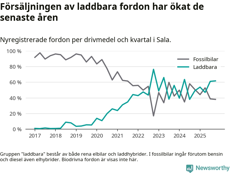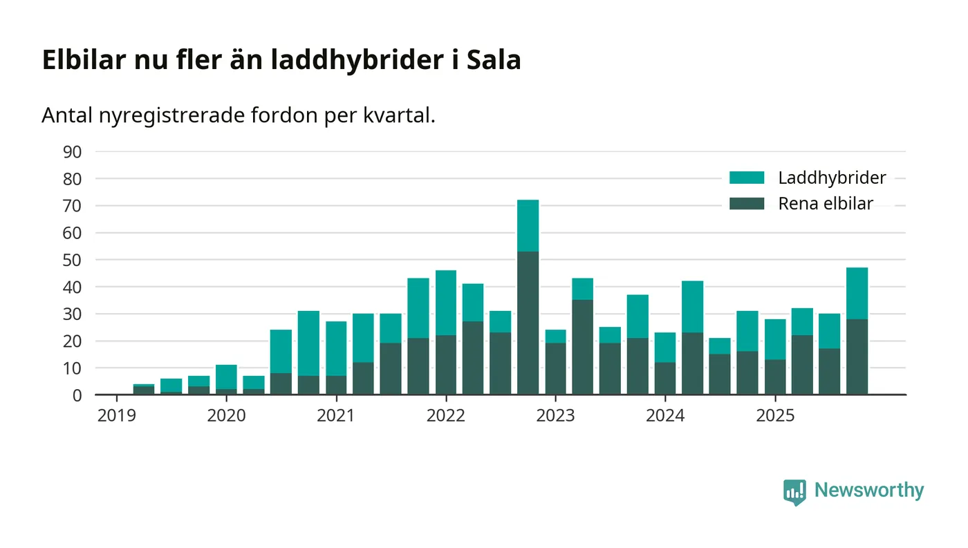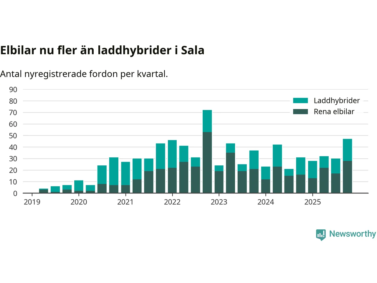 Under fjärde kvartalet 2025 var 62 procent av alla nyregistrerade personbilar i Sala laddbara (sammanlagt registrerades 76 nya bilar). Merparten av de laddbara bilarna var rena elbilar (37 procent av alla).