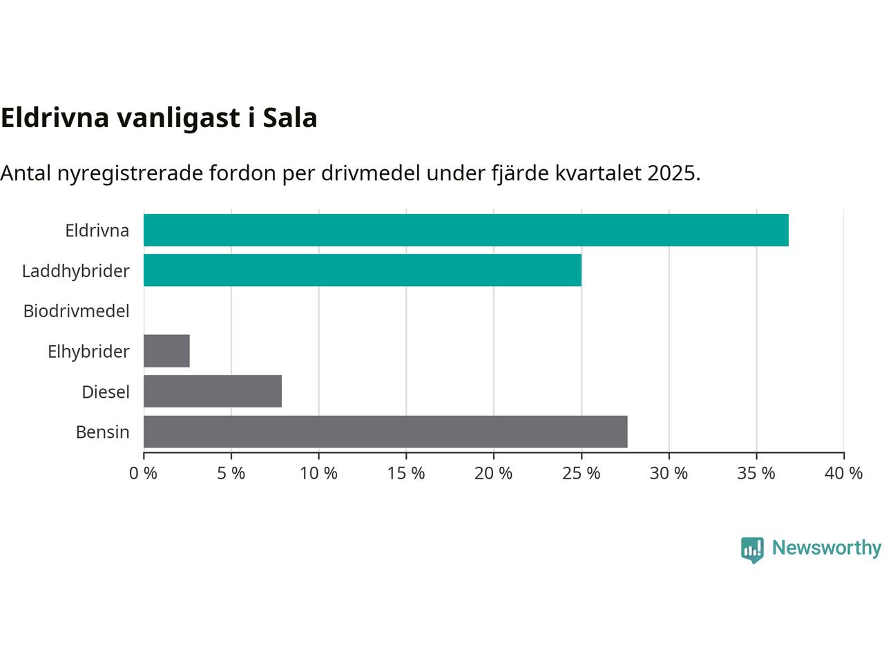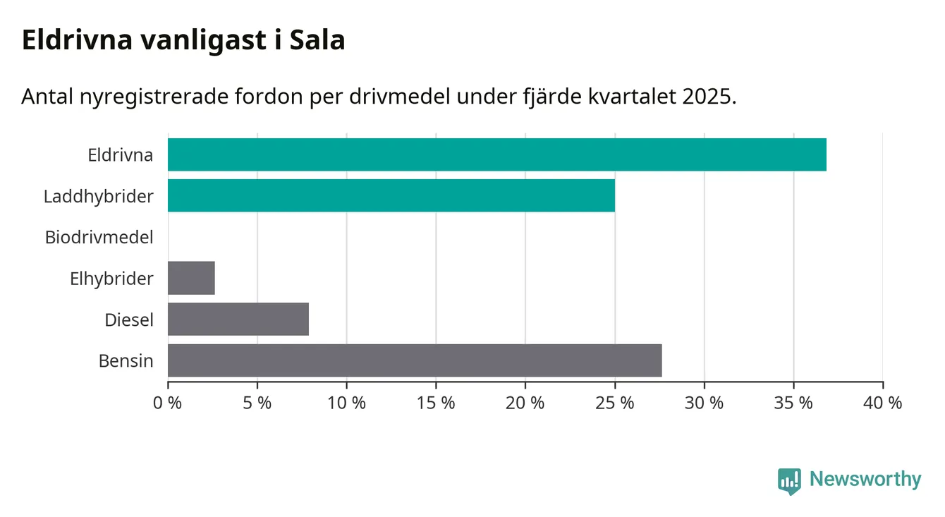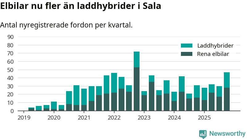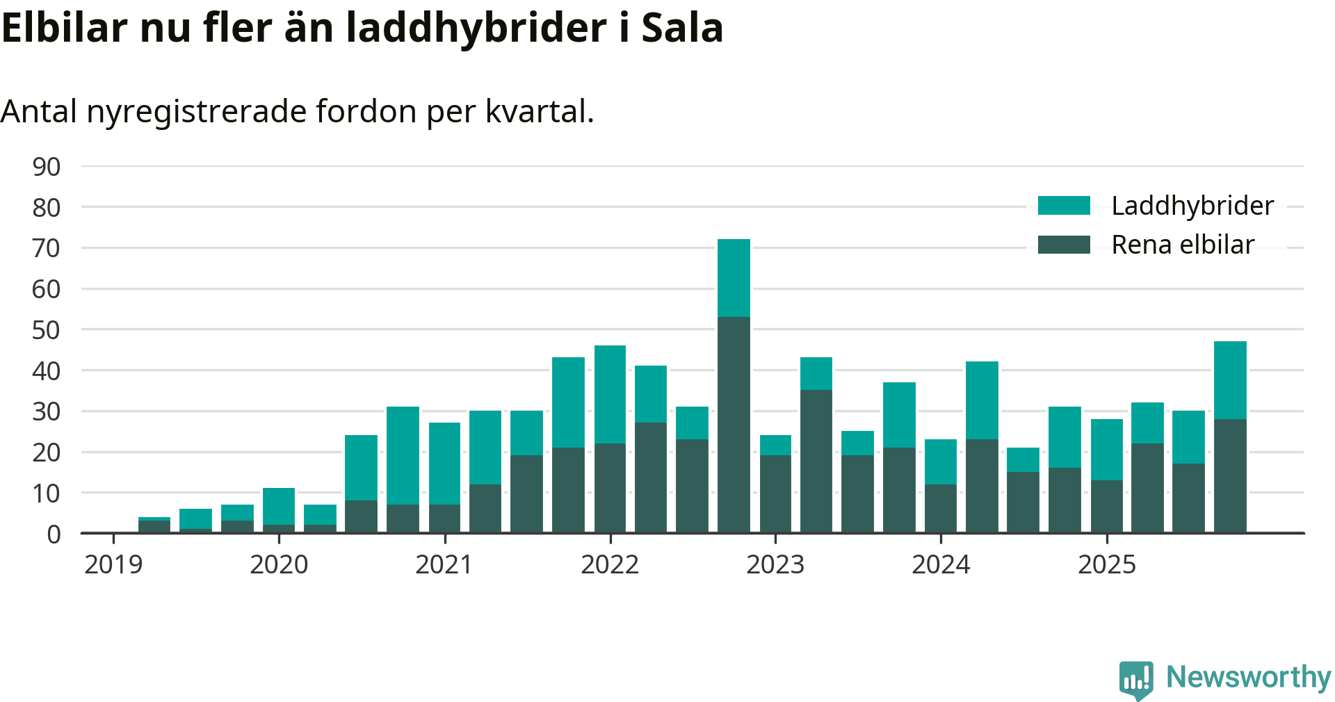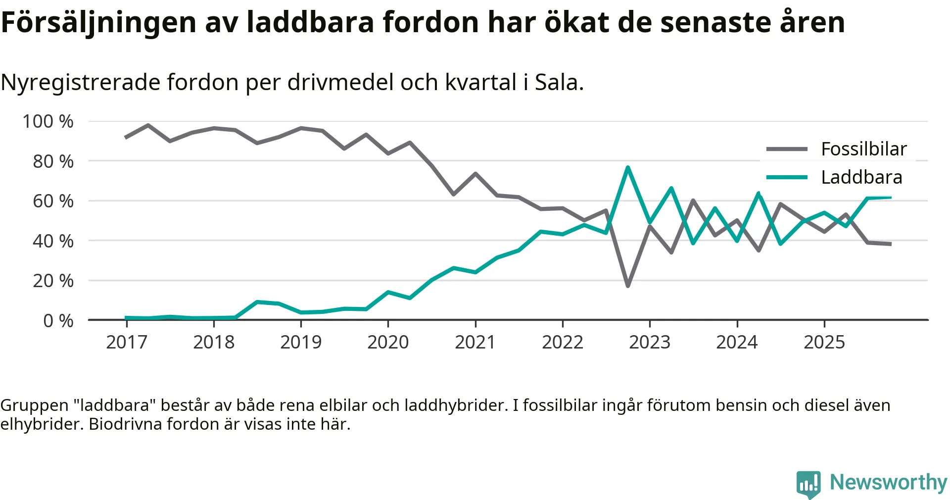 Under fjärde kvartalet 2025 var 62 procent av alla nyregistrerade personbilar i Sala laddbara (sammanlagt registrerades 76 nya bilar). Merparten av de laddbara bilarna var rena elbilar (37 procent av alla).