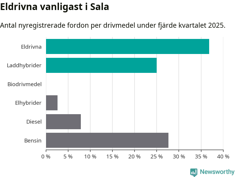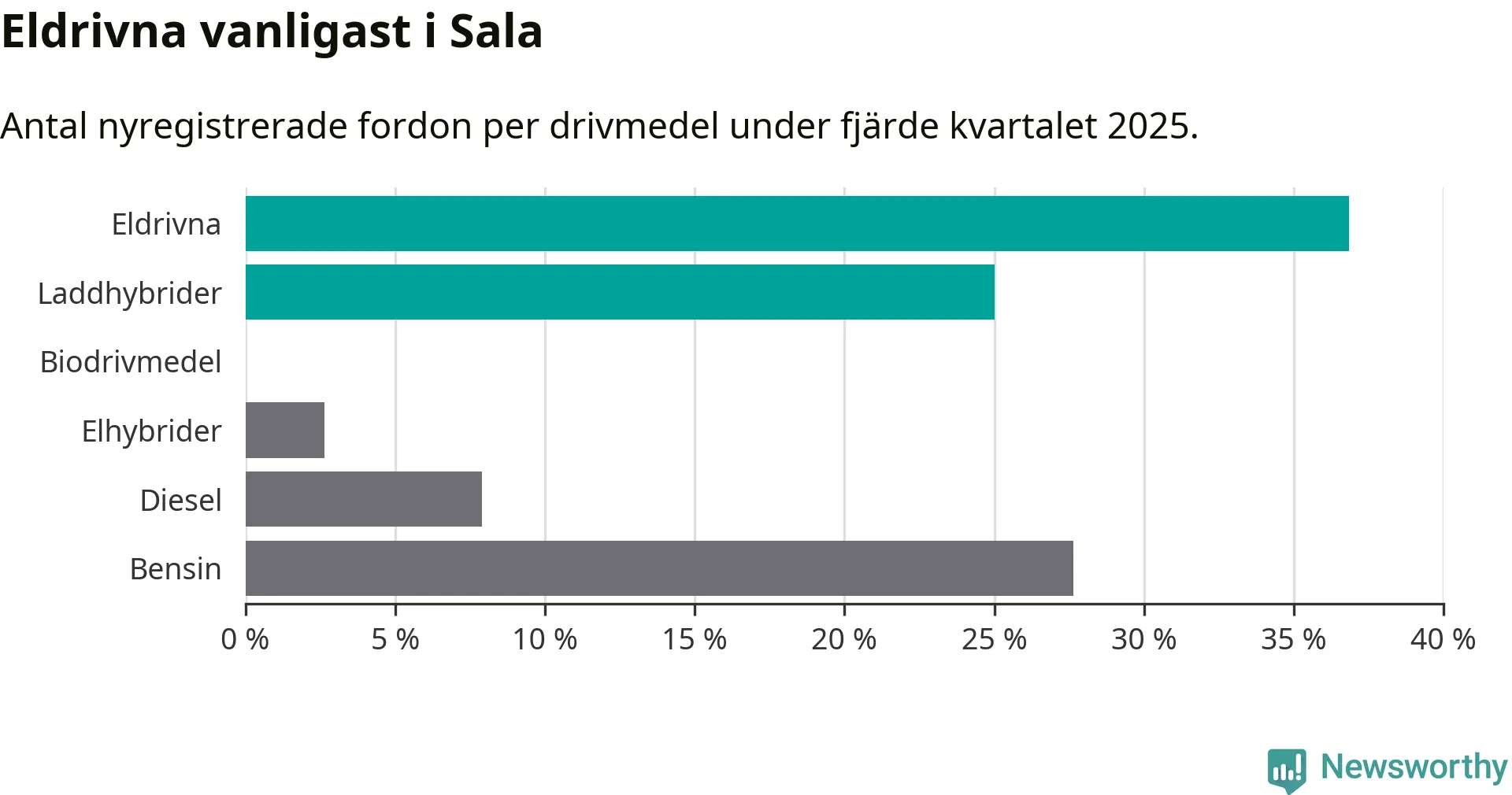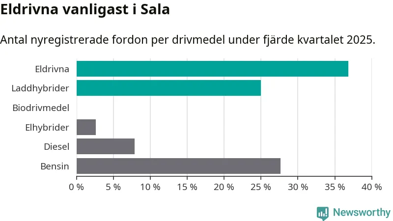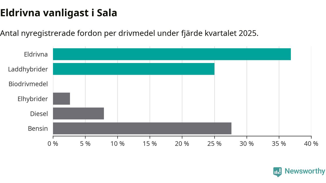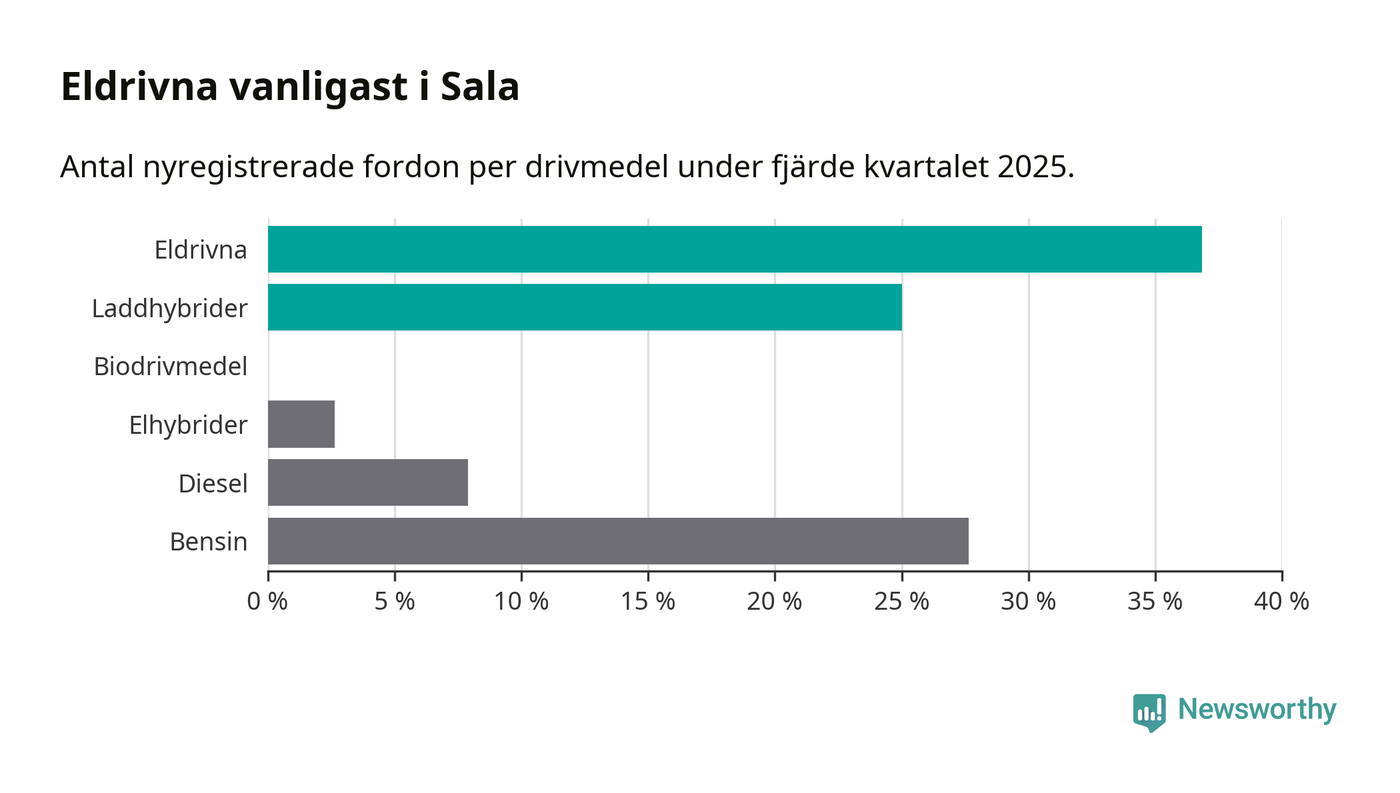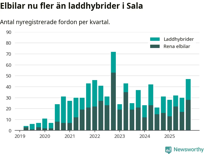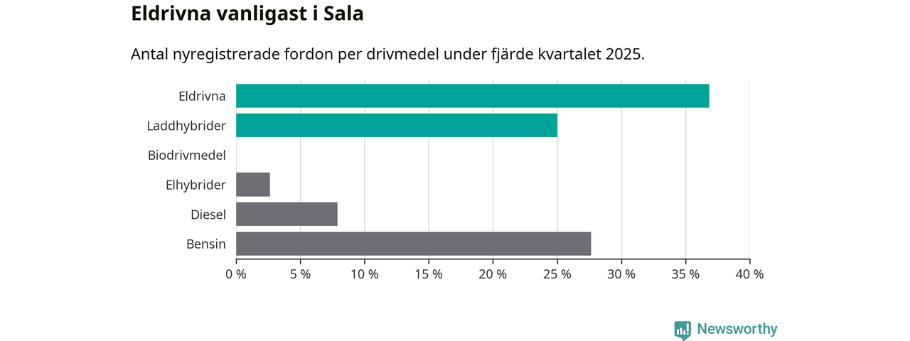 Under fjärde kvartalet 2025 var 62 procent av alla nyregistrerade personbilar i Sala laddbara (sammanlagt registrerades 76 nya bilar). Merparten av de laddbara bilarna var rena elbilar (37 procent av alla).