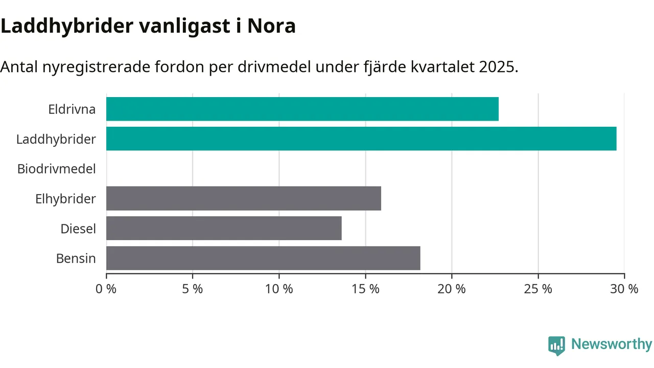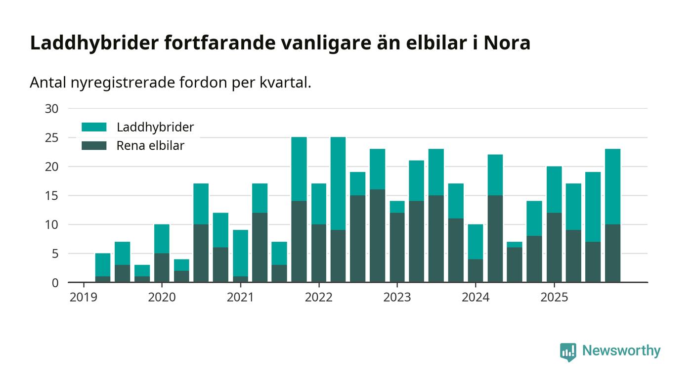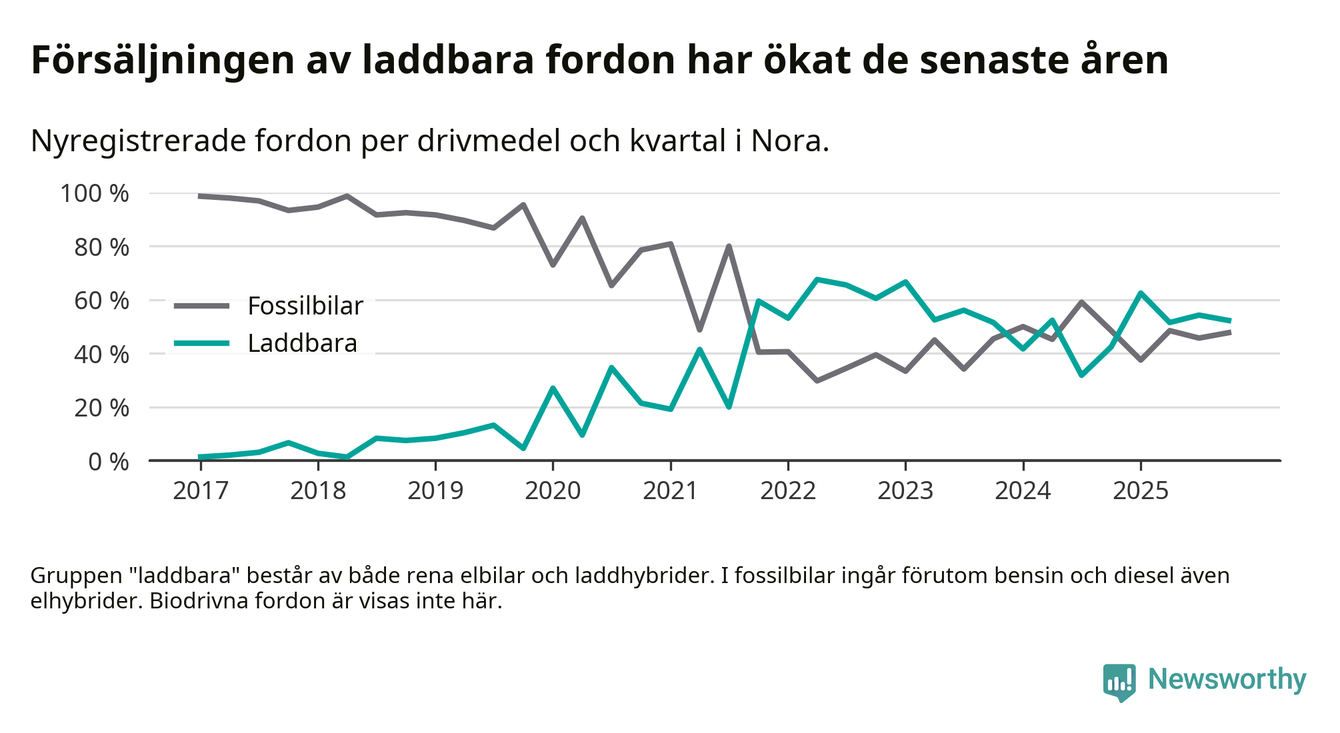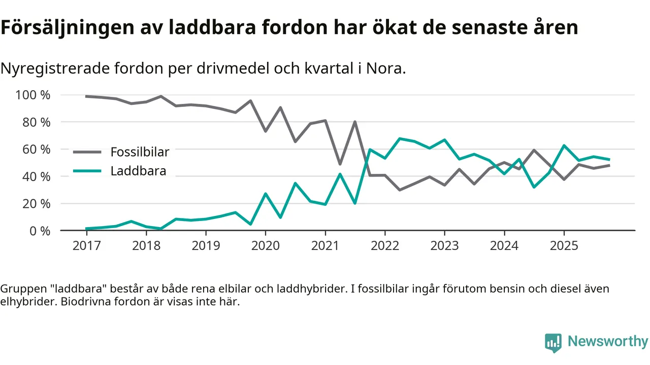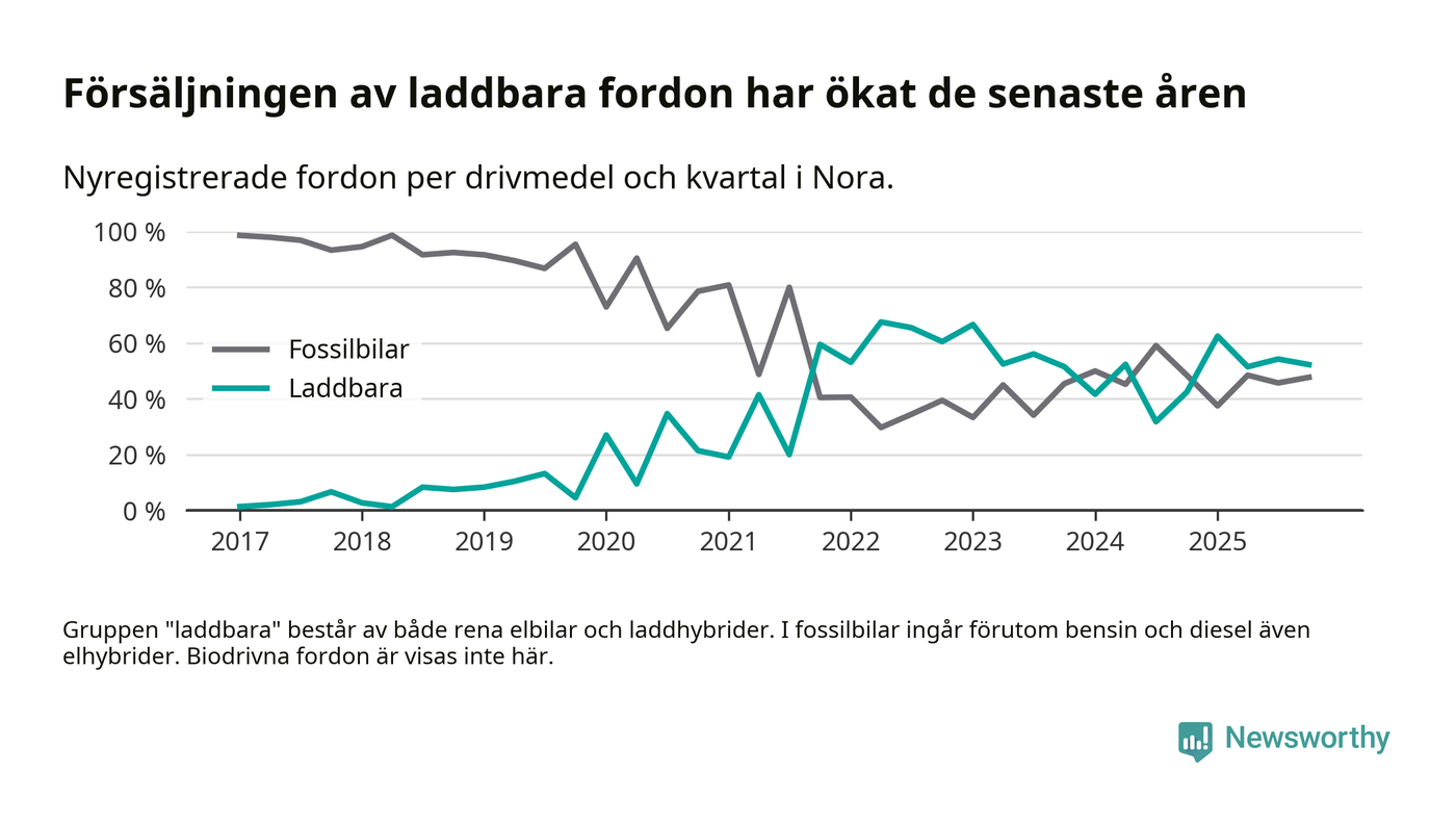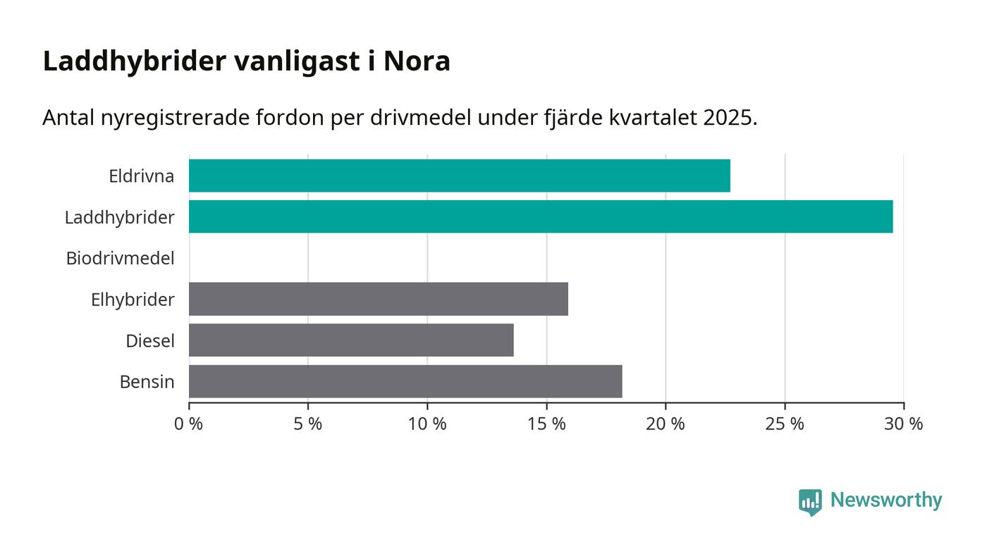 Under fjärde kvartalet 2025 var 52 procent av alla nyregistrerade personbilar i Nora laddbara (sammanlagt registrerades 44 nya bilar). Merparten av de laddbara bilarna var så kallade laddhybrider, det vill säga fordon som går att ladda och köra på el, men som även har en förbränningsmotor. 23 procent av alla nya bilar var rena elbilar.
