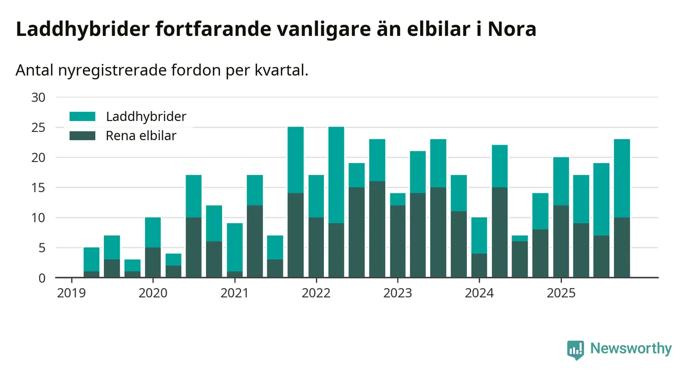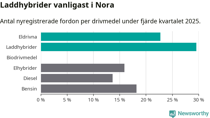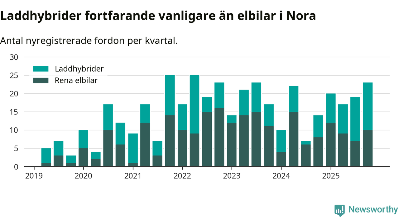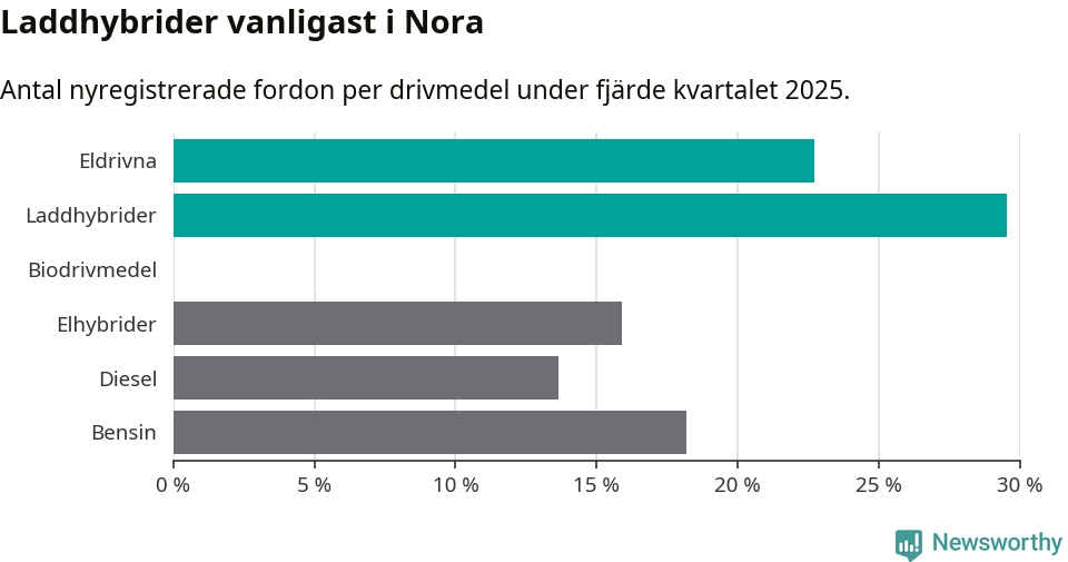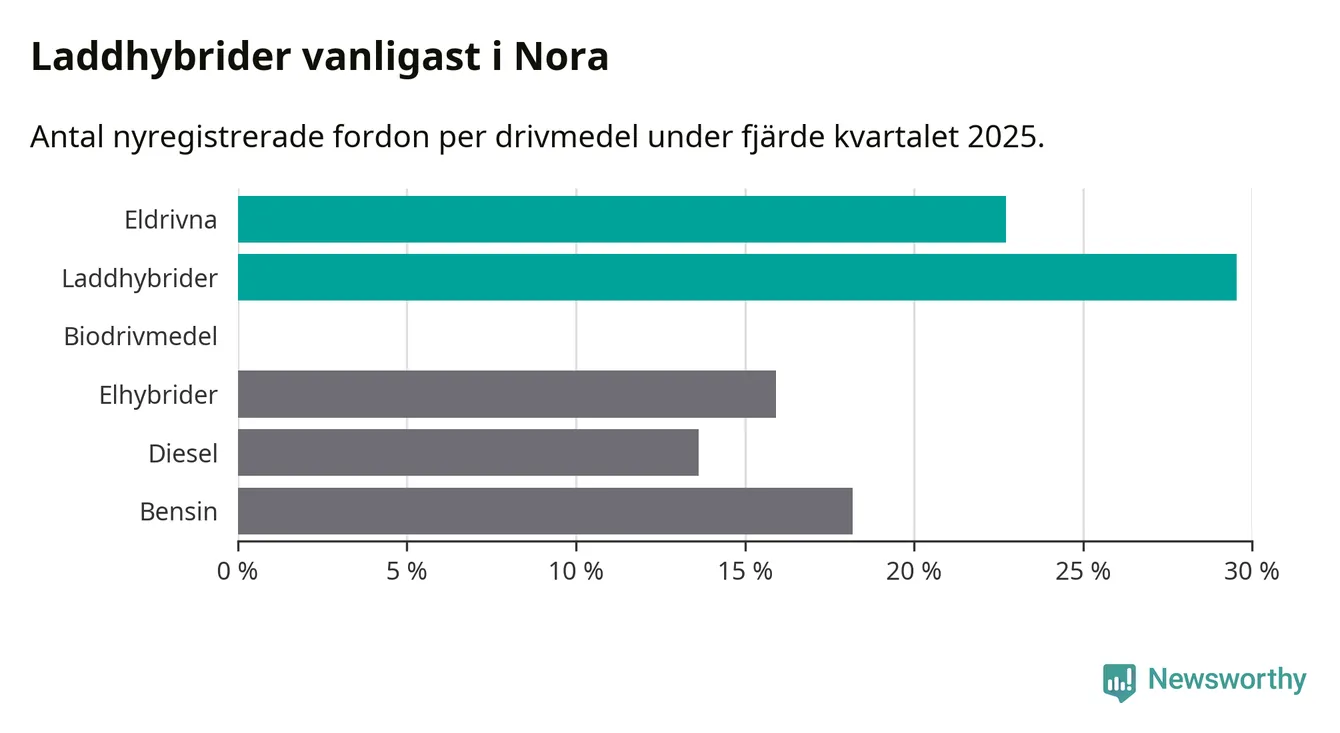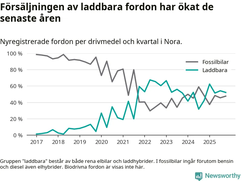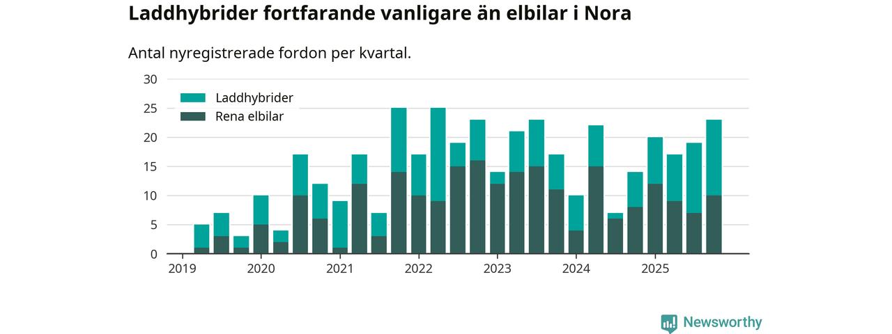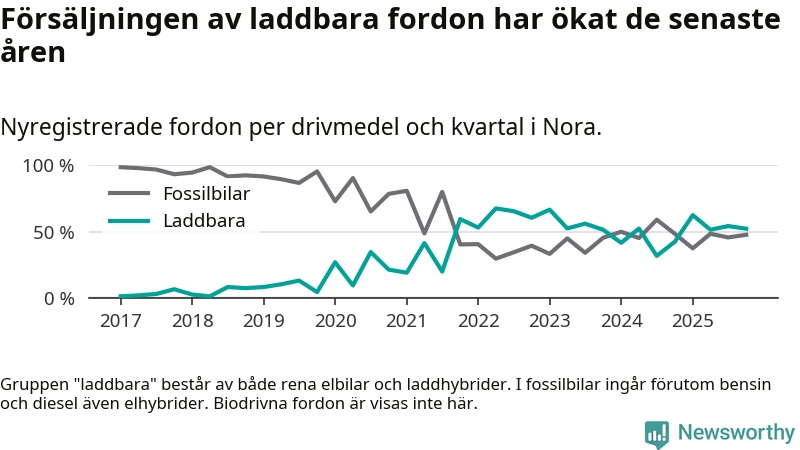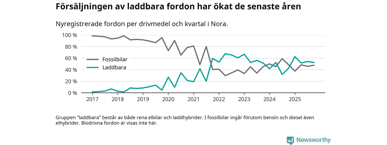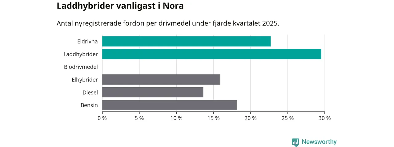 Under fjärde kvartalet 2025 var 52 procent av alla nyregistrerade personbilar i Nora laddbara (sammanlagt registrerades 44 nya bilar). Merparten av de laddbara bilarna var så kallade laddhybrider, det vill säga fordon som går att ladda och köra på el, men som även har en förbränningsmotor. 23 procent av alla nya bilar var rena elbilar.