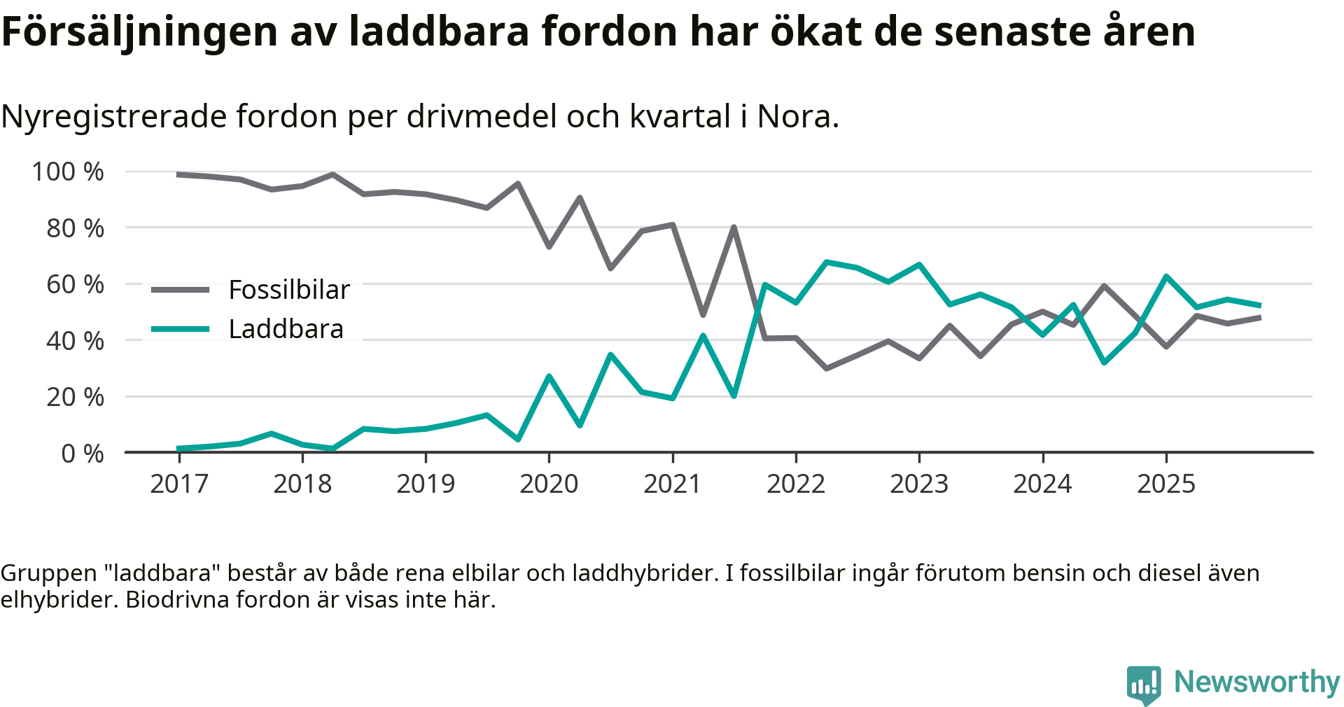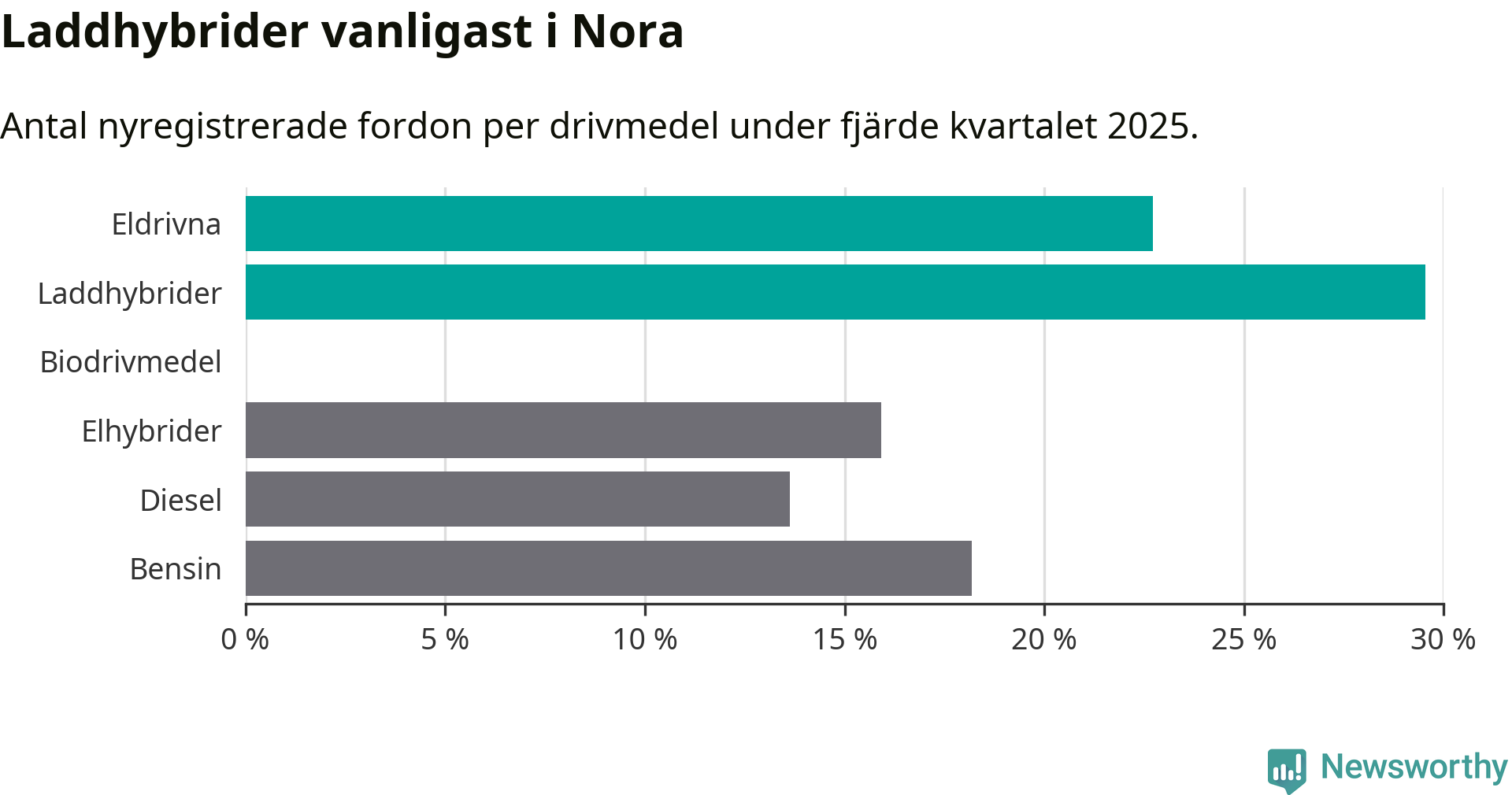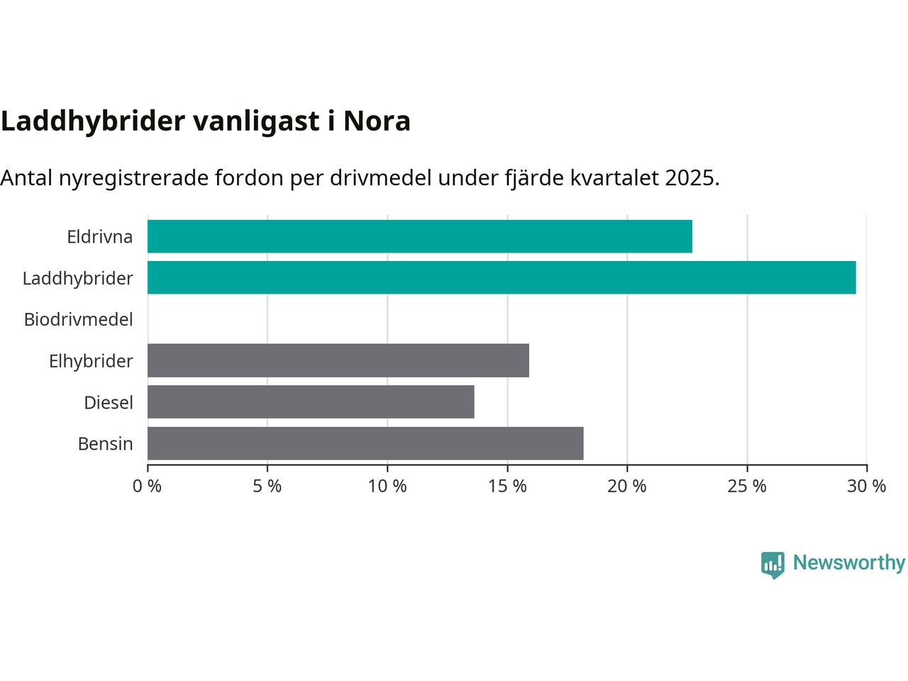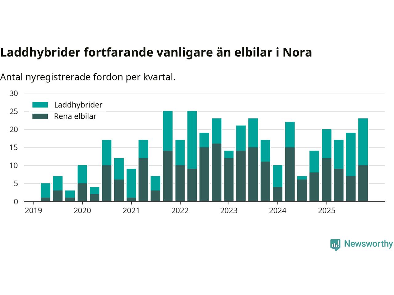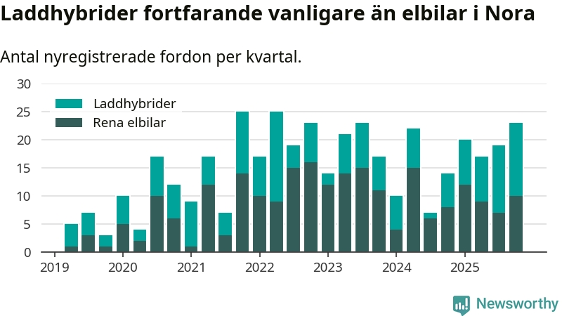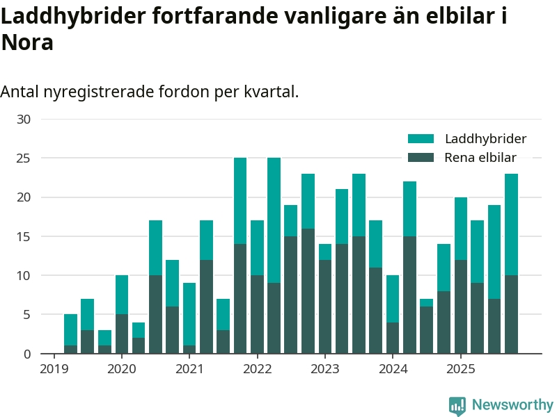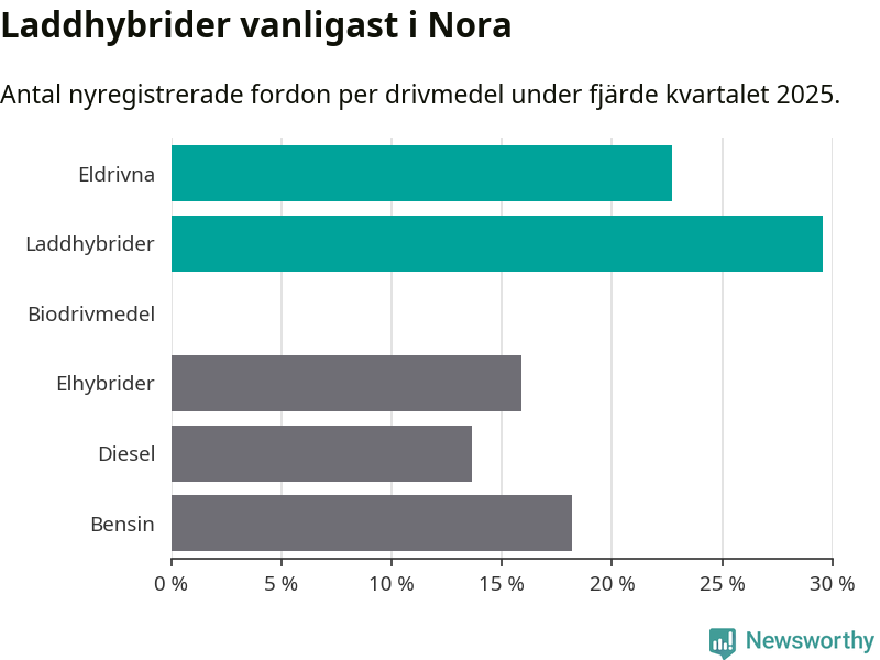 Under fjärde kvartalet 2025 var 52 procent av alla nyregistrerade personbilar i Nora laddbara (sammanlagt registrerades 44 nya bilar). Merparten av de laddbara bilarna var så kallade laddhybrider, det vill säga fordon som går att ladda och köra på el, men som även har en förbränningsmotor. 23 procent av alla nya bilar var rena elbilar.
