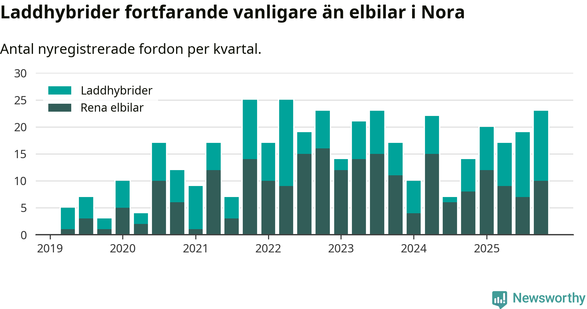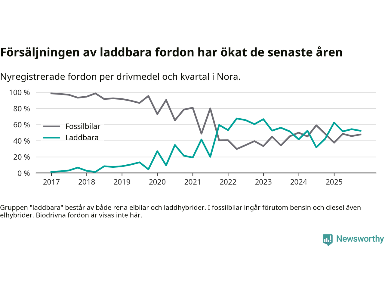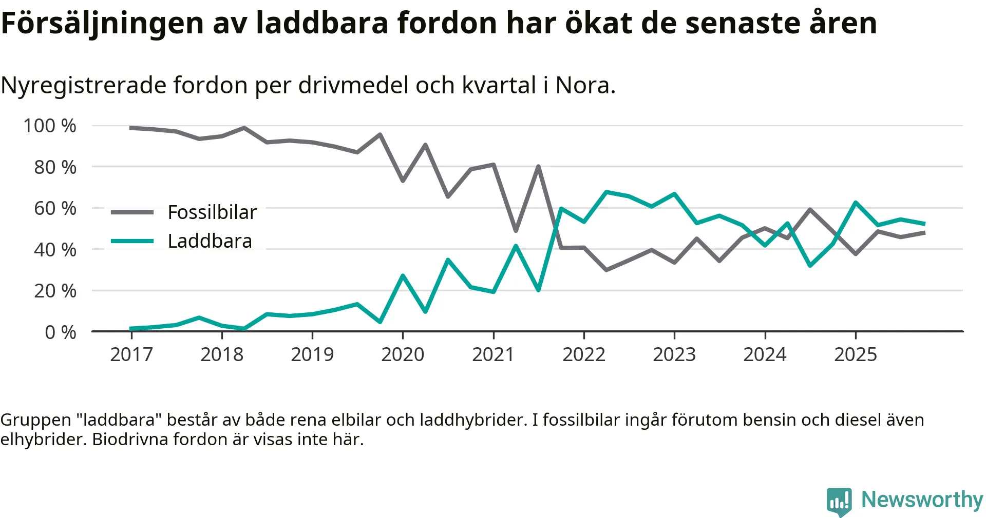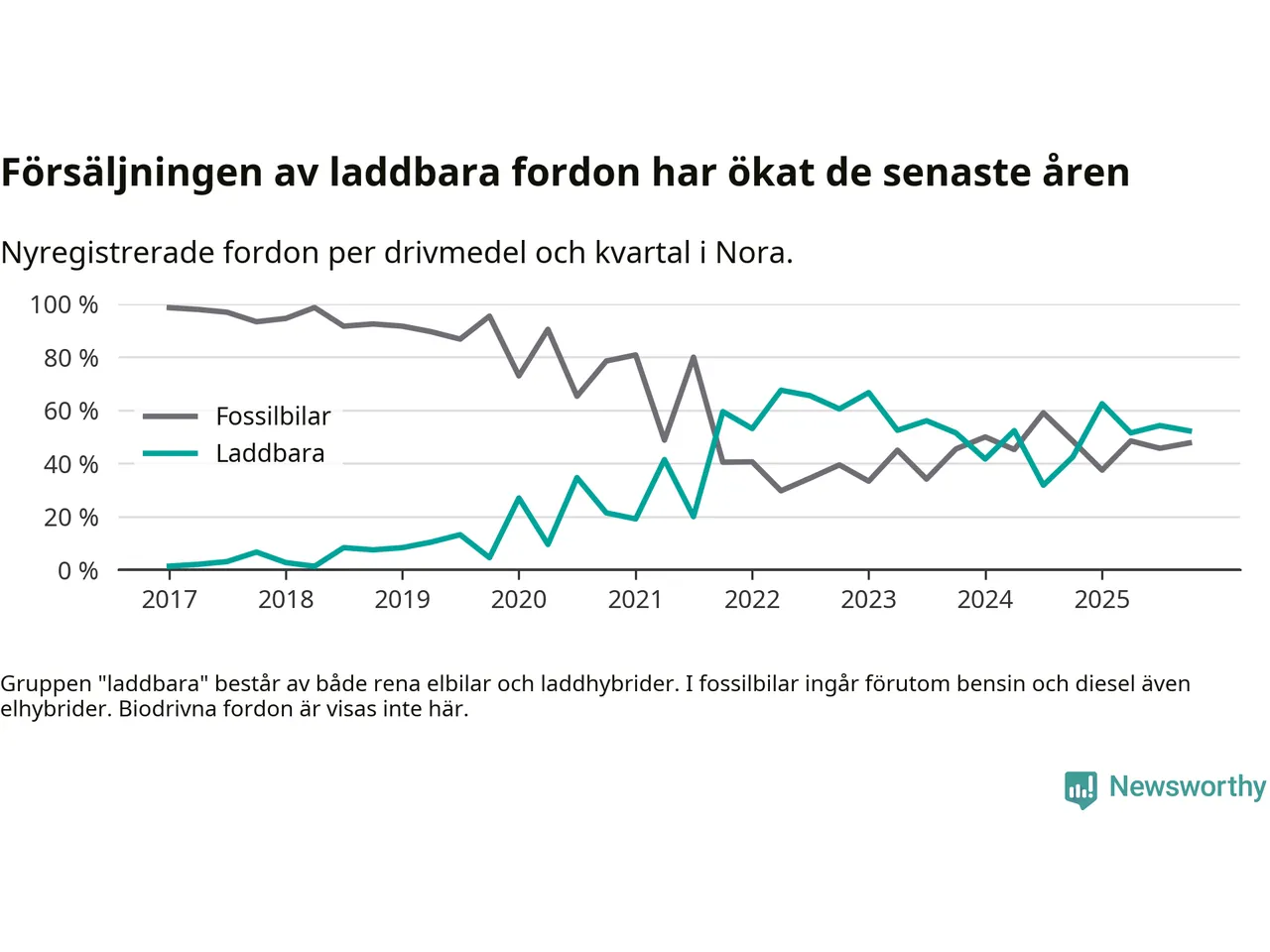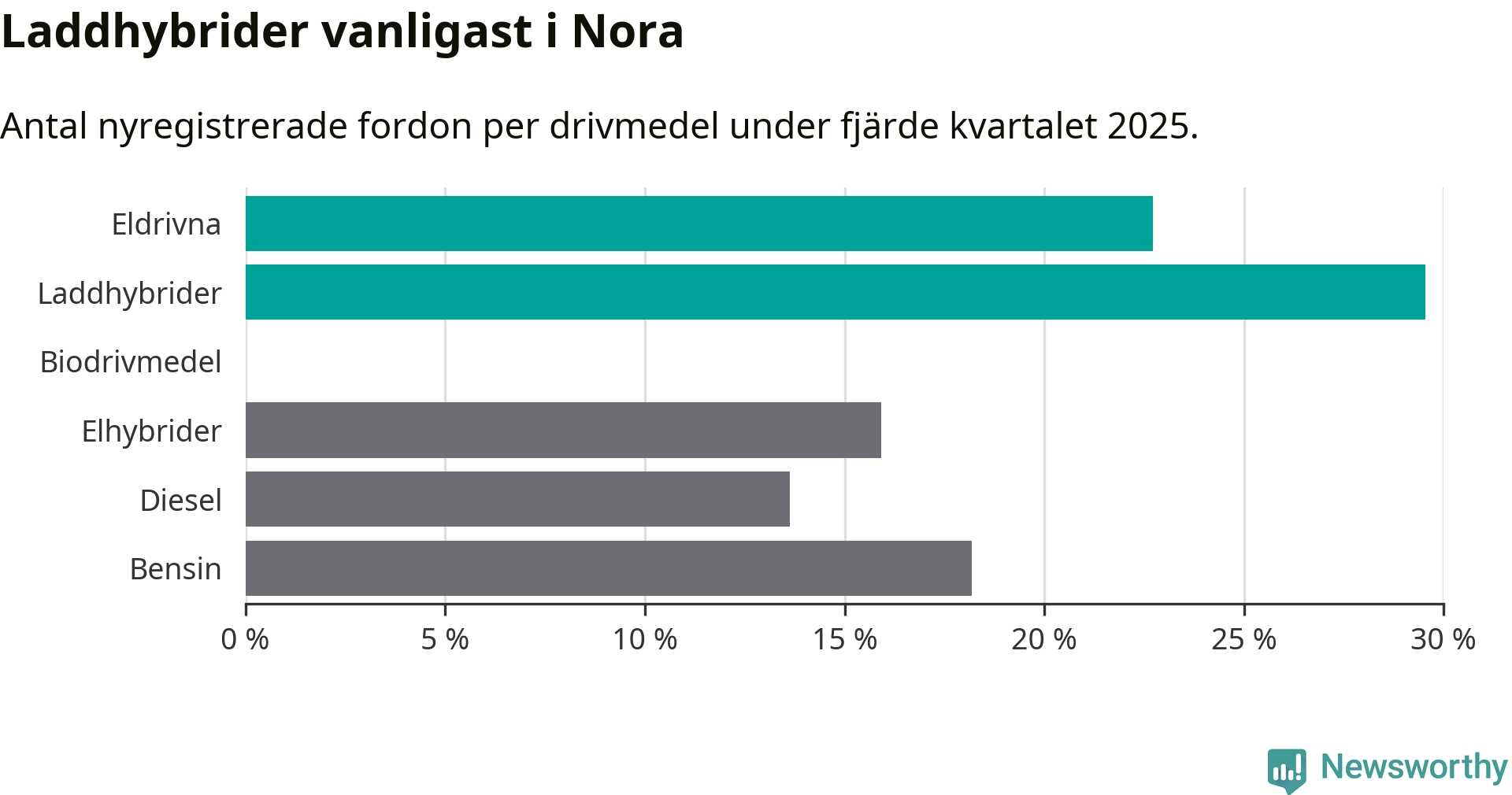 Under fjärde kvartalet 2025 var 52 procent av alla nyregistrerade personbilar i Nora laddbara (sammanlagt registrerades 44 nya bilar). Merparten av de laddbara bilarna var så kallade laddhybrider, det vill säga fordon som går att ladda och köra på el, men som även har en förbränningsmotor. 23 procent av alla nya bilar var rena elbilar.