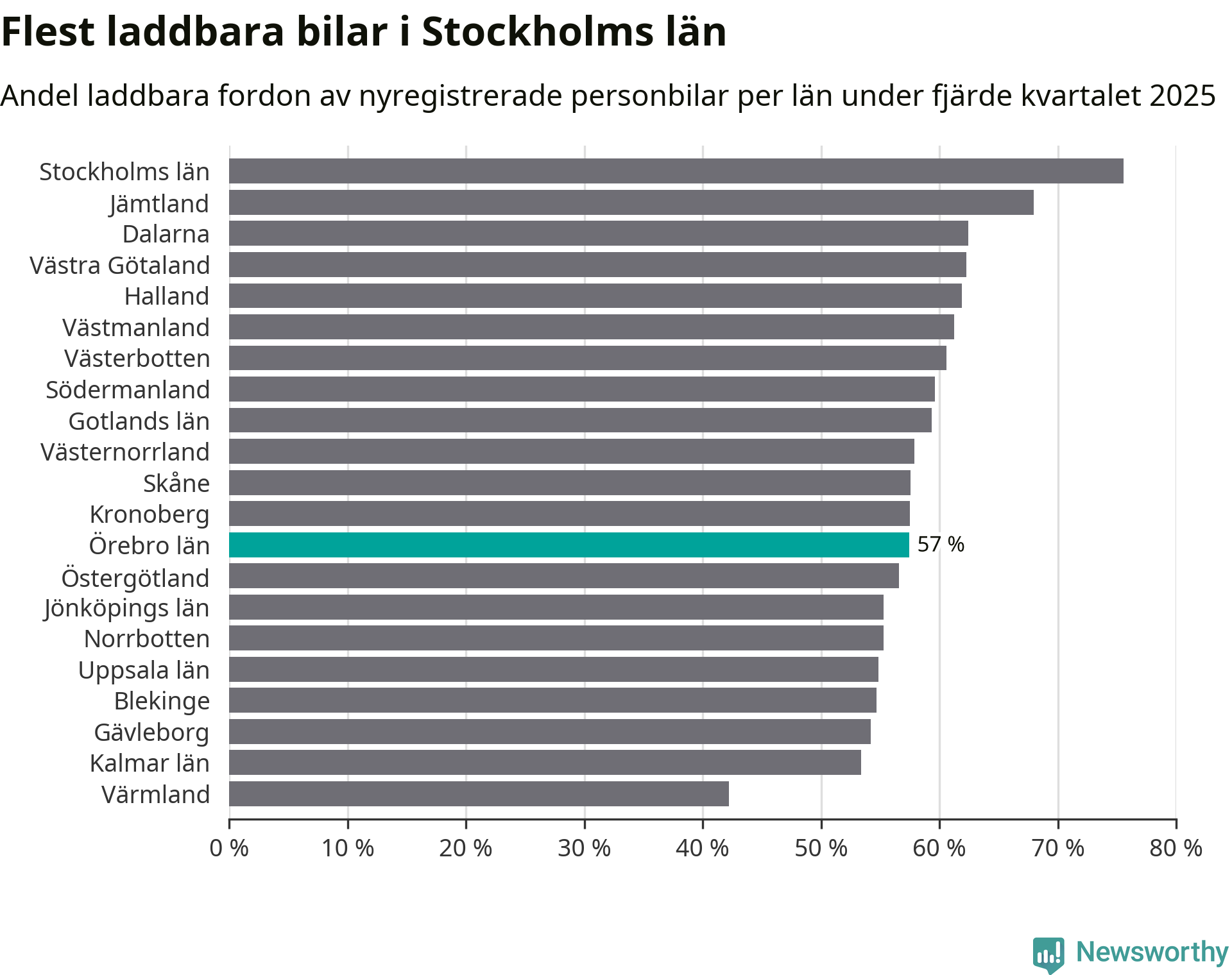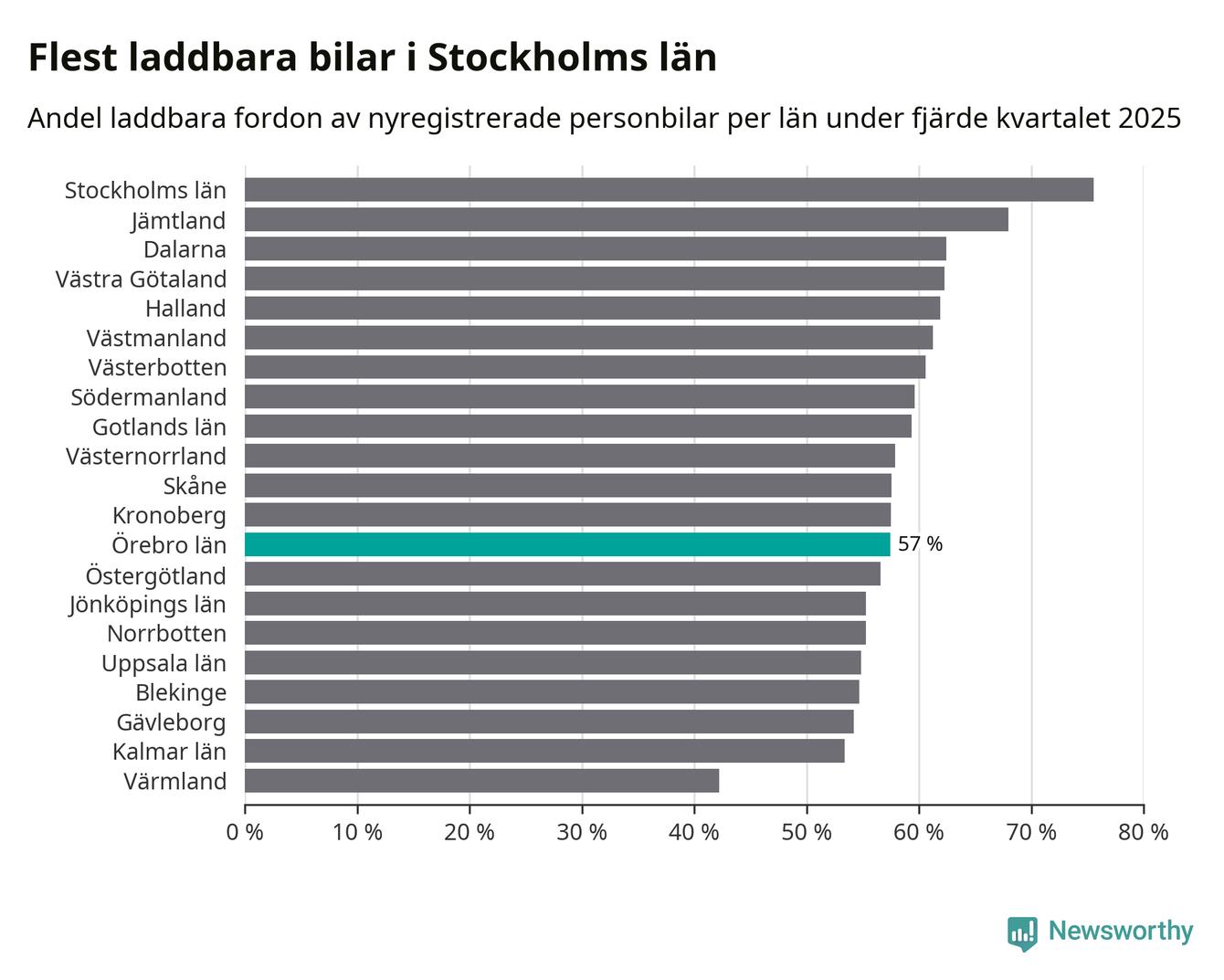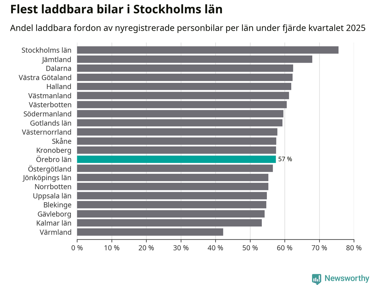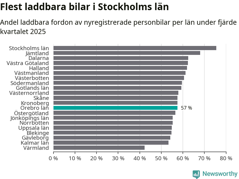 I hela landet var 64 procent av alla nya bilar laddbara under fjärde kvartalet. Det är något fler än föregående kvartal (+2,9 procentenheter). I Örebro län var 57 procent av de nya bilarna laddbara, vilket är fler än föregående kvartal (+4 procentenheter).