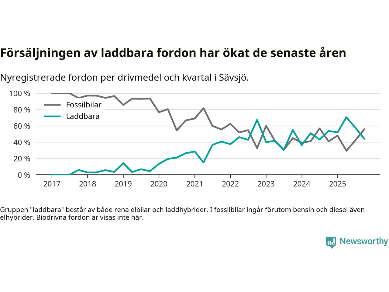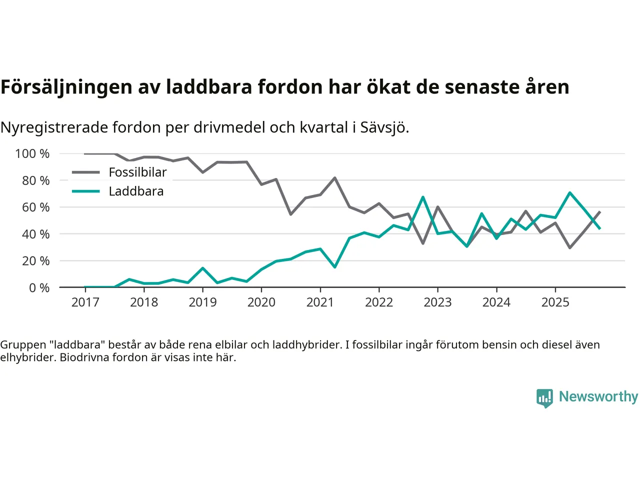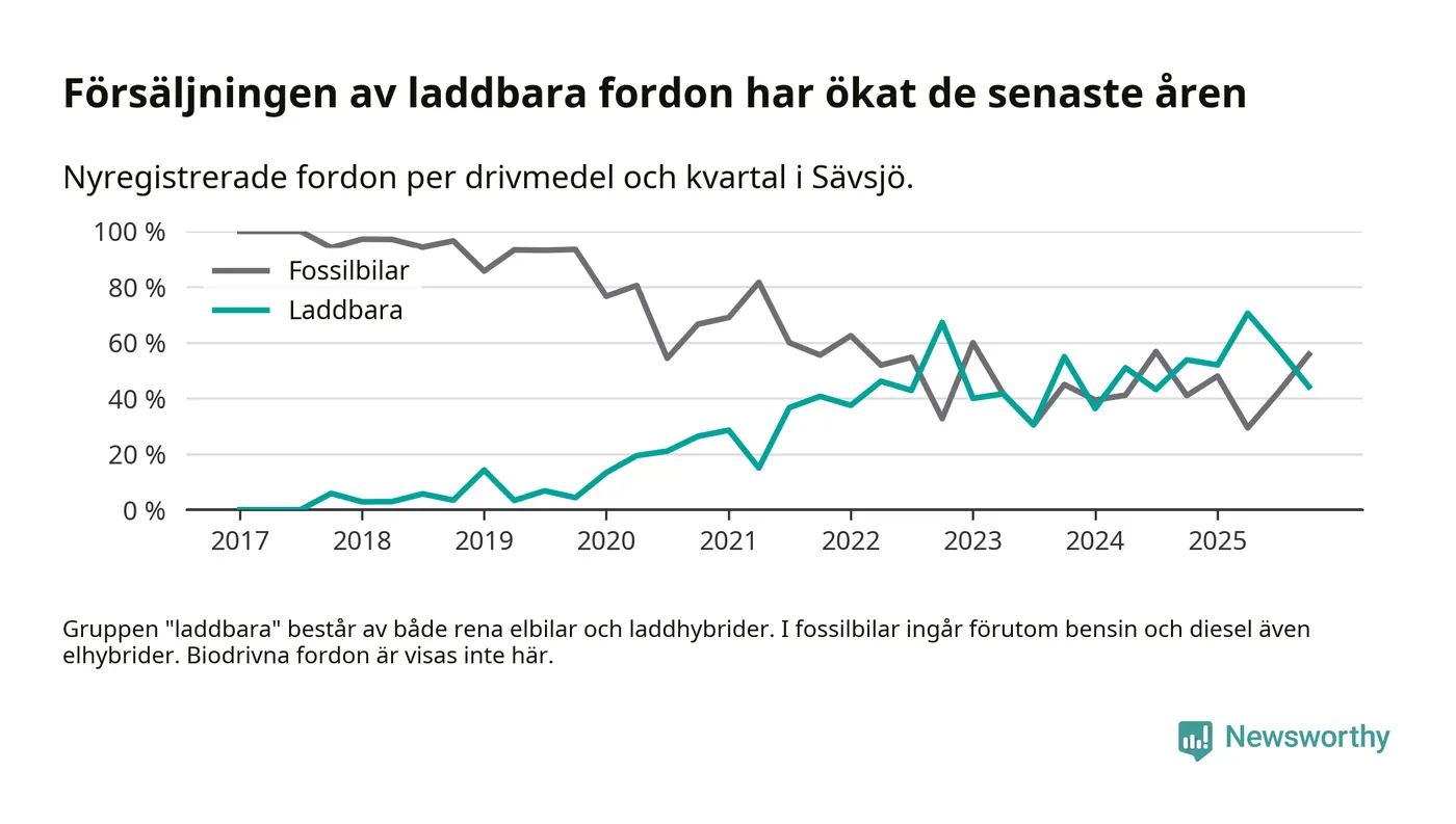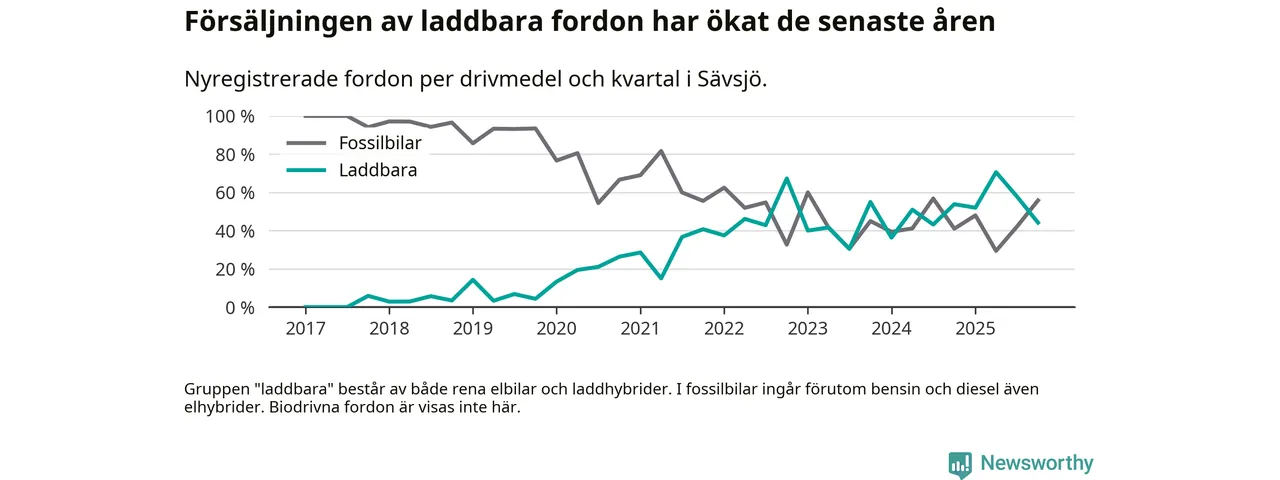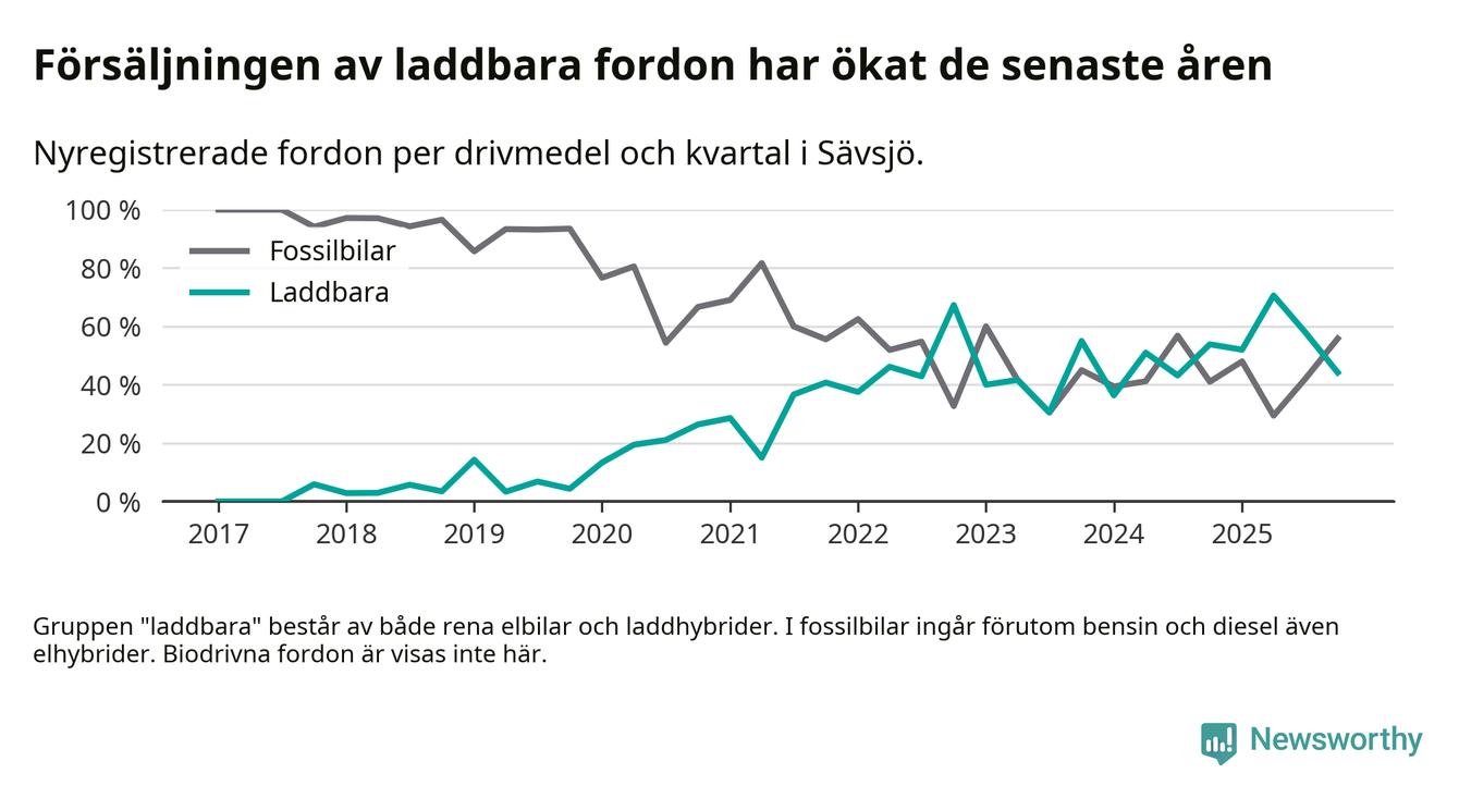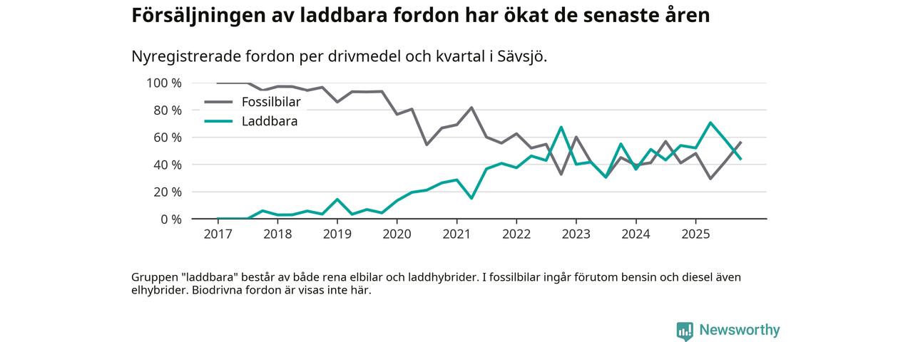 Under fjärde kvartalet 2025 var 44 procent av alla nyregistrerade personbilar i Sävsjö laddbara (sammanlagt registrerades 43 nya bilar). Merparten av de laddbara bilarna var så kallade laddhybrider, det vill säga fordon som går att ladda och köra på el, men som även har en förbränningsmotor. 19 procent av alla nya bilar var rena elbilar.