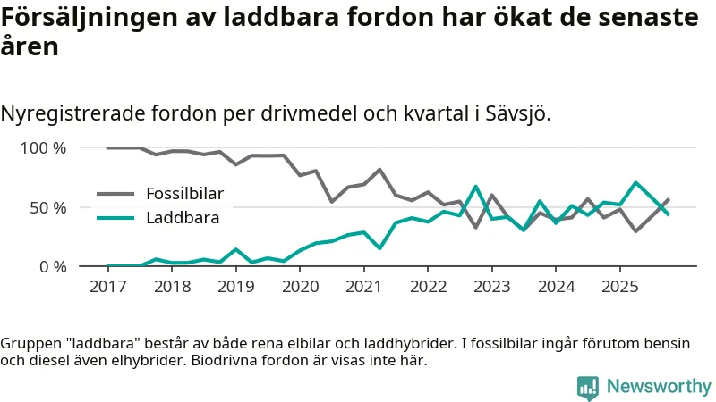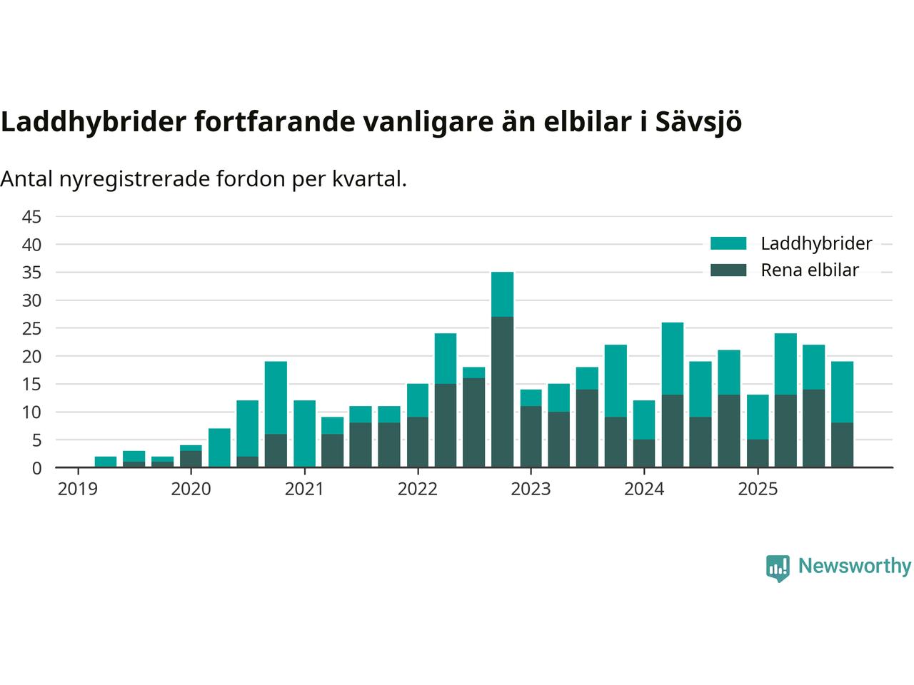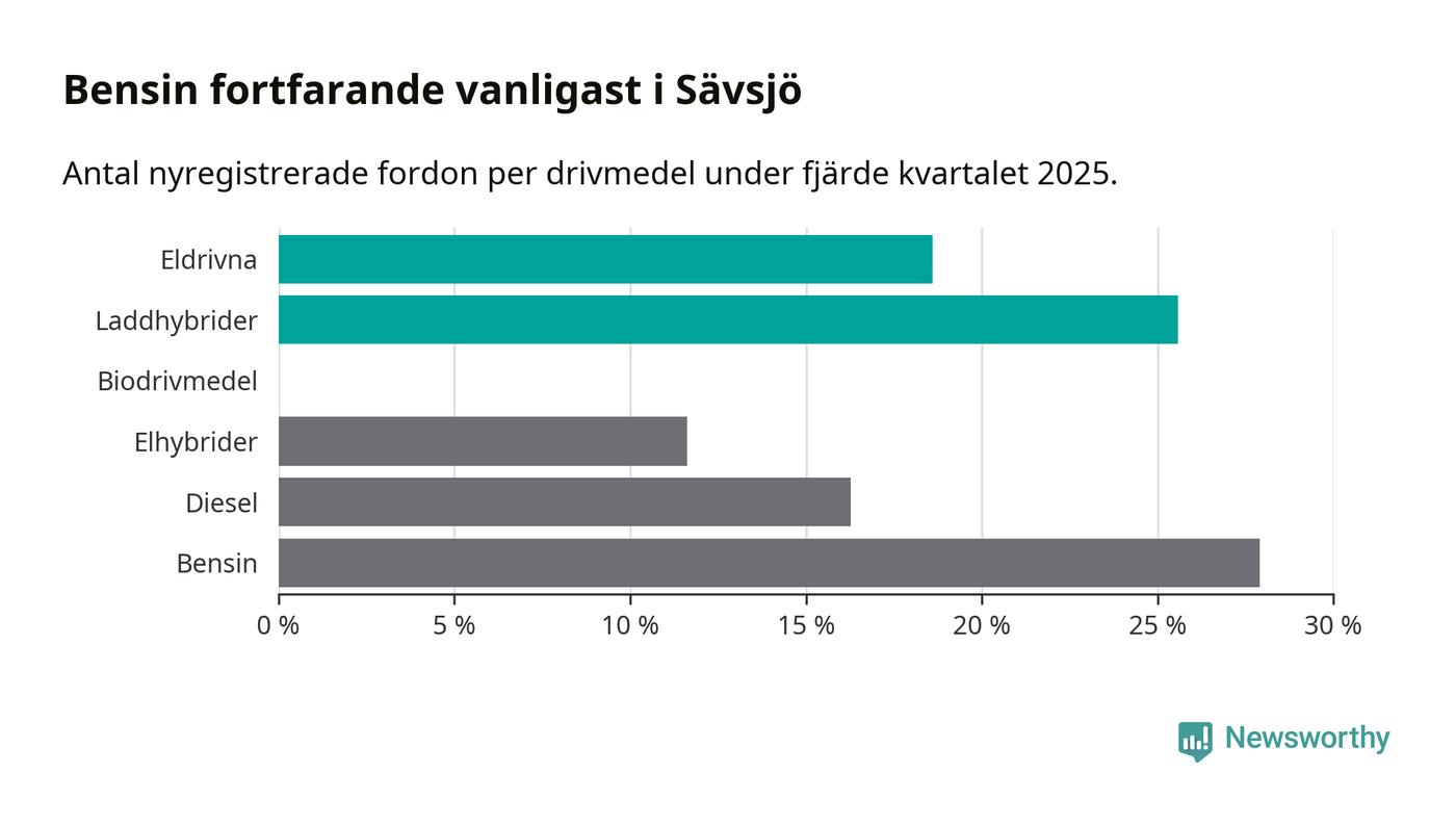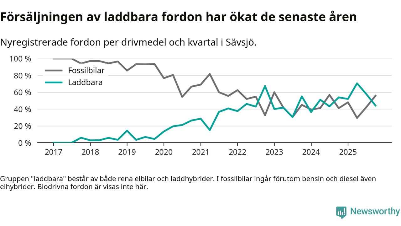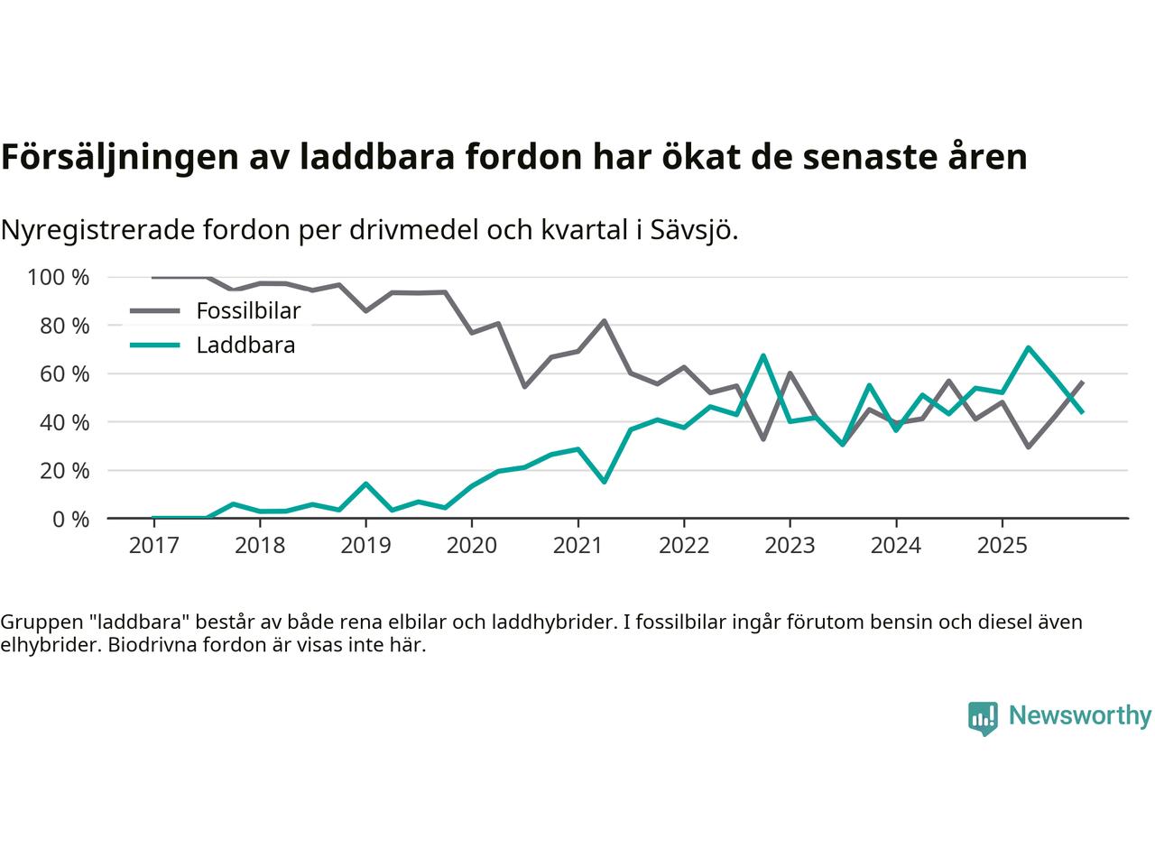 Under fjärde kvartalet 2025 var 44 procent av alla nyregistrerade personbilar i Sävsjö laddbara (sammanlagt registrerades 43 nya bilar). Merparten av de laddbara bilarna var så kallade laddhybrider, det vill säga fordon som går att ladda och köra på el, men som även har en förbränningsmotor. 19 procent av alla nya bilar var rena elbilar.
