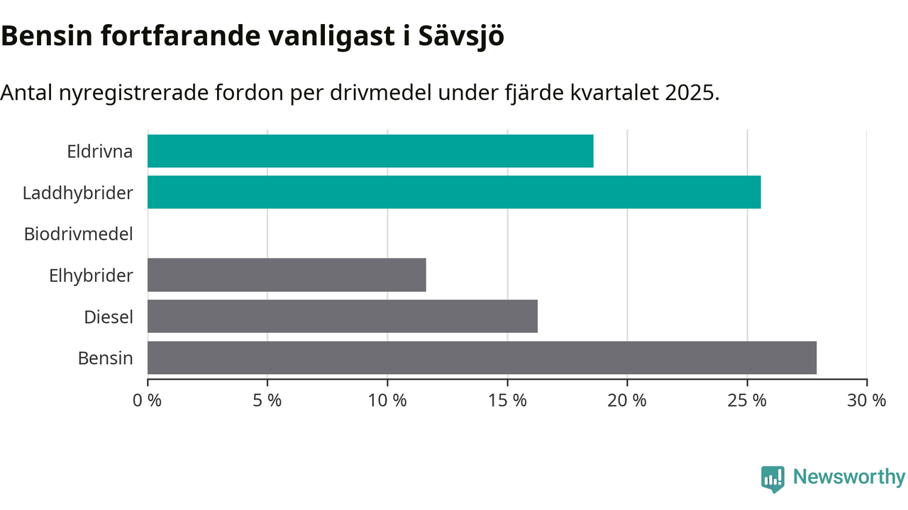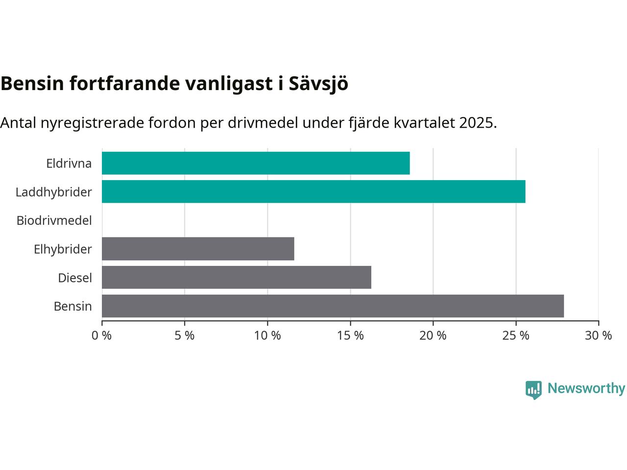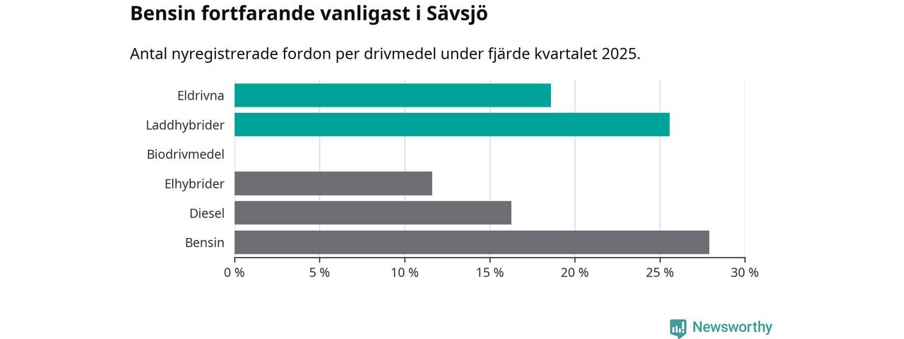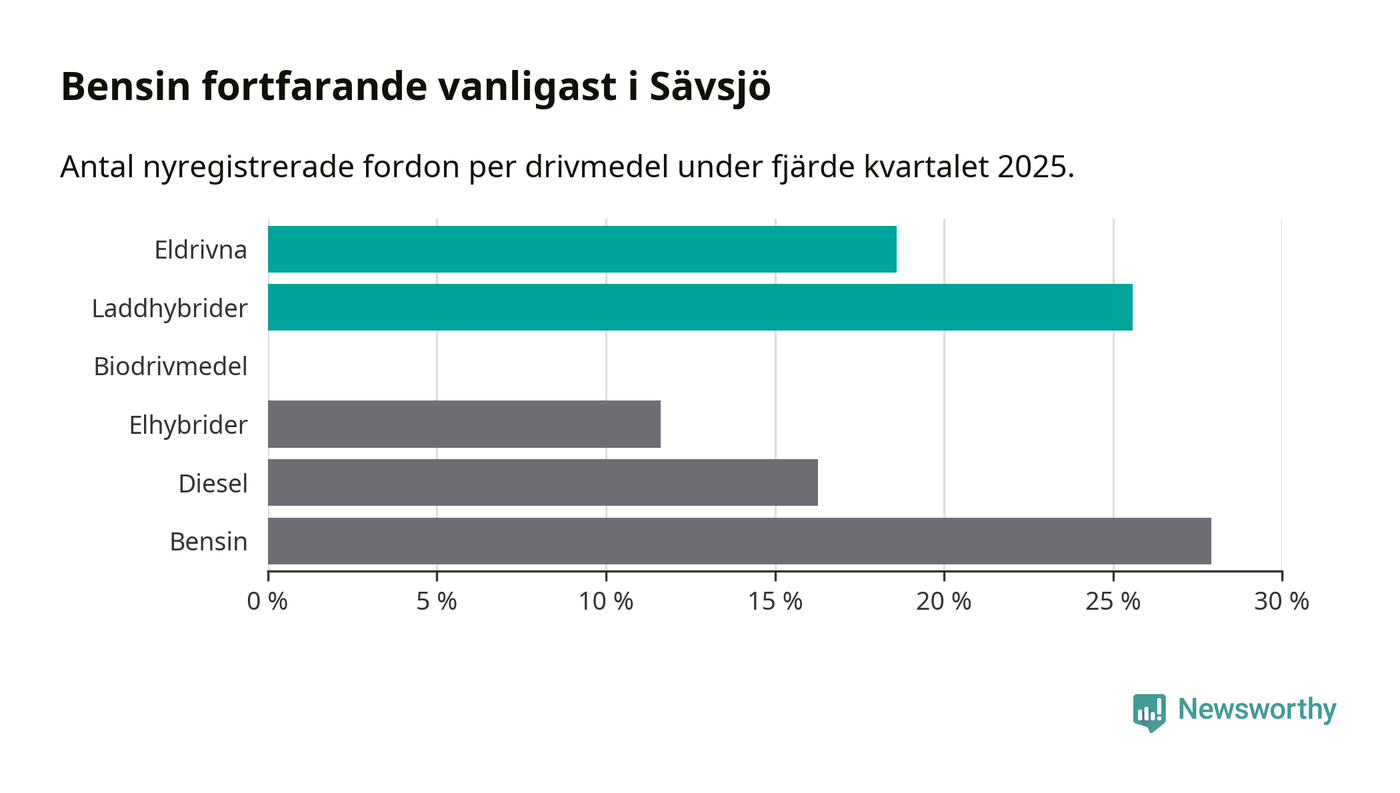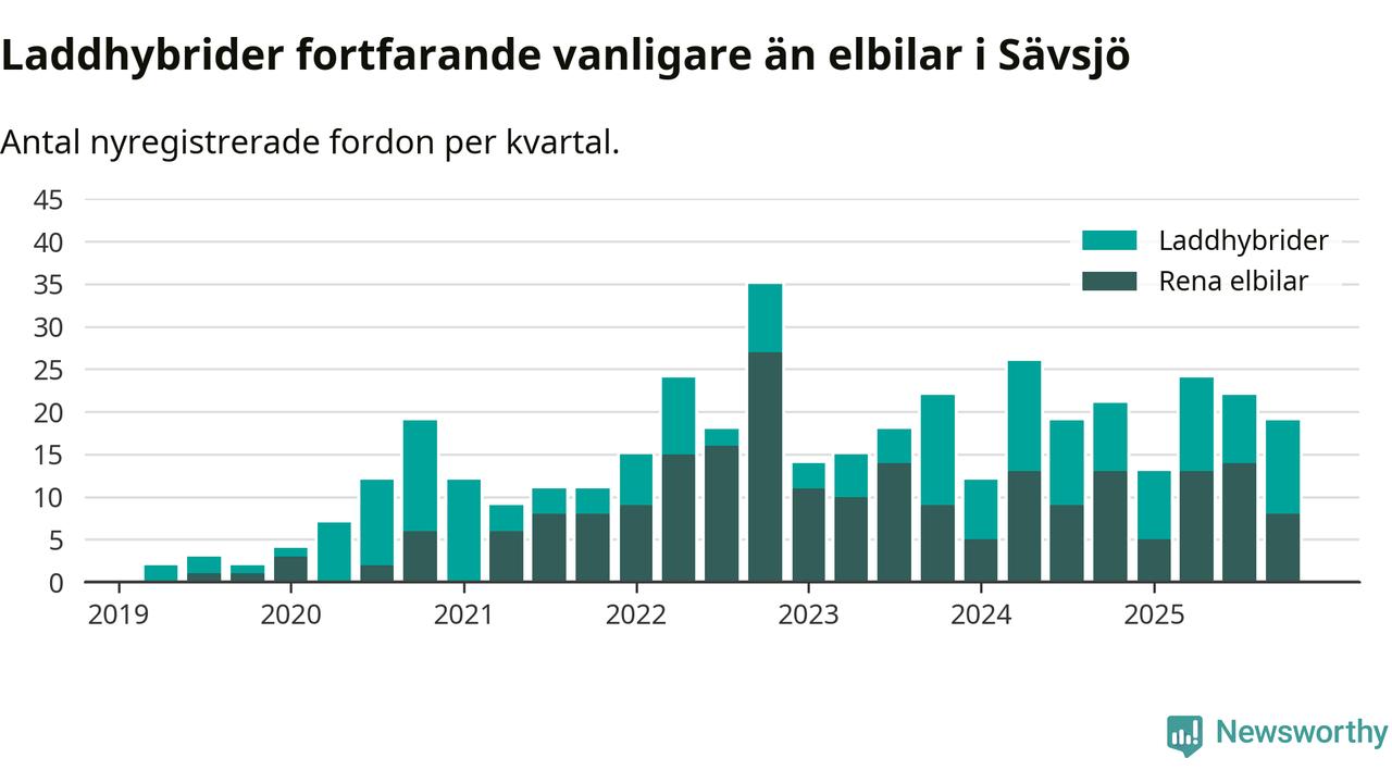 Under fjärde kvartalet 2025 var 44 procent av alla nyregistrerade personbilar i Sävsjö laddbara (sammanlagt registrerades 43 nya bilar). Merparten av de laddbara bilarna var så kallade laddhybrider, det vill säga fordon som går att ladda och köra på el, men som även har en förbränningsmotor. 19 procent av alla nya bilar var rena elbilar.