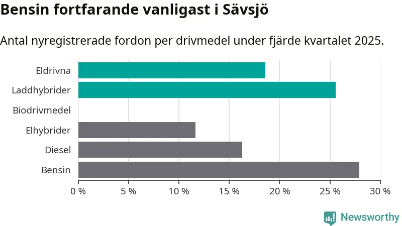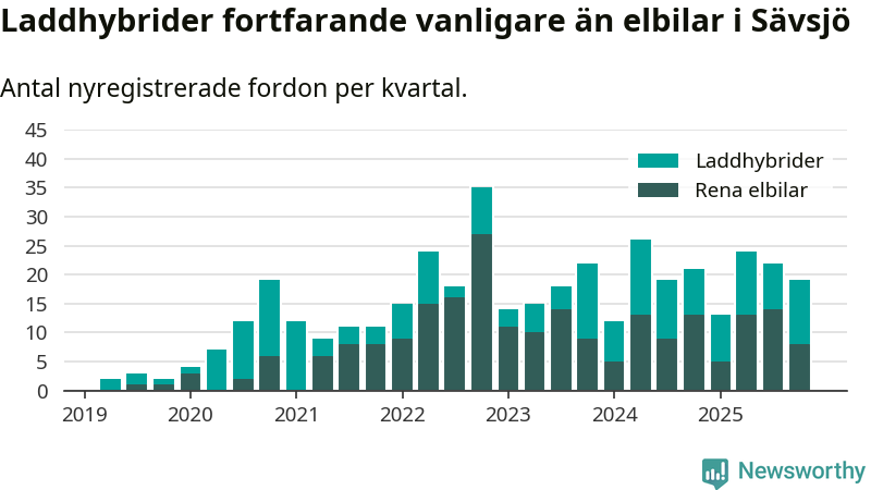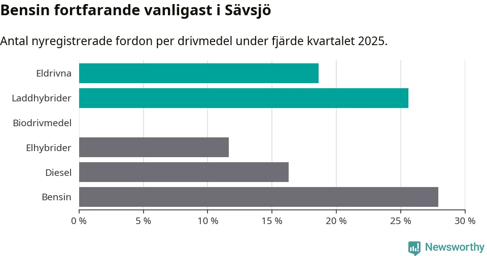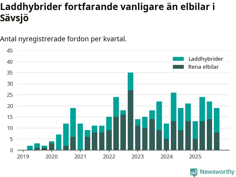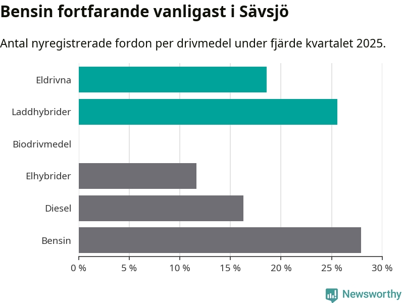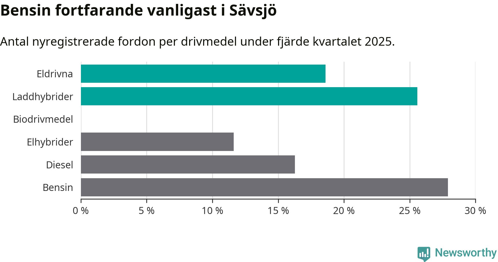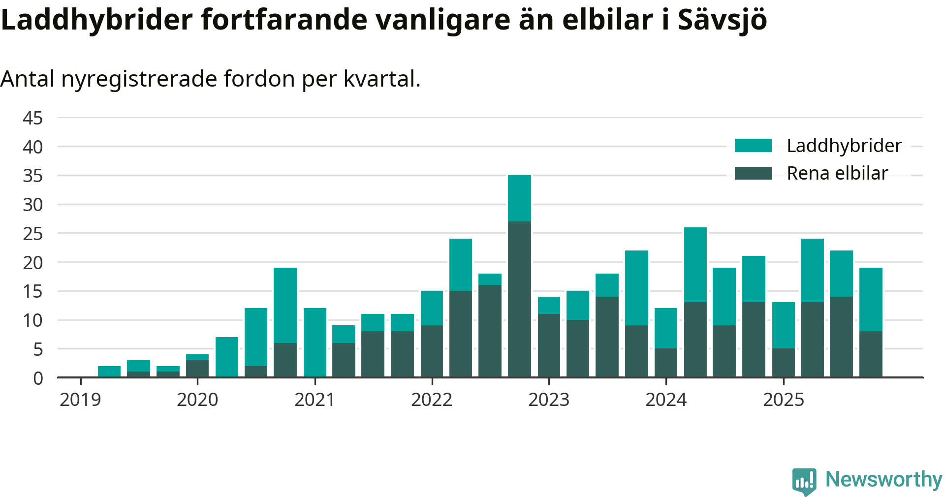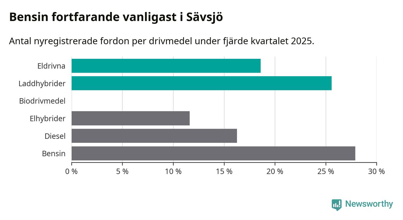 Under fjärde kvartalet 2025 var 44 procent av alla nyregistrerade personbilar i Sävsjö laddbara (sammanlagt registrerades 43 nya bilar). Merparten av de laddbara bilarna var så kallade laddhybrider, det vill säga fordon som går att ladda och köra på el, men som även har en förbränningsmotor. 19 procent av alla nya bilar var rena elbilar.