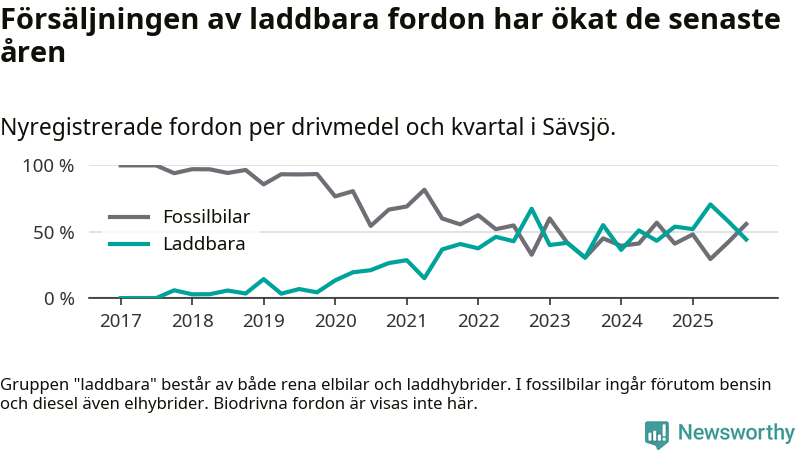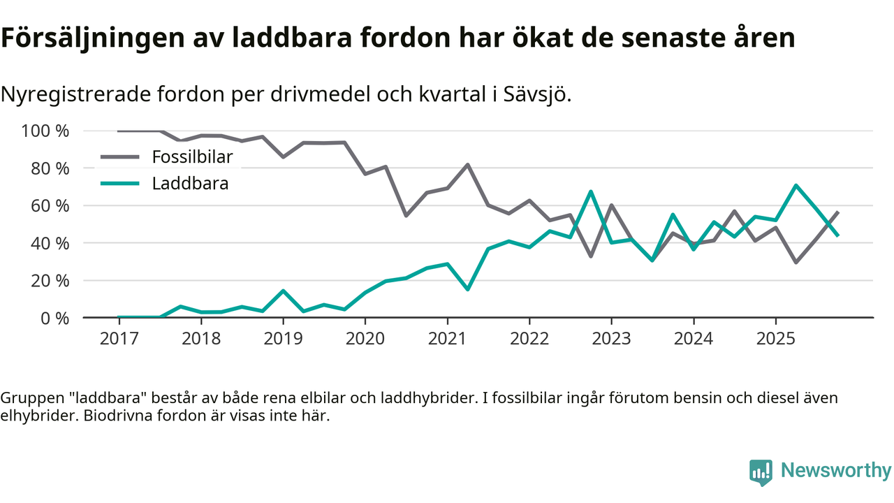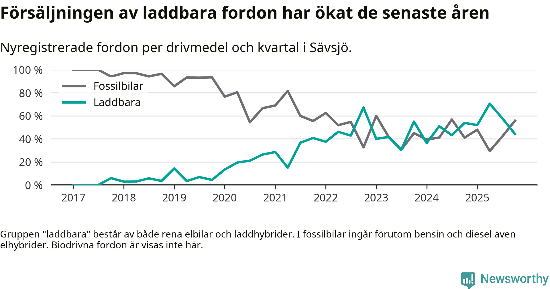 I Sävsjö minskade andelen laddbara bilar under fjärde kvartalet jämfört med kvartalet innan (−13,7 procentenheter). Nyregistreringen peakade under andra kvartalet 2025 då 71 procent av de nya bilarna var laddbara.