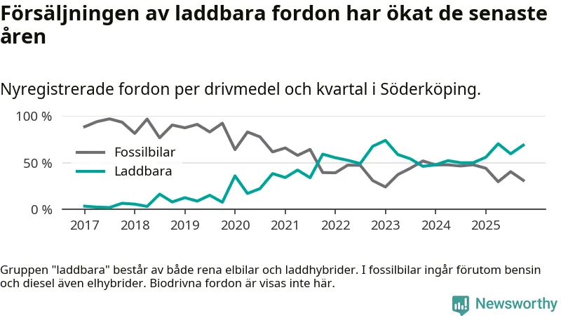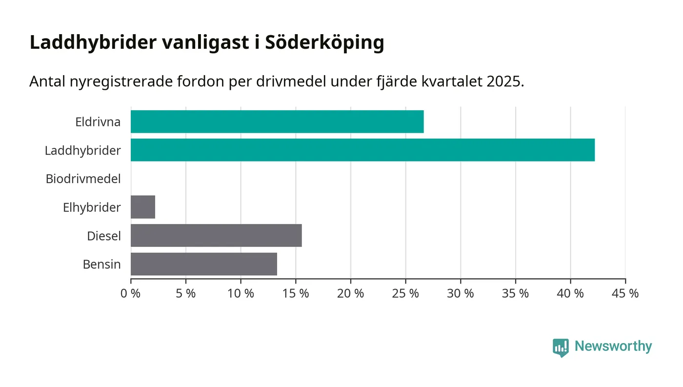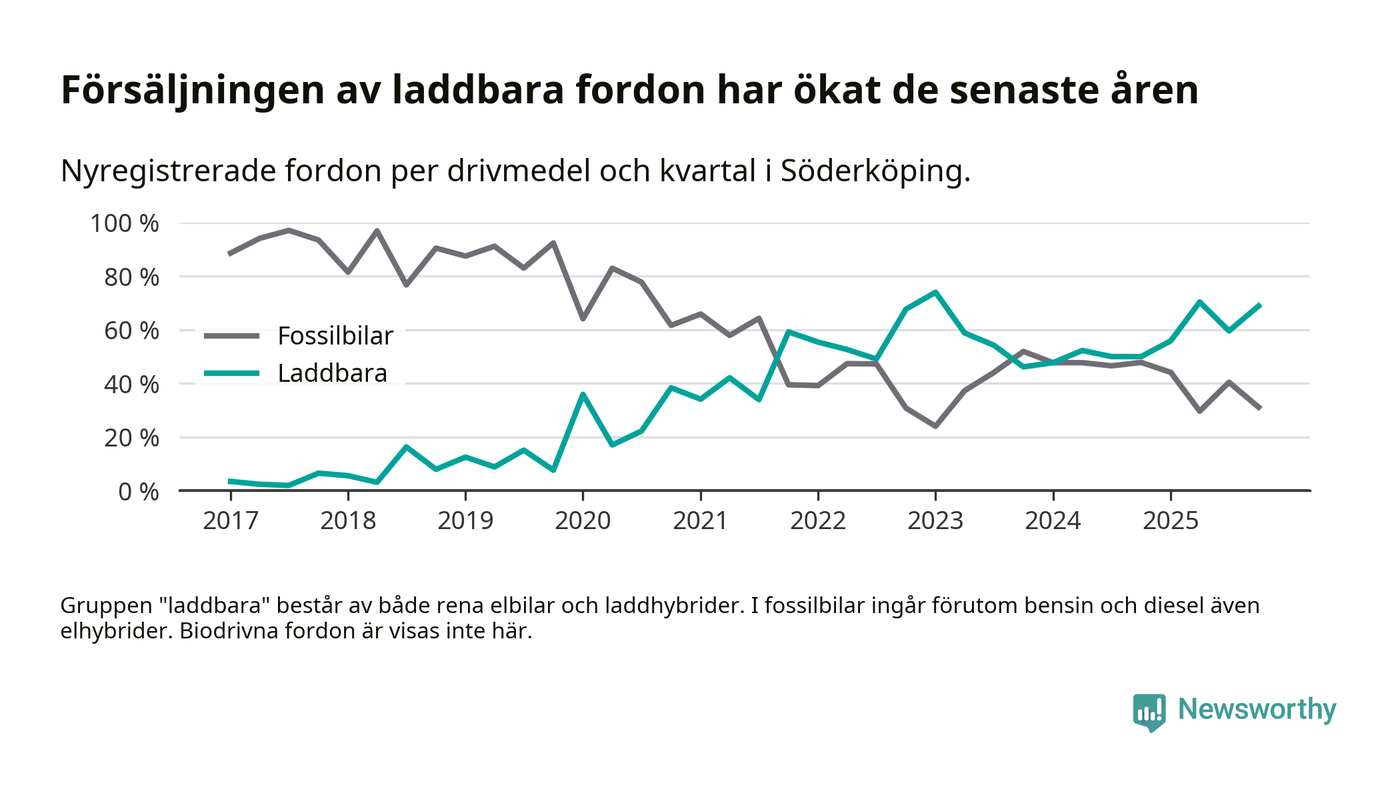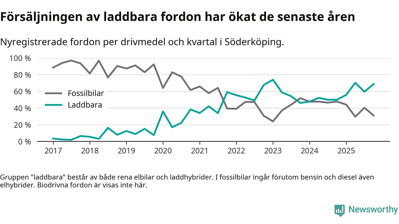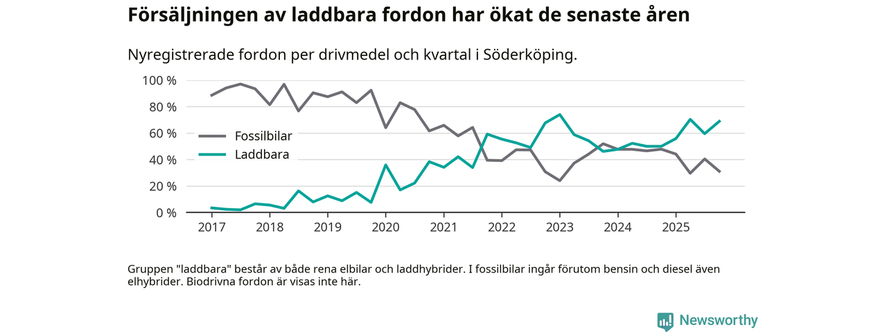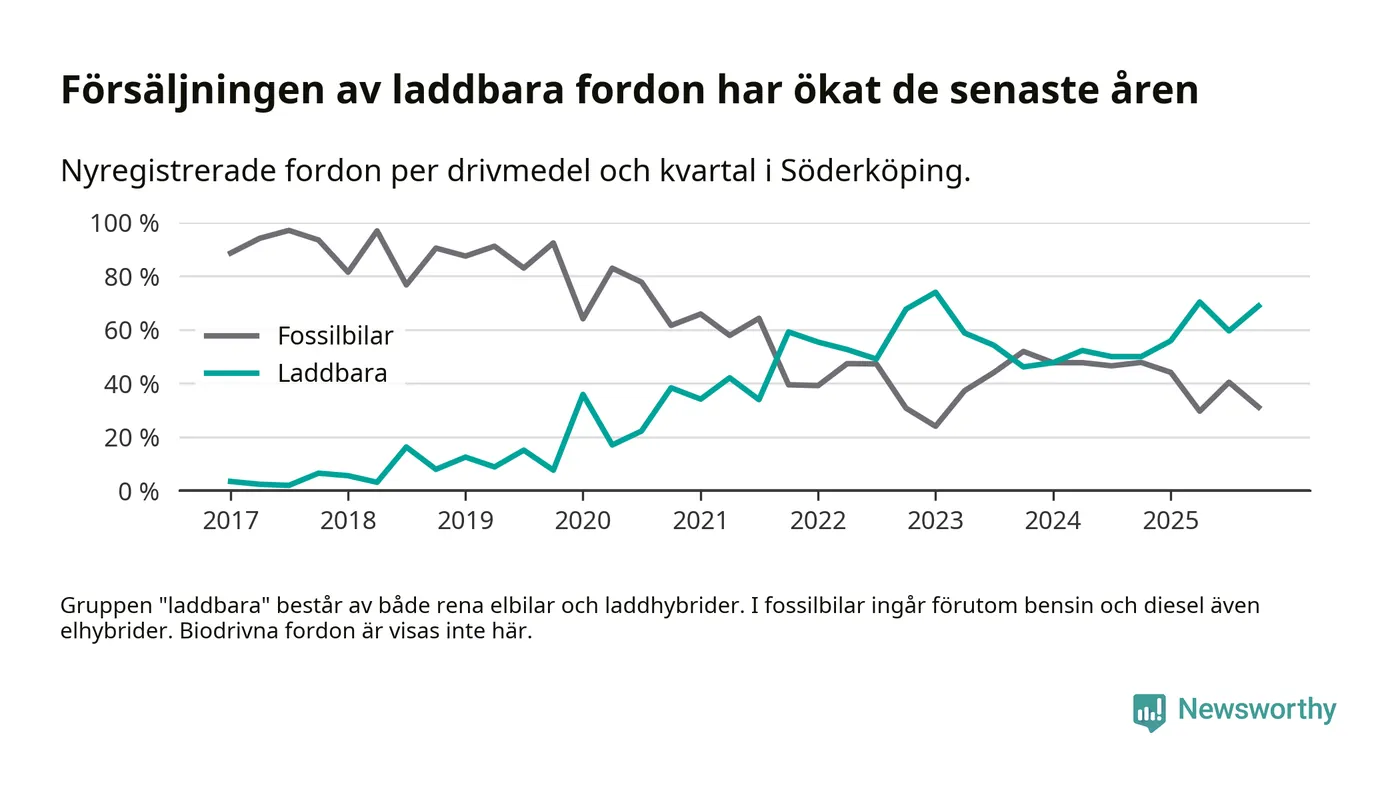 Under fjärde kvartalet 2025 var 69 procent av alla nyregistrerade personbilar i Söderköping laddbara (sammanlagt registrerades 45 nya bilar). Merparten av de laddbara bilarna var så kallade laddhybrider, det vill säga fordon som går att ladda och köra på el, men som även har en förbränningsmotor. 27 procent av alla nya bilar var rena elbilar.