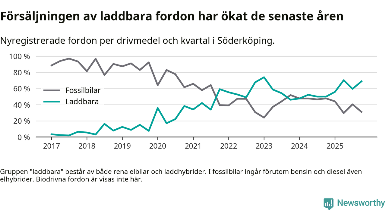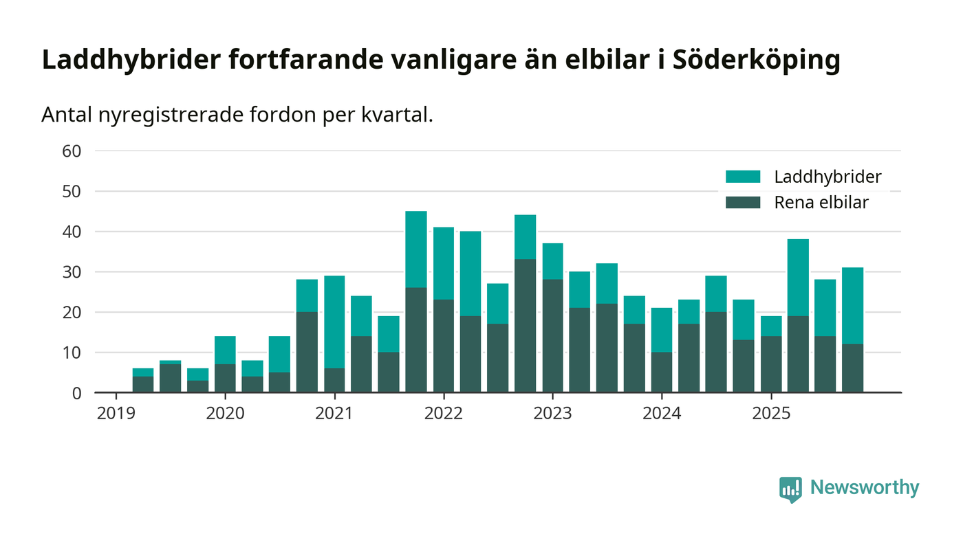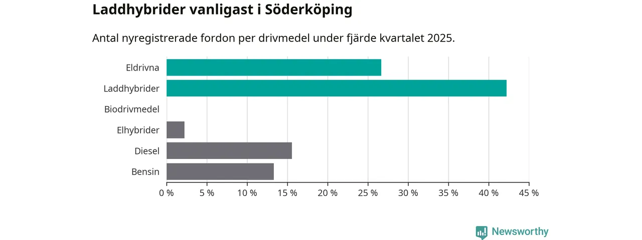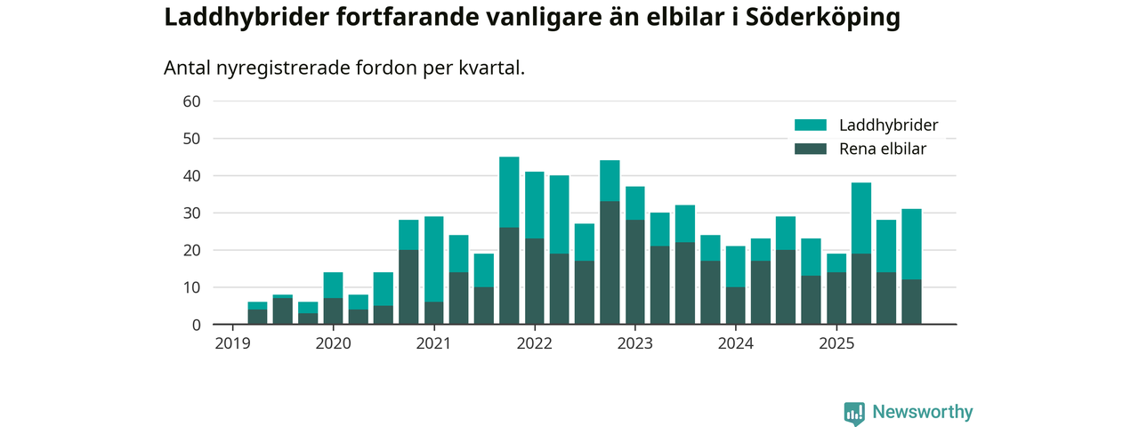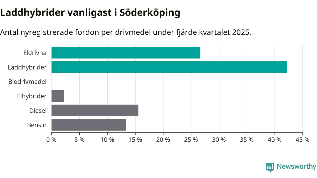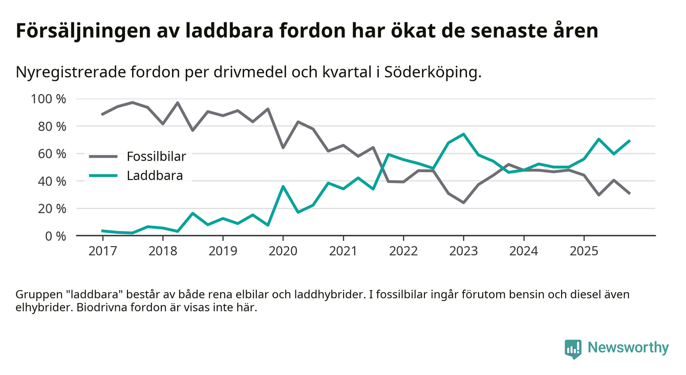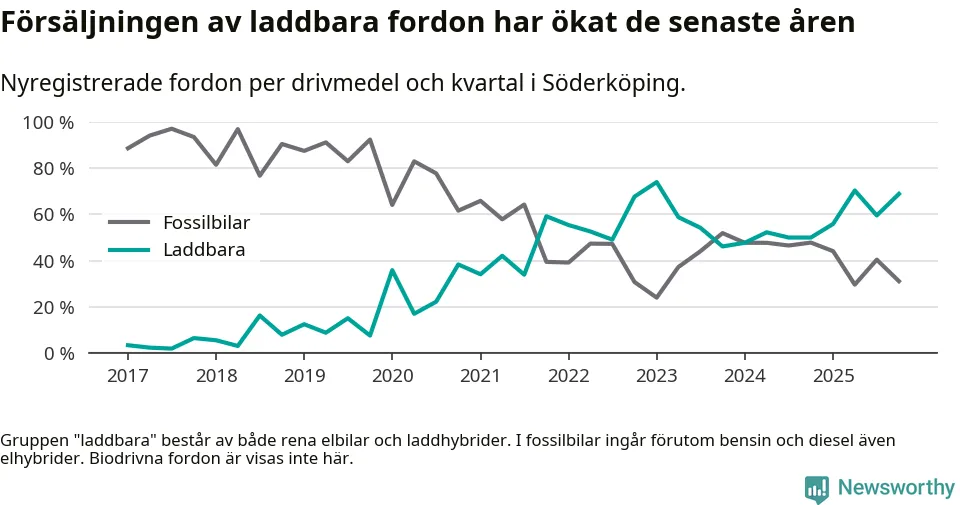 Under fjärde kvartalet 2025 var 69 procent av alla nyregistrerade personbilar i Söderköping laddbara (sammanlagt registrerades 45 nya bilar). Merparten av de laddbara bilarna var så kallade laddhybrider, det vill säga fordon som går att ladda och köra på el, men som även har en förbränningsmotor. 27 procent av alla nya bilar var rena elbilar.