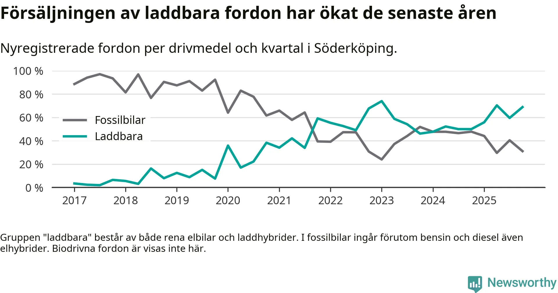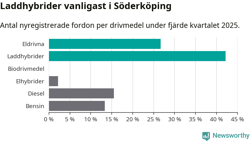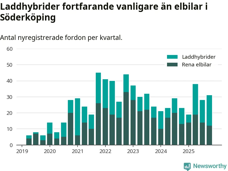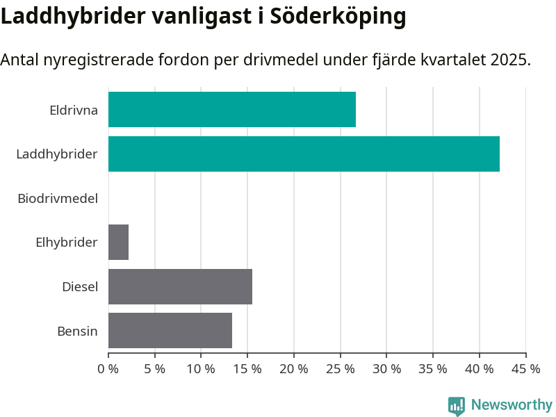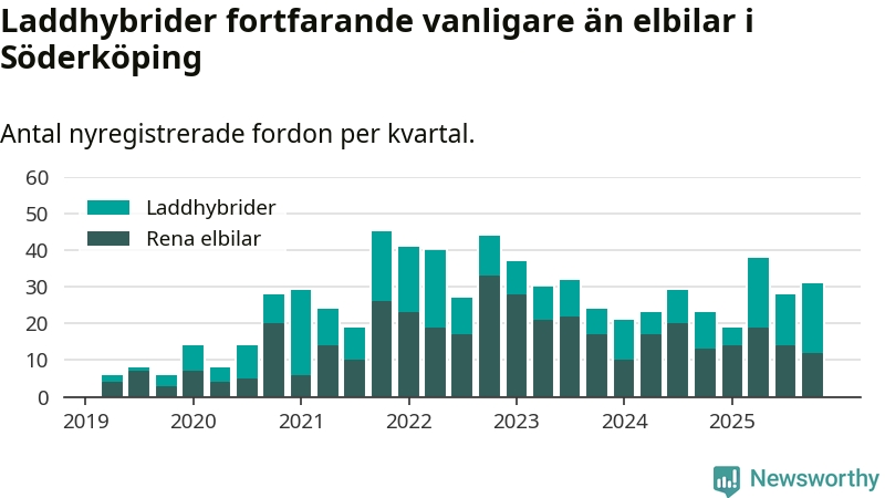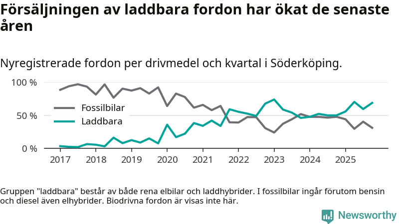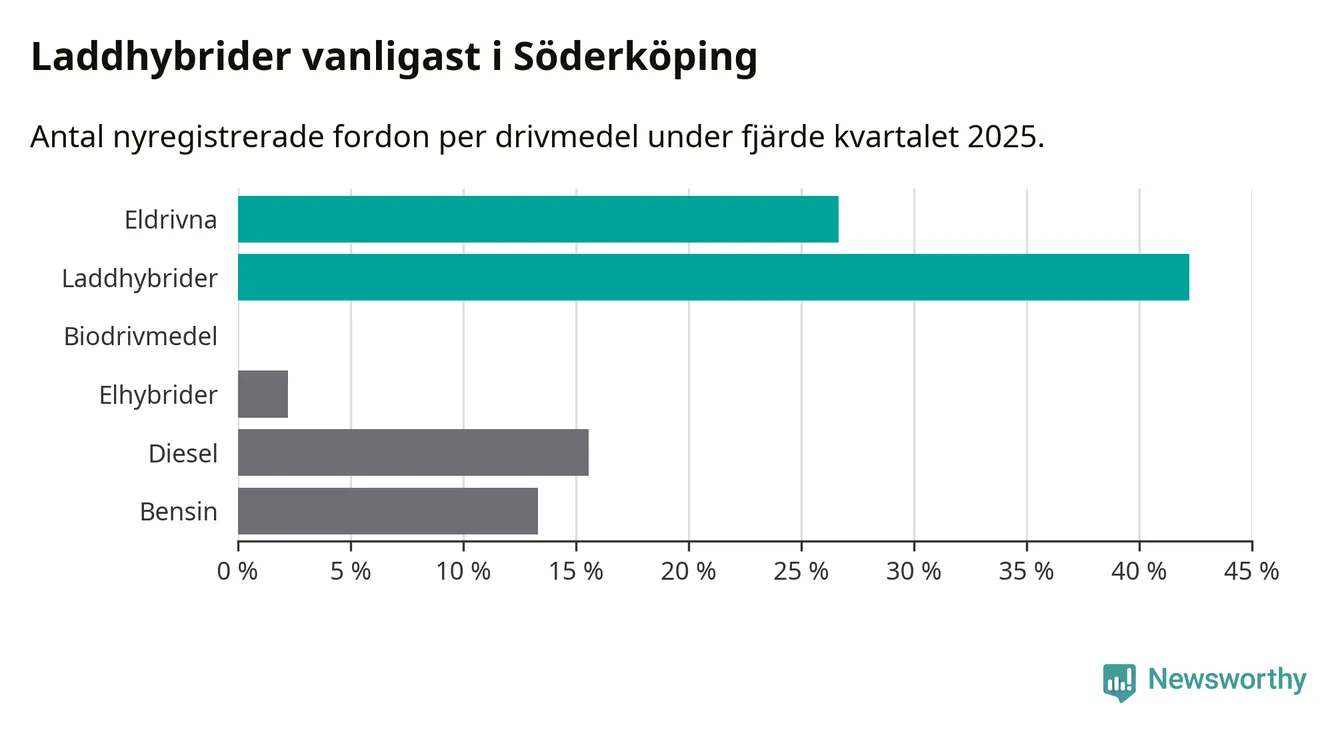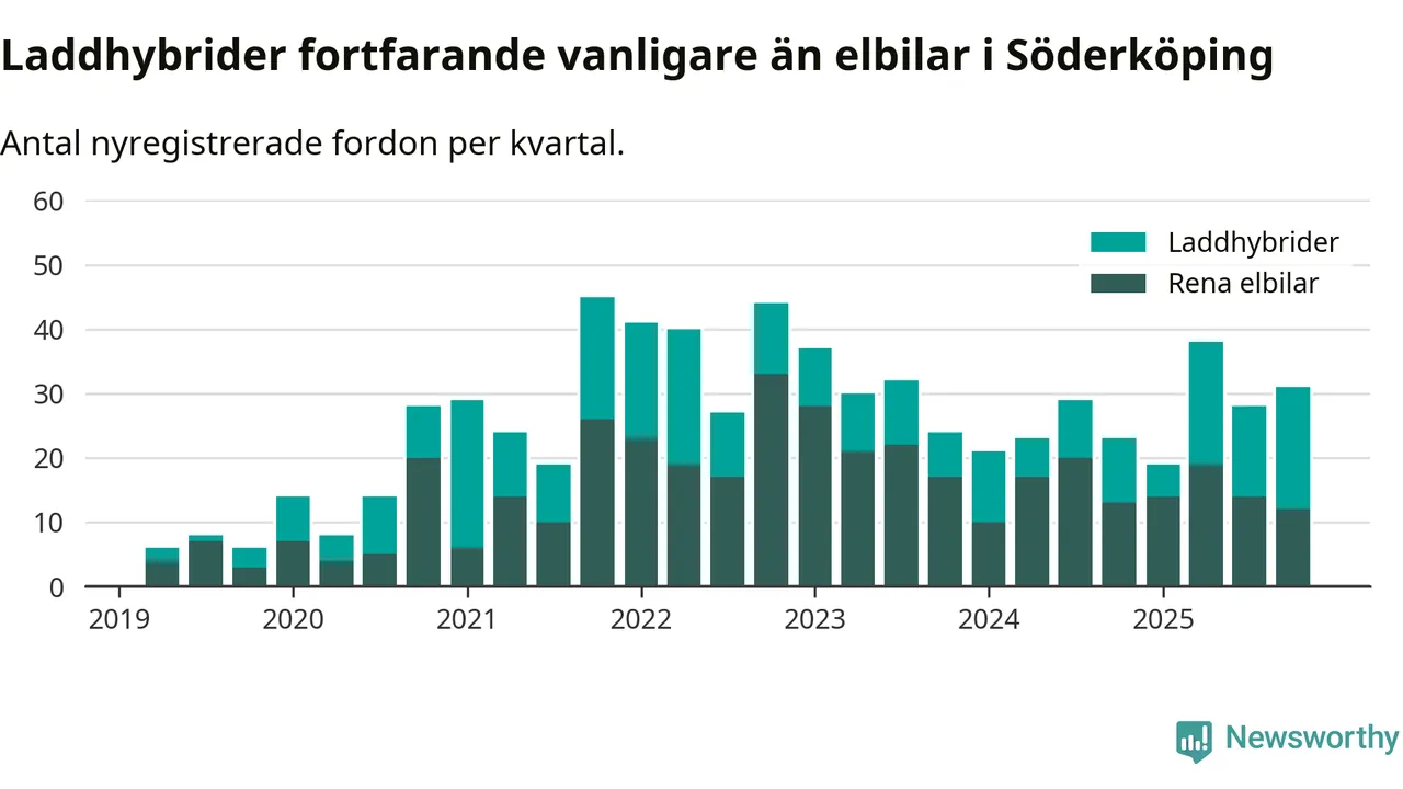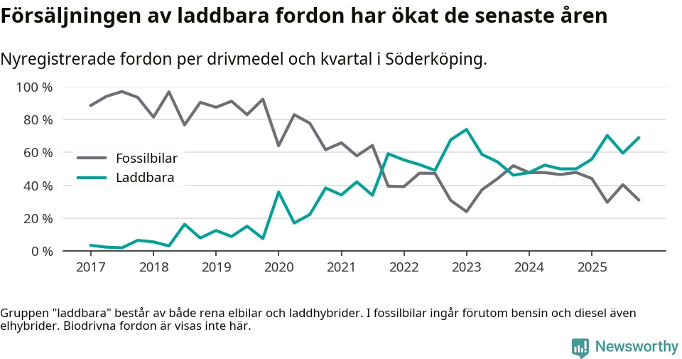 Under fjärde kvartalet 2025 var 69 procent av alla nyregistrerade personbilar i Söderköping laddbara (sammanlagt registrerades 45 nya bilar). Merparten av de laddbara bilarna var så kallade laddhybrider, det vill säga fordon som går att ladda och köra på el, men som även har en förbränningsmotor. 27 procent av alla nya bilar var rena elbilar.