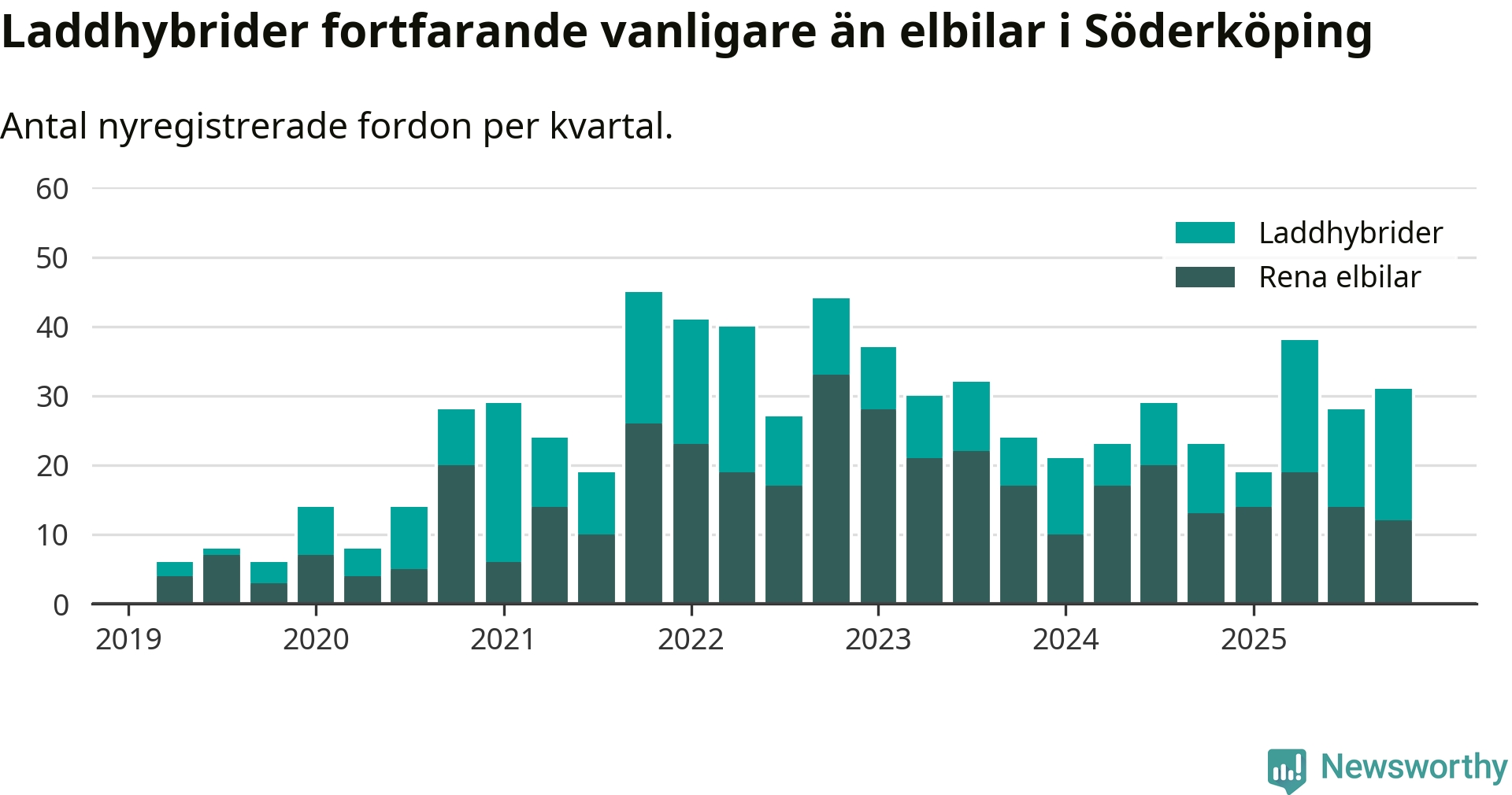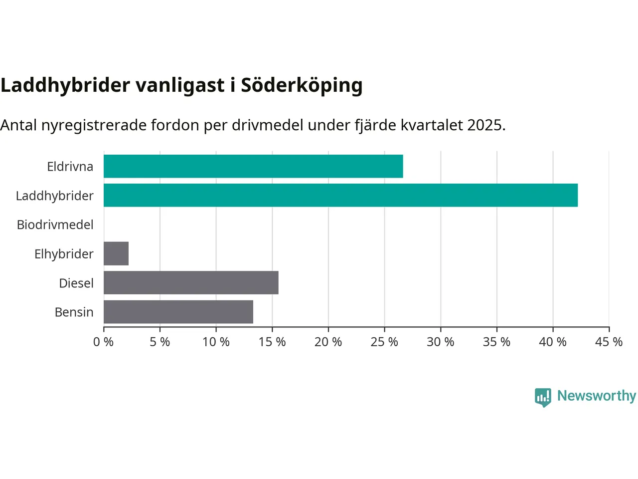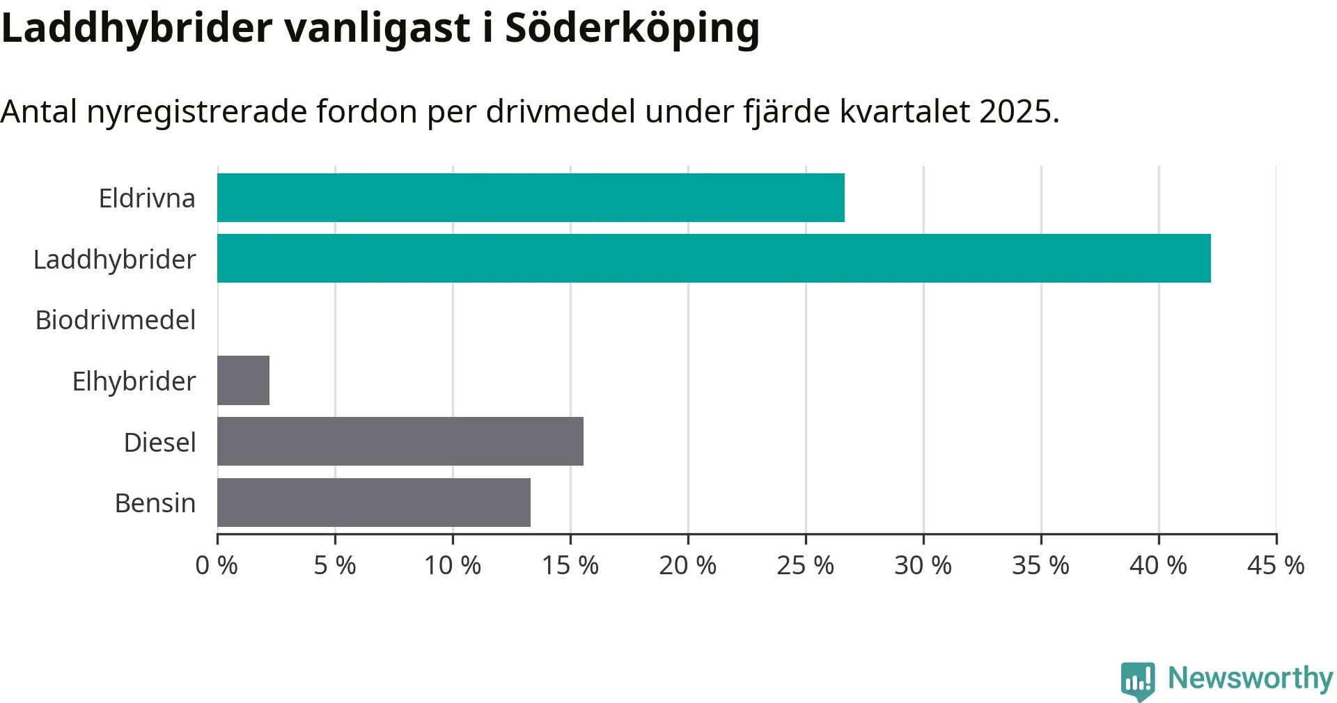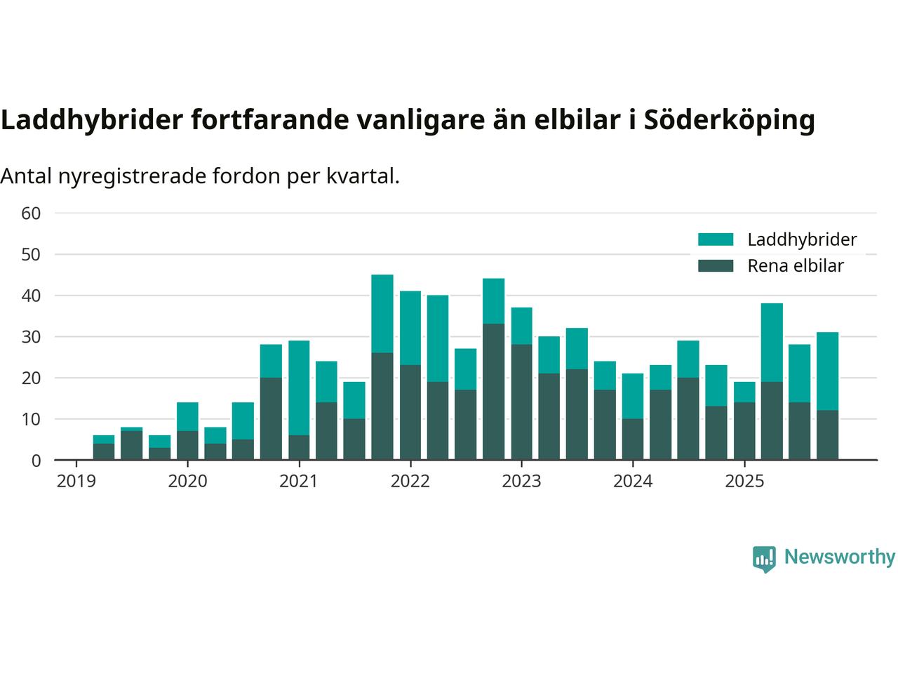 Under fjärde kvartalet 2025 var 69 procent av alla nyregistrerade personbilar i Söderköping laddbara (sammanlagt registrerades 45 nya bilar). Merparten av de laddbara bilarna var så kallade laddhybrider, det vill säga fordon som går att ladda och köra på el, men som även har en förbränningsmotor. 27 procent av alla nya bilar var rena elbilar.