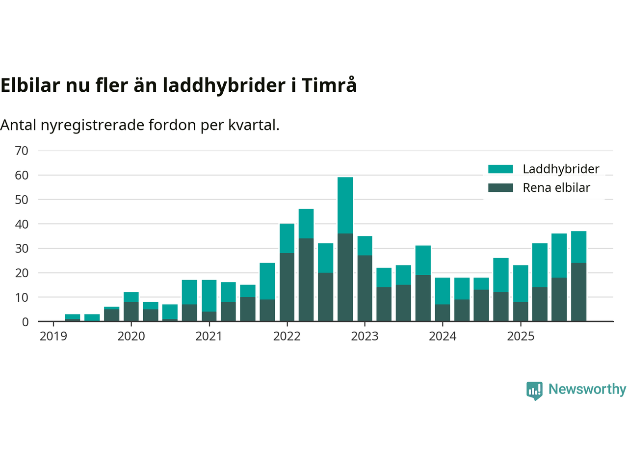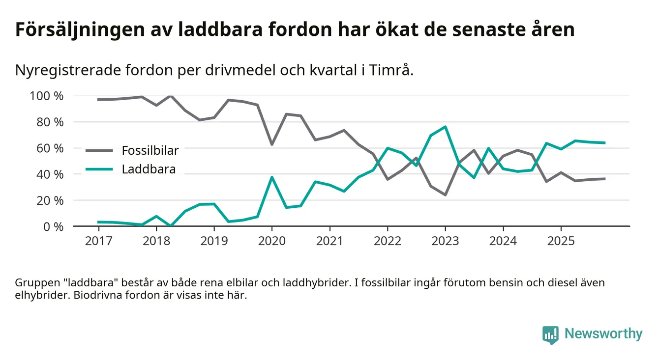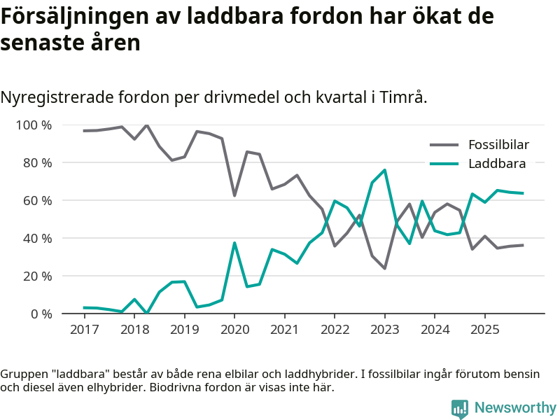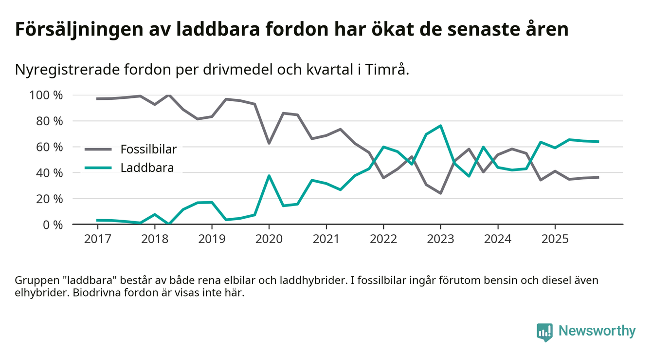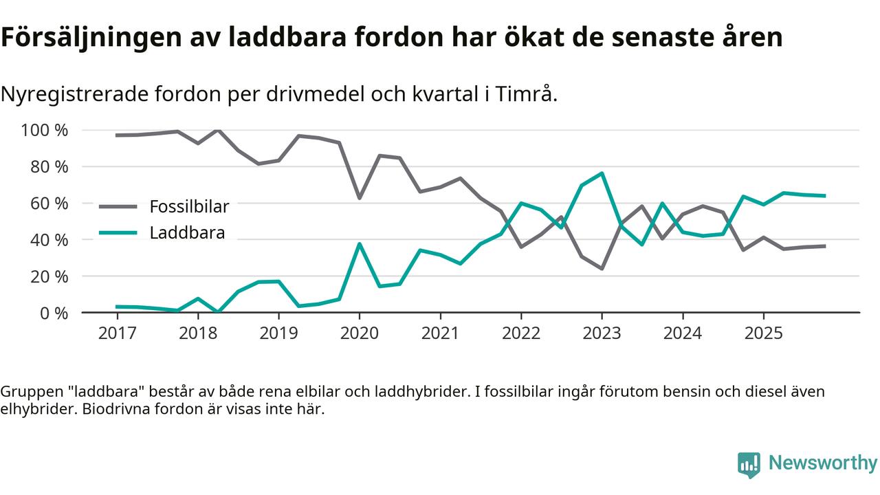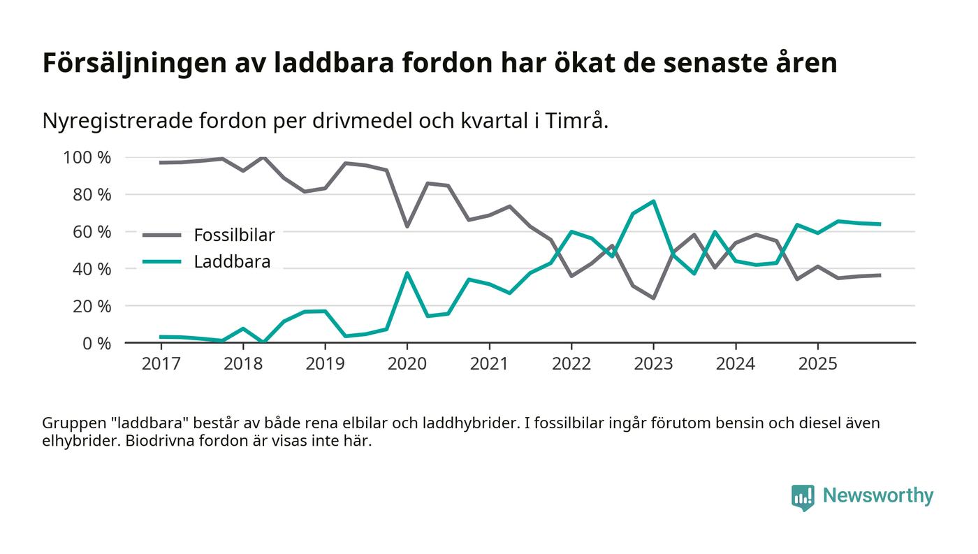 Under fjärde kvartalet 2025 var 64 procent av alla nyregistrerade personbilar i Timrå laddbara (sammanlagt registrerades 58 nya bilar). Merparten av de laddbara bilarna var rena elbilar (41 procent av alla).