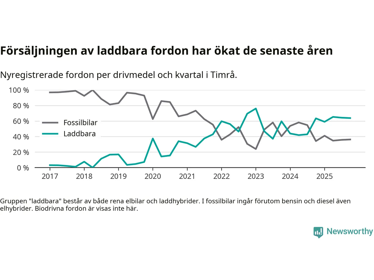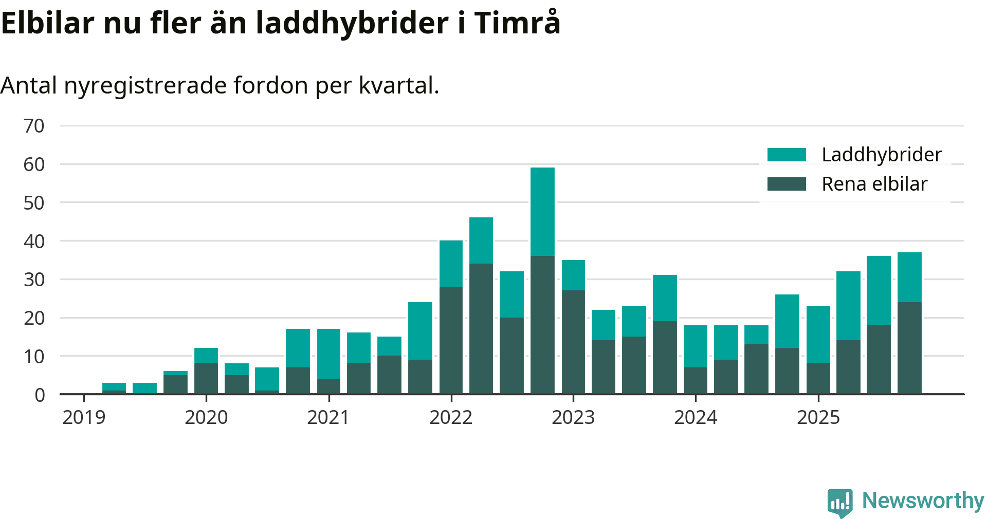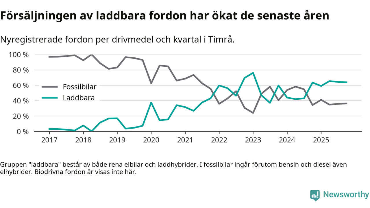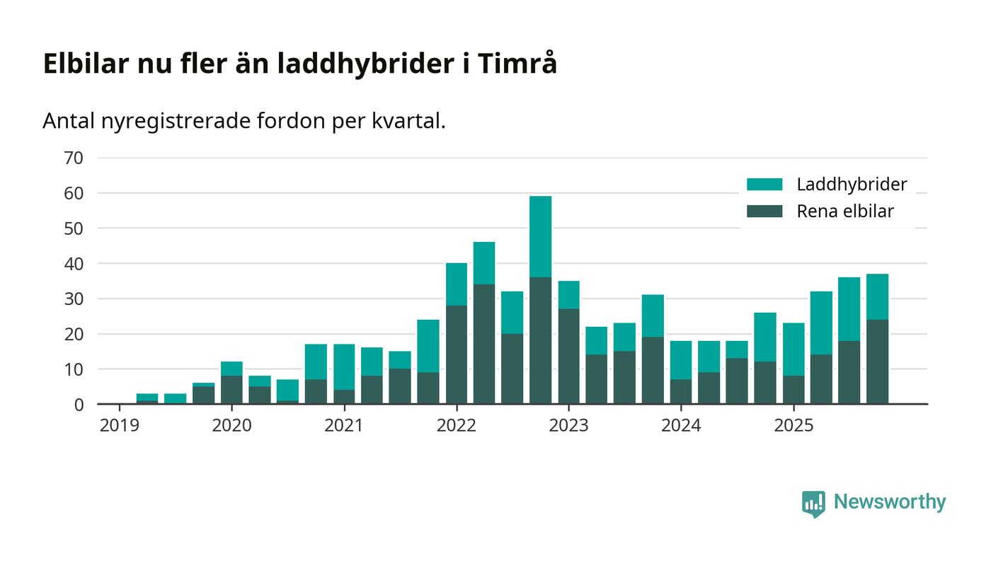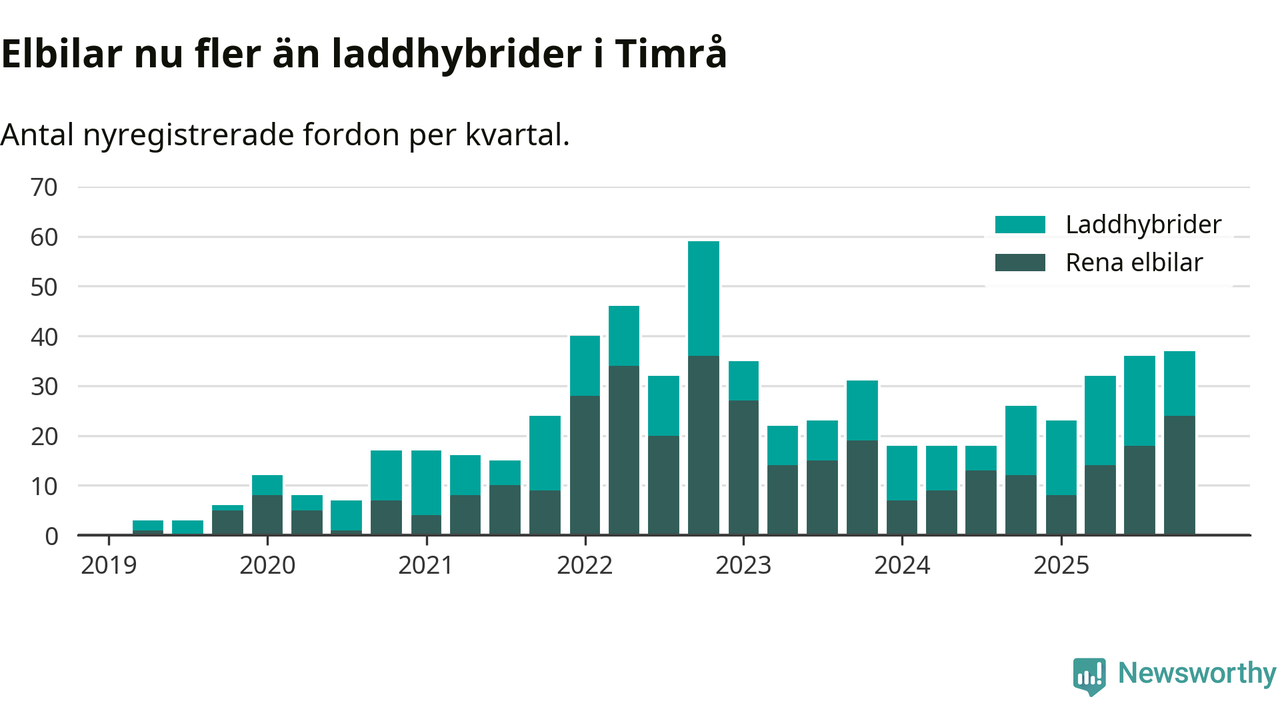 Under fjärde kvartalet 2025 var 64 procent av alla nyregistrerade personbilar i Timrå laddbara (sammanlagt registrerades 58 nya bilar). Merparten av de laddbara bilarna var rena elbilar (41 procent av alla).