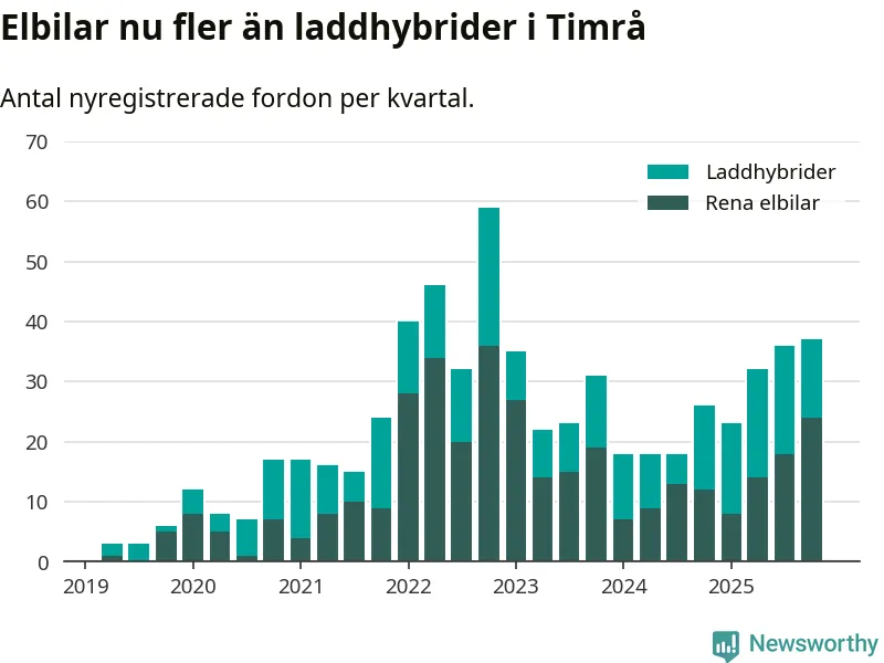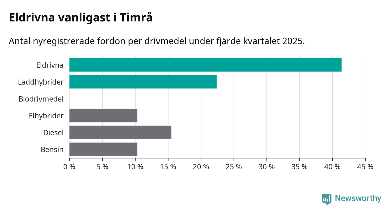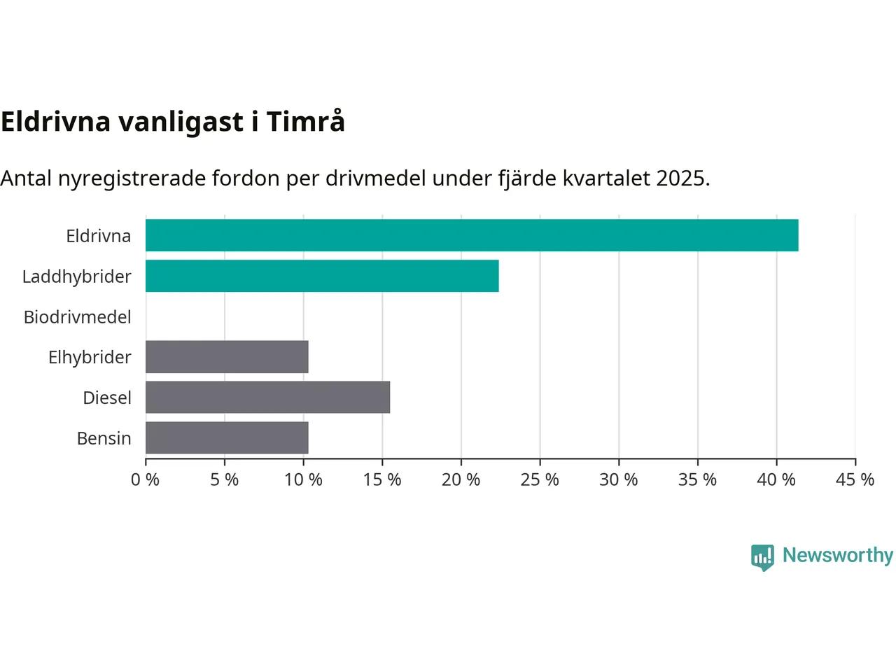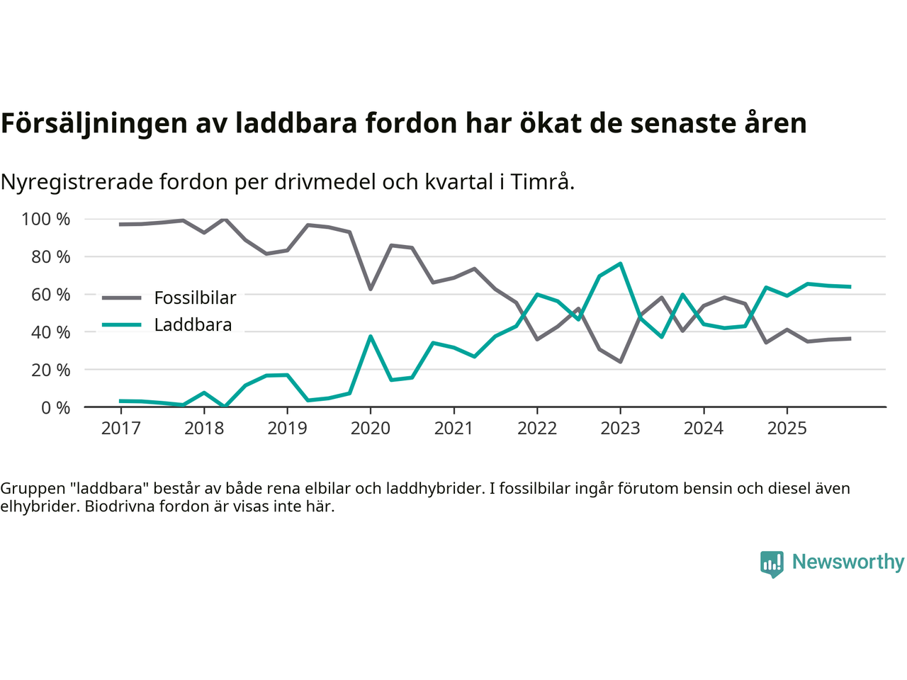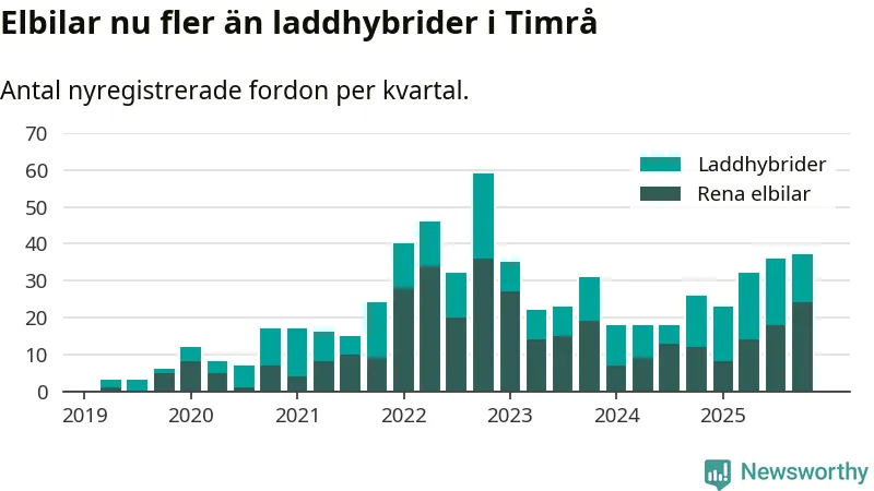 Under fjärde kvartalet 2025 var 64 procent av alla nyregistrerade personbilar i Timrå laddbara (sammanlagt registrerades 58 nya bilar). Merparten av de laddbara bilarna var rena elbilar (41 procent av alla).
