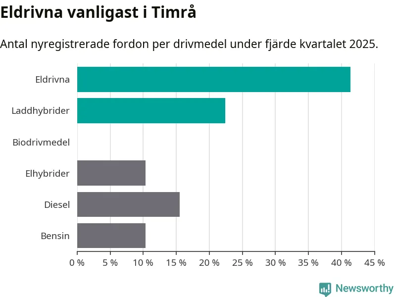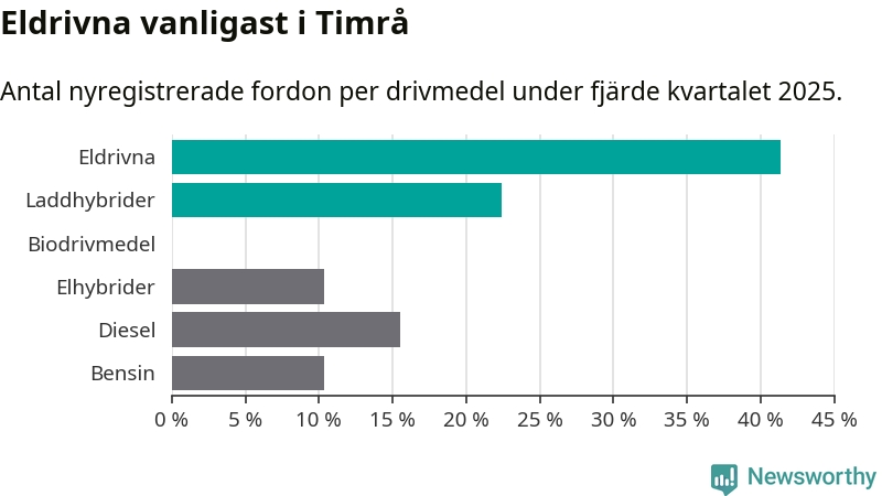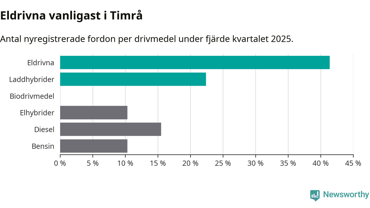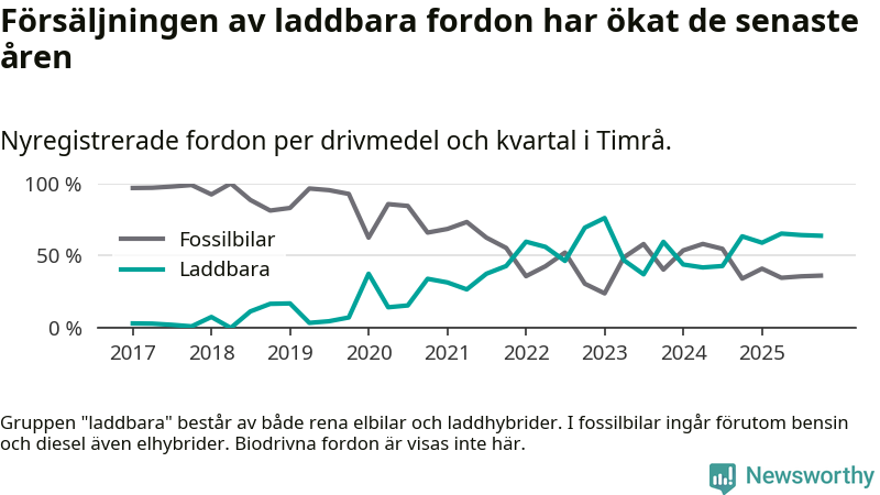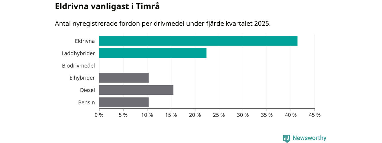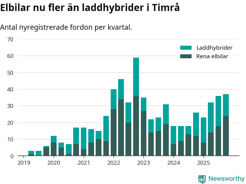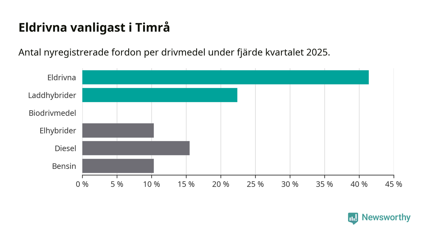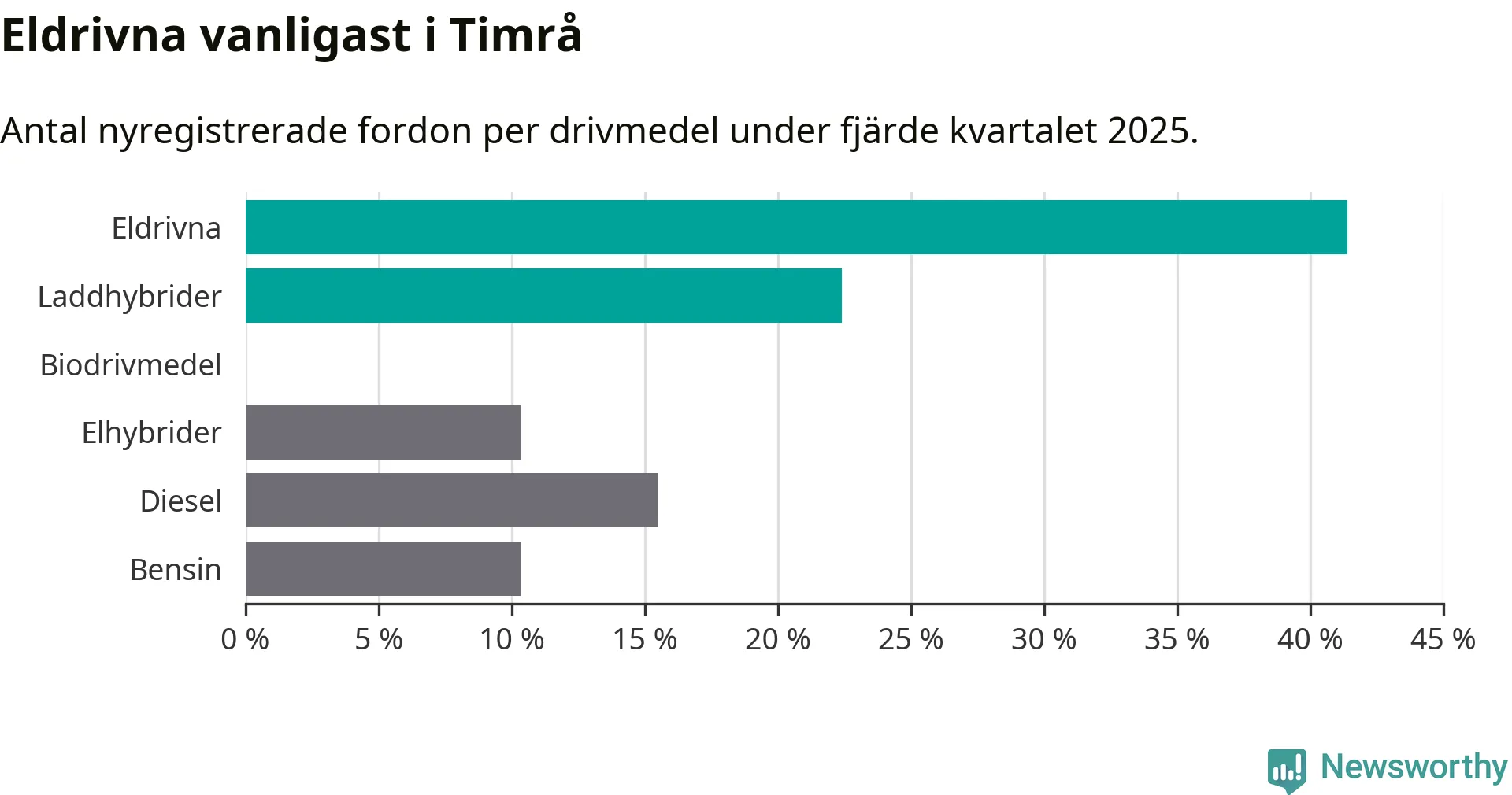 Under fjärde kvartalet 2025 var 64 procent av alla nyregistrerade personbilar i Timrå laddbara (sammanlagt registrerades 58 nya bilar). Merparten av de laddbara bilarna var rena elbilar (41 procent av alla).