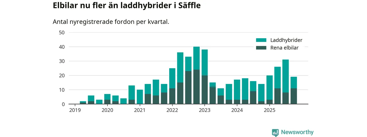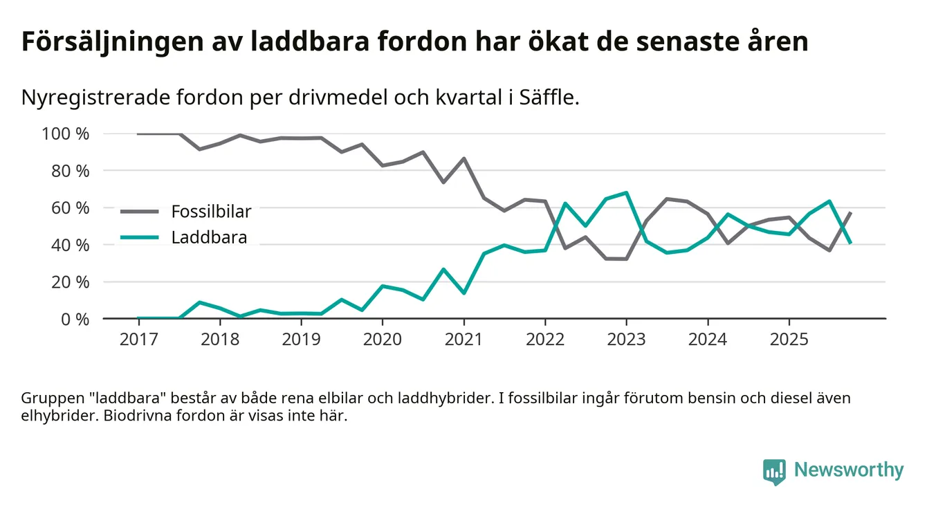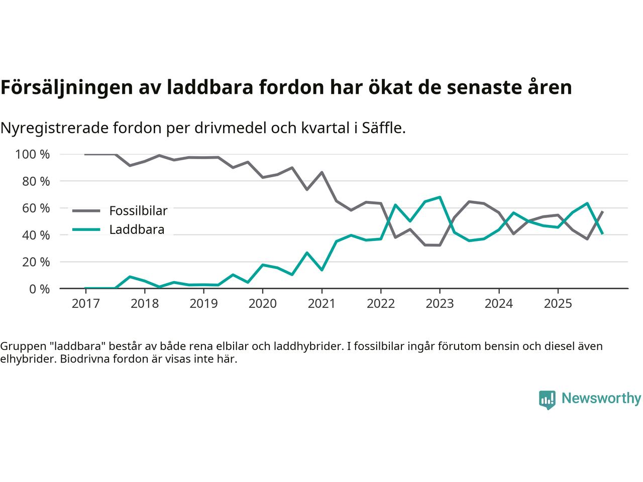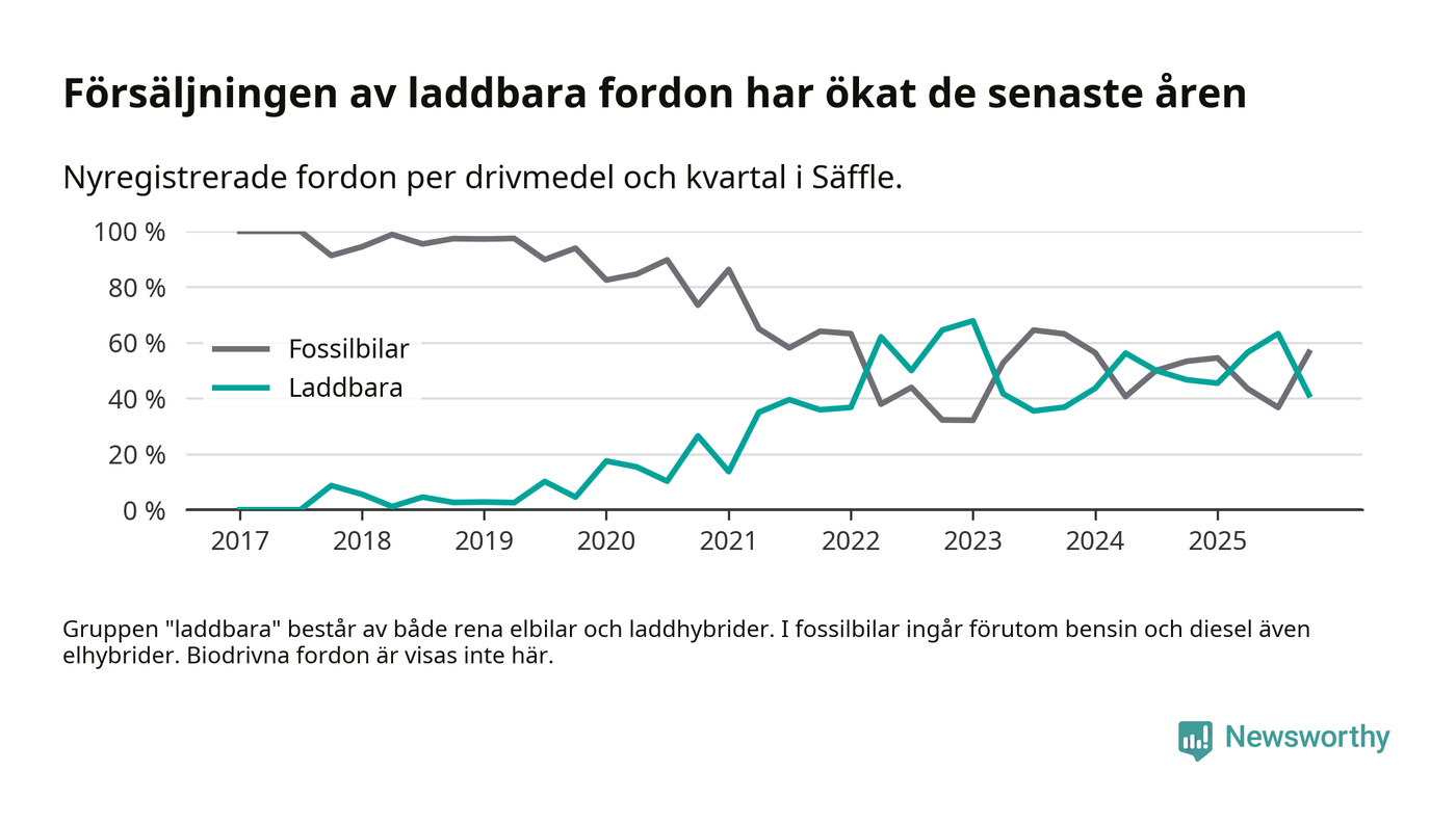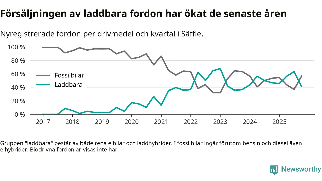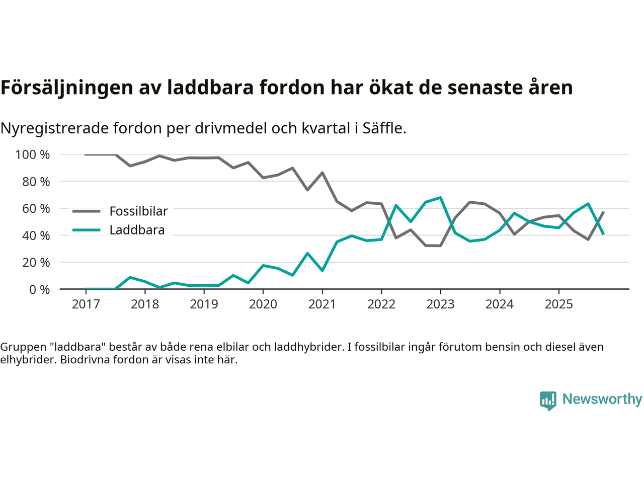 Under fjärde kvartalet 2025 var 41 procent av alla nyregistrerade personbilar i Säffle laddbara (sammanlagt registrerades 46 nya bilar). Merparten av de laddbara bilarna var rena elbilar (24 procent av alla).