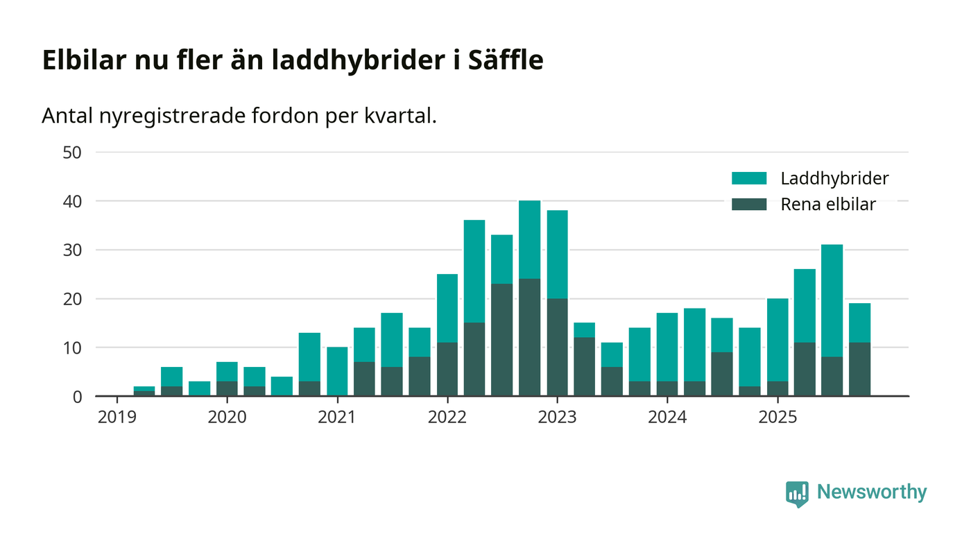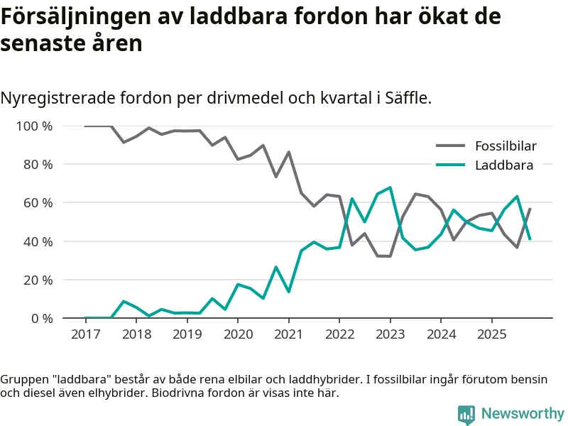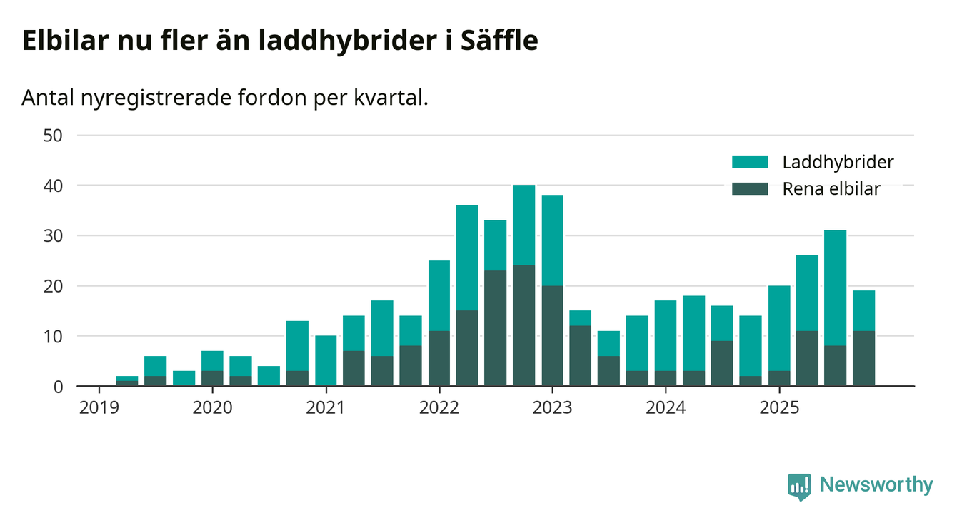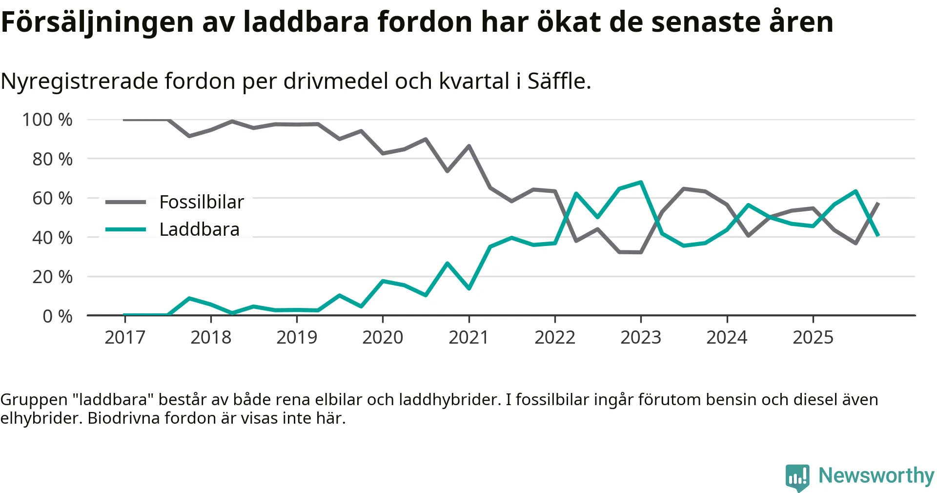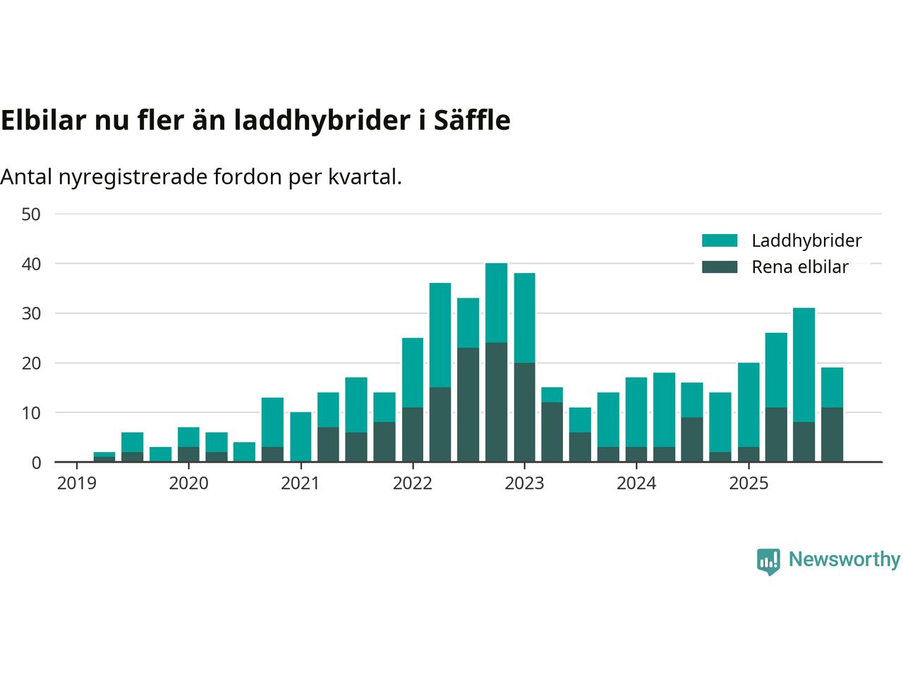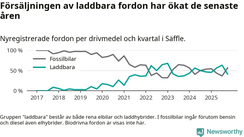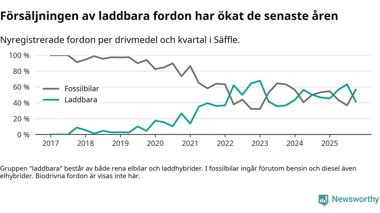 Under fjärde kvartalet 2025 var 41 procent av alla nyregistrerade personbilar i Säffle laddbara (sammanlagt registrerades 46 nya bilar). Merparten av de laddbara bilarna var rena elbilar (24 procent av alla).