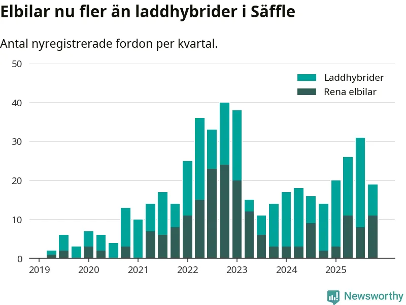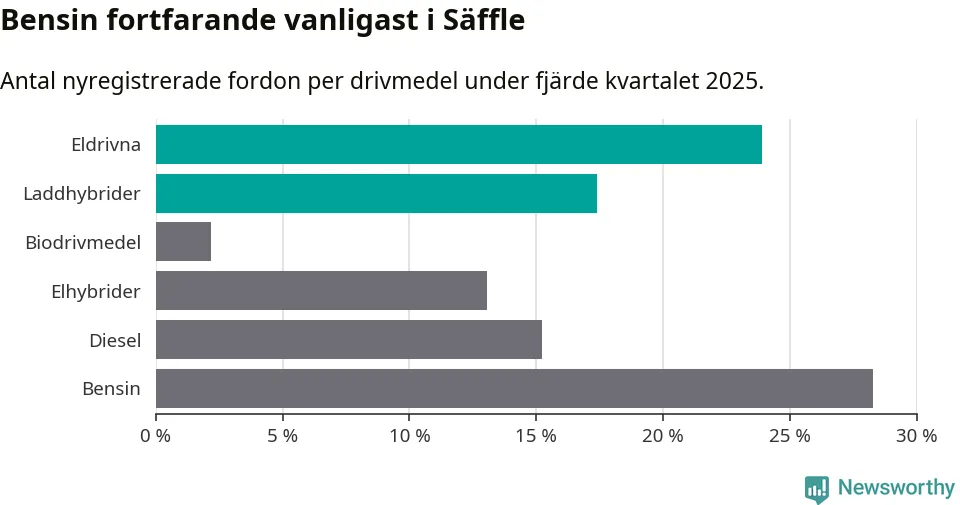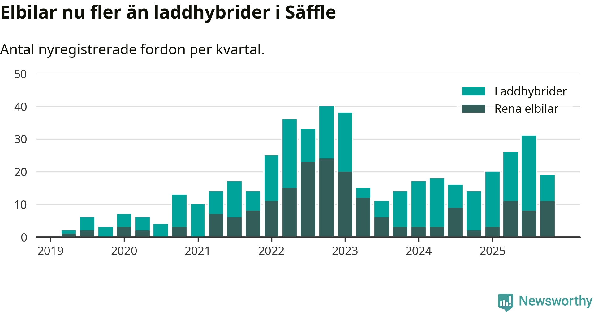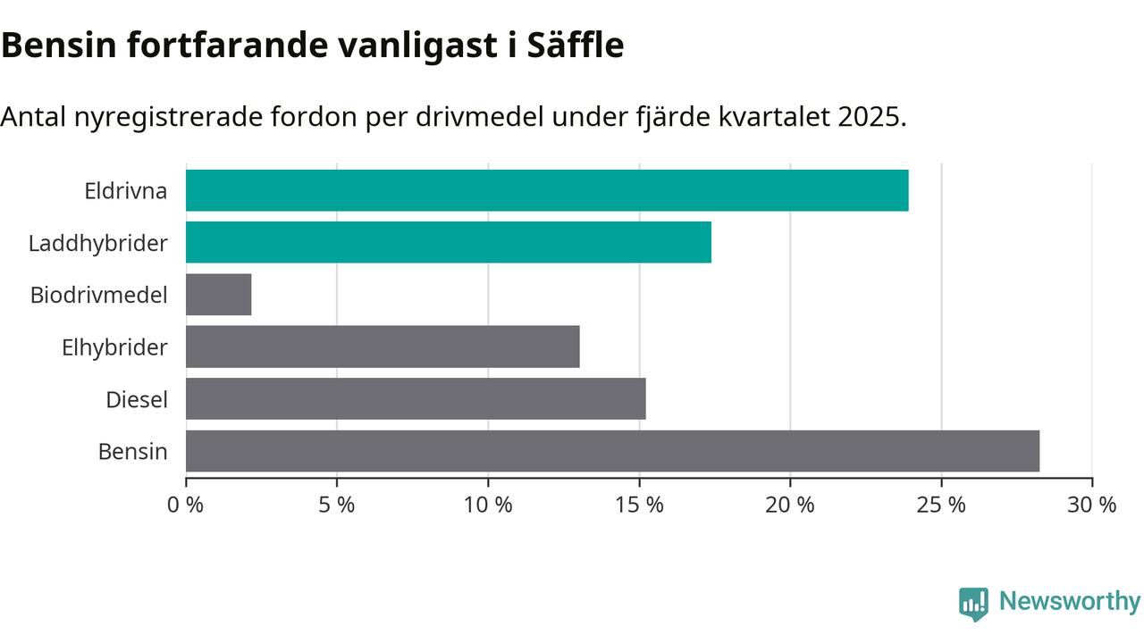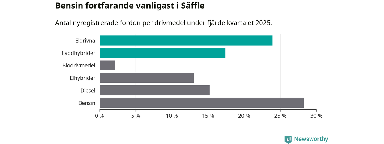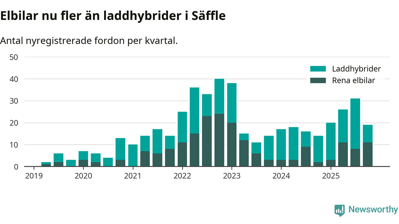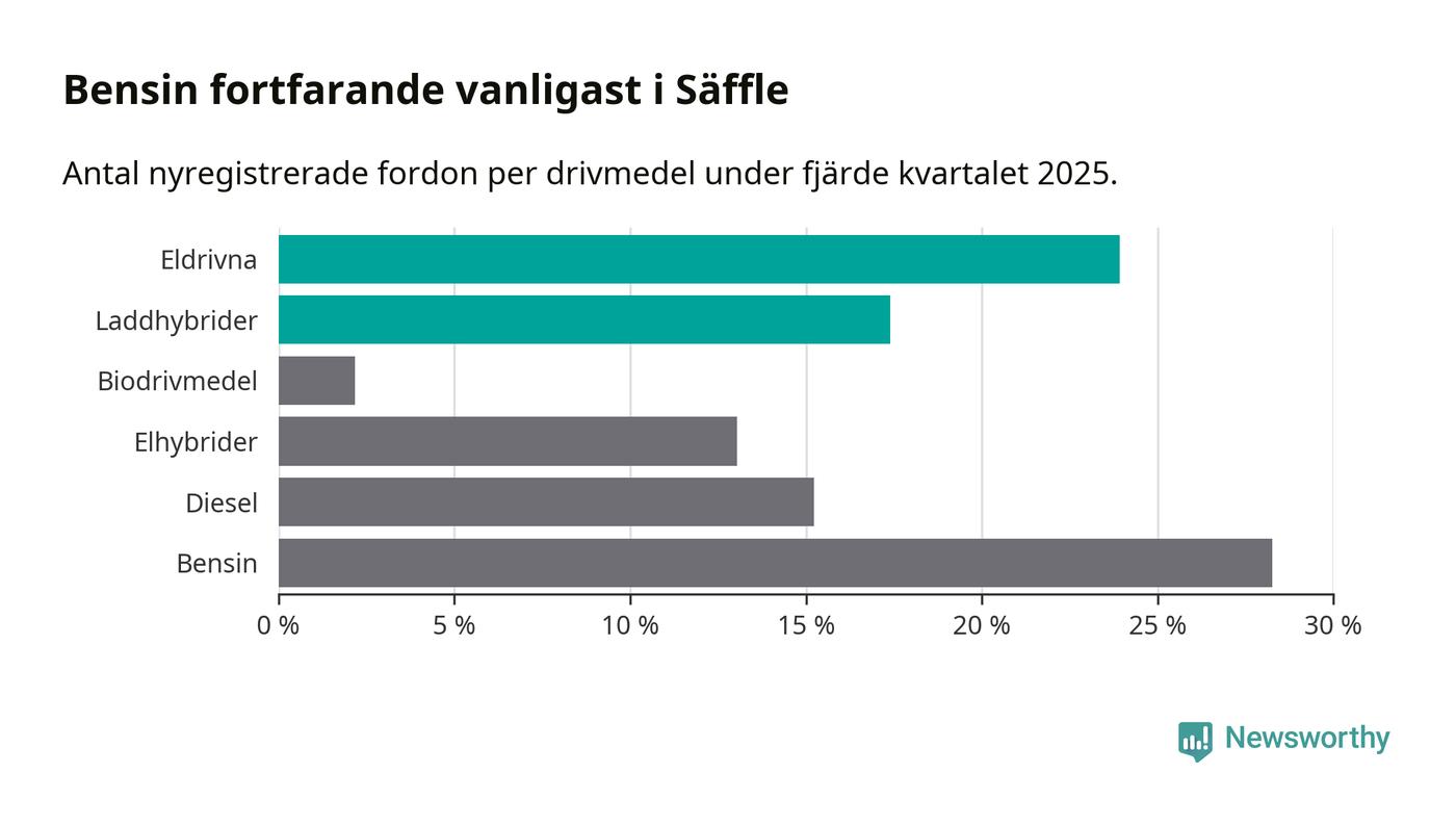 Under fjärde kvartalet 2025 var 41 procent av alla nyregistrerade personbilar i Säffle laddbara (sammanlagt registrerades 46 nya bilar). Merparten av de laddbara bilarna var rena elbilar (24 procent av alla).