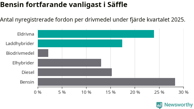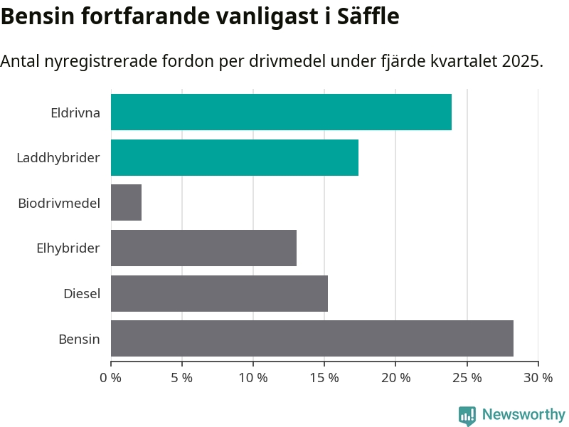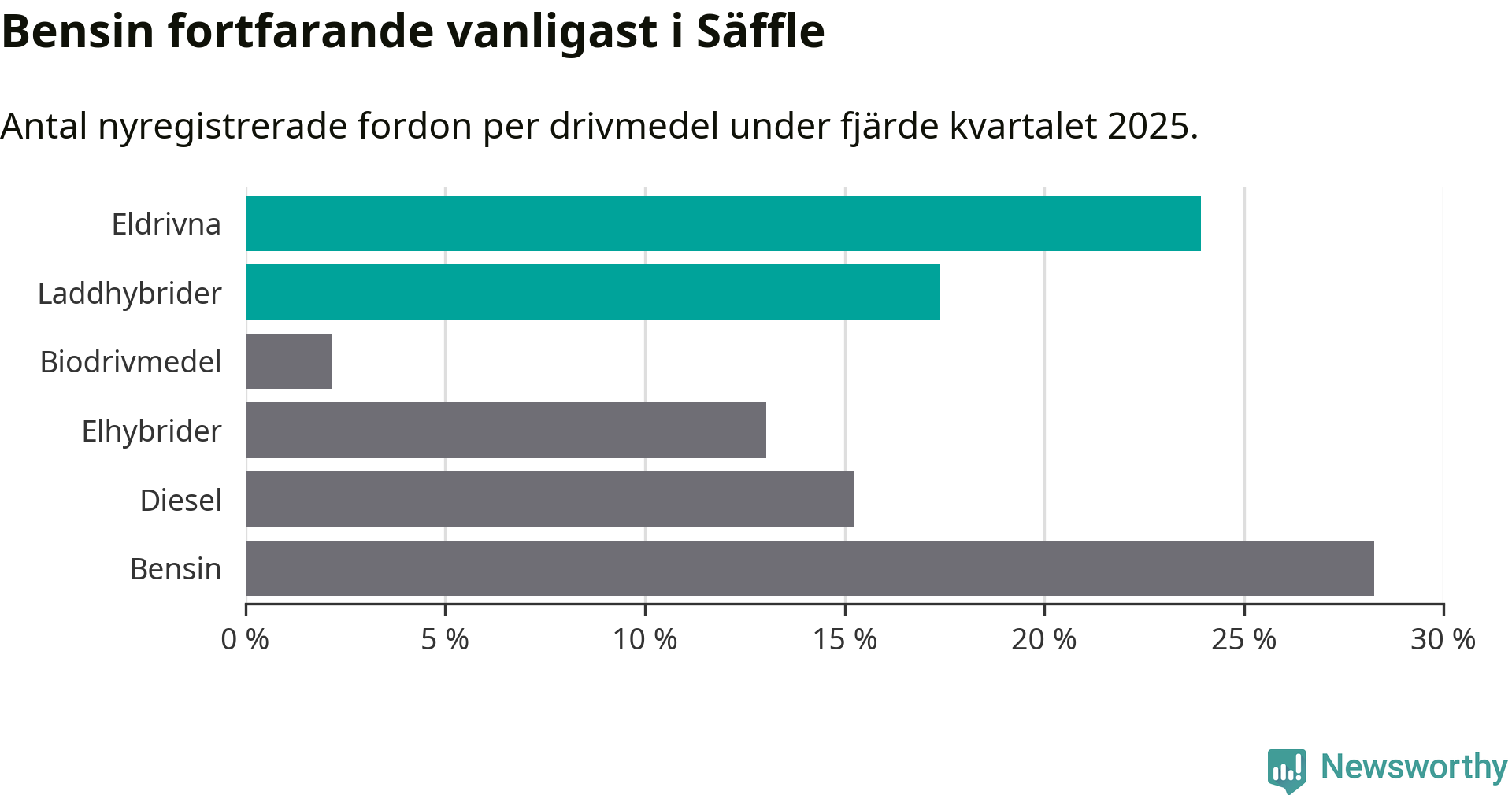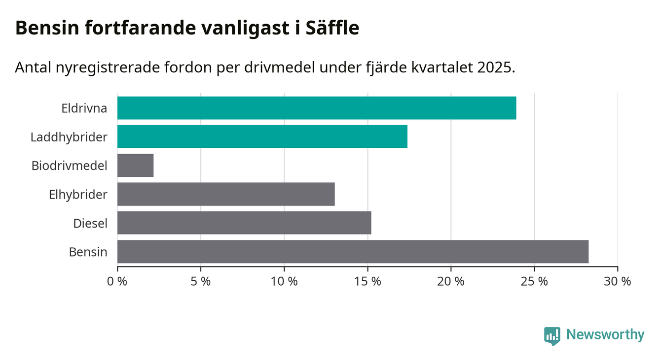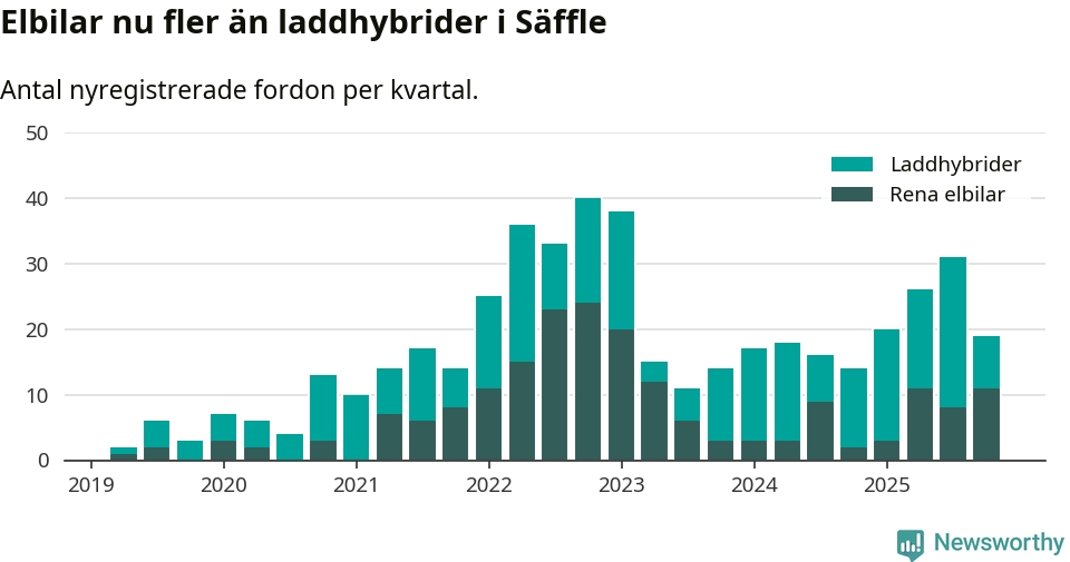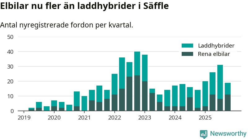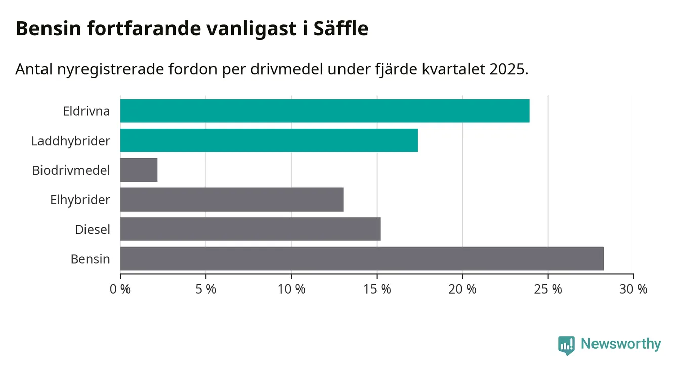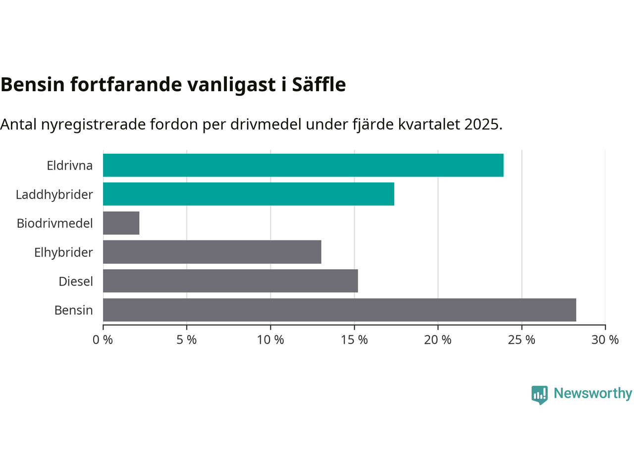 Under fjärde kvartalet 2025 var 41 procent av alla nyregistrerade personbilar i Säffle laddbara (sammanlagt registrerades 46 nya bilar). Merparten av de laddbara bilarna var rena elbilar (24 procent av alla).