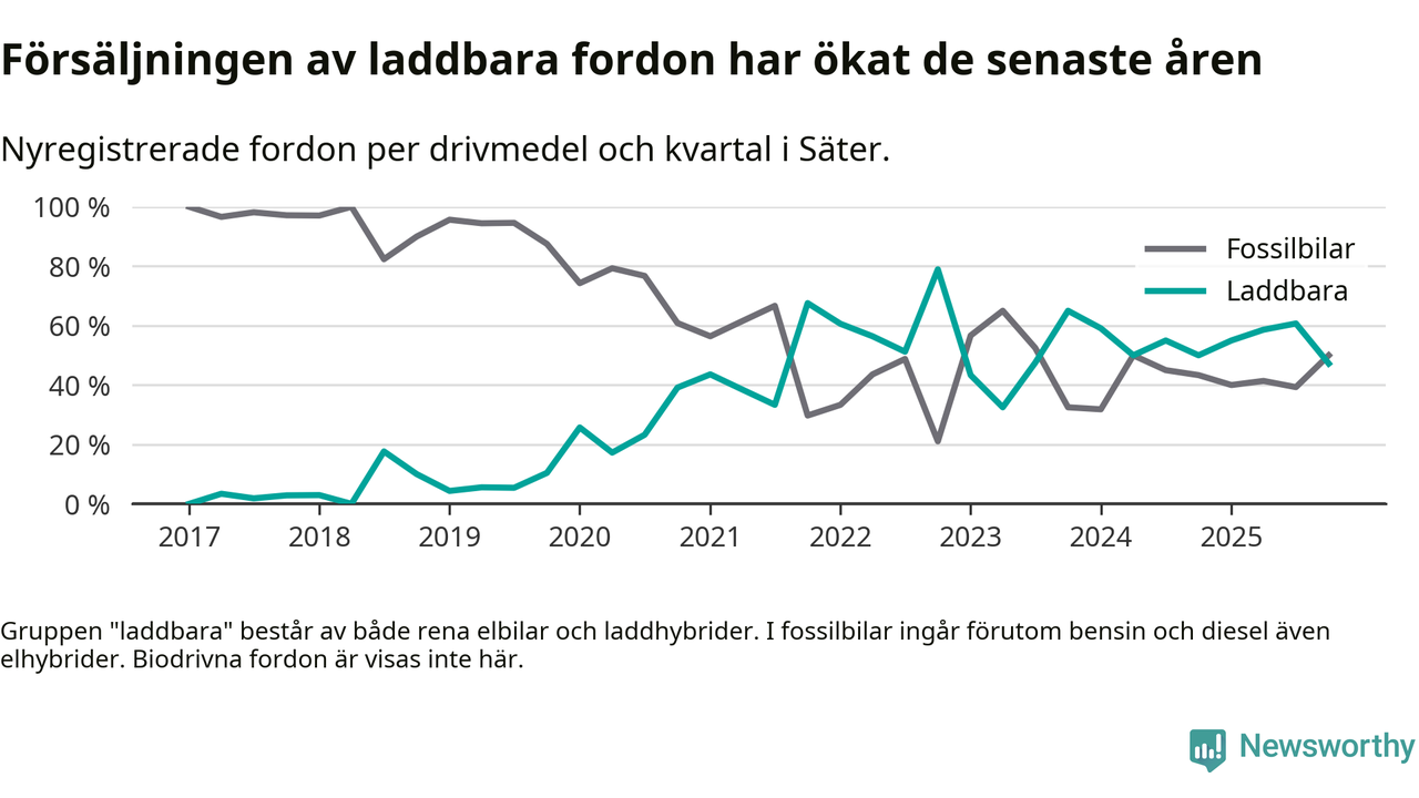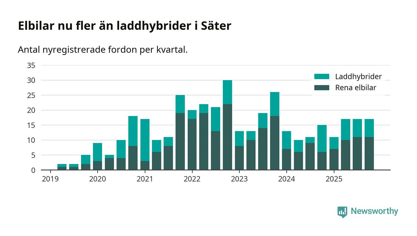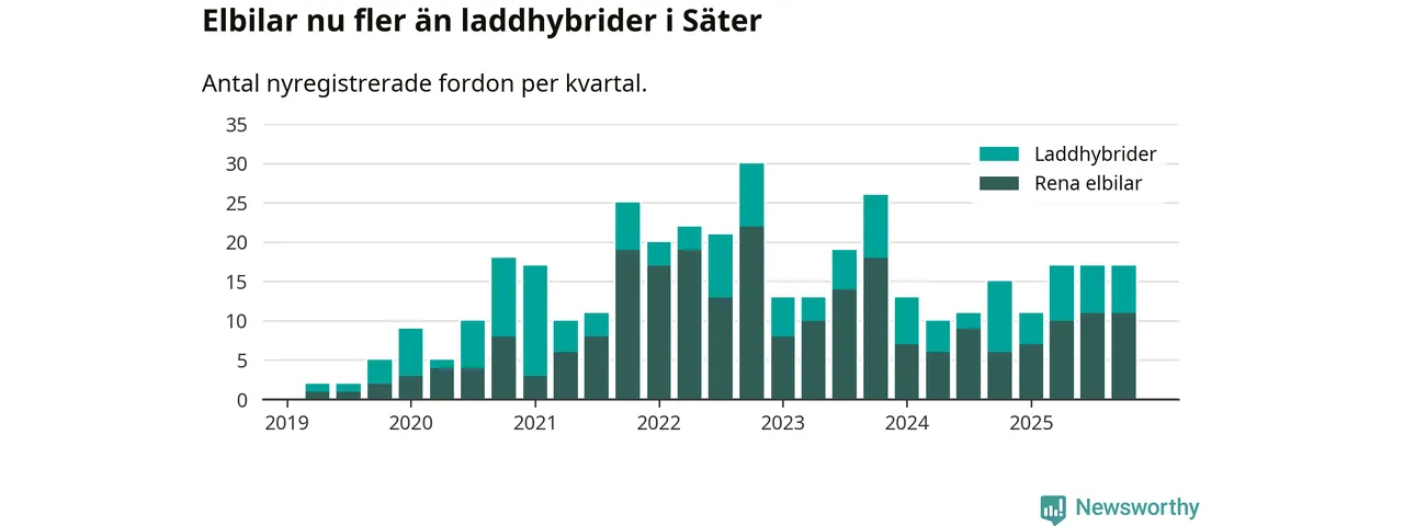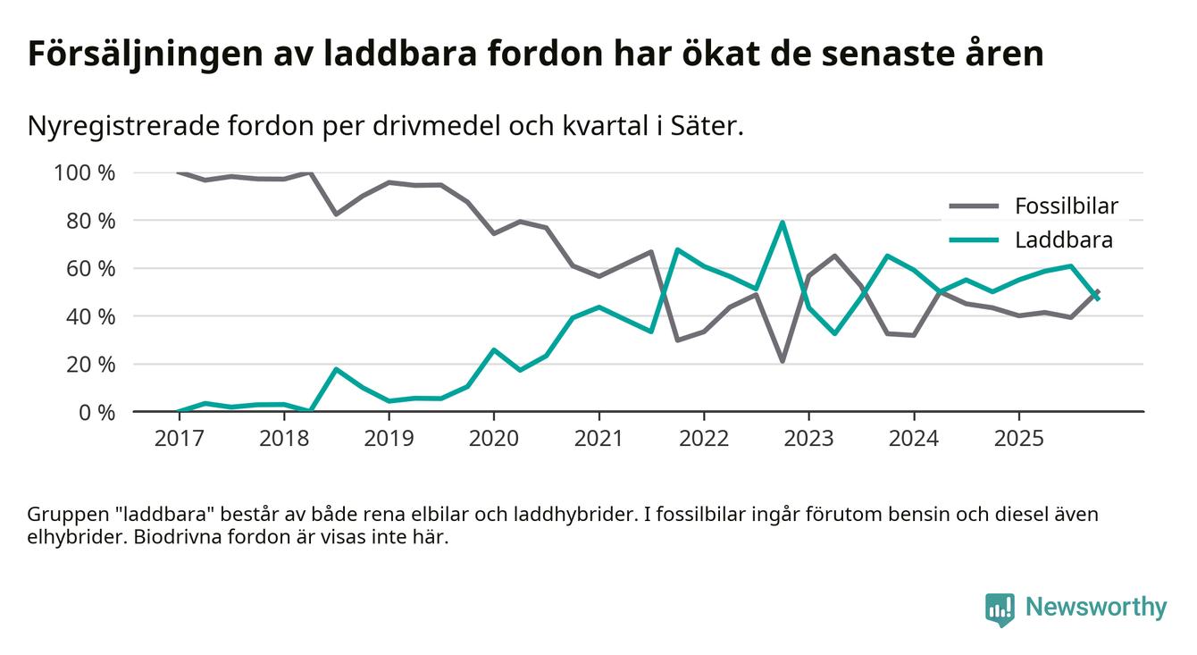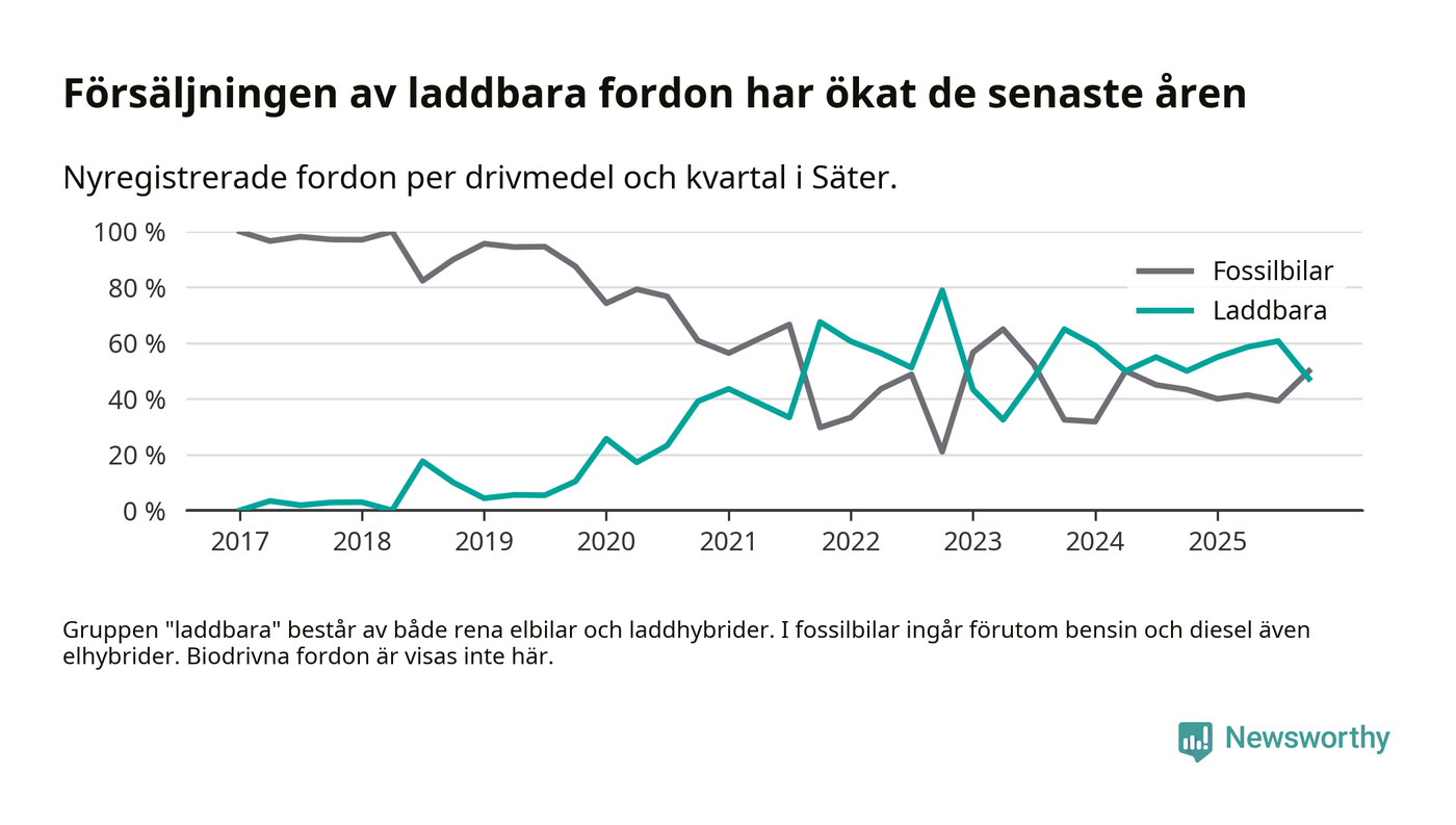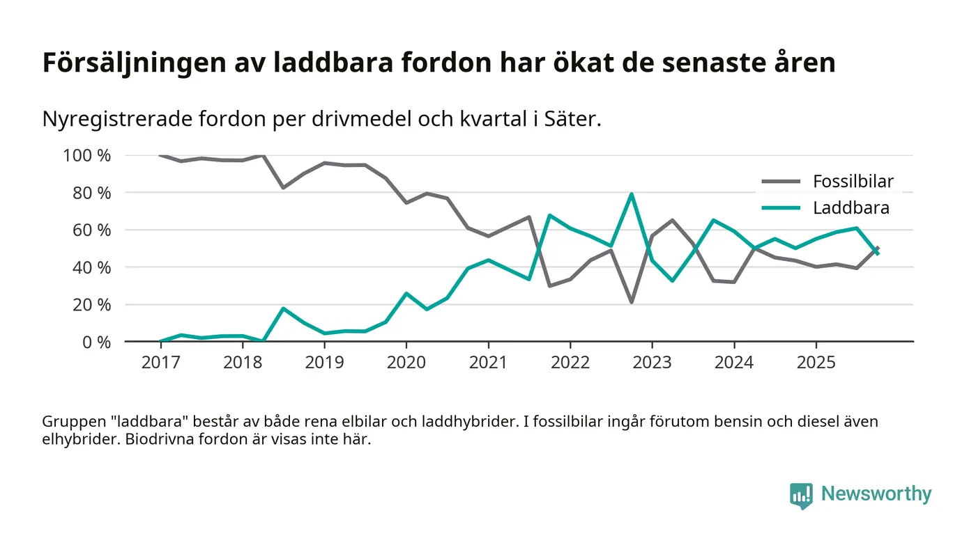 Under fjärde kvartalet 2025 var 47 procent av alla nyregistrerade personbilar i Säter laddbara (sammanlagt registrerades 36 nya bilar). Merparten av de laddbara bilarna var rena elbilar (31 procent av alla).