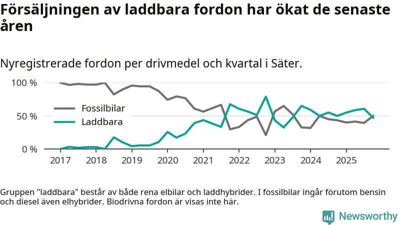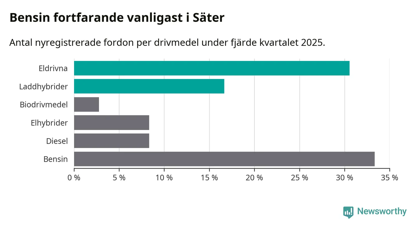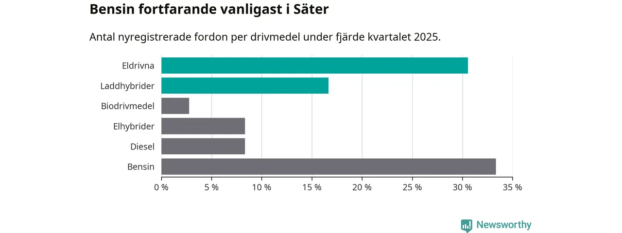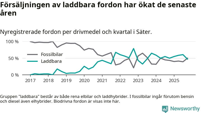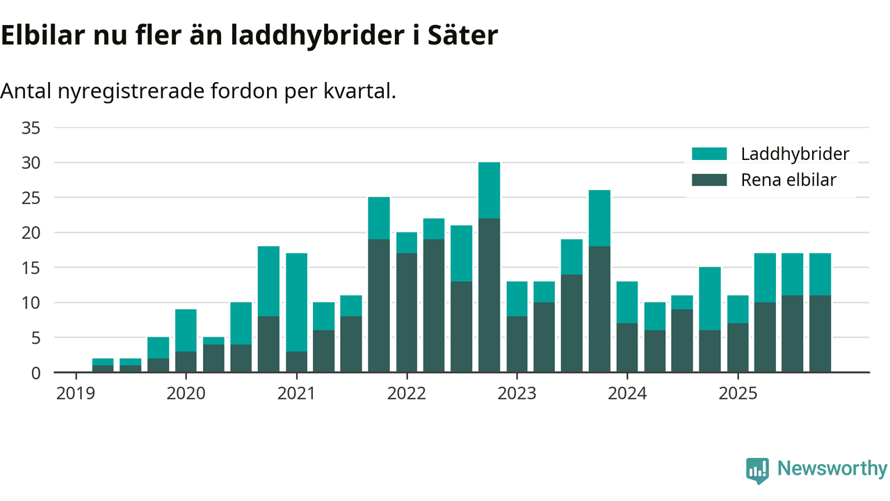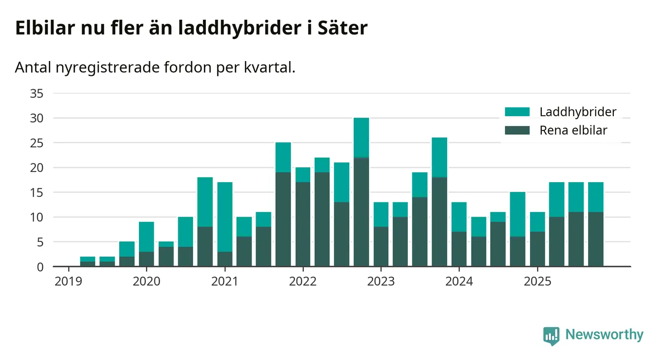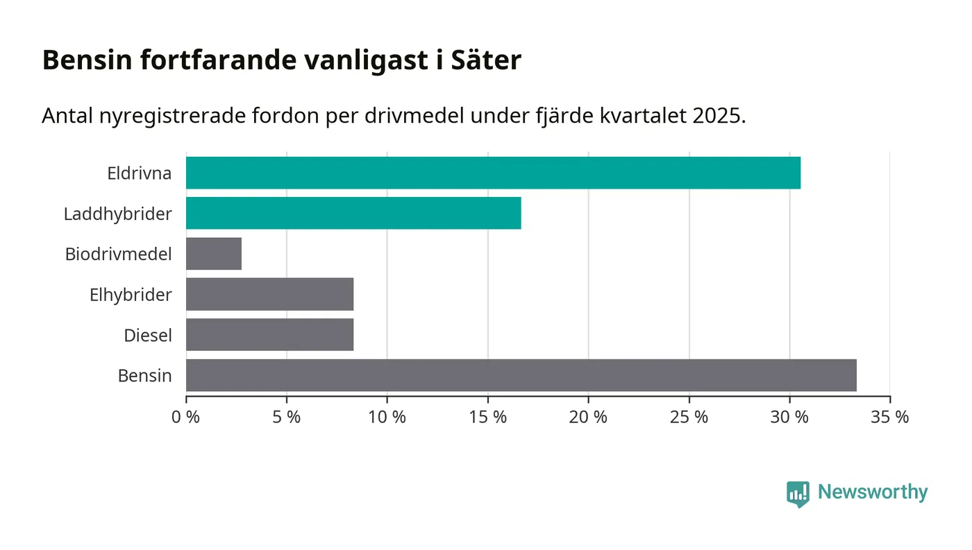 Under fjärde kvartalet 2025 var 47 procent av alla nyregistrerade personbilar i Säter laddbara (sammanlagt registrerades 36 nya bilar). Merparten av de laddbara bilarna var rena elbilar (31 procent av alla).