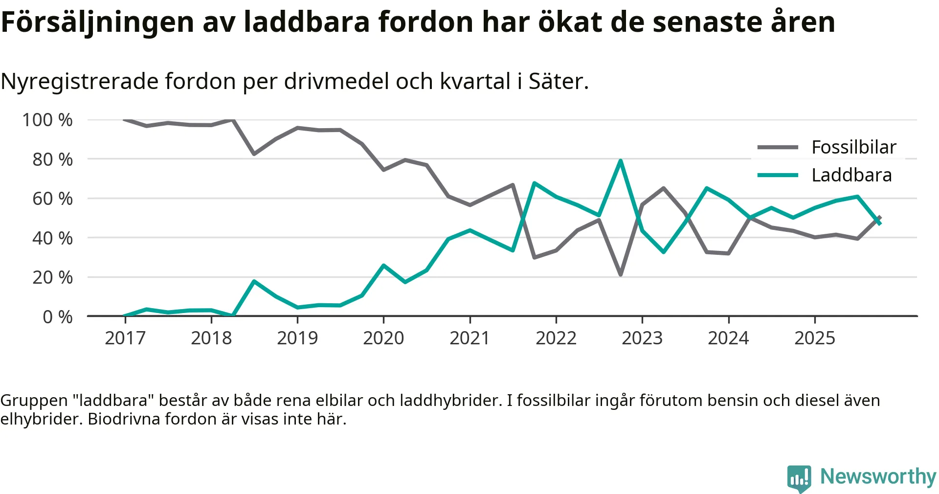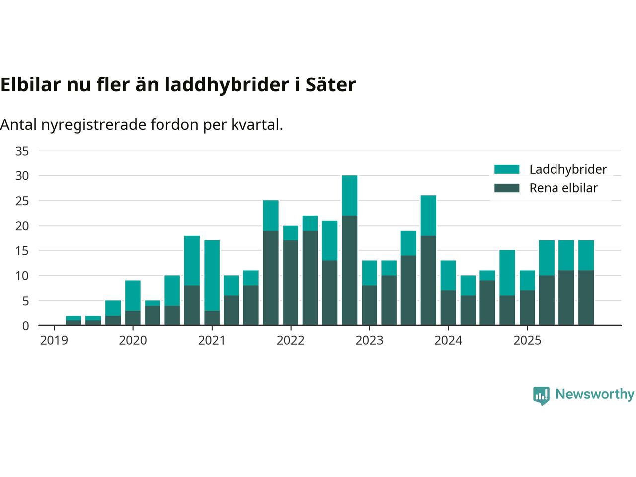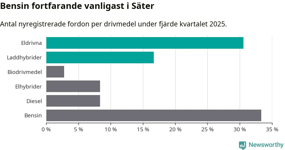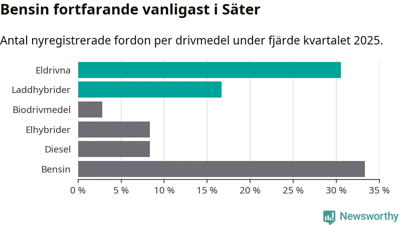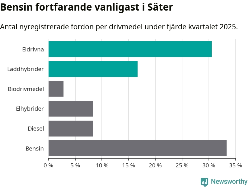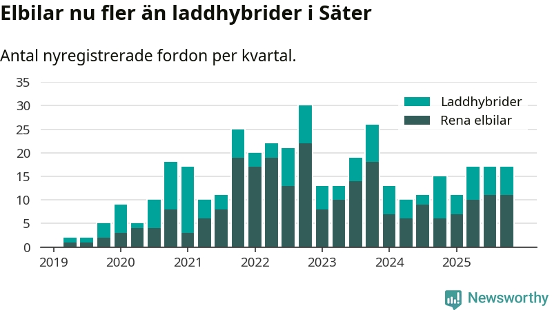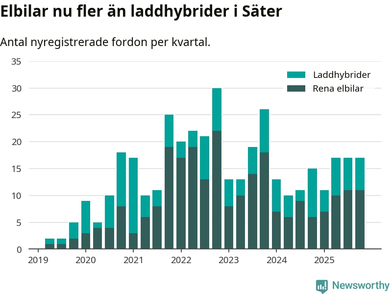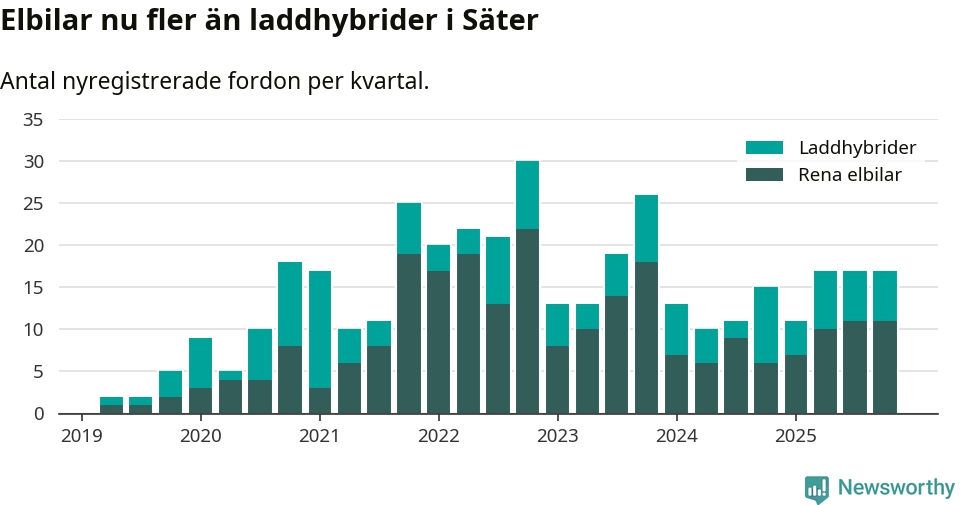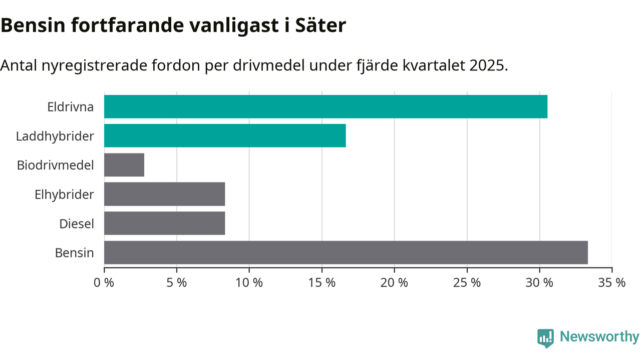 Under fjärde kvartalet 2025 var 47 procent av alla nyregistrerade personbilar i Säter laddbara (sammanlagt registrerades 36 nya bilar). Merparten av de laddbara bilarna var rena elbilar (31 procent av alla).