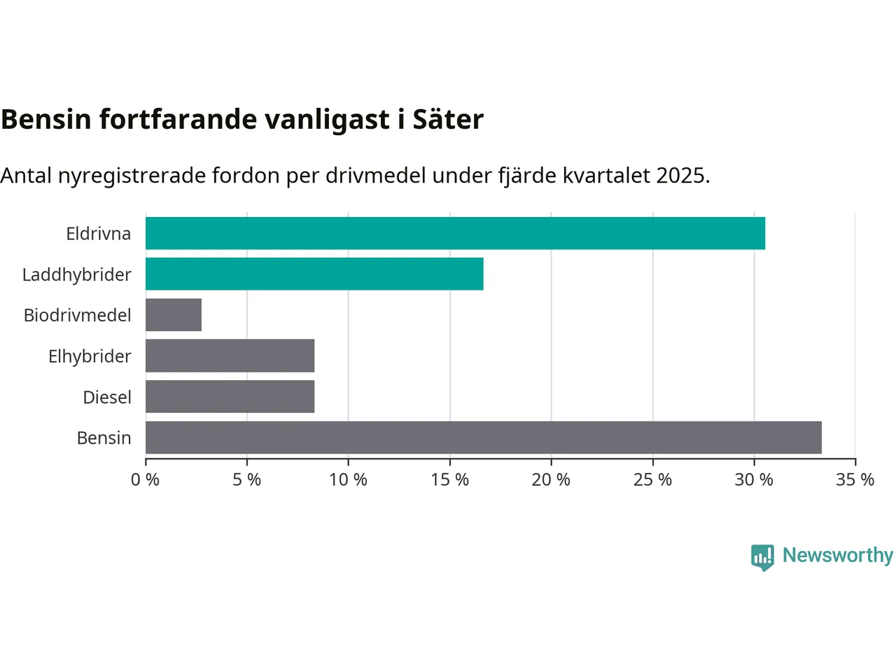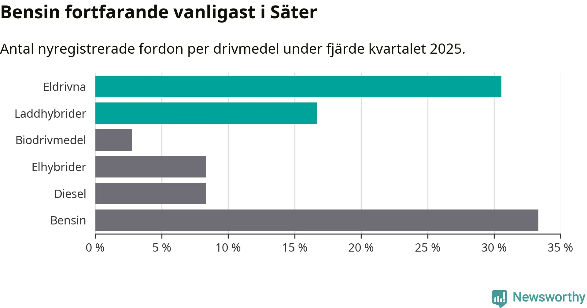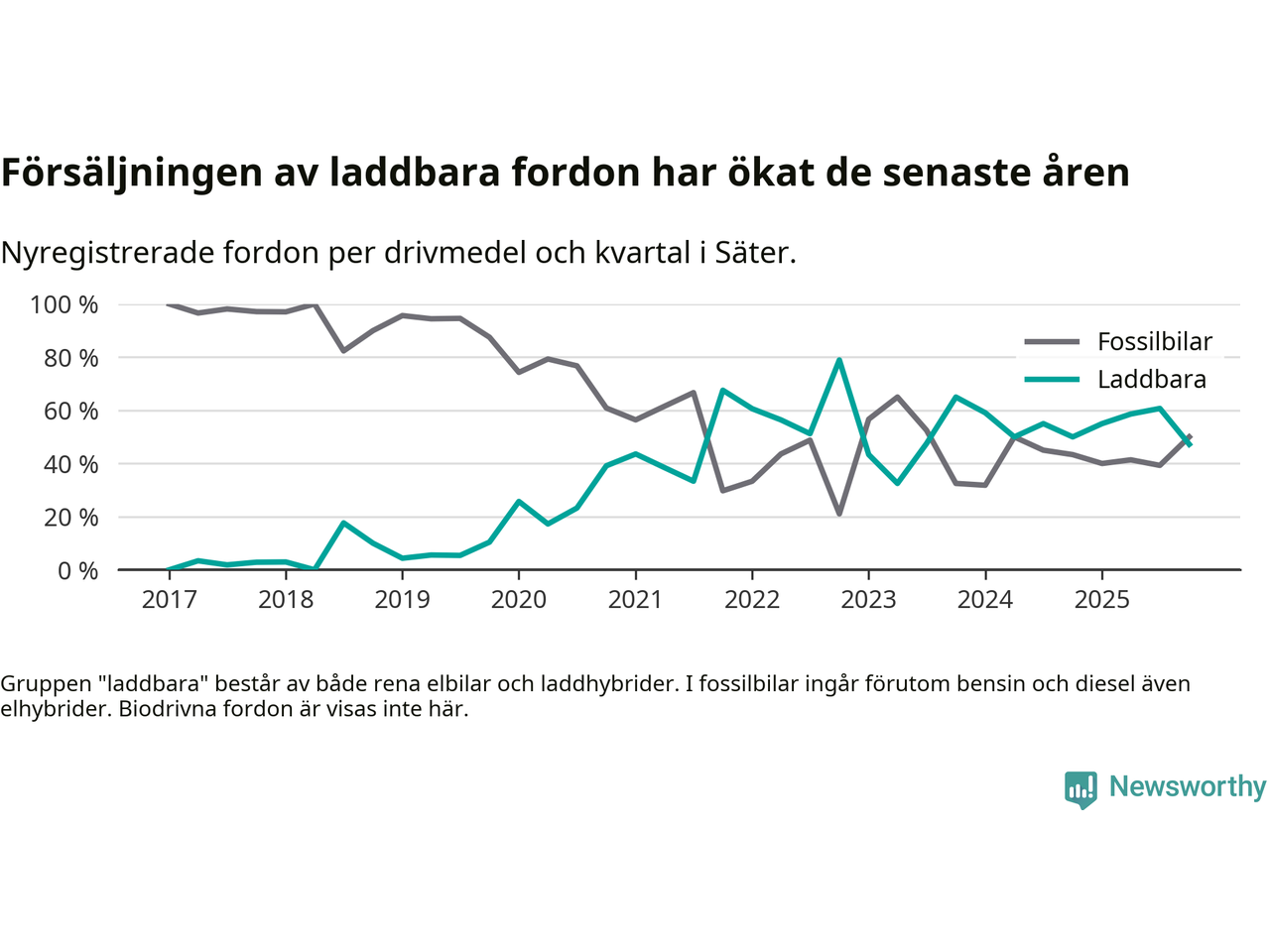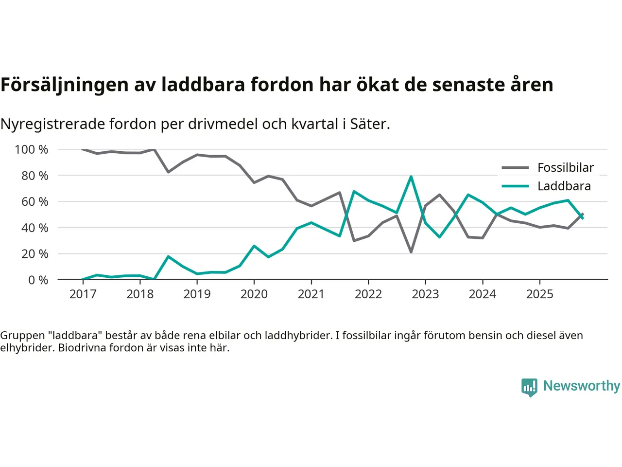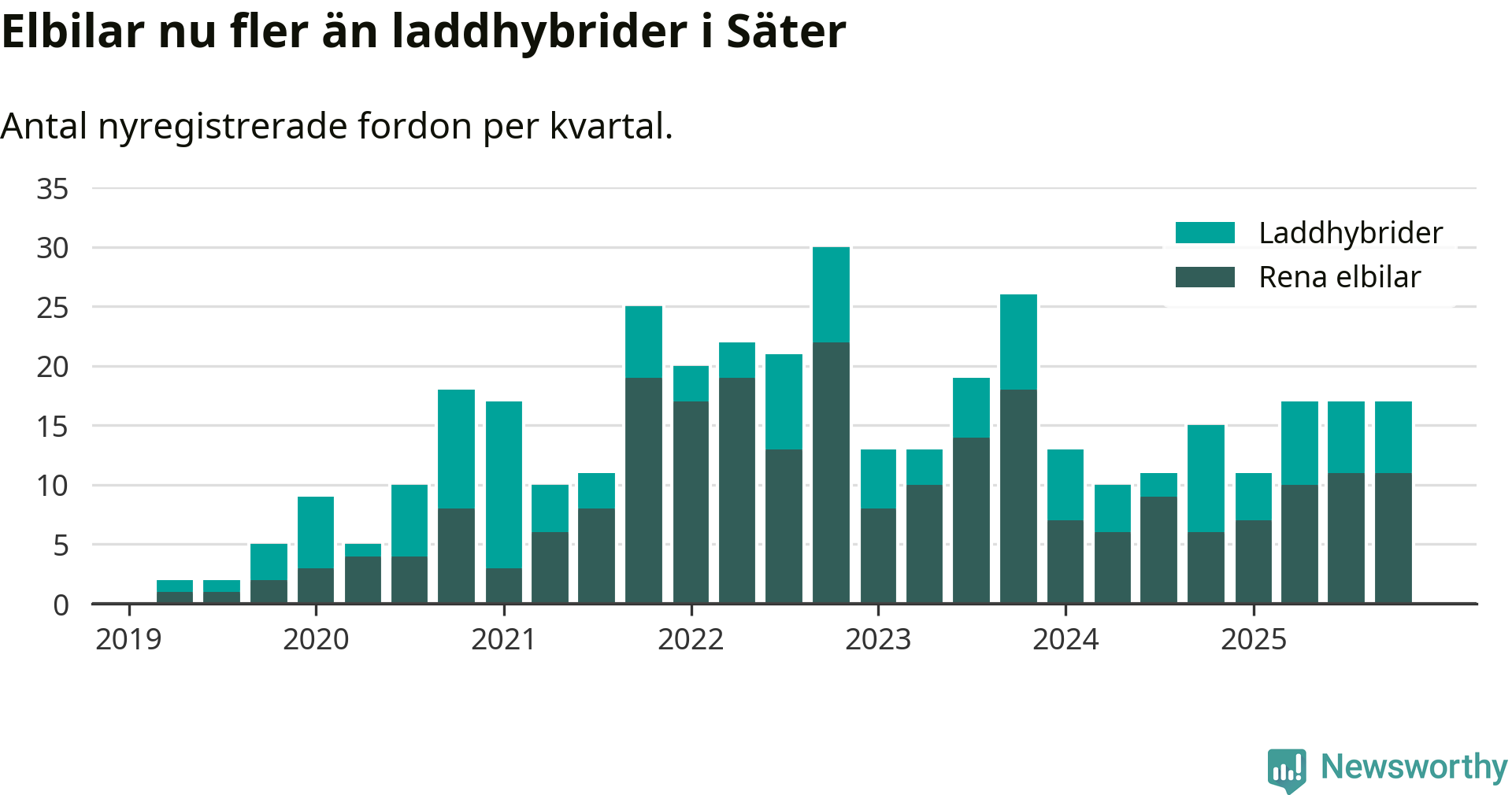 Under fjärde kvartalet 2025 var 47 procent av alla nyregistrerade personbilar i Säter laddbara (sammanlagt registrerades 36 nya bilar). Merparten av de laddbara bilarna var rena elbilar (31 procent av alla).