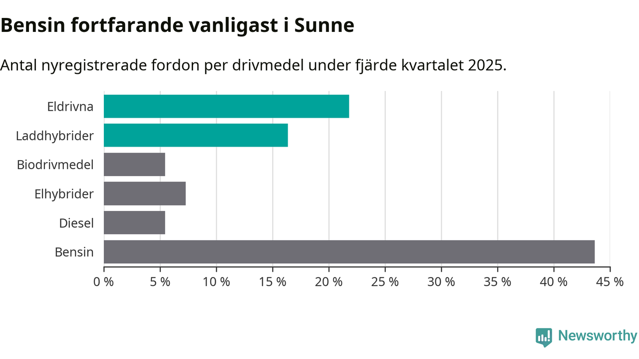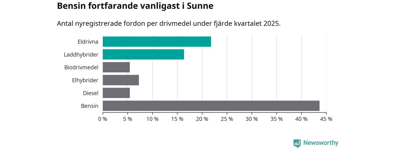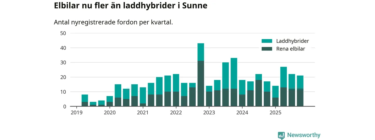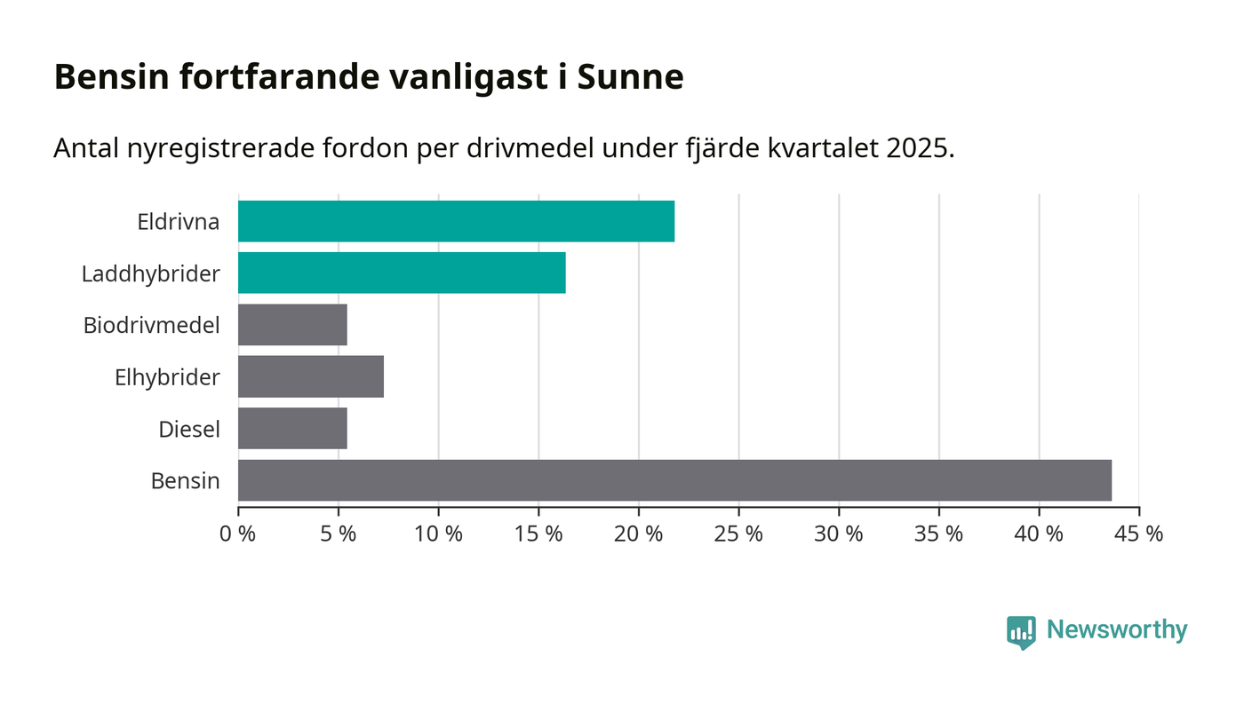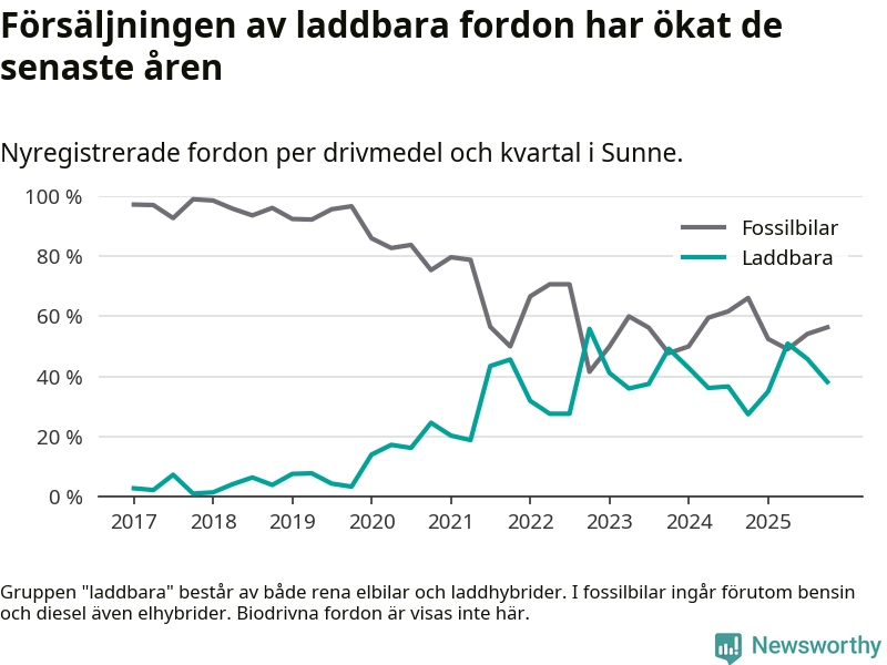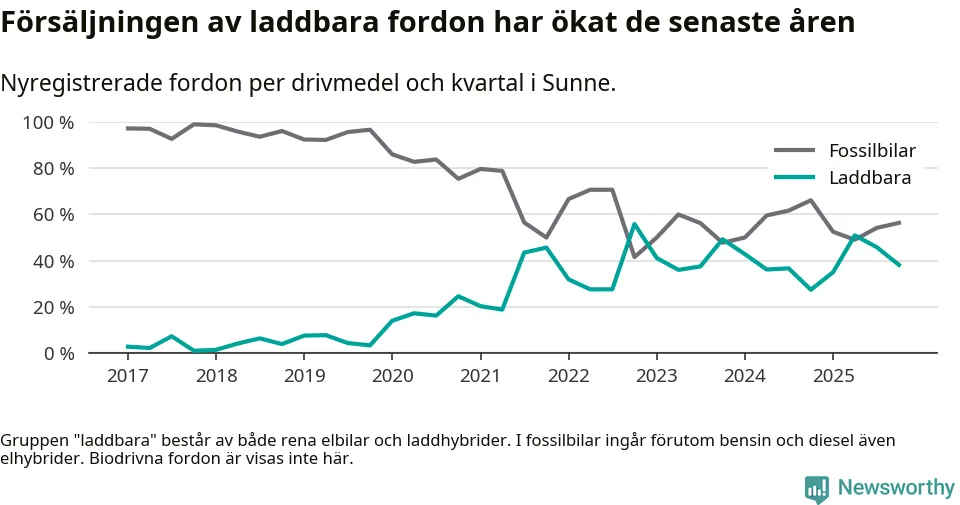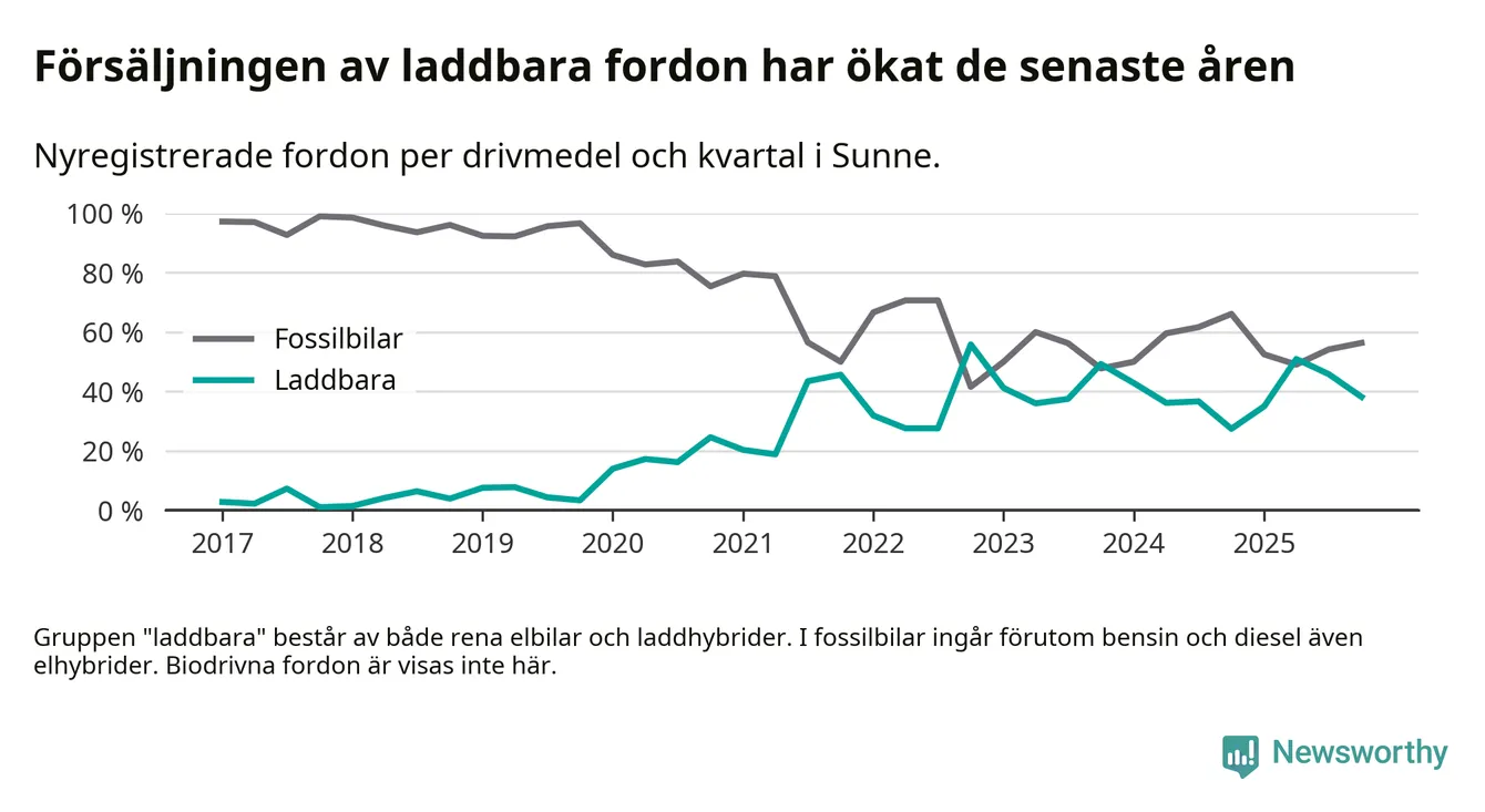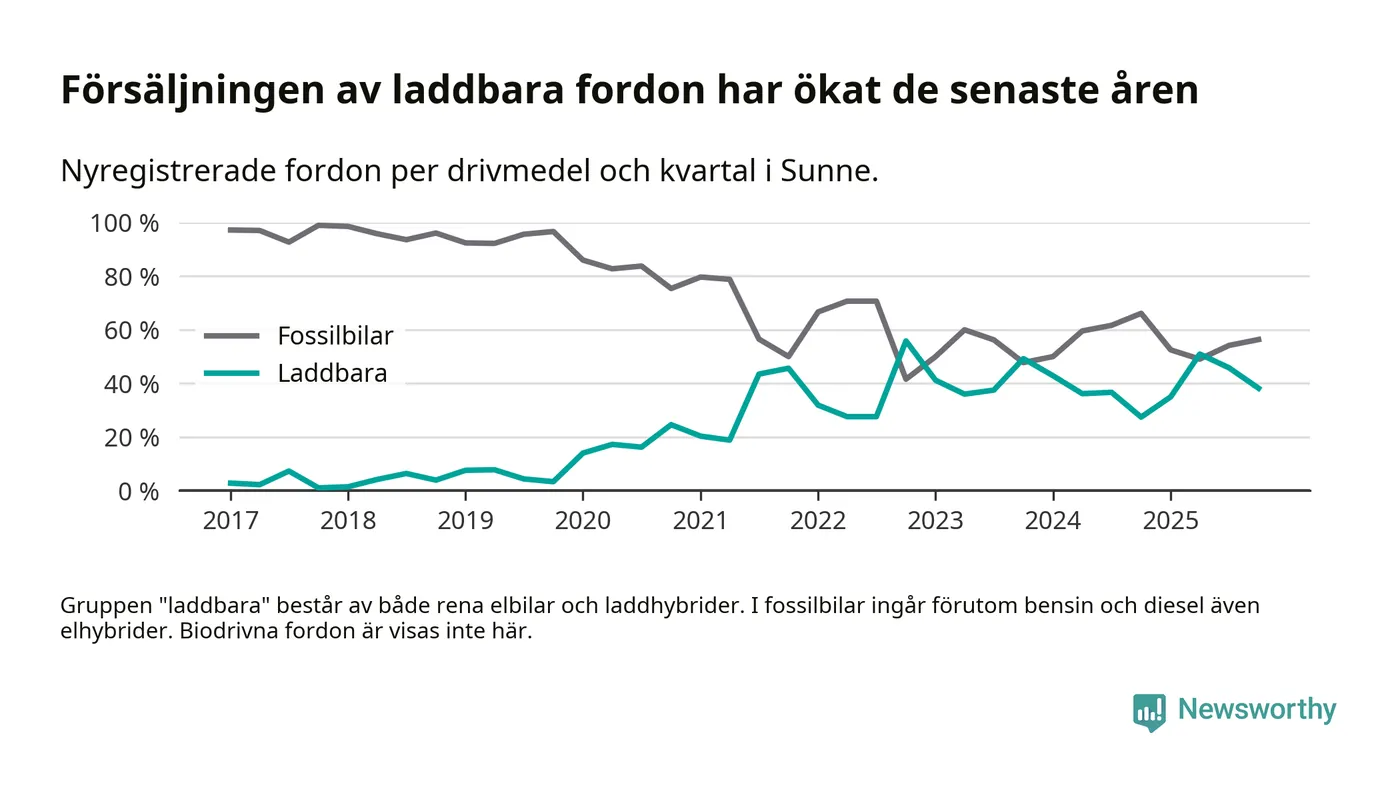 Under fjärde kvartalet 2025 var 38 procent av alla nyregistrerade personbilar i Sunne laddbara (sammanlagt registrerades 55 nya bilar). Merparten av de laddbara bilarna var rena elbilar (22 procent av alla).