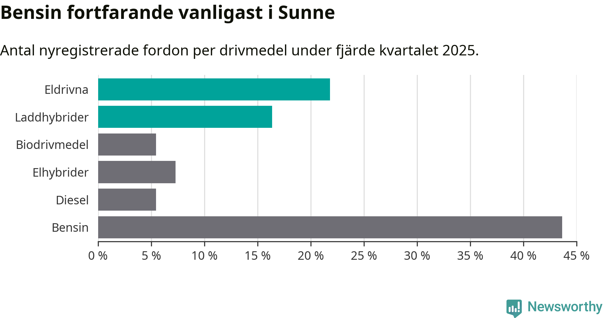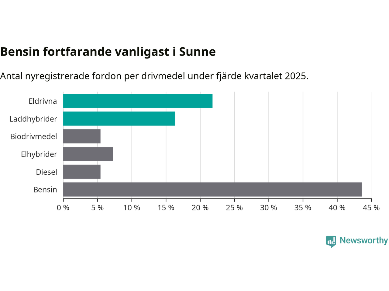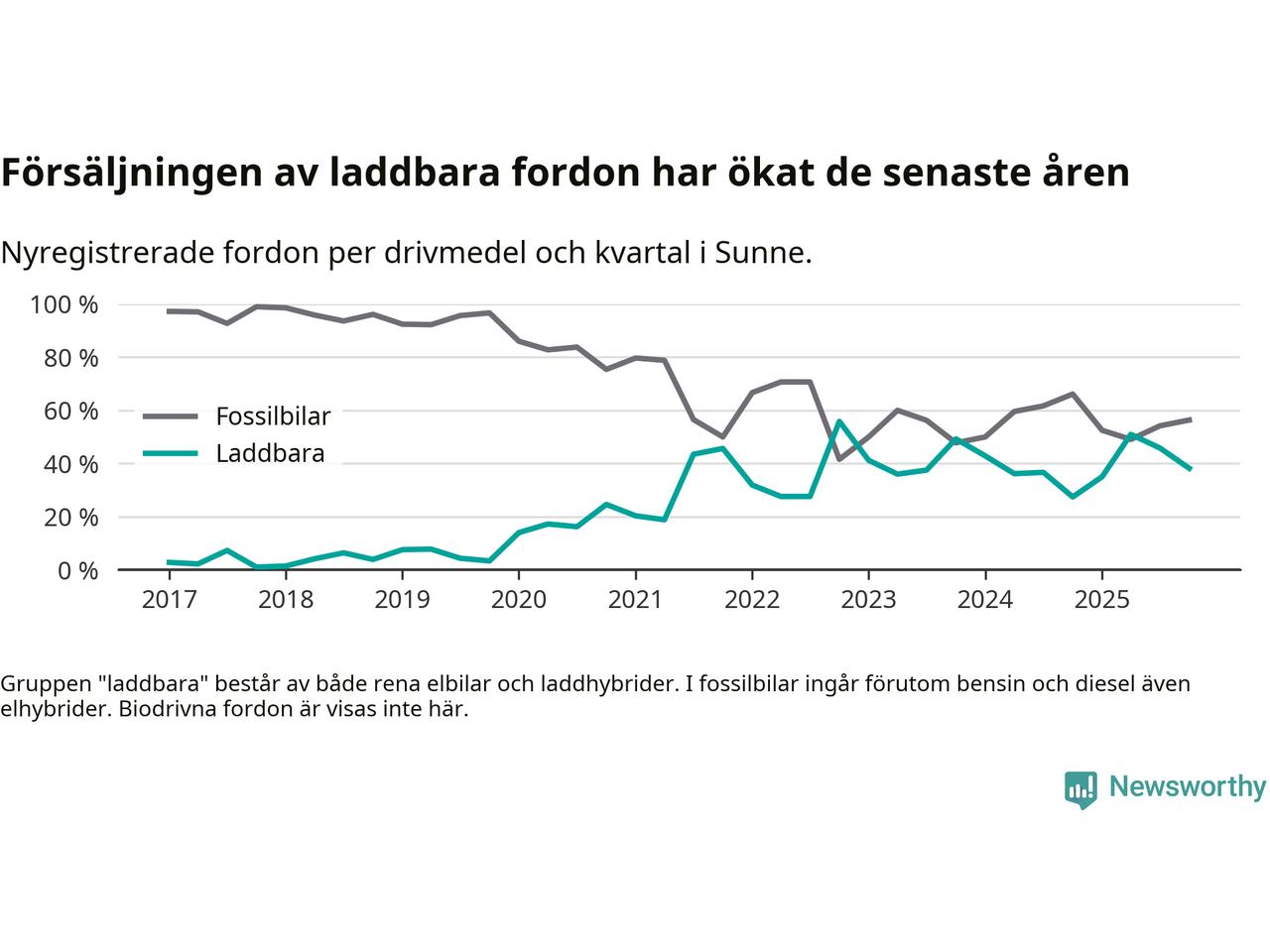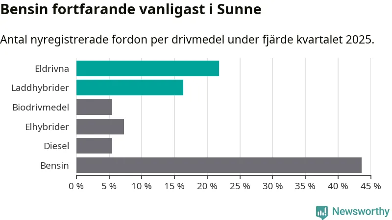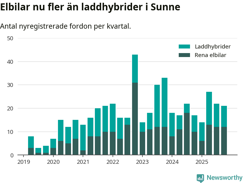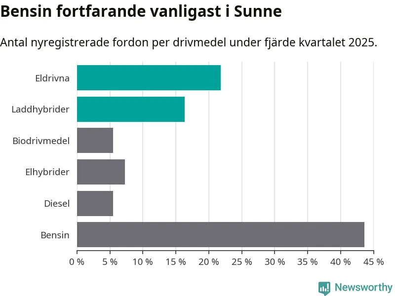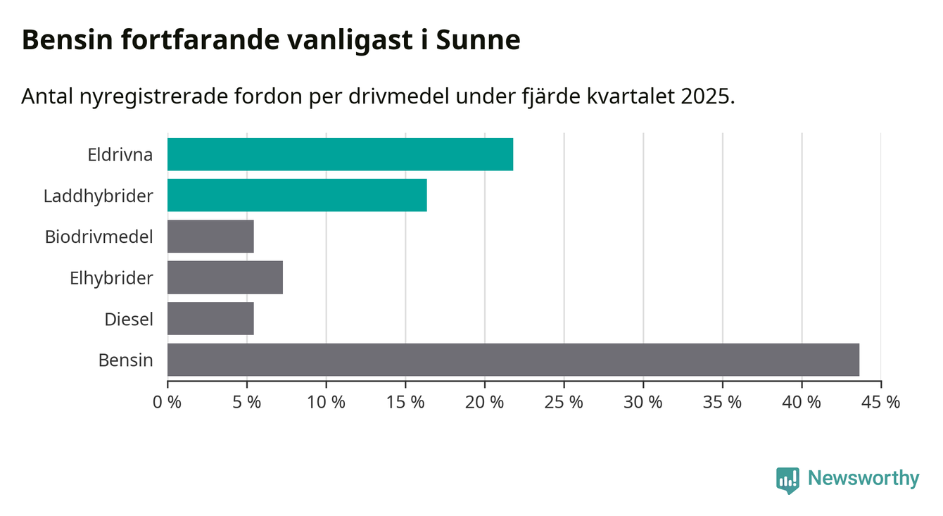 Under fjärde kvartalet 2025 var 38 procent av alla nyregistrerade personbilar i Sunne laddbara (sammanlagt registrerades 55 nya bilar). Merparten av de laddbara bilarna var rena elbilar (22 procent av alla).