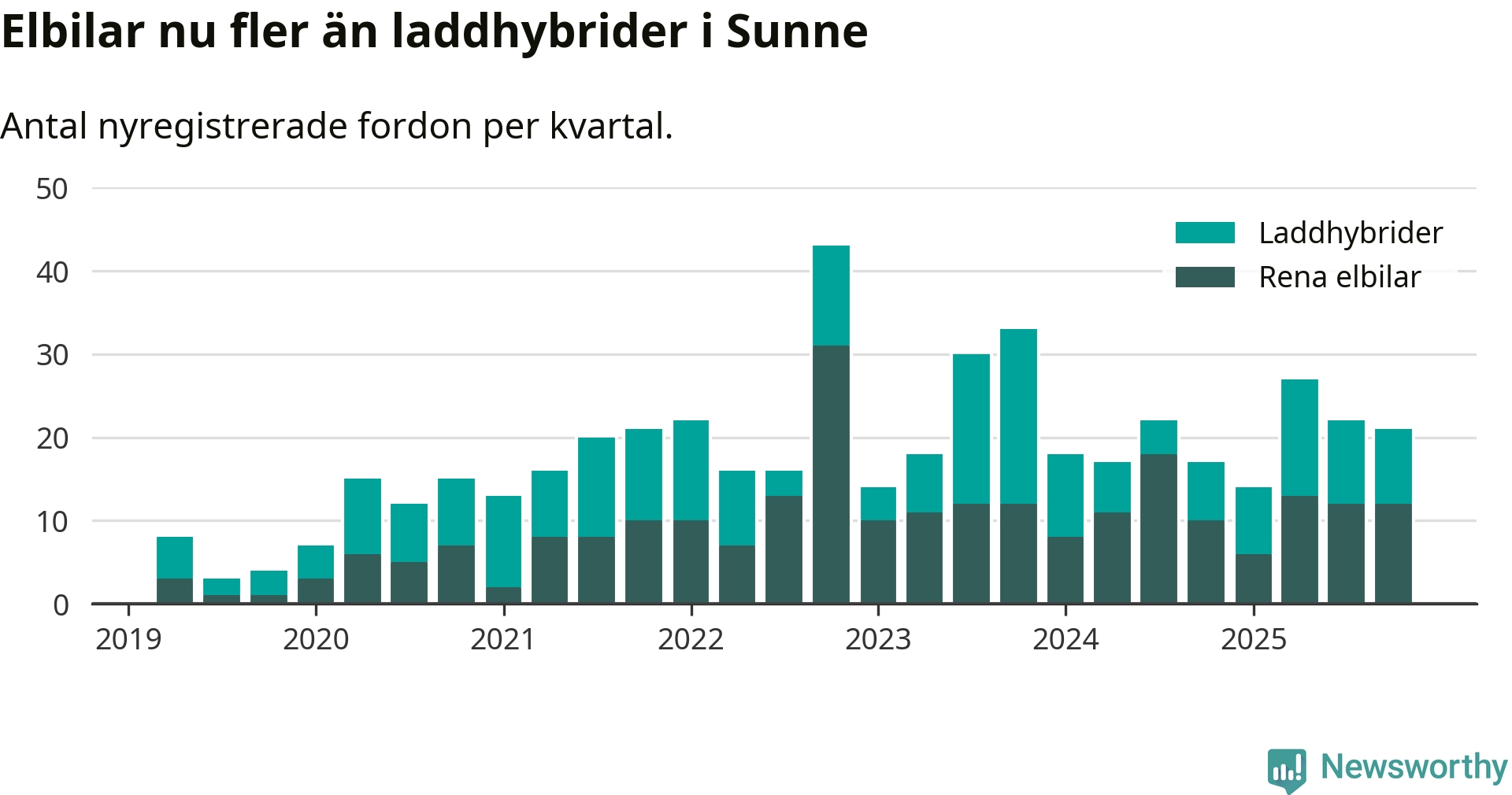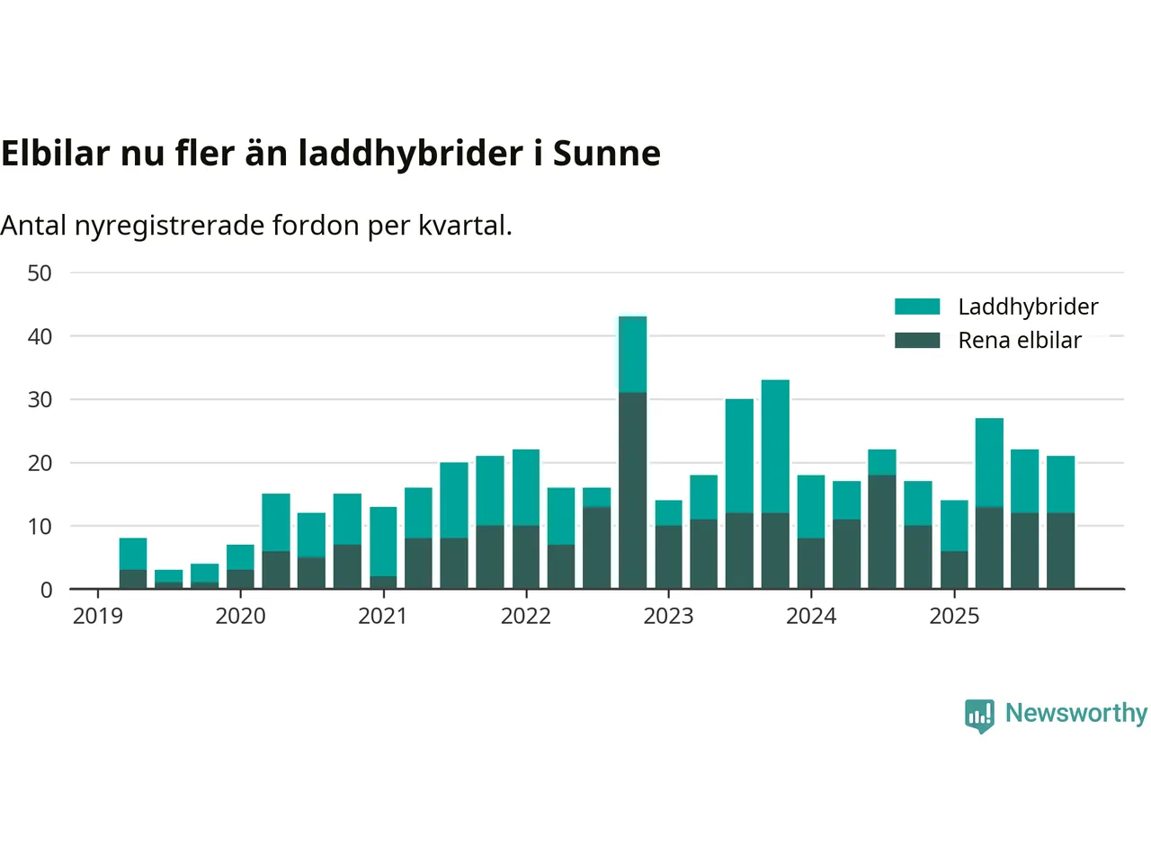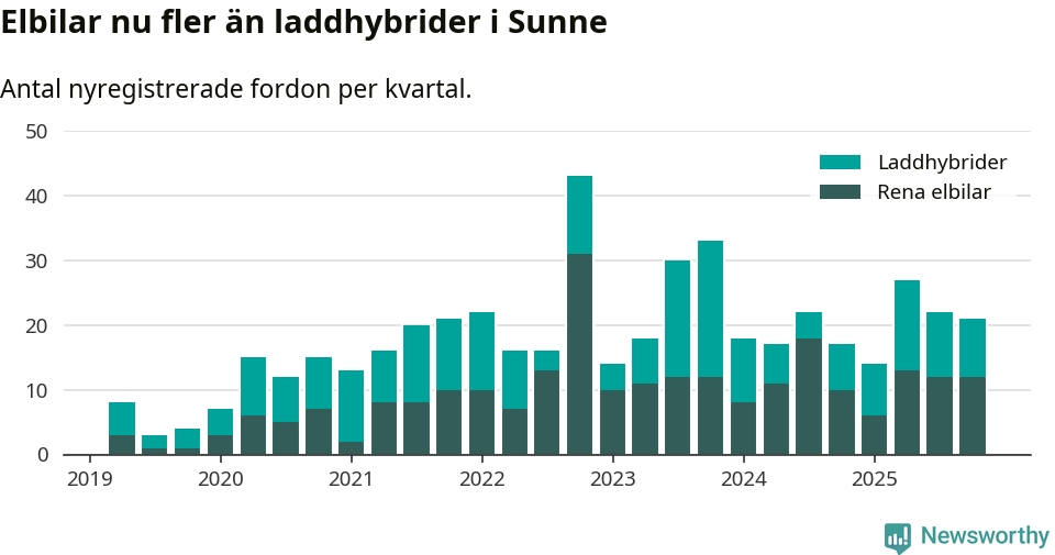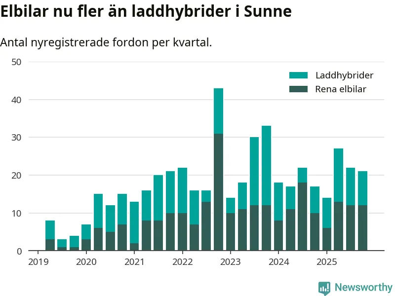 I Sunne minskade andelen laddbara bilar under fjärde kvartalet jämfört med kvartalet innan (−7,7 procentenheter). Nyregistreringen peakade under fjärde kvartalet 2022 då 56 procent av de nya bilarna var laddbara.