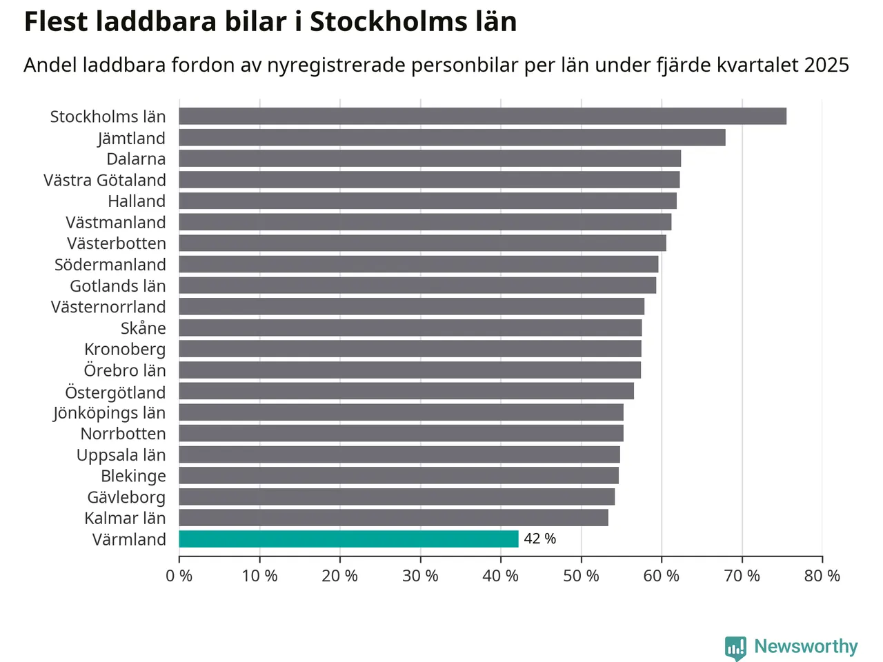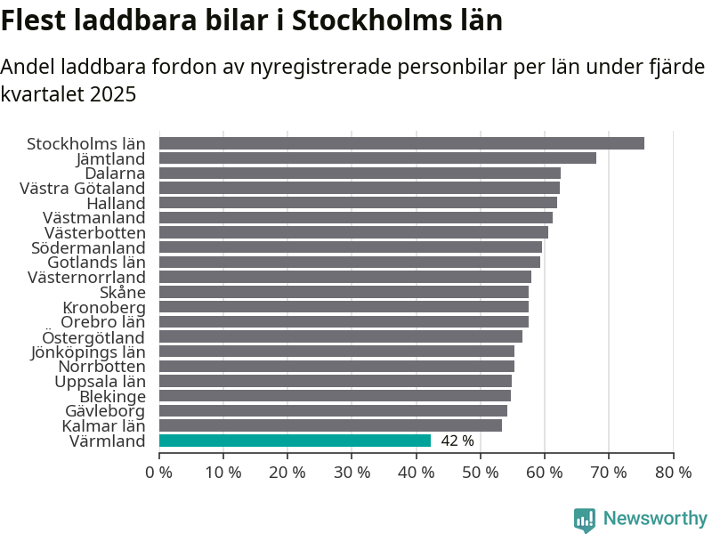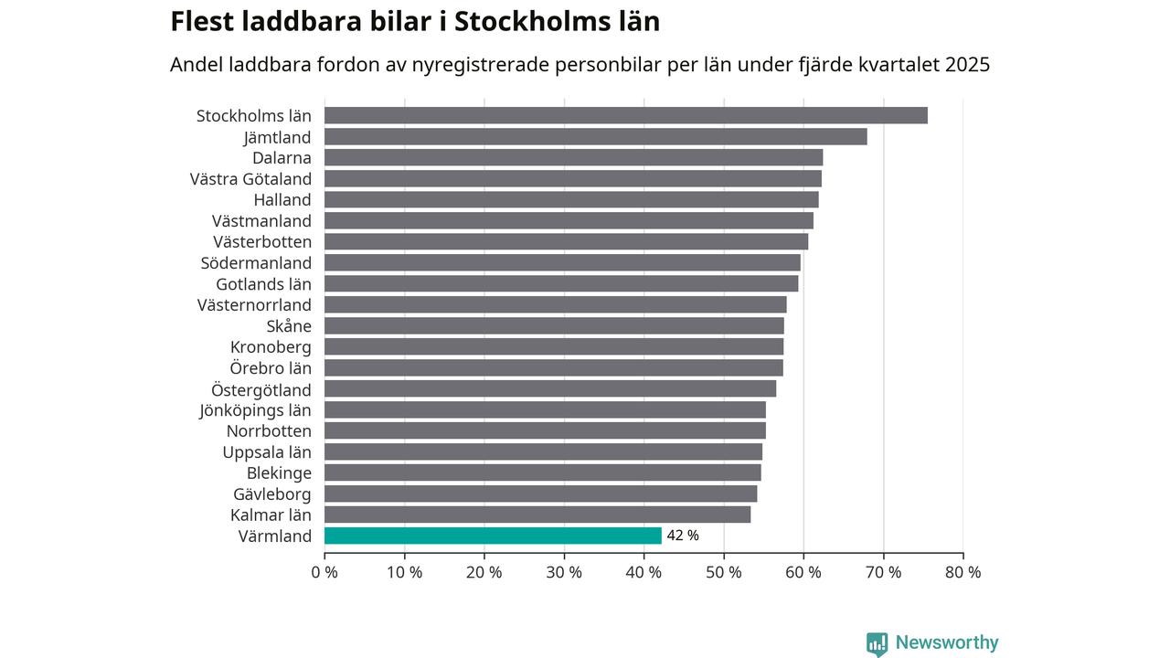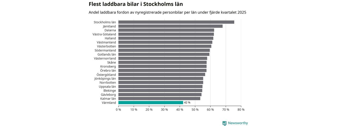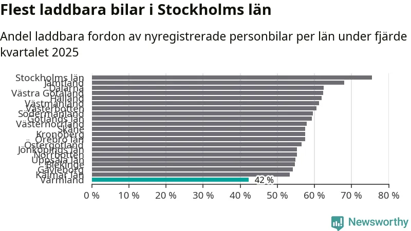I hela landet var 64 procent av alla nya bilar laddbara under fjärde kvartalet. Det är något fler än föregående kvartal (+2,9 procentenheter). I Värmlands län var 42 procent av de nya bilarna laddbara, vilket är färre än föregående kvartal (−4,2 procentenheter).