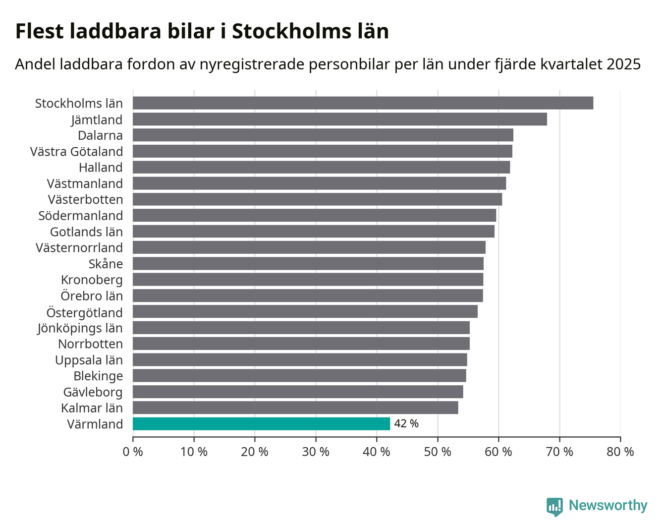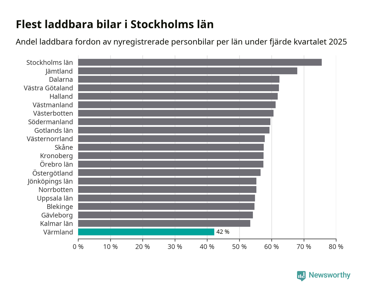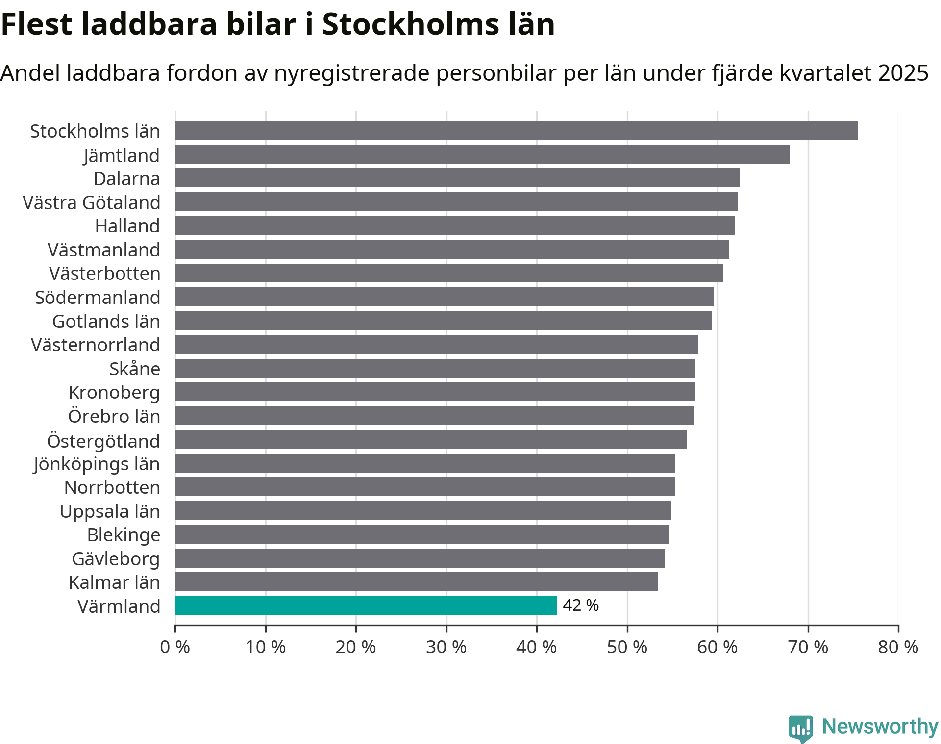 I hela landet var 64 procent av alla nya bilar laddbara under fjärde kvartalet. Det är något fler än föregående kvartal (+2,9 procentenheter). I Värmlands län var 42 procent av de nya bilarna laddbara, vilket är färre än föregående kvartal (−4,2 procentenheter).
