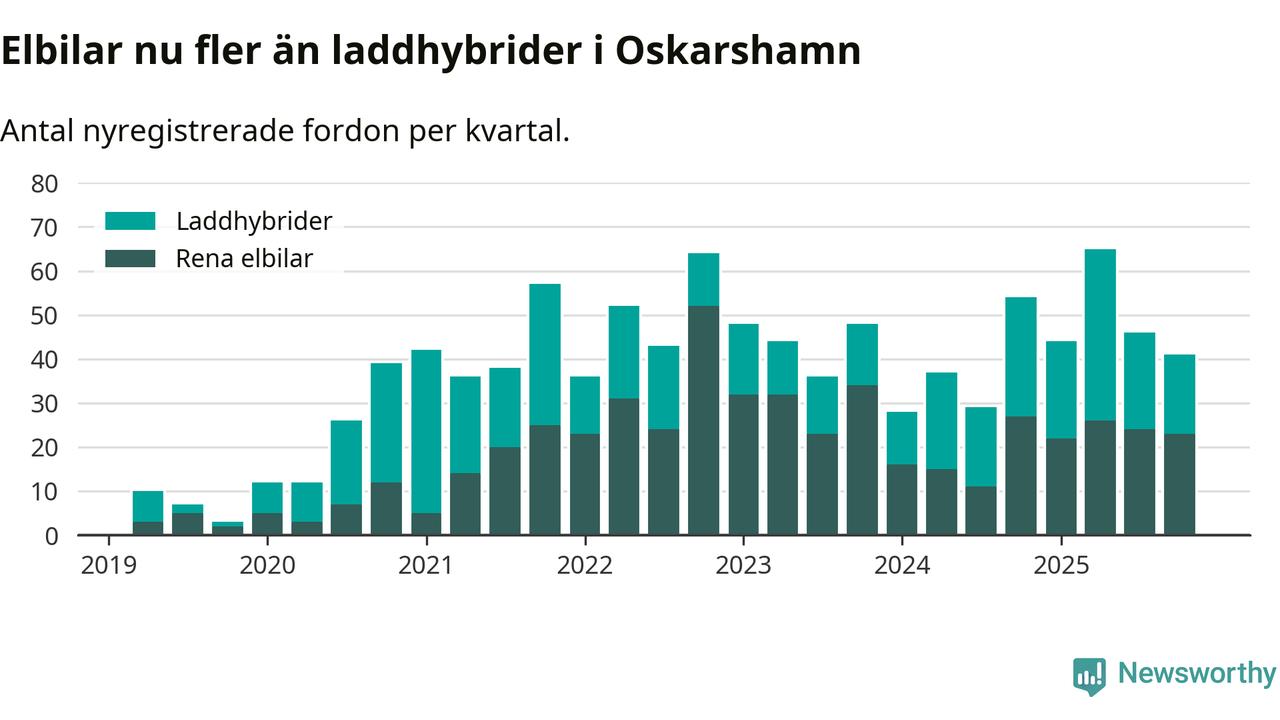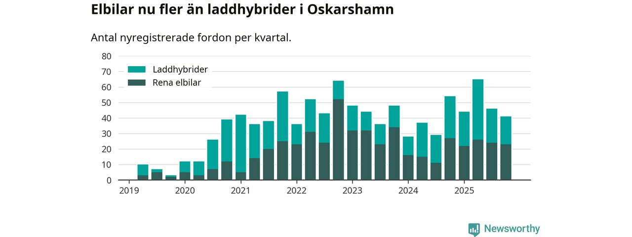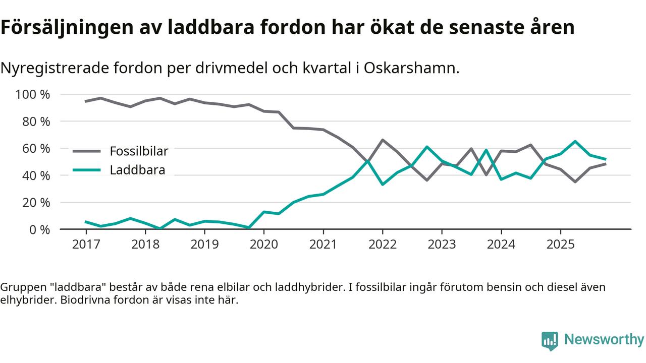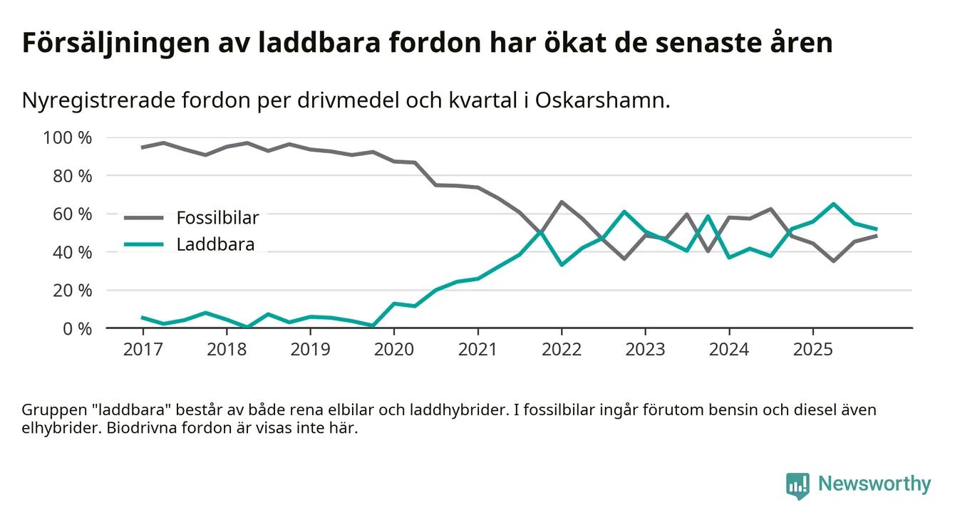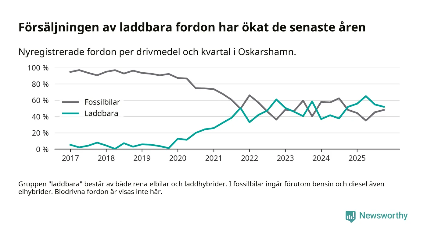 Under fjärde kvartalet 2025 var 52 procent av alla nyregistrerade personbilar i Oskarshamn laddbara (sammanlagt registrerades 79 nya bilar). Merparten av de laddbara bilarna var rena elbilar (29 procent av alla).