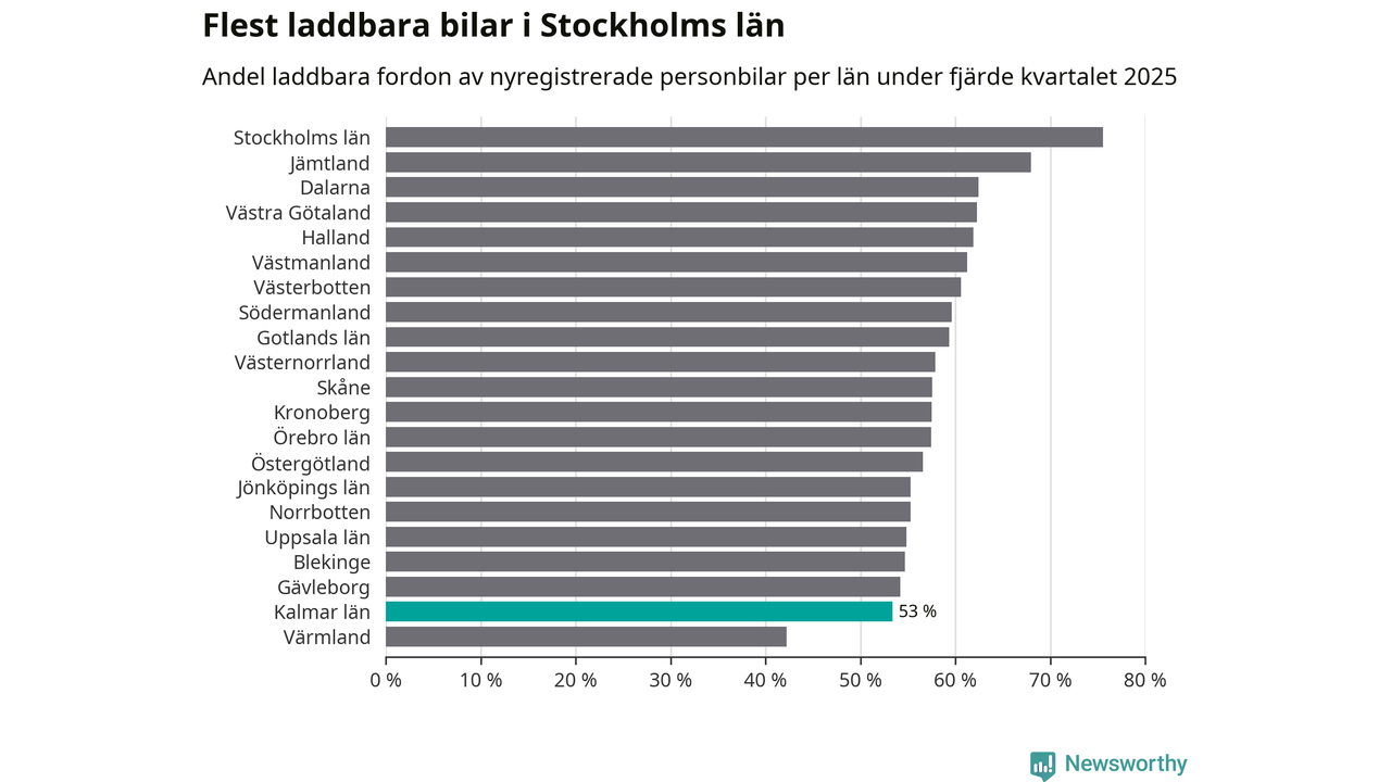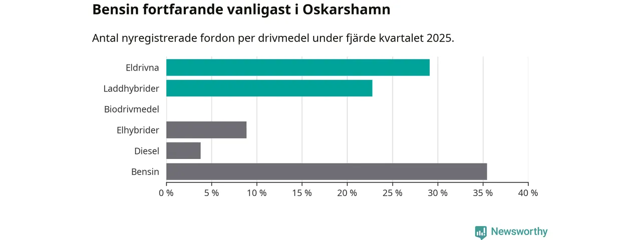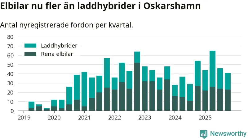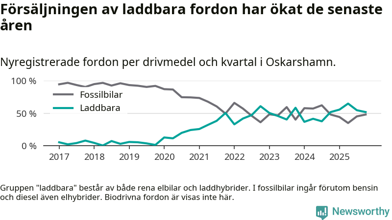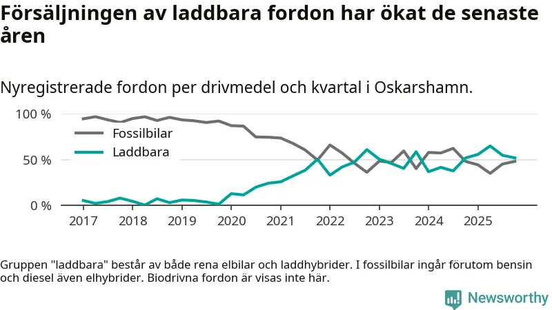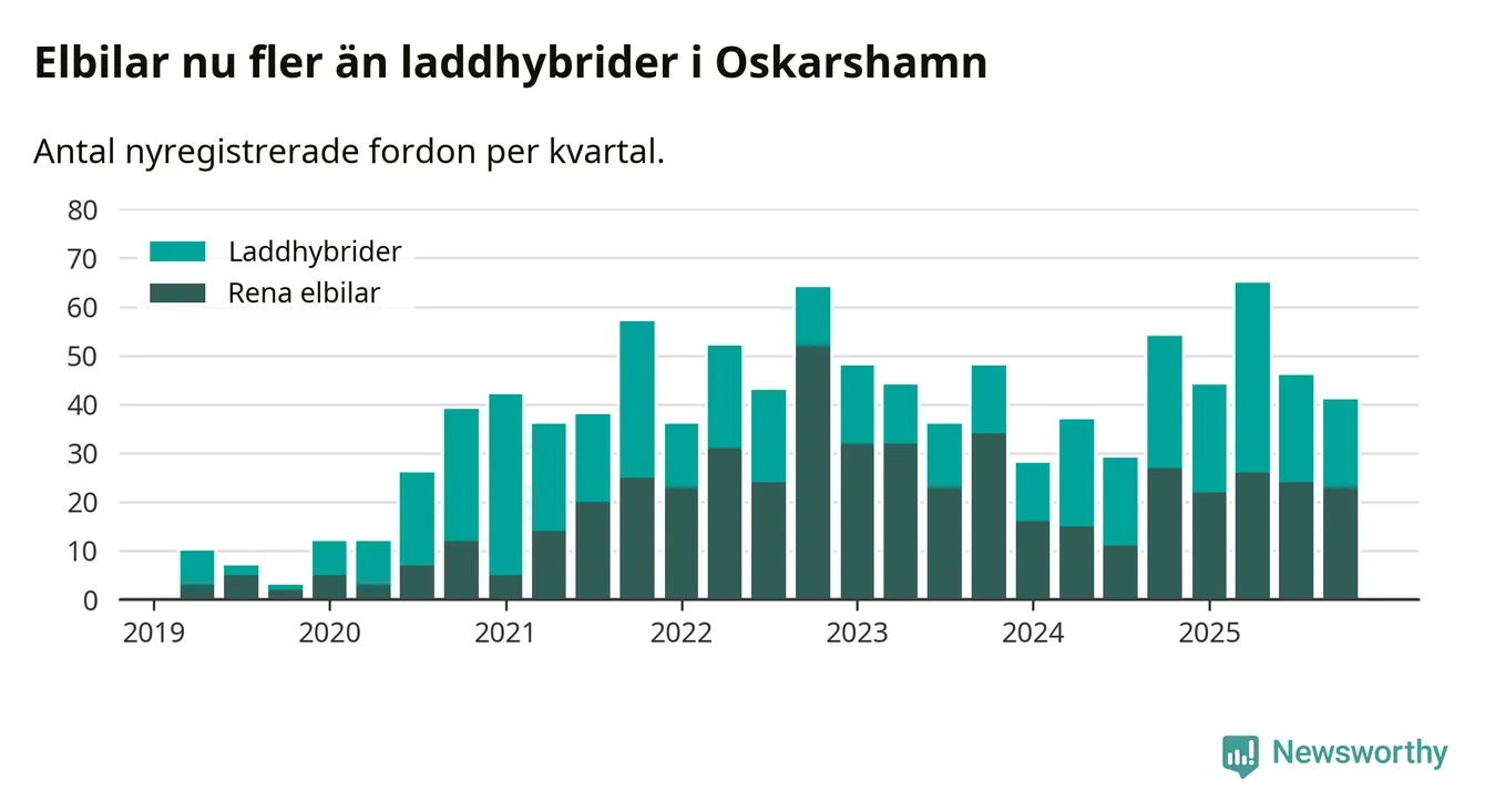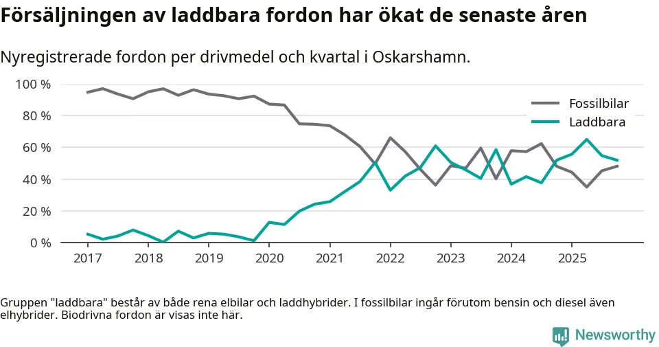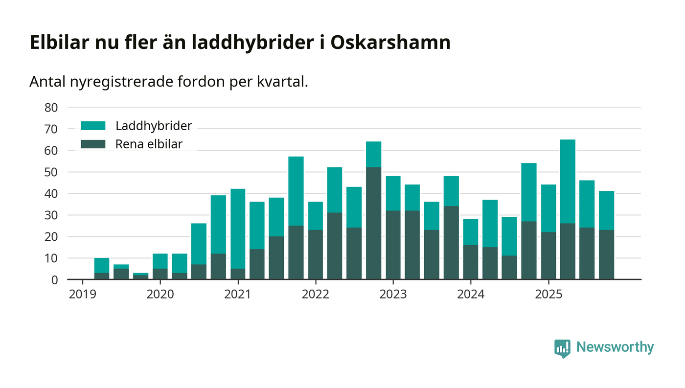 Under fjärde kvartalet 2025 var 52 procent av alla nyregistrerade personbilar i Oskarshamn laddbara (sammanlagt registrerades 79 nya bilar). Merparten av de laddbara bilarna var rena elbilar (29 procent av alla).