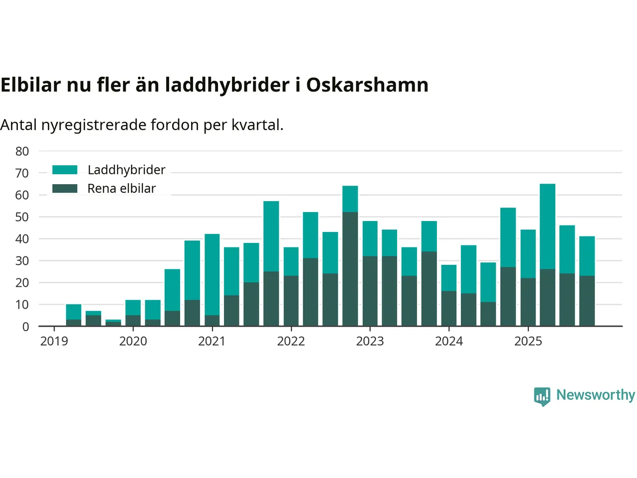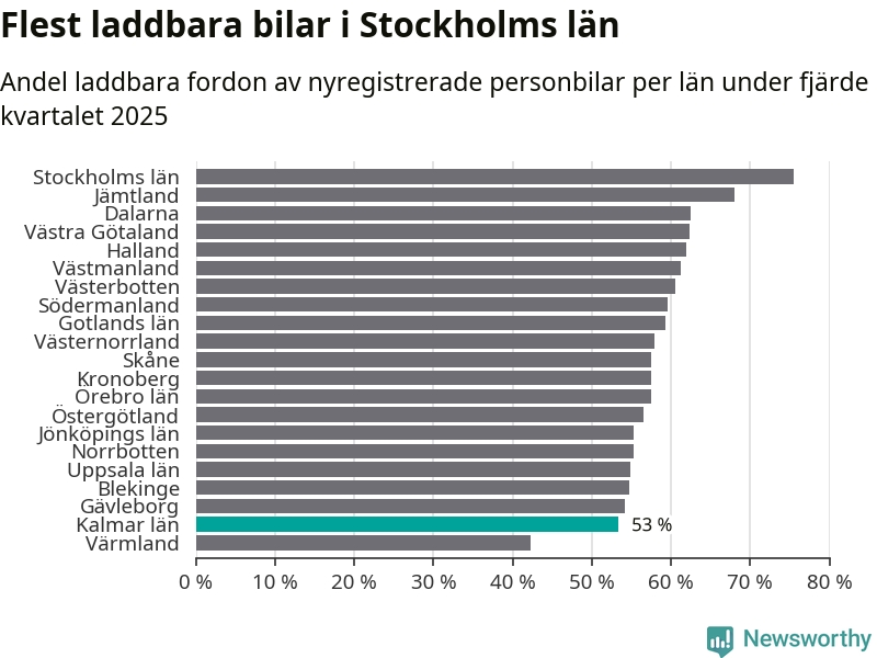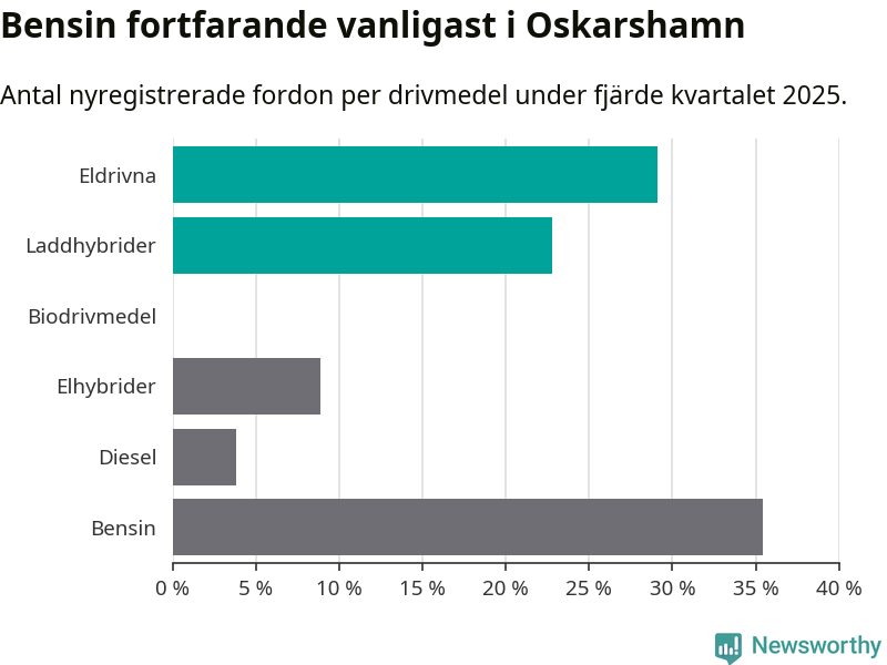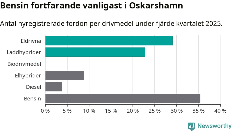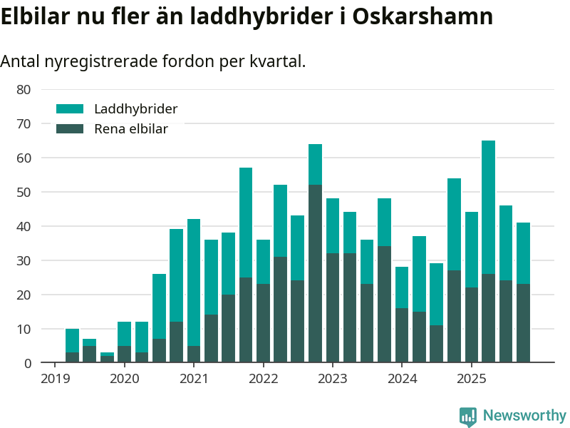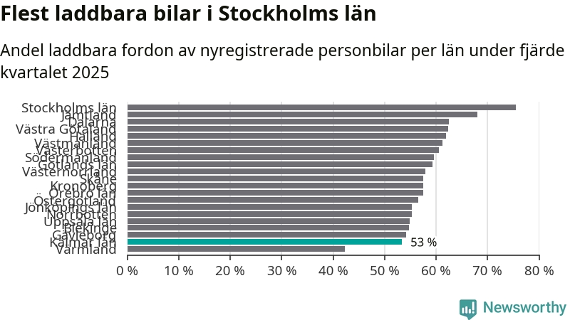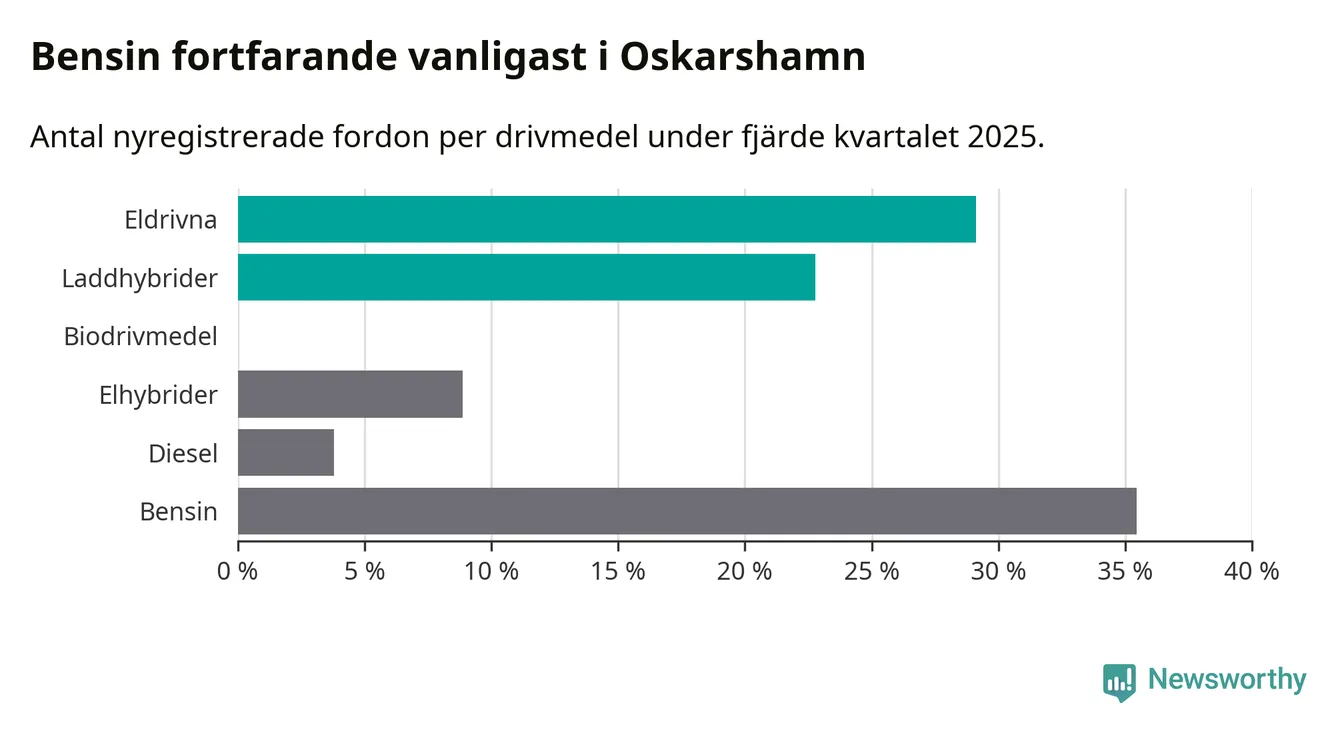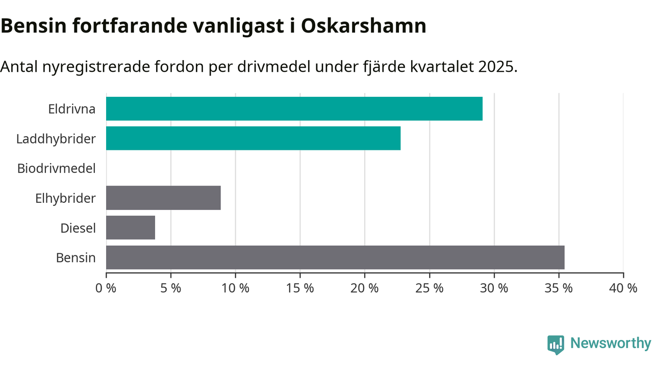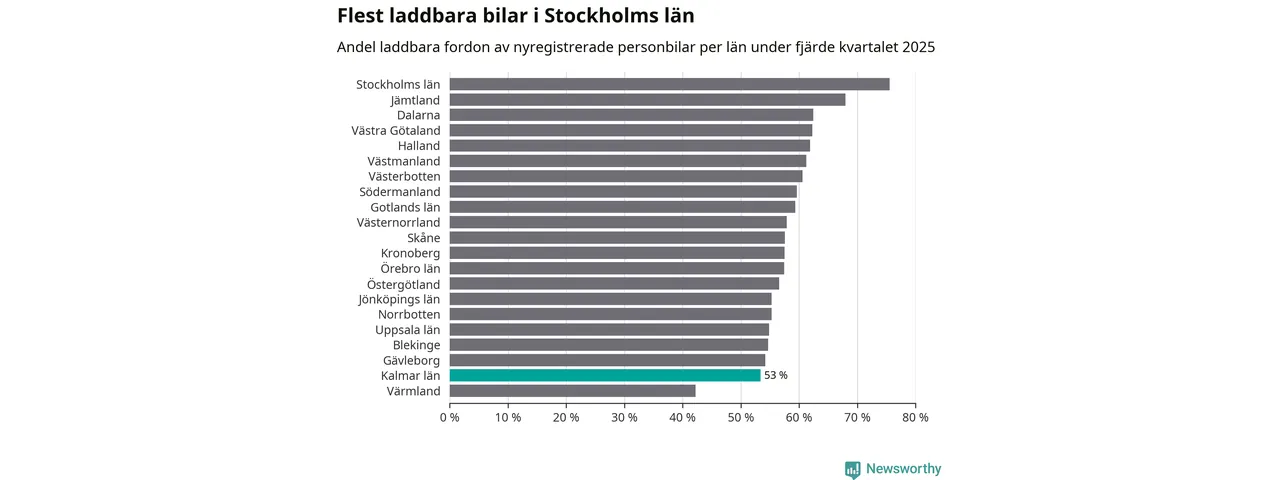 Under fjärde kvartalet 2025 var 52 procent av alla nyregistrerade personbilar i Oskarshamn laddbara (sammanlagt registrerades 79 nya bilar). Merparten av de laddbara bilarna var rena elbilar (29 procent av alla).