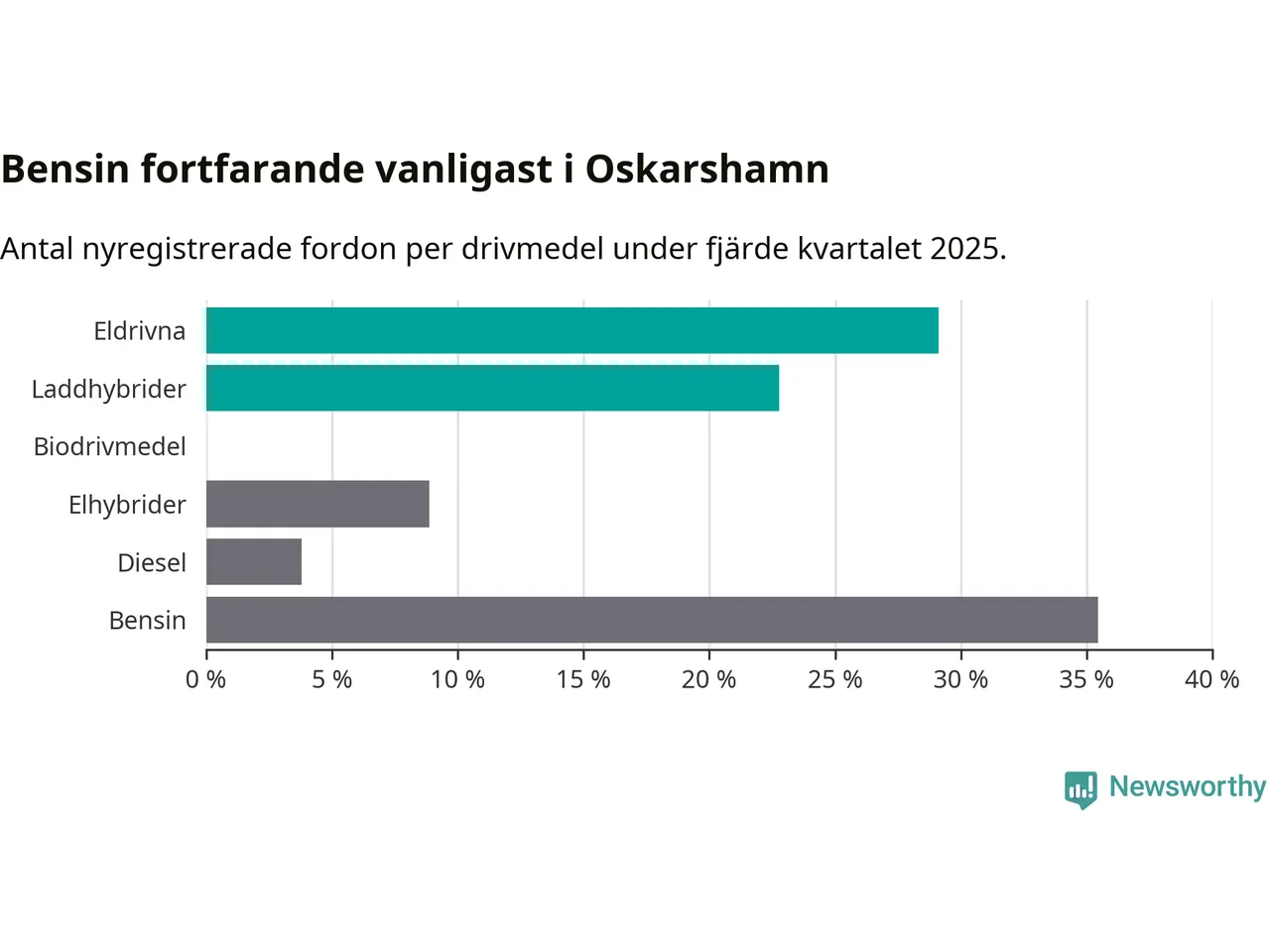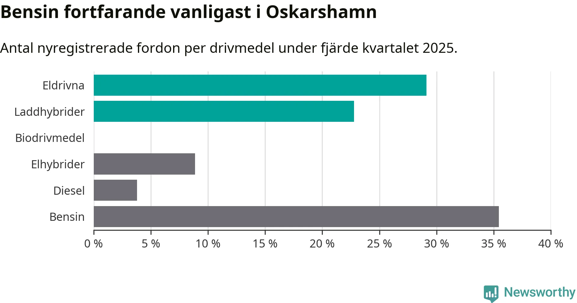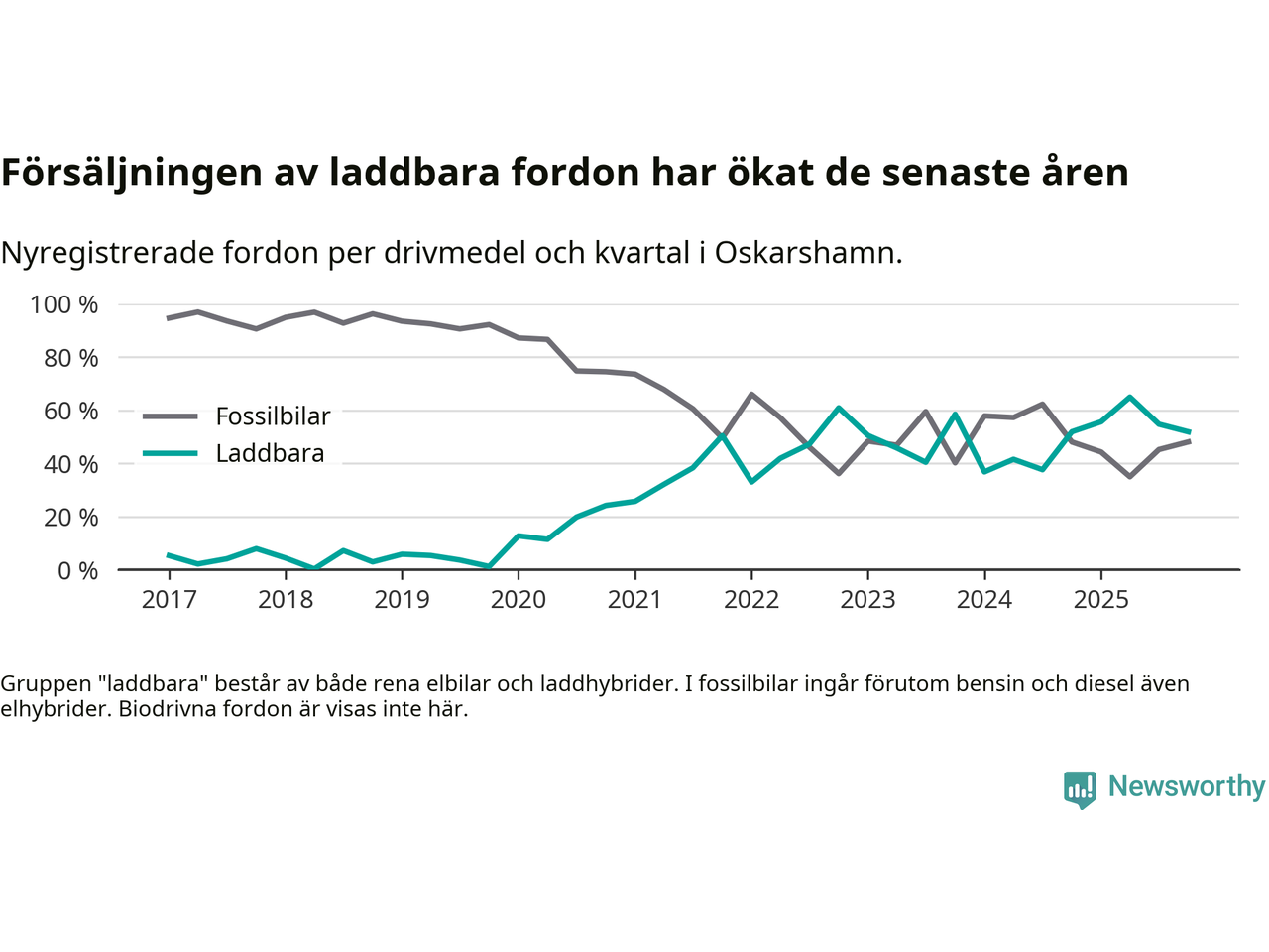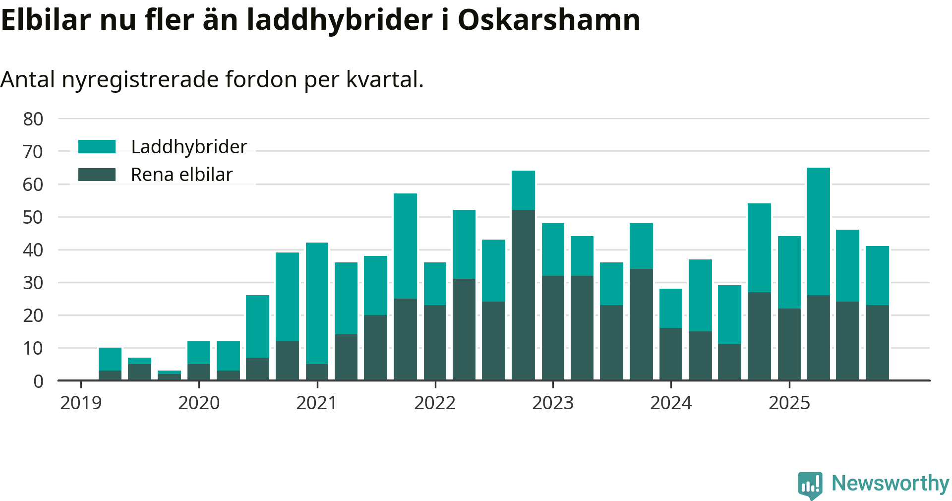 Under fjärde kvartalet 2025 var 52 procent av alla nyregistrerade personbilar i Oskarshamn laddbara (sammanlagt registrerades 79 nya bilar). Merparten av de laddbara bilarna var rena elbilar (29 procent av alla).