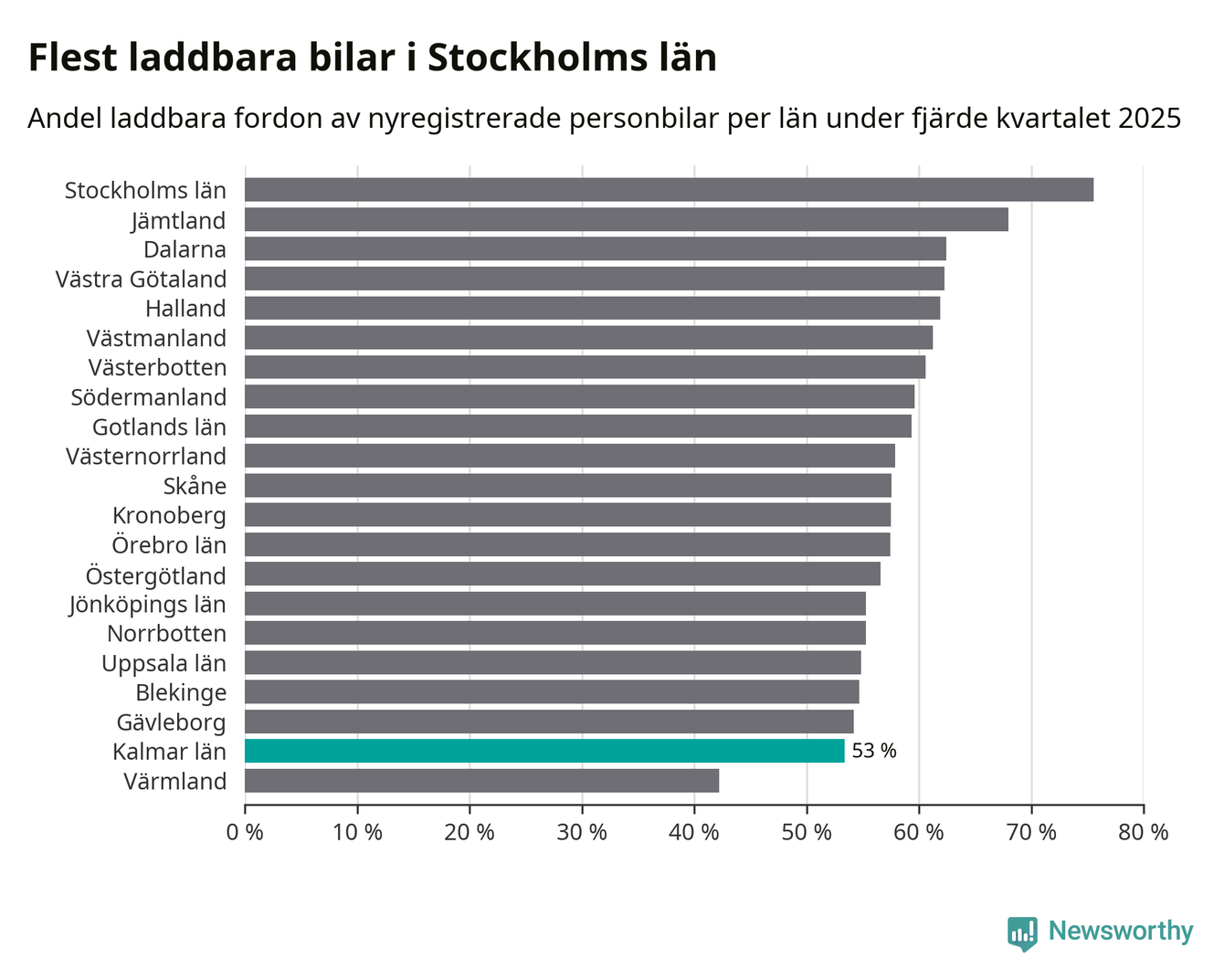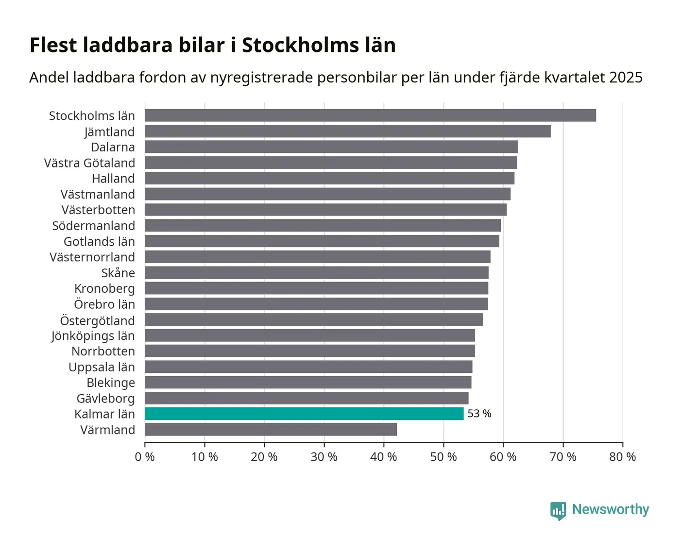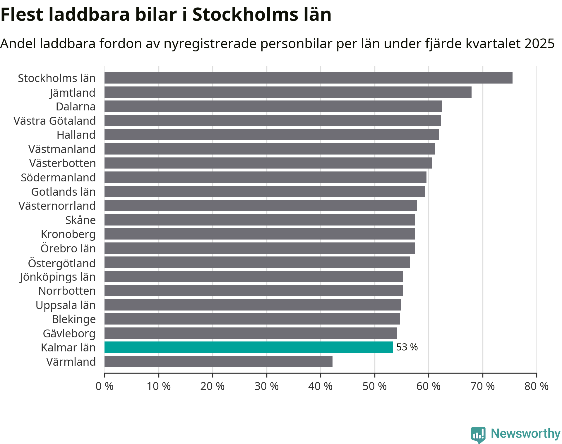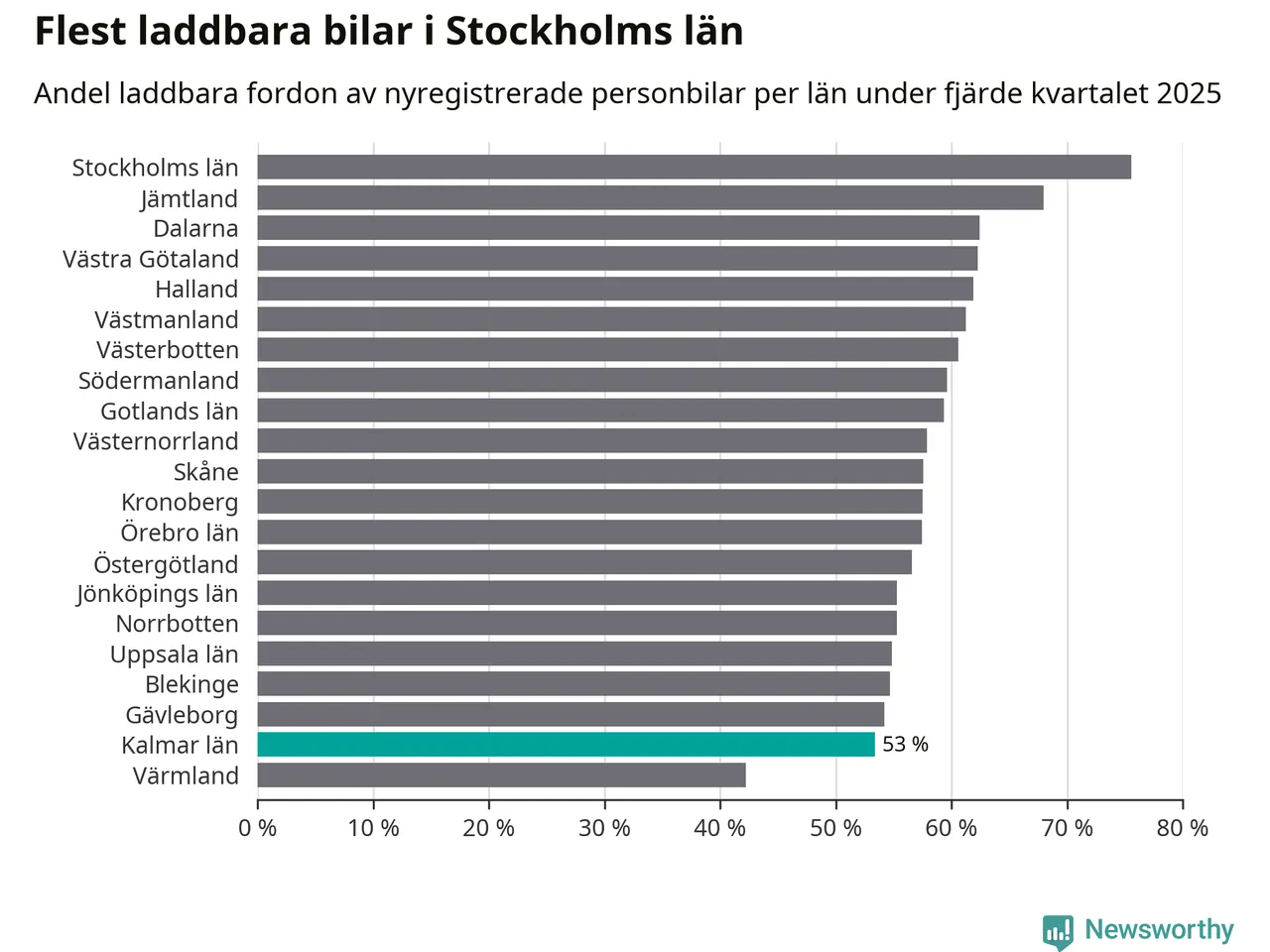 Under fjärde kvartalet 2025 var 52 procent av alla nyregistrerade personbilar i Oskarshamn laddbara (sammanlagt registrerades 79 nya bilar). Merparten av de laddbara bilarna var rena elbilar (29 procent av alla).