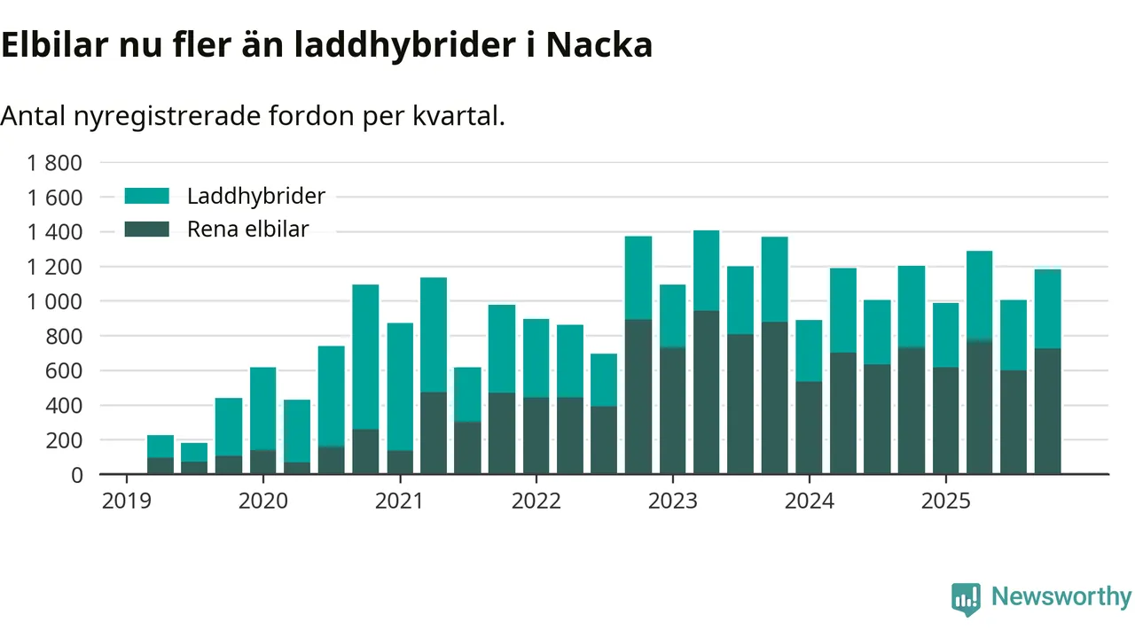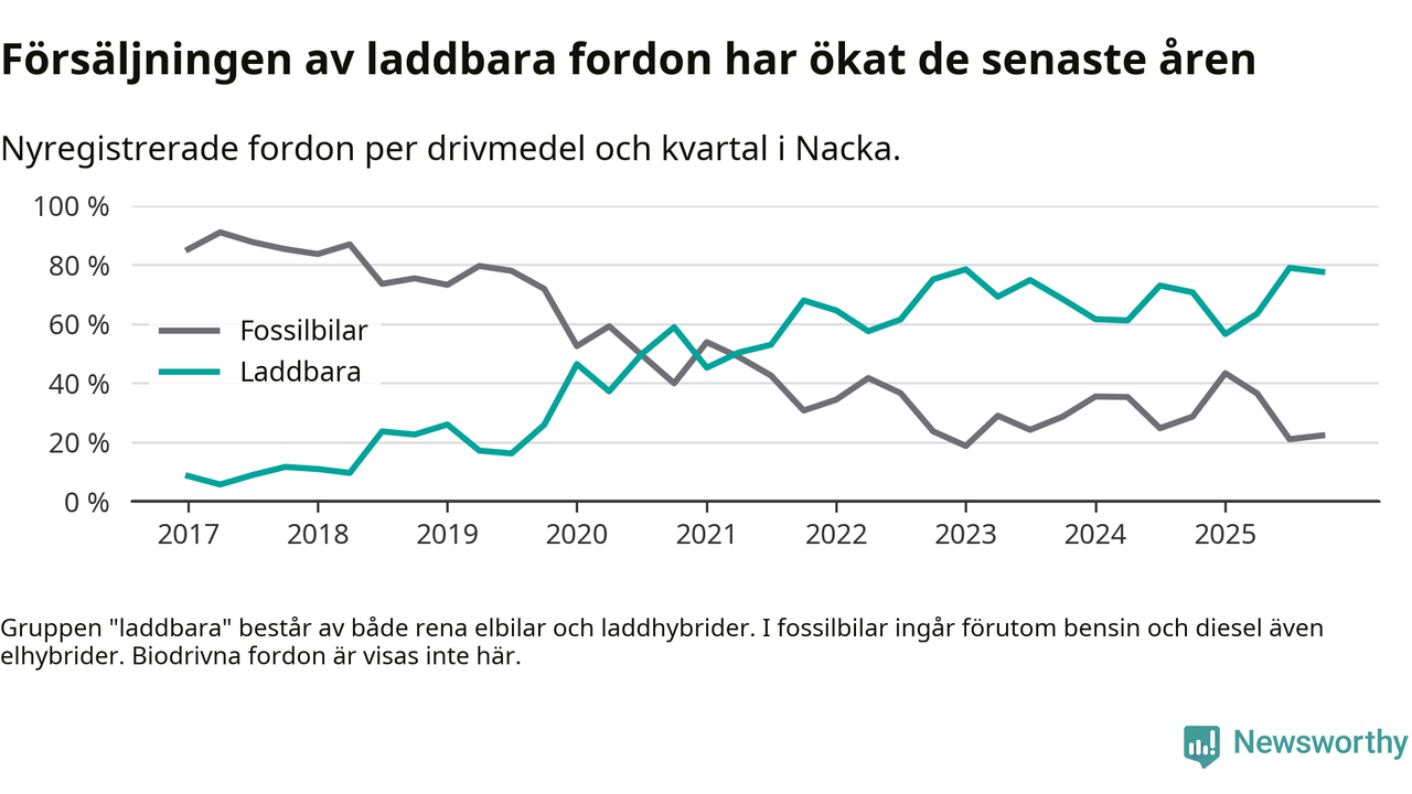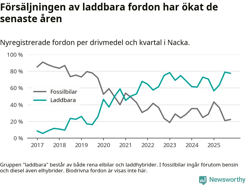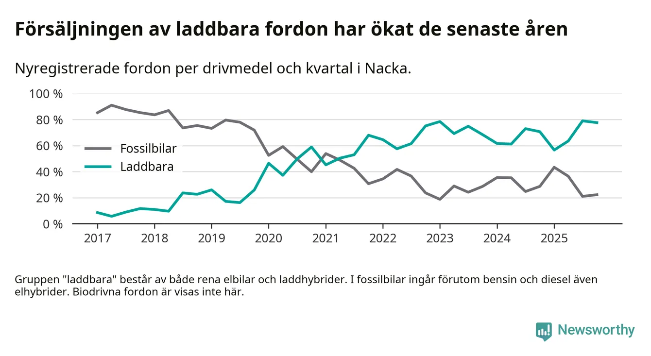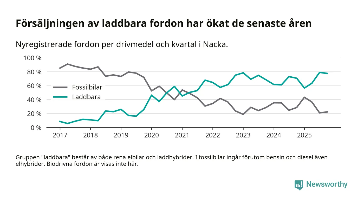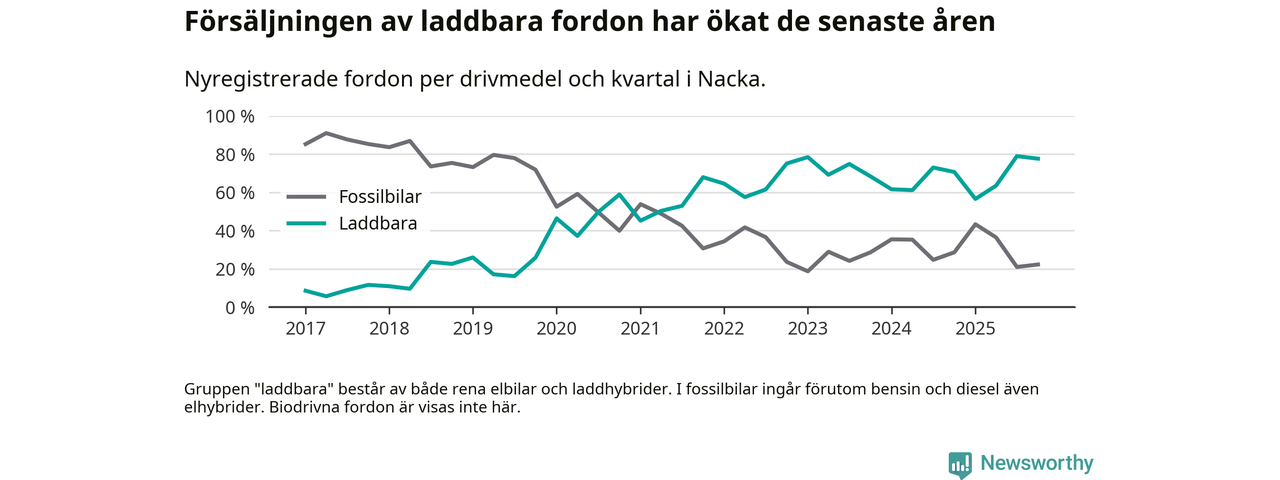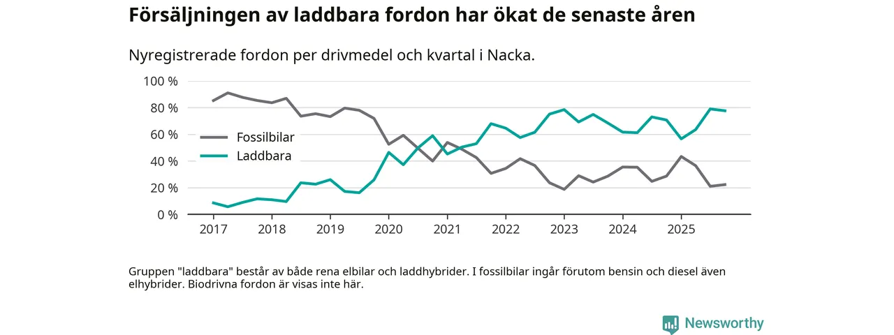 Under fjärde kvartalet 2025 var 78 procent av alla nyregistrerade personbilar i Nacka laddbara (sammanlagt registrerades 1 521 nya bilar). Merparten av de laddbara bilarna var rena elbilar (48 procent av alla).