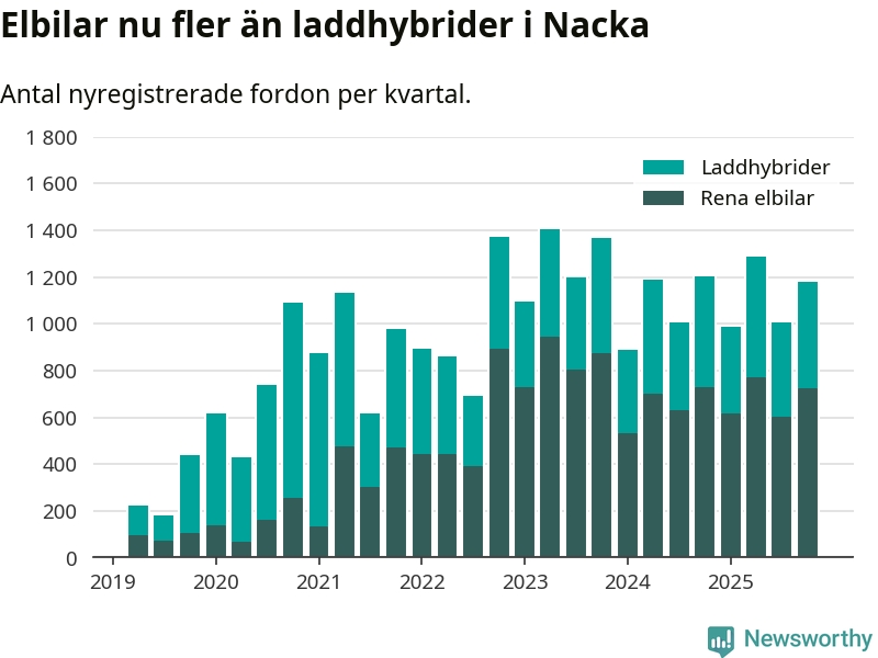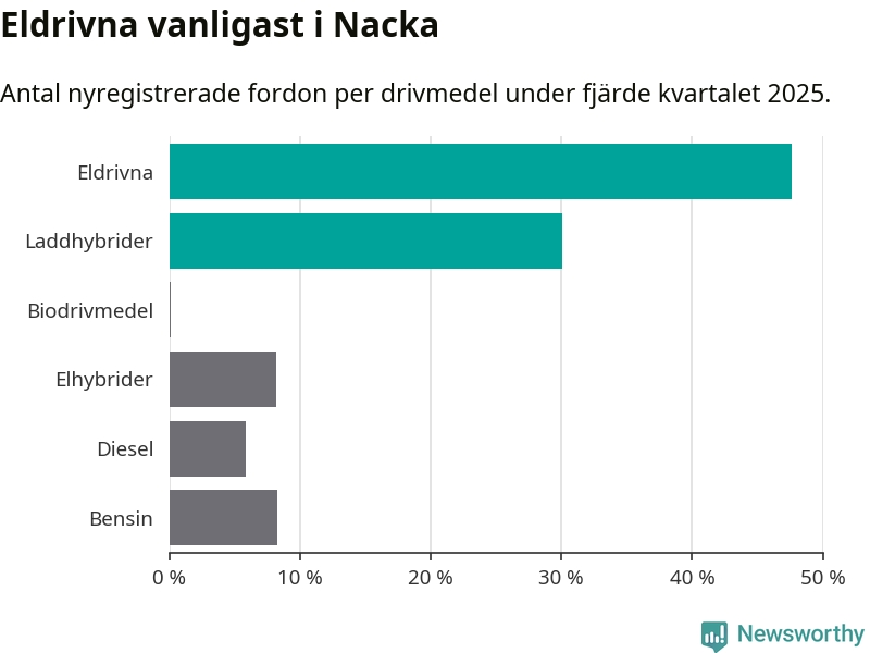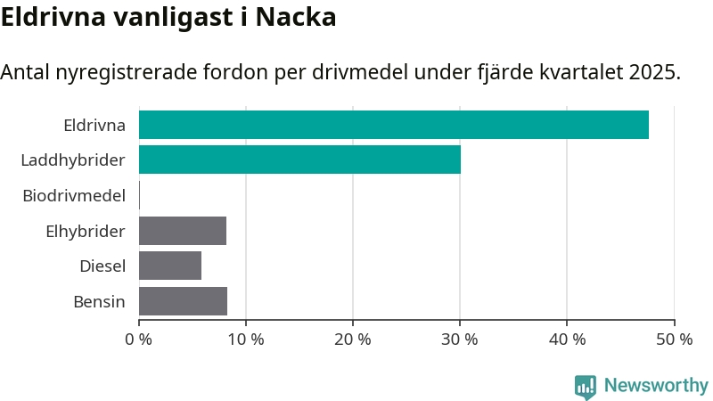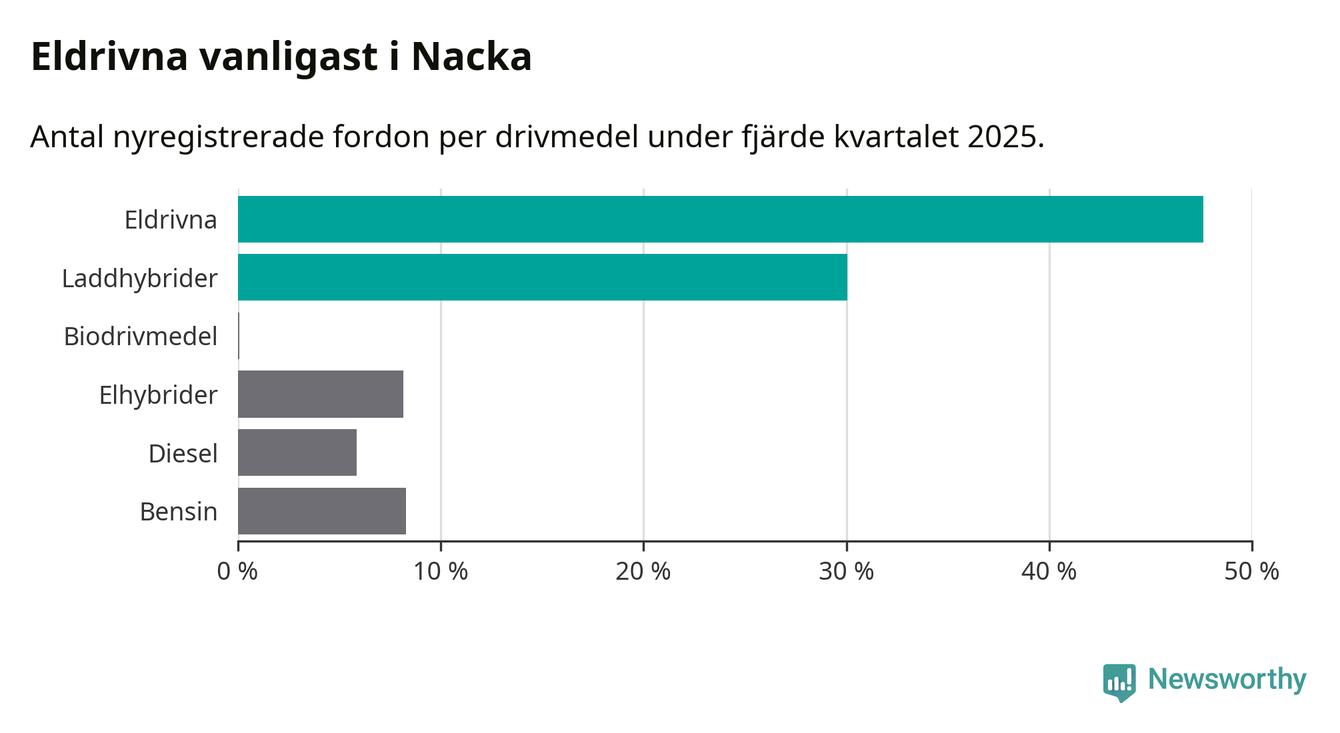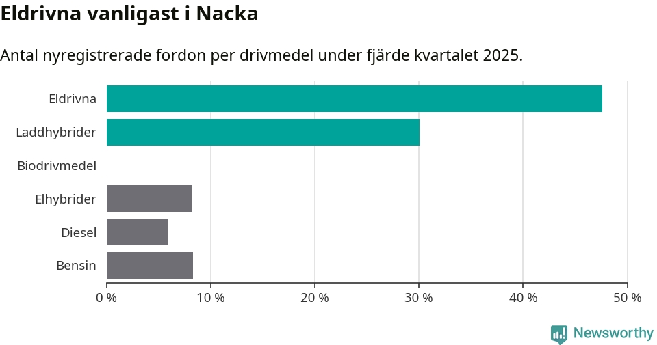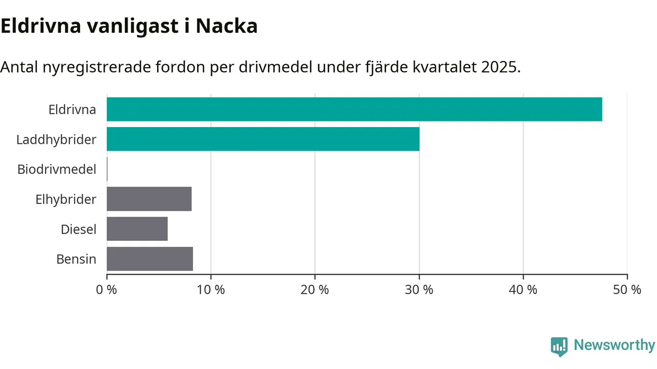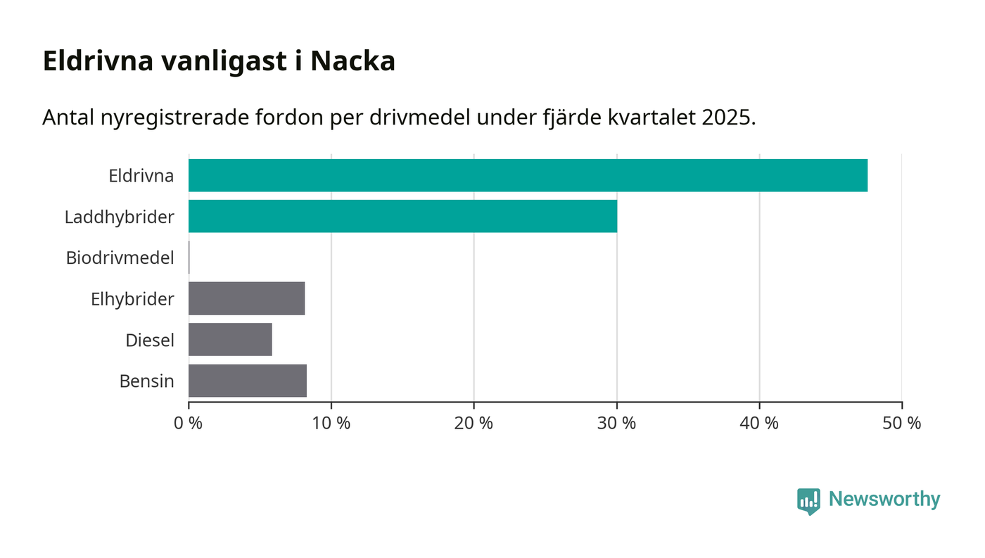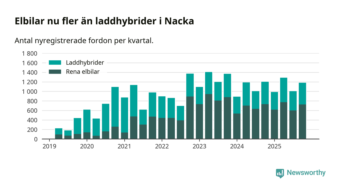 Under fjärde kvartalet 2025 var 78 procent av alla nyregistrerade personbilar i Nacka laddbara (sammanlagt registrerades 1 521 nya bilar). Merparten av de laddbara bilarna var rena elbilar (48 procent av alla).