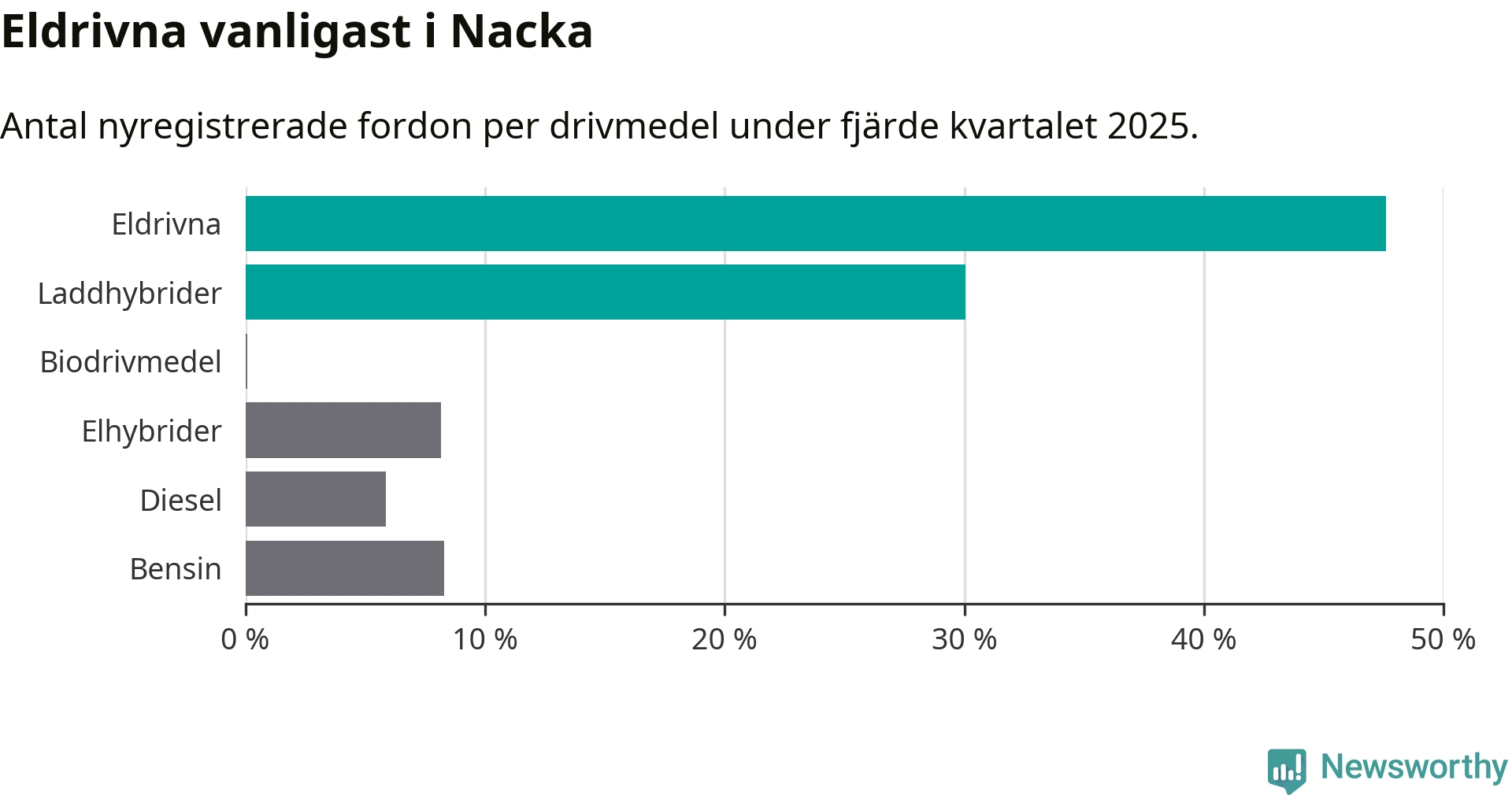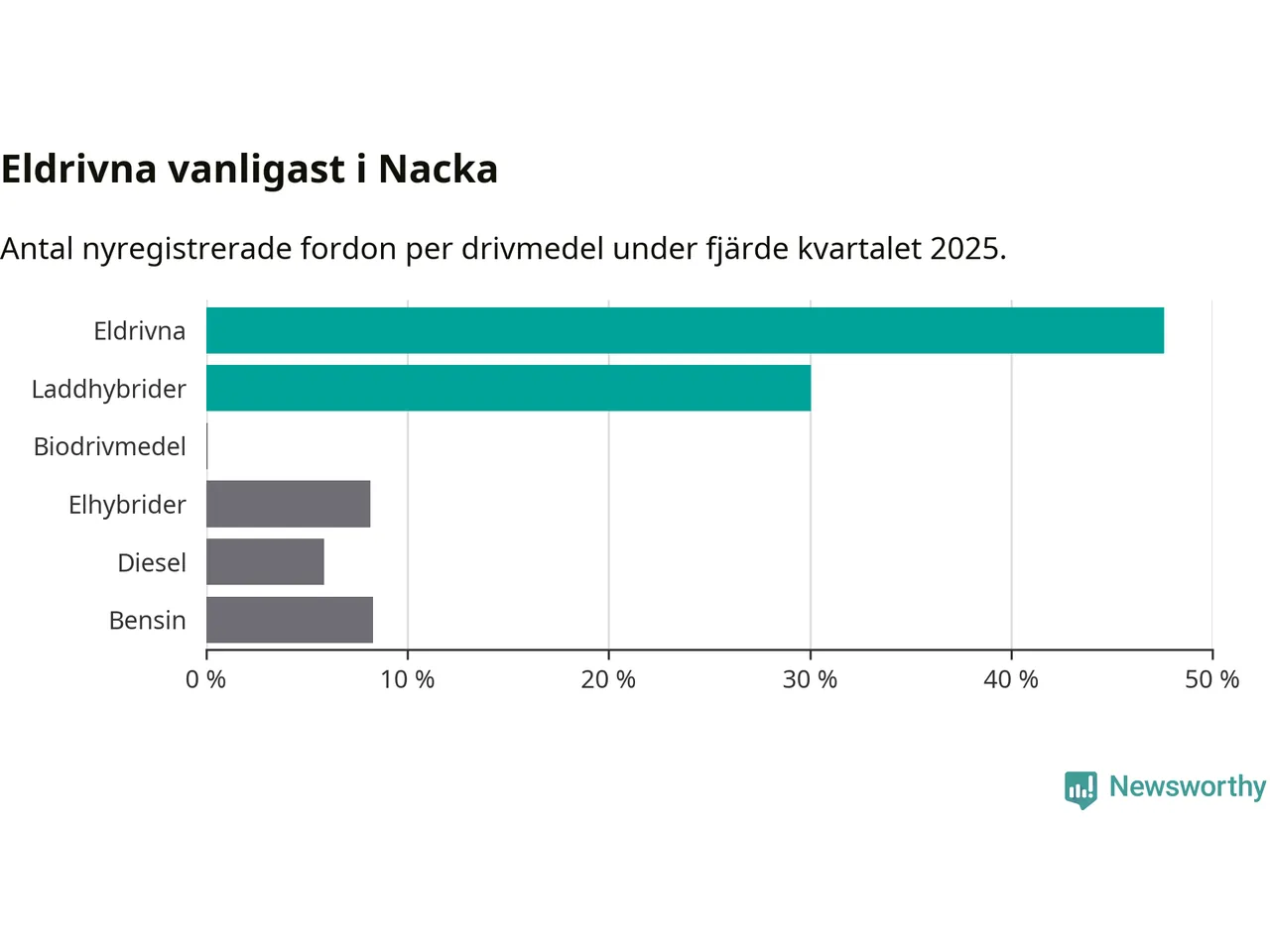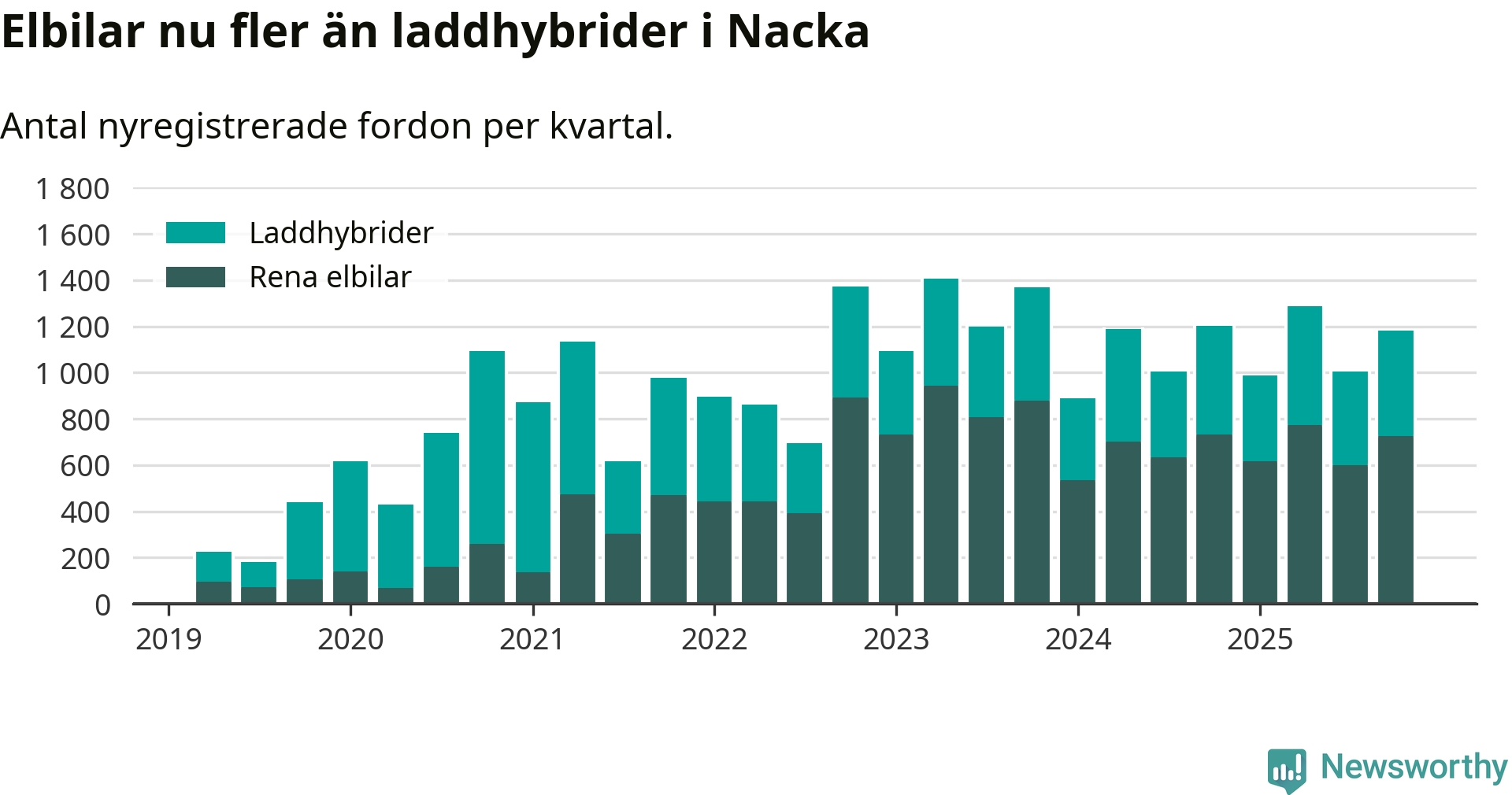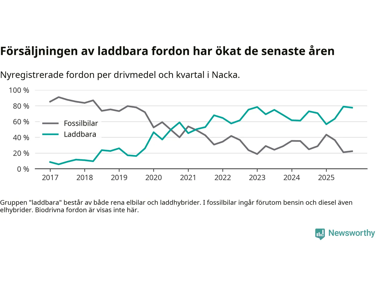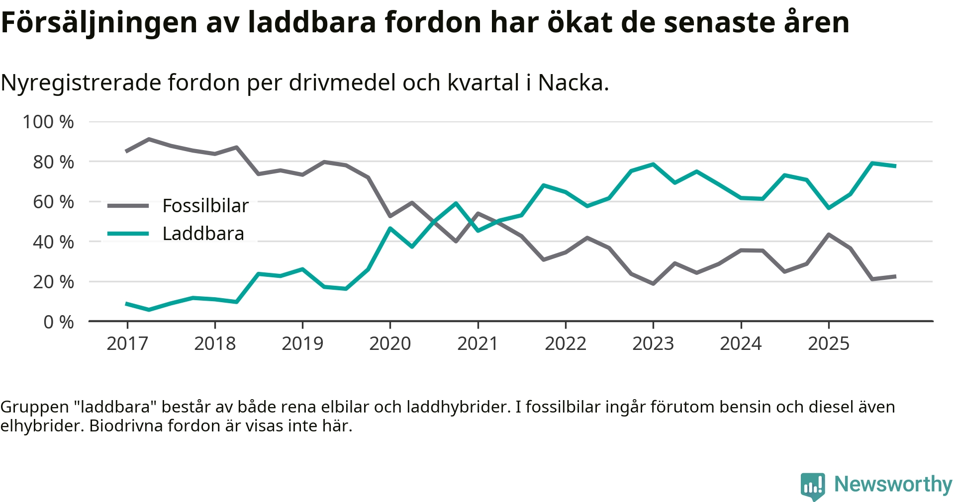 Under fjärde kvartalet 2025 var 78 procent av alla nyregistrerade personbilar i Nacka laddbara (sammanlagt registrerades 1 521 nya bilar). Merparten av de laddbara bilarna var rena elbilar (48 procent av alla).
