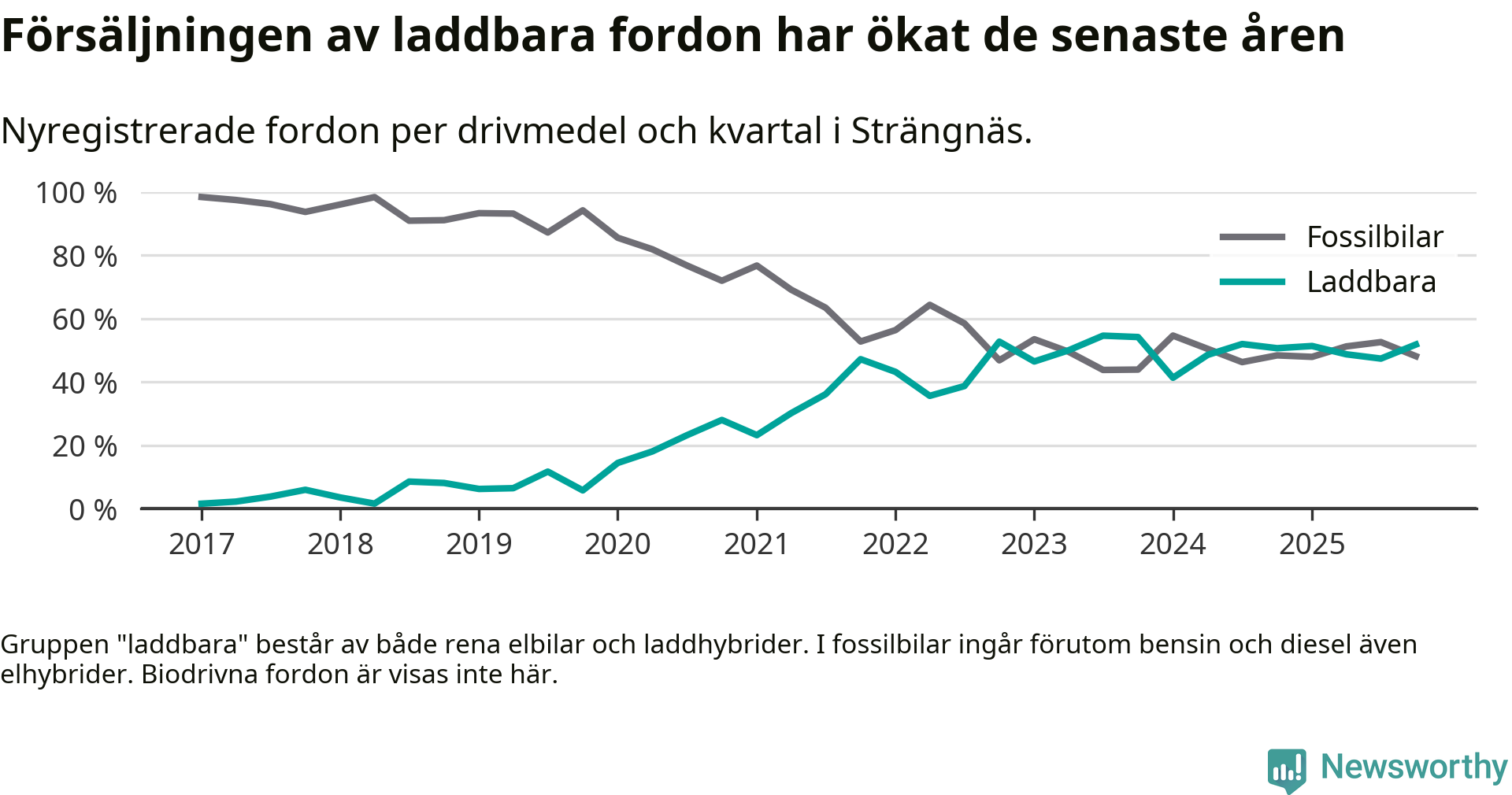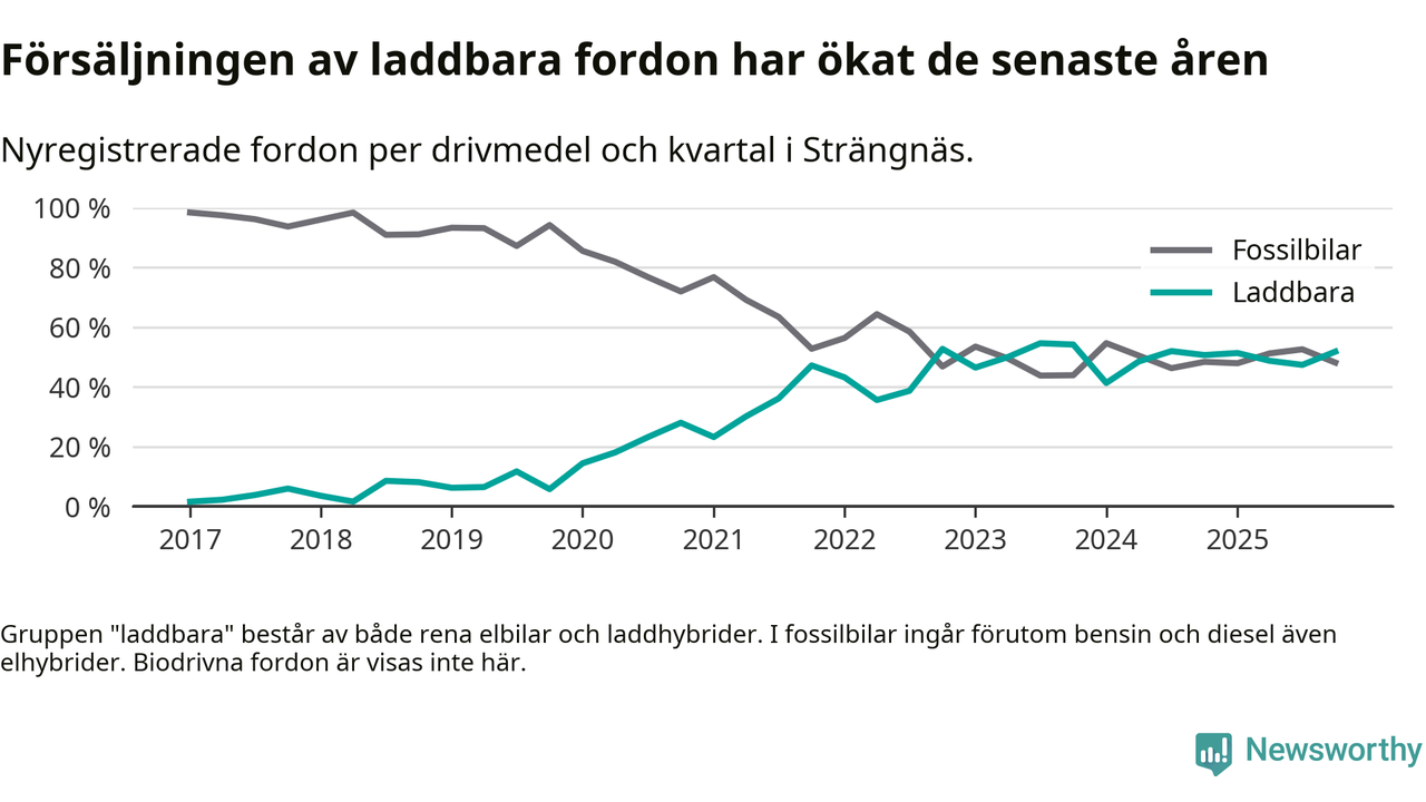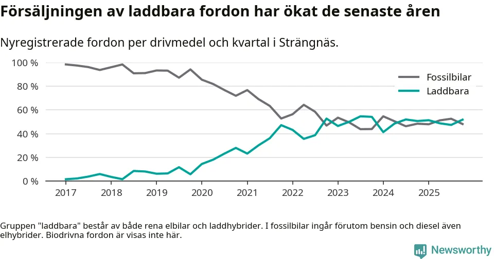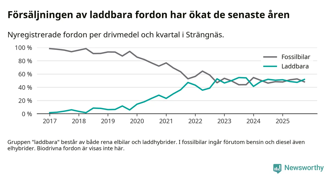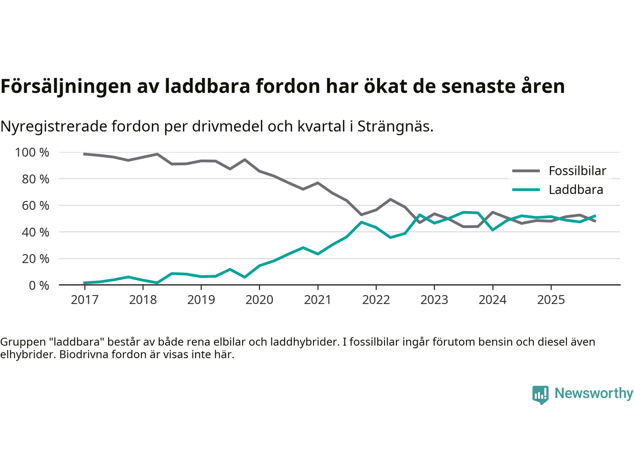 Under fjärde kvartalet 2025 var 52 procent av alla nyregistrerade personbilar i Strängnäs laddbara (sammanlagt registrerades 218 nya bilar). Merparten av de laddbara bilarna var rena elbilar (33 procent av alla).